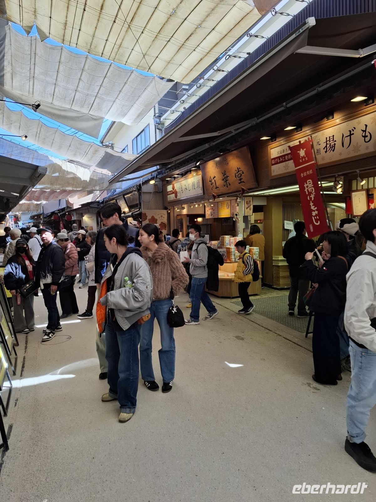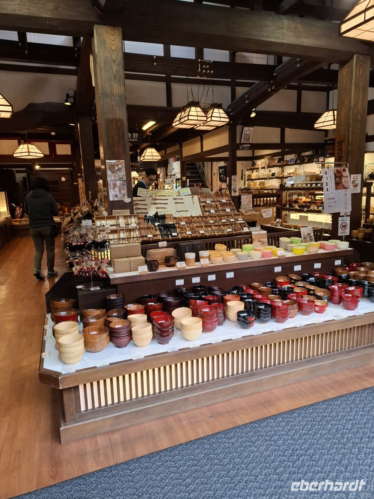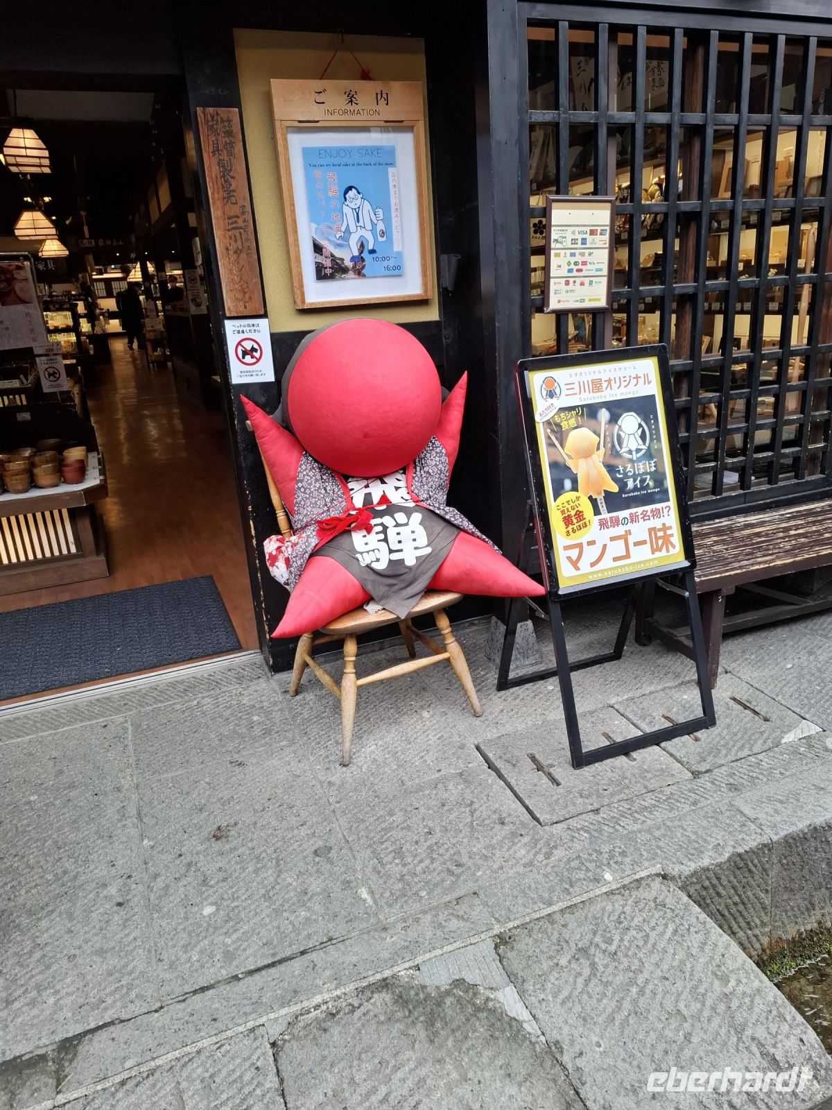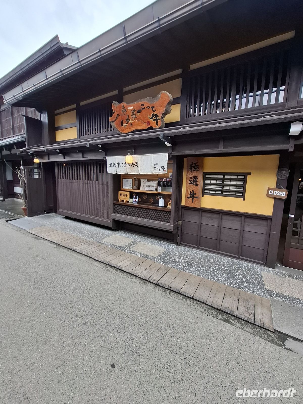 Wir dürfen heute etwas länger schlafen und treffen uns 09:00 Uhr an der Hotelrezeption. Noch schnell werden die letzten deutschsprachigen Stadtpläne ausgeteilt und schon beginnen wir mit unserer kleinen Stadtbesichtigung durch die architektonisch noch gut erhaltene Altstadt Takayamas. Dafür spazieren wir rund 10 Minuten zu Fuß von unserem Hotel bis wir die Hauptgasse/-straße in der Altstadt erreicht haben. Wir flanieren entlang der Straße und Gudrun erzählt uns die ein oder andere wichtige Information zu den Läden und Restaurants, die langsam aber sicher zum Leben erwecken, sozusagen langsam ihre Ladentüren öffnen. Hier gibt es neben Souvenirs auch die Ess-Stäbchen zu kaufen, für deren Produktion Takayama bekannt ist. Anschließend schlendern wir über den großen Morgenmarkt, der sich entlang des Flusses Myagawas erstreckt. Auch hier findet sich der ein oder andere Souvenirladen aber auch kleine Imbisse an den man süße Leckereien, Süßkartoffelbrei aber auch Fisch sowie frisches Obst kaufen kann. Der Einblick ist schon sehr interessant, auch wenn es uns aufgrund des kalten Wetters ziemlich fröstelt. Nachdem Gudrun ihre Ausführungen beendet hat, genießen wir ein wenig freie Zeit, die wir zum Einkauf von Souvenirs nutzen sollten, denn so viel Freizeitmöglichkeiten werden wir in den kommenden Tagen nicht mehr haben um zu shoppen.
