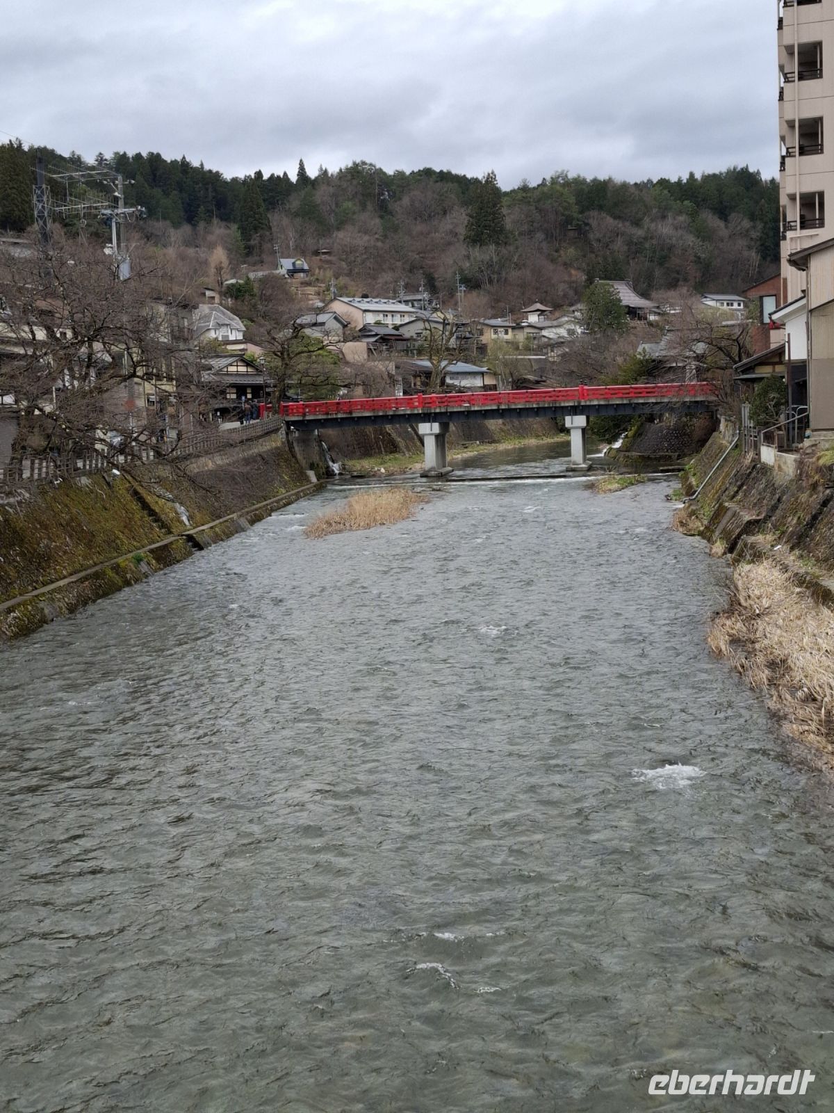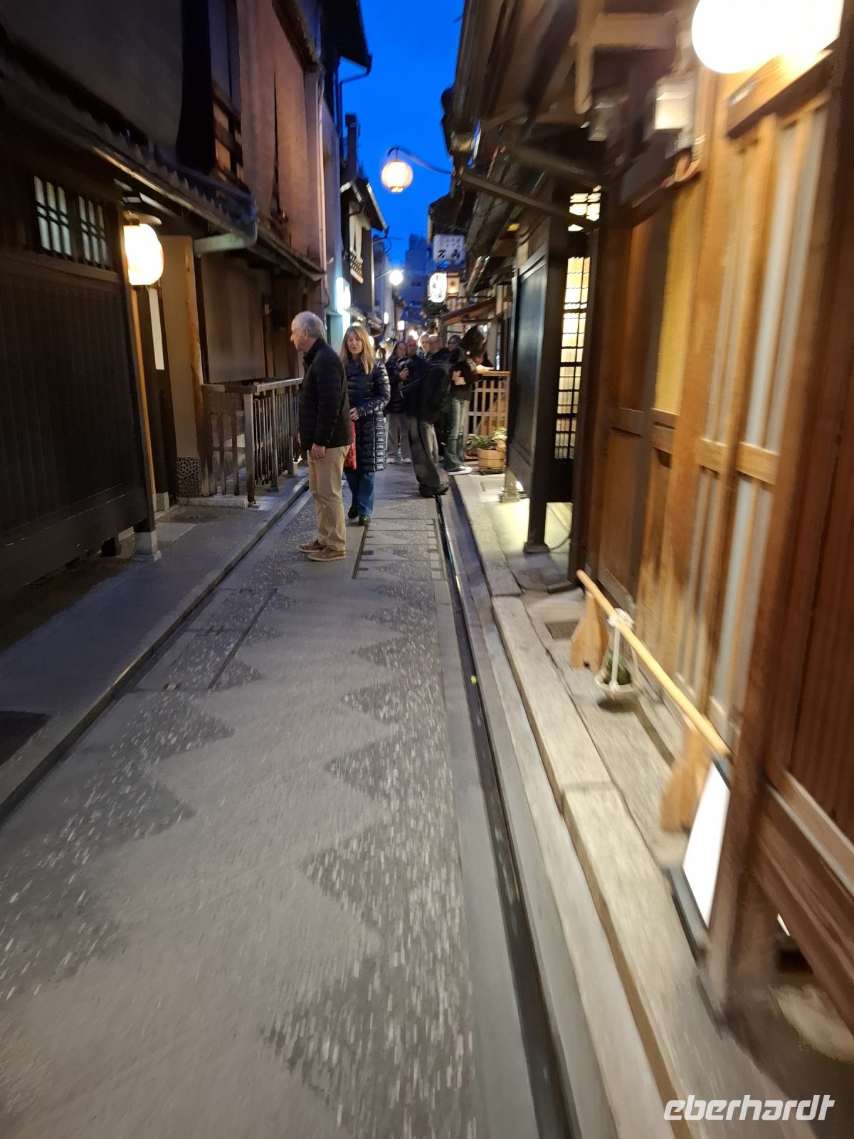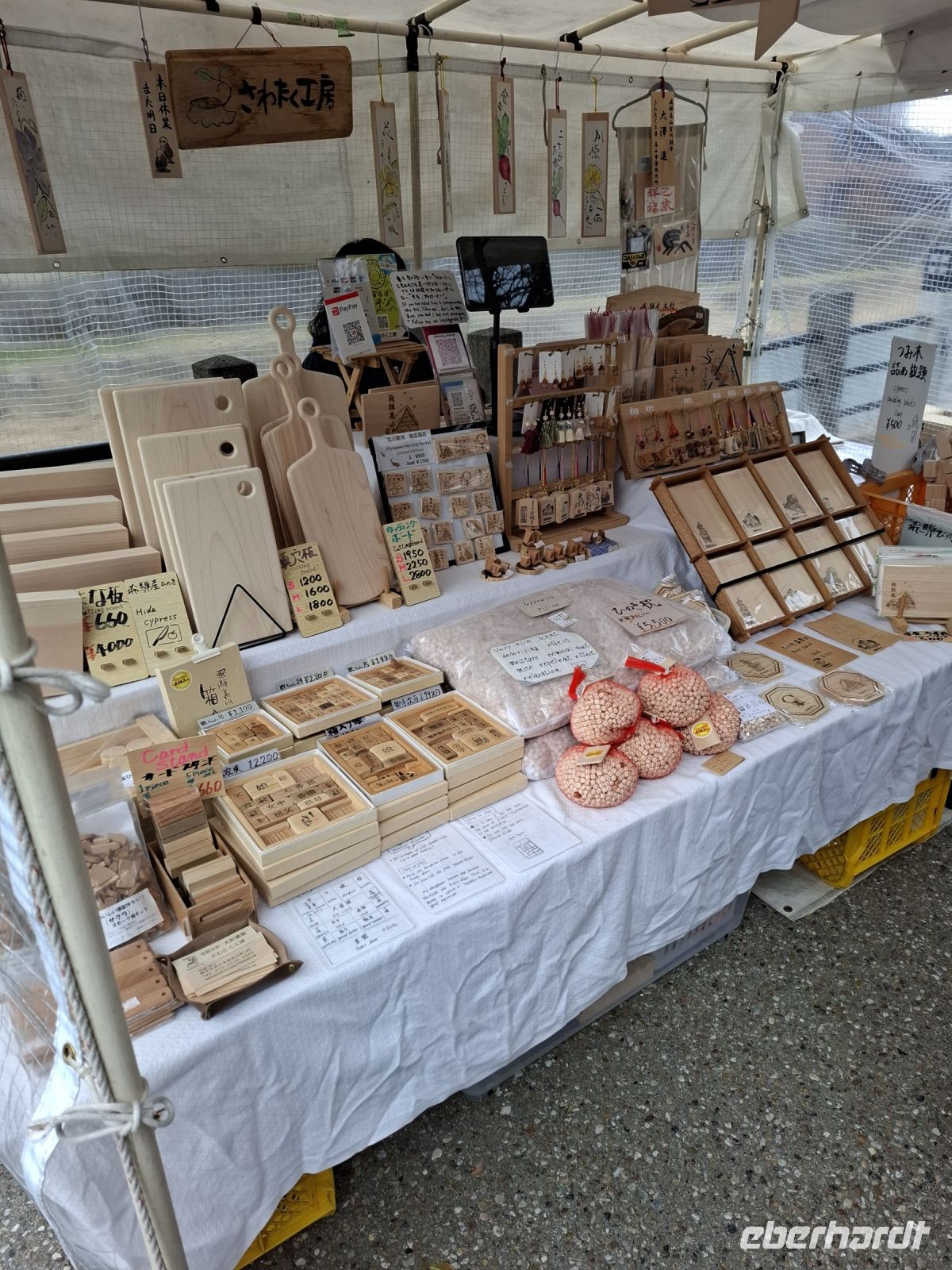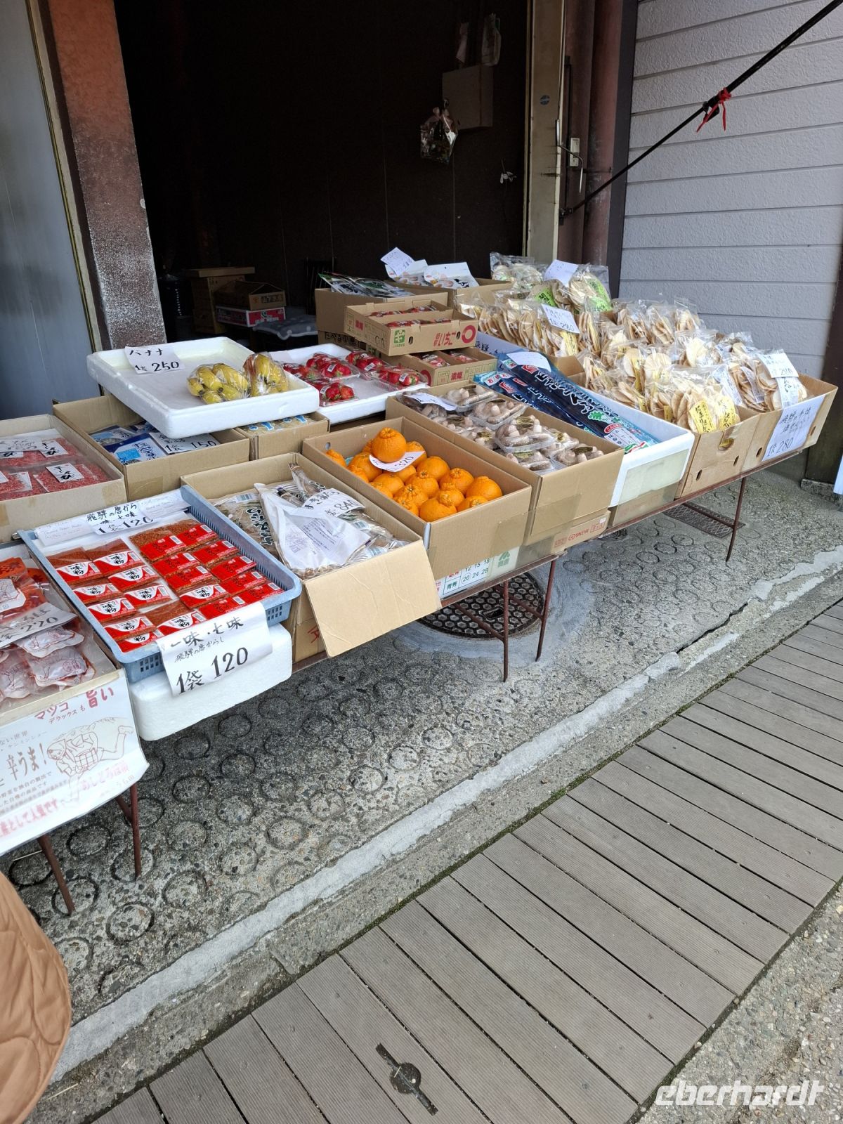 Wir dürfen heute etwas länger schlafen und treffen uns 09:00 Uhr an der Hotelrezeption. Noch schnell werden die letzten deutschsprachigen Stadtpläne ausgeteilt und schon beginnen wir mit unserer kleinen Stadtbesichtigung durch die architektonisch noch gut erhaltene Altstadt Takayamas. Dafür spazieren wir rund 10 Minuten zu Fuß von unserem Hotel bis wir die Hauptgasse/-straße in der Altstadt erreicht haben. Wir flanieren entlang der Straße und Gudrun erzählt uns die ein oder andere wichtige Information zu den Läden und Restaurants, die langsam aber sicher zum Leben erwecken, sozusagen langsam ihre Ladentüren öffnen. Hier gibt es neben Souvenirs auch die Ess-Stäbchen zu kaufen, für deren Produktion Takayama bekannt ist. Anschließend schlendern wir über den großen Morgenmarkt, der sich entlang des Flusses Myagawas erstreckt. Auch hier findet sich der ein oder andere Souvenirladen aber auch kleine Imbisse an den man süße Leckereien, Süßkartoffelbrei aber auch Fisch sowie frisches Obst kaufen kann. Der Einblick ist schon sehr interessant, auch wenn es uns aufgrund des kalten Wetters ziemlich fröstelt. Nachdem Gudrun ihre Ausführungen beendet hat, genießen wir ein wenig freie Zeit, die wir zum Einkauf von Souvenirs nutzen sollten, denn so viel Freizeitmöglichkeiten werden wir in den kommenden Tagen nicht mehr haben um zu shoppen.