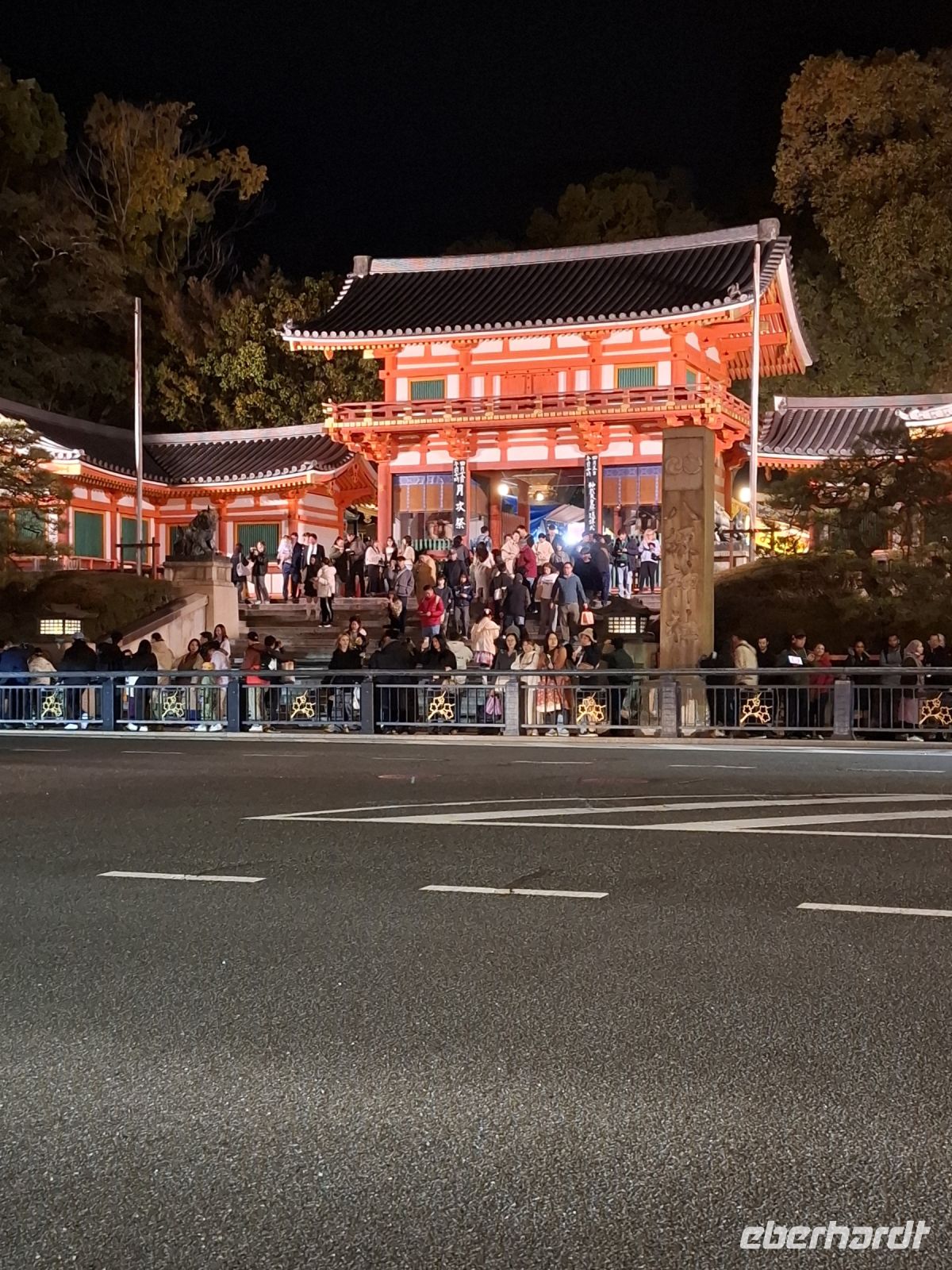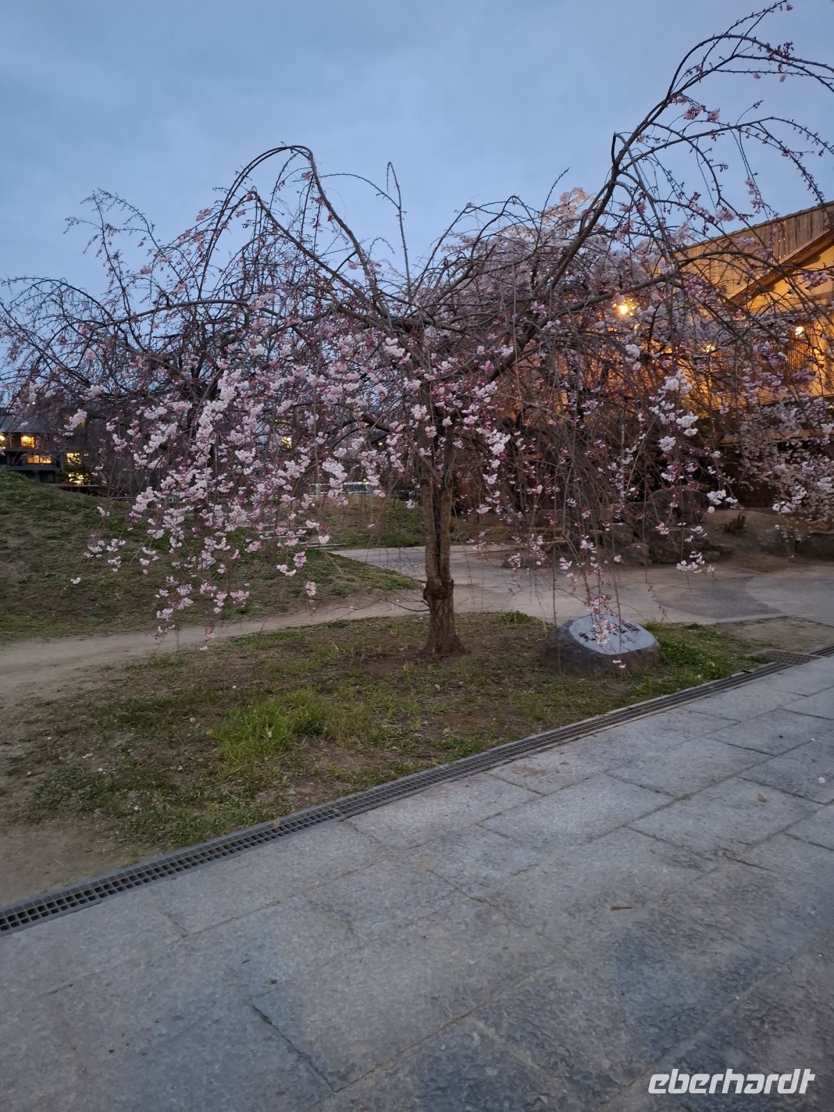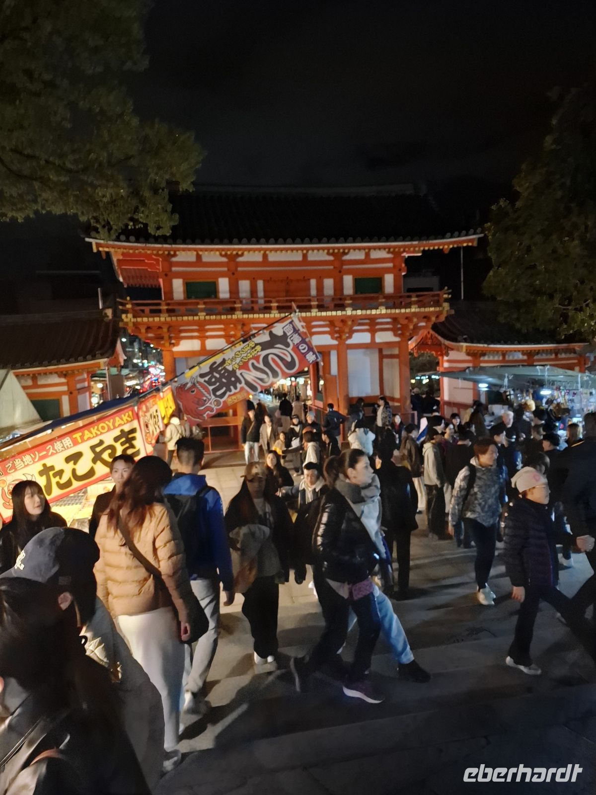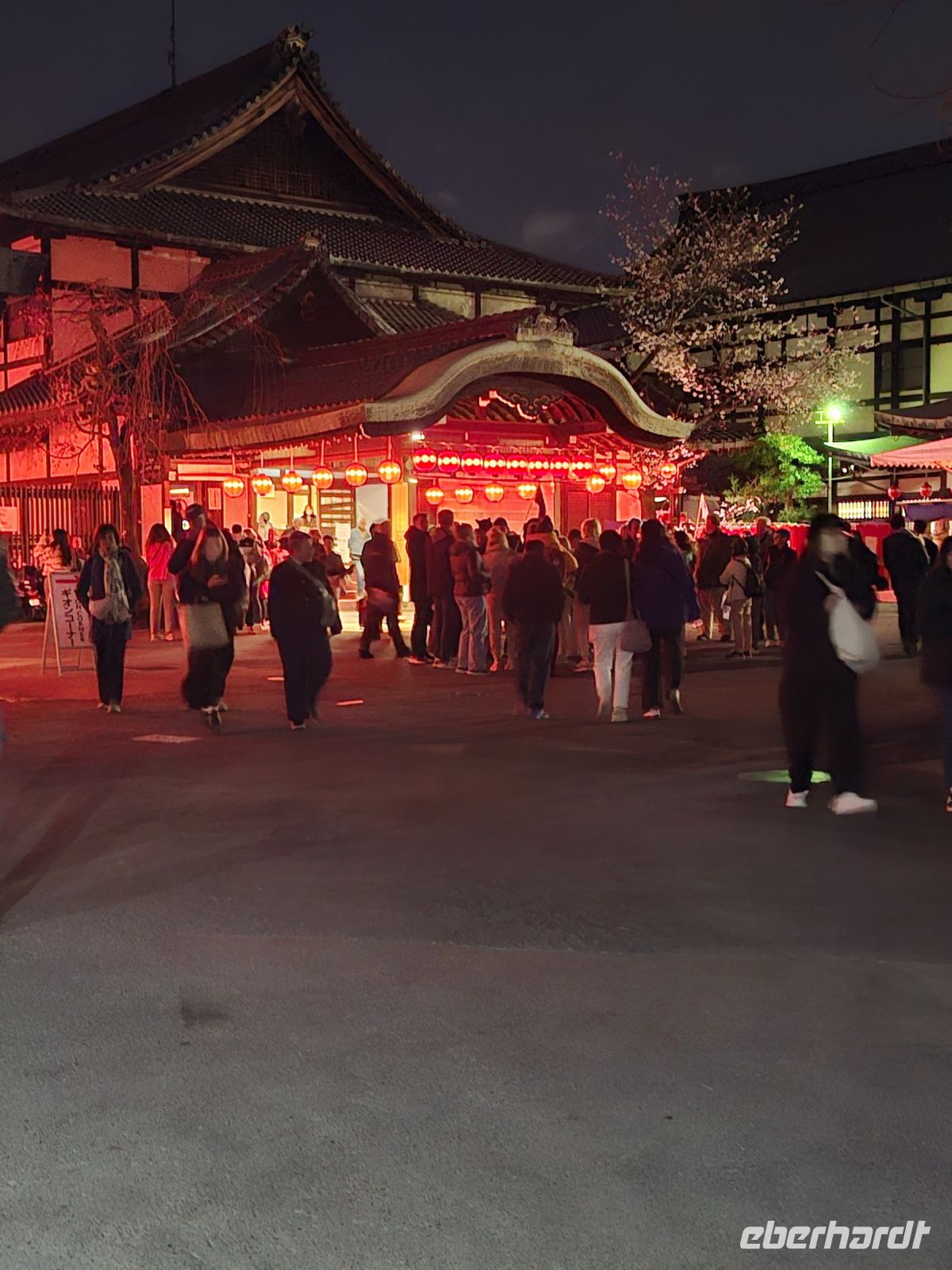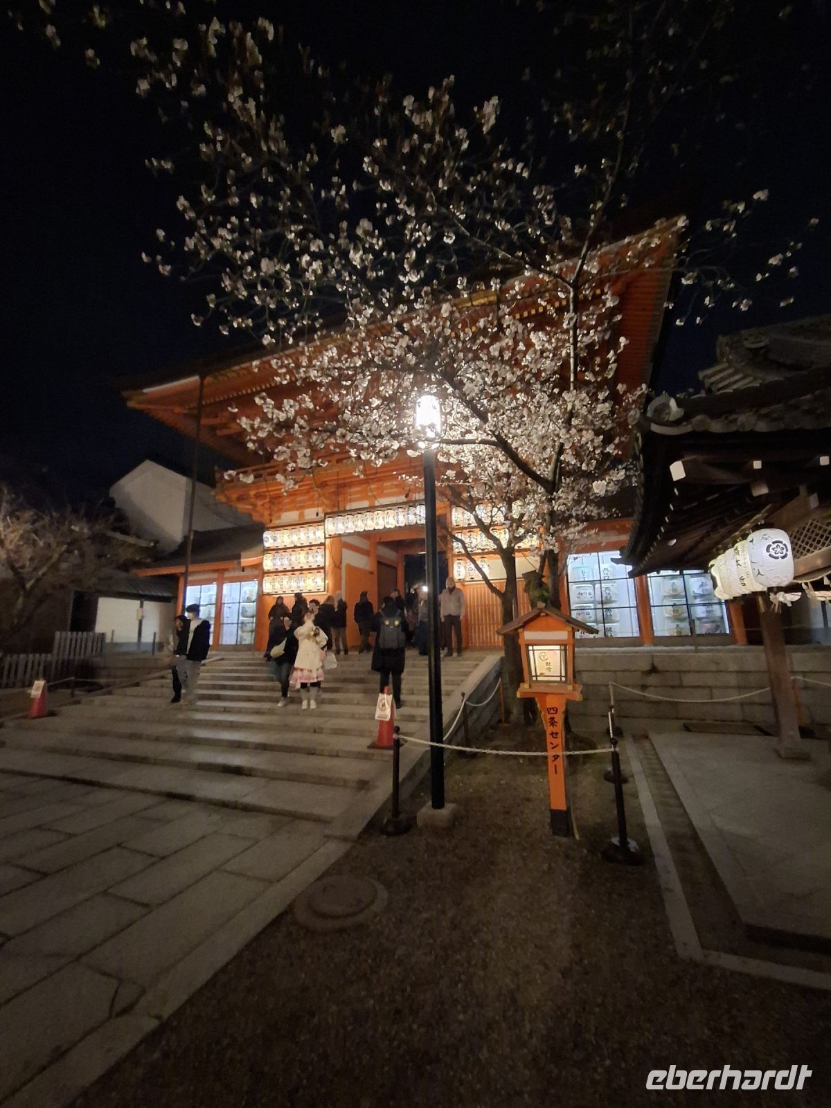 Gegen Mittag treffen wir uns an der Hotellobby, holen unser Gepäck ab und warten auf die bestellten Taxen, die uns zum Bahnhof von Hiroshima fahren. Hier besteigen wir erneut den Shinkanzen, erst im falschen Wagen, aber da meine Gruppe sehr flexibel ist, nimmt sie Gudrun und mir den kleinen Fehler nicht übel. Auf den richtigen Sitzreihen Platz genommen, fahren wir von Hiroshima, noch einmal an Himeji vorbei, nach Kyoto, unserer letzten Station auf dieser Reise. Während ich auf unser Reisegepäck aufpasse, unternimmt Gudrun mit unserer Reisegruppe eine kleine Führung durch den Bahnhof von Kyoto, der durch seinen besonderen Baustil besticht. Nach dem Hotel-Checkin steht uns der restliche Abend frei zur individuellen Gestaltung. Ein Teil meiner Reisegruppe besucht das Gion-Theater in der Nähe der "Geisha"-Straße. Hier treffe ich zum späteren Abend ein paar Gäste und gemeinsam spazieren wir zum Yakama-Schrein, an dem das Kirschblütenfest gefeiert wird. Zahlreiche Imbissstände bieten unterschiedliche Leckereien an und viele Touristen als auch Einheimische lassen sich diesen Spaß nicht entgehen.
