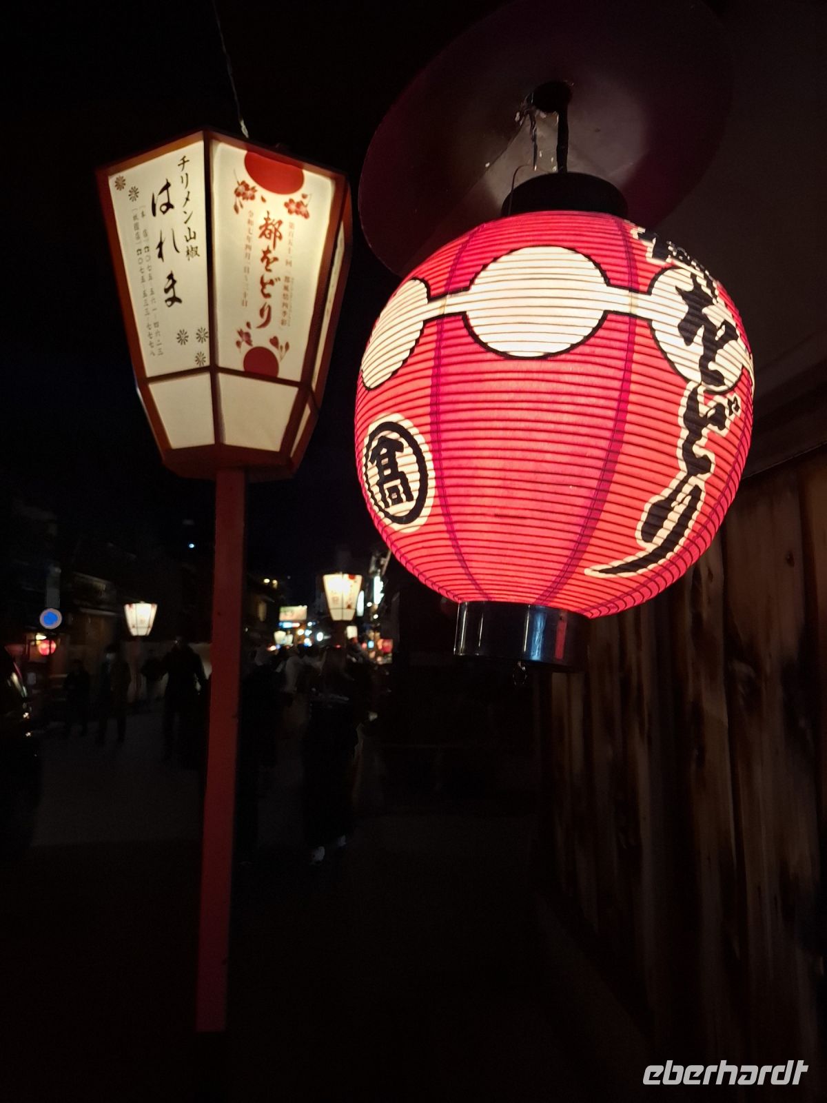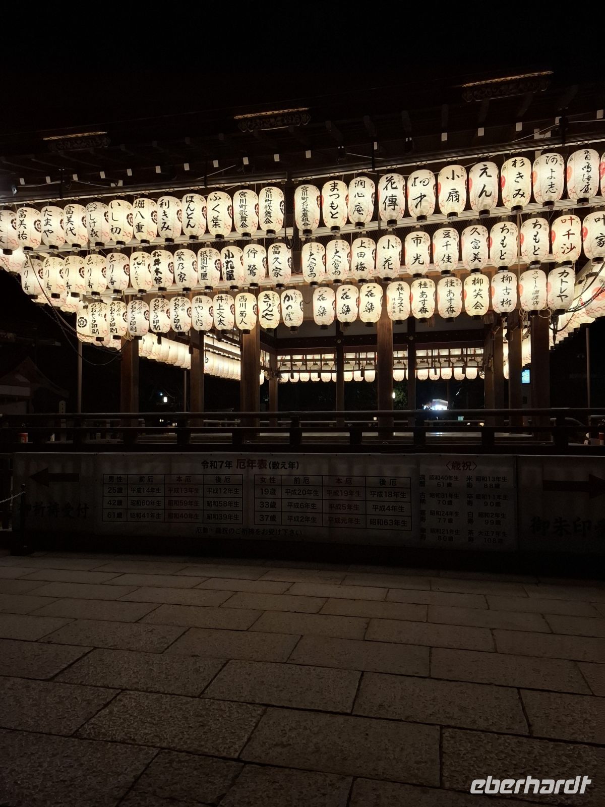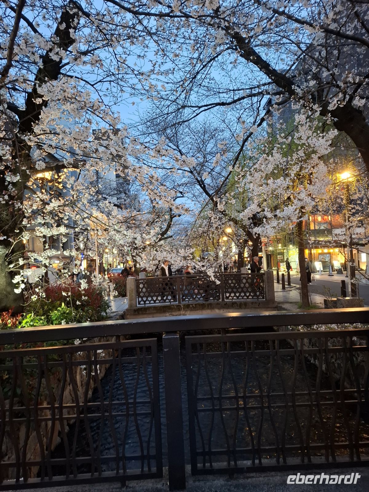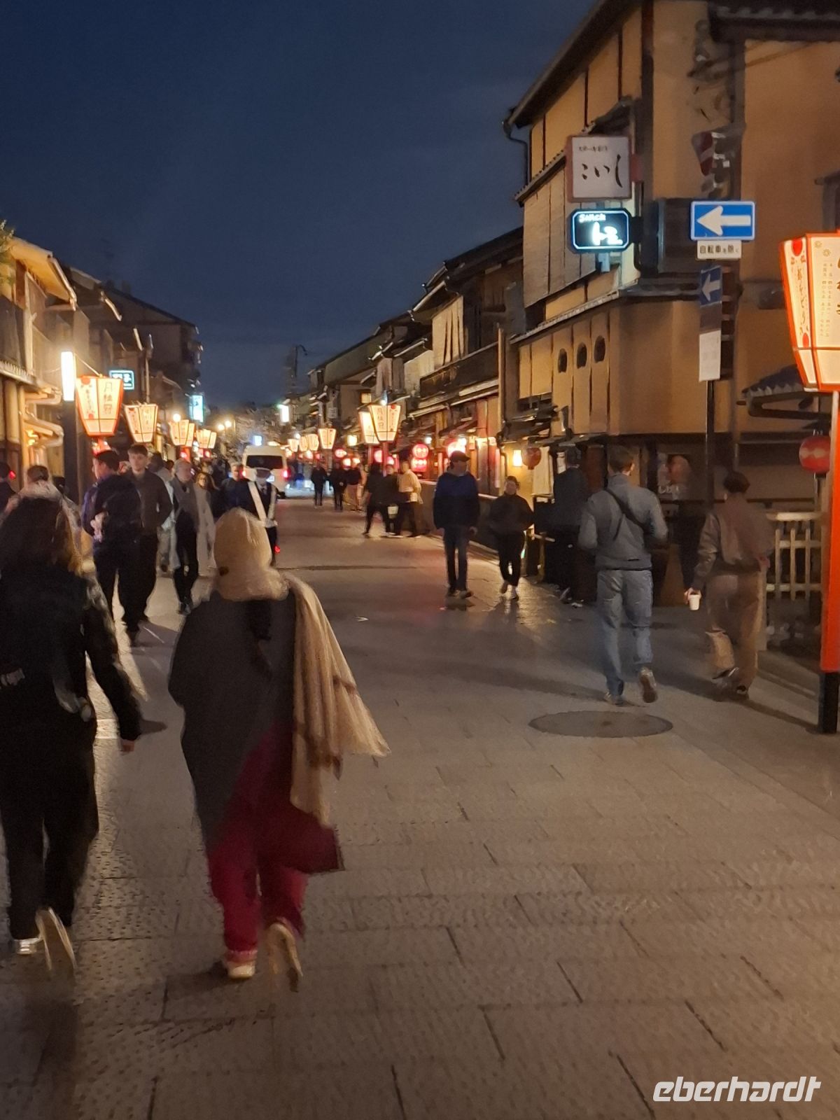 Gegen Mittag treffen wir uns an der Hotellobby, holen unser Gepäck ab und warten auf die bestellten Taxen, die uns zum Bahnhof von Hiroshima fahren. Hier besteigen wir erneut den Shinkanzen, erst im falschen Wagen, aber da meine Gruppe sehr flexibel ist, nimmt sie Gudrun und mir den kleinen Fehler nicht übel. Auf den richtigen Sitzreihen Platz genommen, fahren wir von Hiroshima, noch einmal an Himeji vorbei, nach Kyoto, unserer letzten Station auf dieser Reise. Während ich auf unser Reisegepäck aufpasse, unternimmt Gudrun mit unserer Reisegruppe eine kleine Führung durch den Bahnhof von Kyoto, der durch seinen besonderen Baustil besticht. Nach dem Hotel-Checkin steht uns der restliche Abend frei zur individuellen Gestaltung. Ein Teil meiner Reisegruppe besucht das Gion-Theater in der Nähe der "Geisha"-Straße. Hier treffe ich zum späteren Abend ein paar Gäste und gemeinsam spazieren wir zum Yakama-Schrein, an dem das Kirschblütenfest gefeiert wird. Zahlreiche Imbissstände bieten unterschiedliche Leckereien an und viele Touristen als auch Einheimische lassen sich diesen Spaß nicht entgehen.