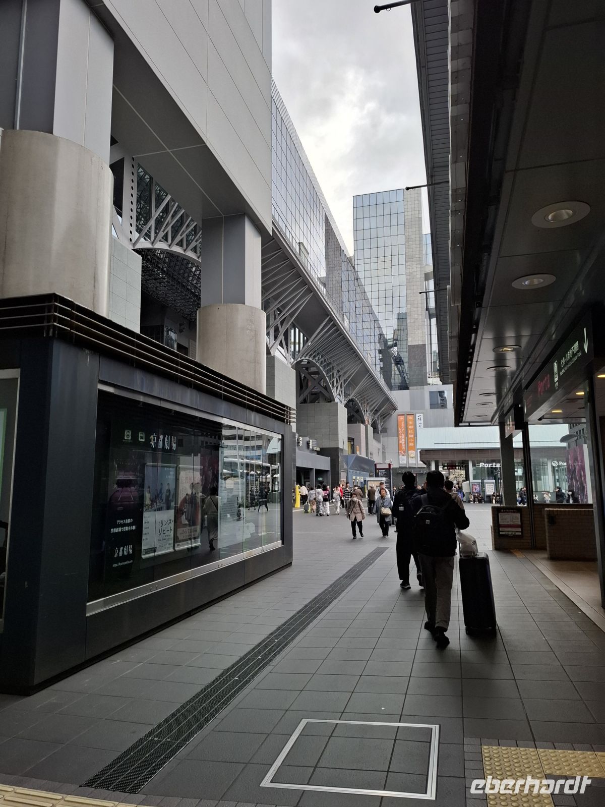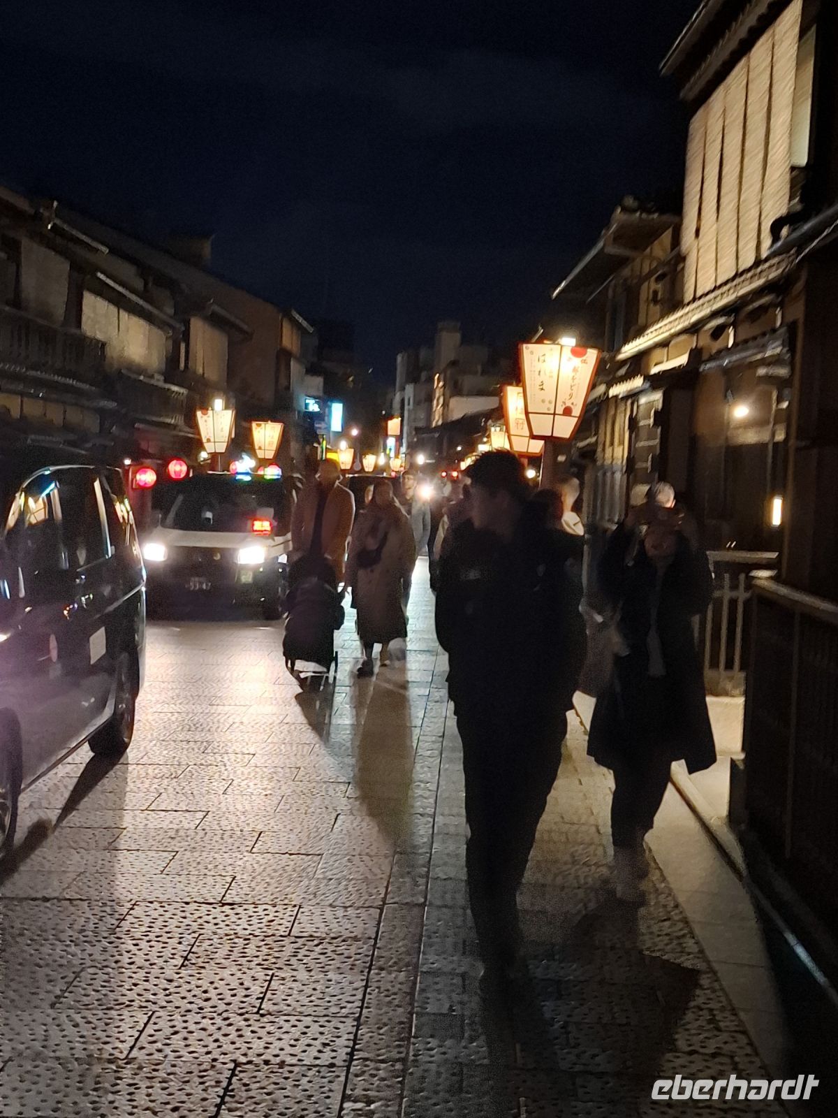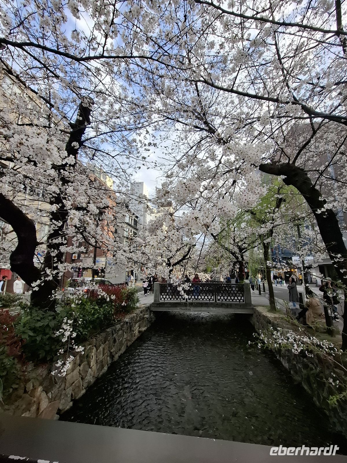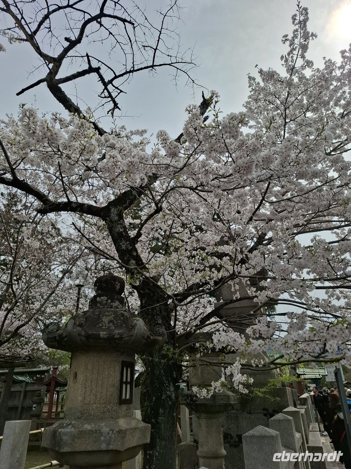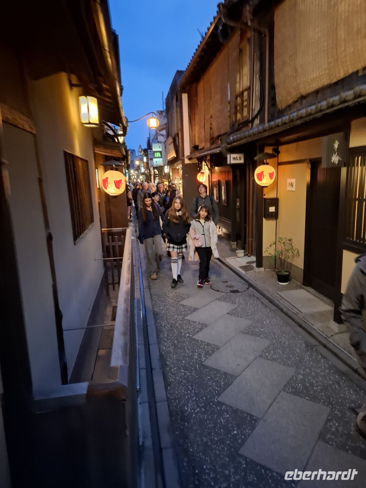 Gegen Mittag treffen wir uns an der Hotellobby, holen unser Gepäck ab und warten auf die bestellten Taxen, die uns zum Bahnhof von Hiroshima fahren. Hier besteigen wir erneut den Shinkanzen, erst im falschen Wagen, aber da meine Gruppe sehr flexibel ist, nimmt sie Gudrun und mir den kleinen Fehler nicht übel. Auf den richtigen Sitzreihen Platz genommen, fahren wir von Hiroshima, noch einmal an Himeji vorbei, nach Kyoto, unserer letzten Station auf dieser Reise. Während ich auf unser Reisegepäck aufpasse, unternimmt Gudrun mit unserer Reisegruppe eine kleine Führung durch den Bahnhof von Kyoto, der durch seinen besonderen Baustil besticht. Nach dem Hotel-Checkin steht uns der restliche Abend frei zur individuellen Gestaltung. Ein Teil meiner Reisegruppe besucht das Gion-Theater in der Nähe der "Geisha"-Straße. Hier treffe ich zum späteren Abend ein paar Gäste und gemeinsam spazieren wir zum Yakama-Schrein, an dem das Kirschblütenfest gefeiert wird. Zahlreiche Imbissstände bieten unterschiedliche Leckereien an und viele Touristen als auch Einheimische lassen sich diesen Spaß nicht entgehen.