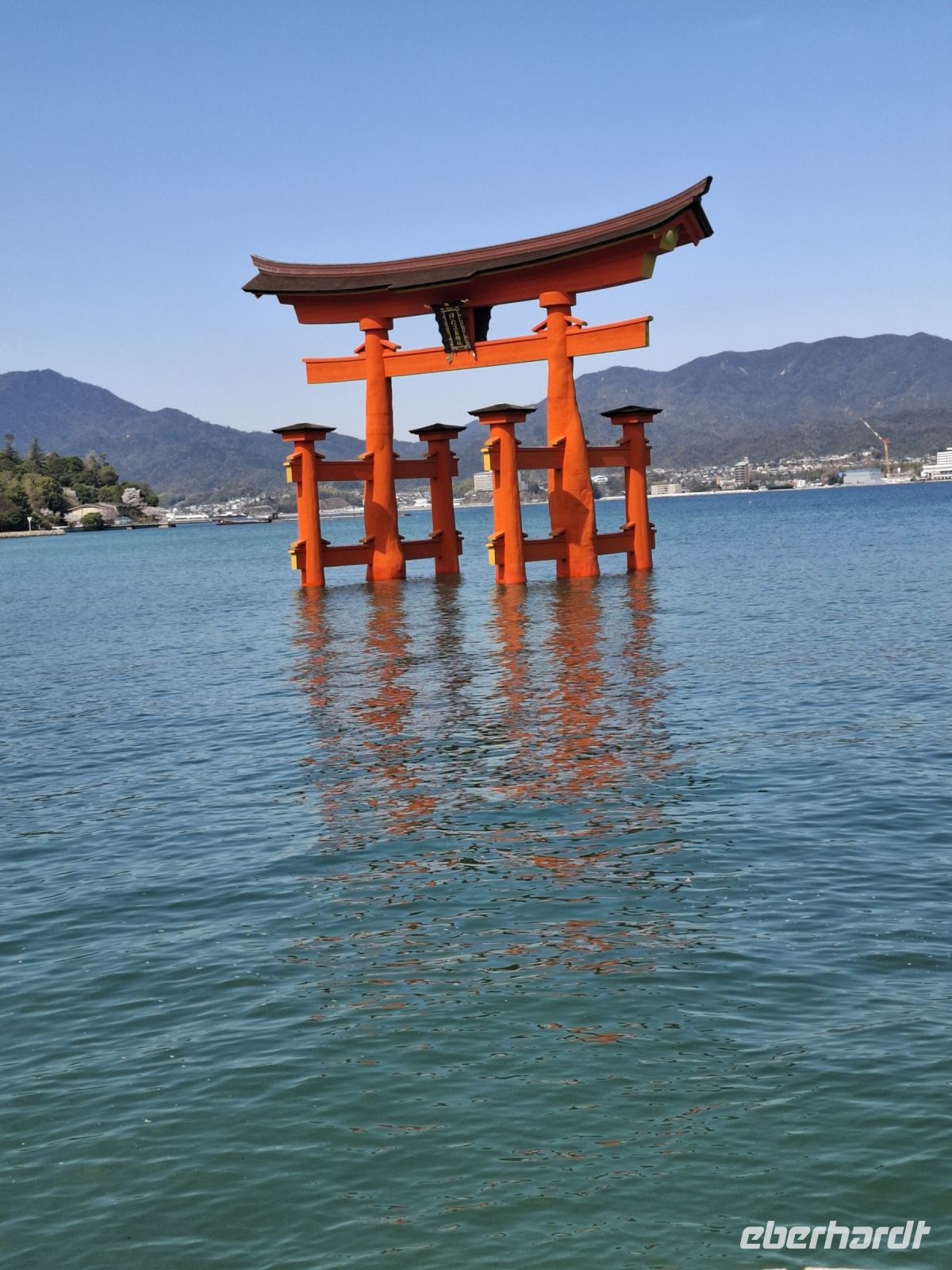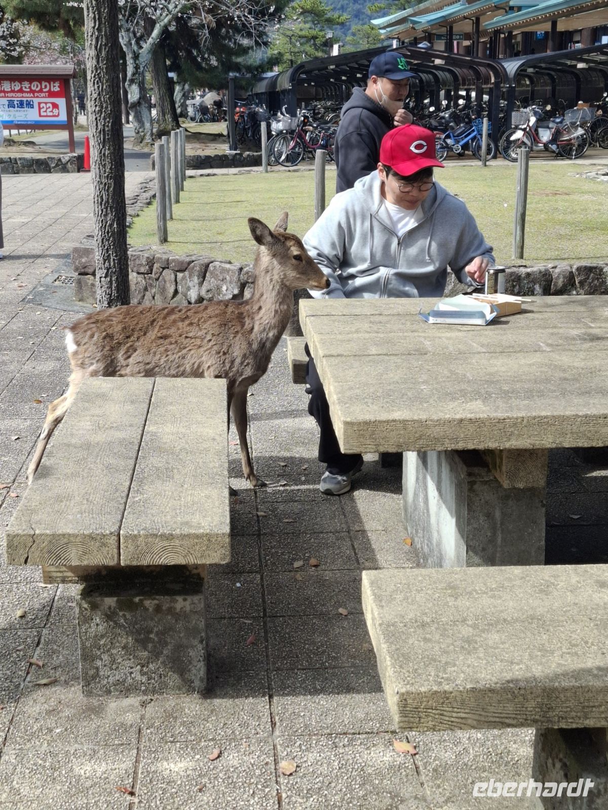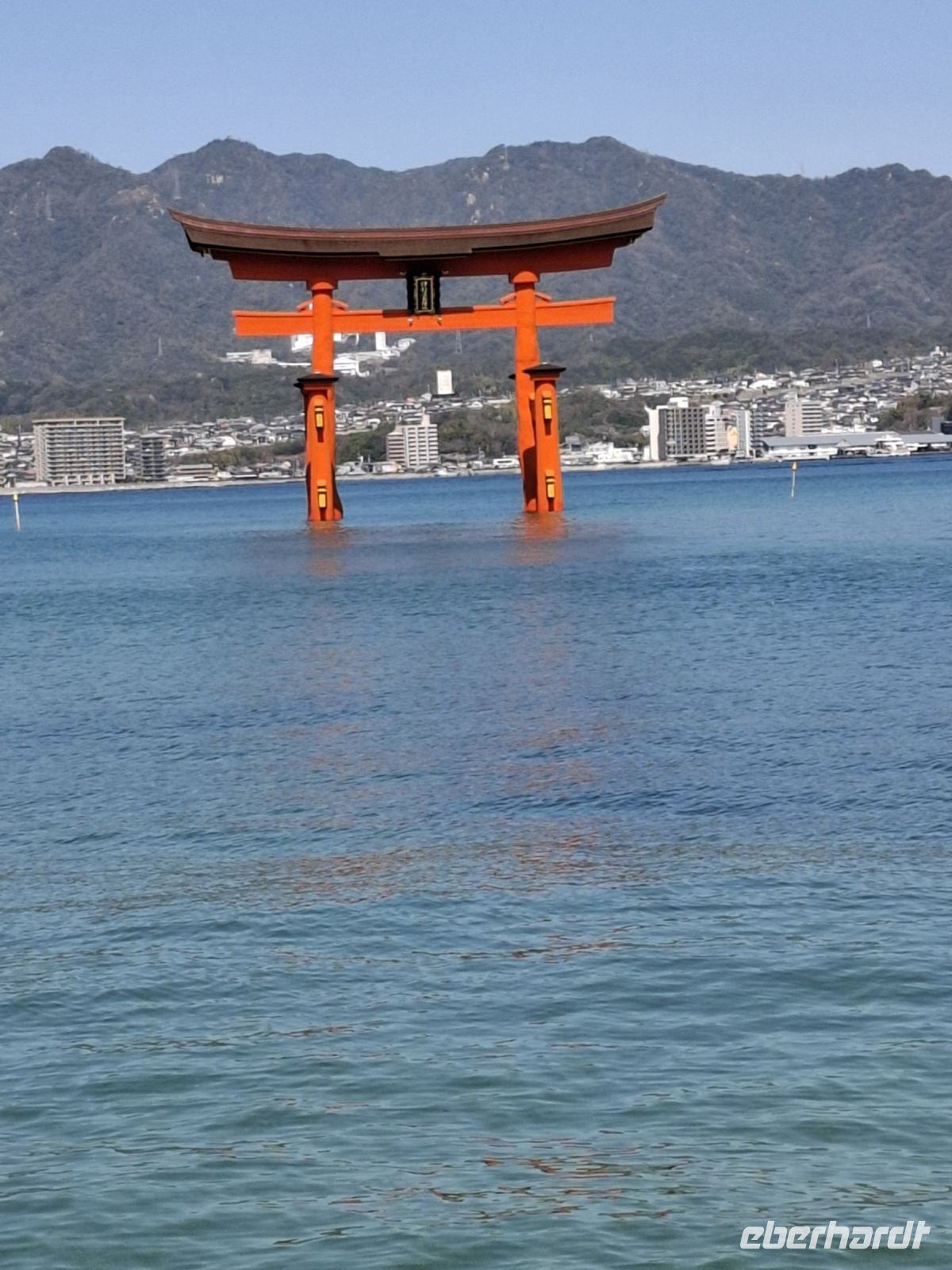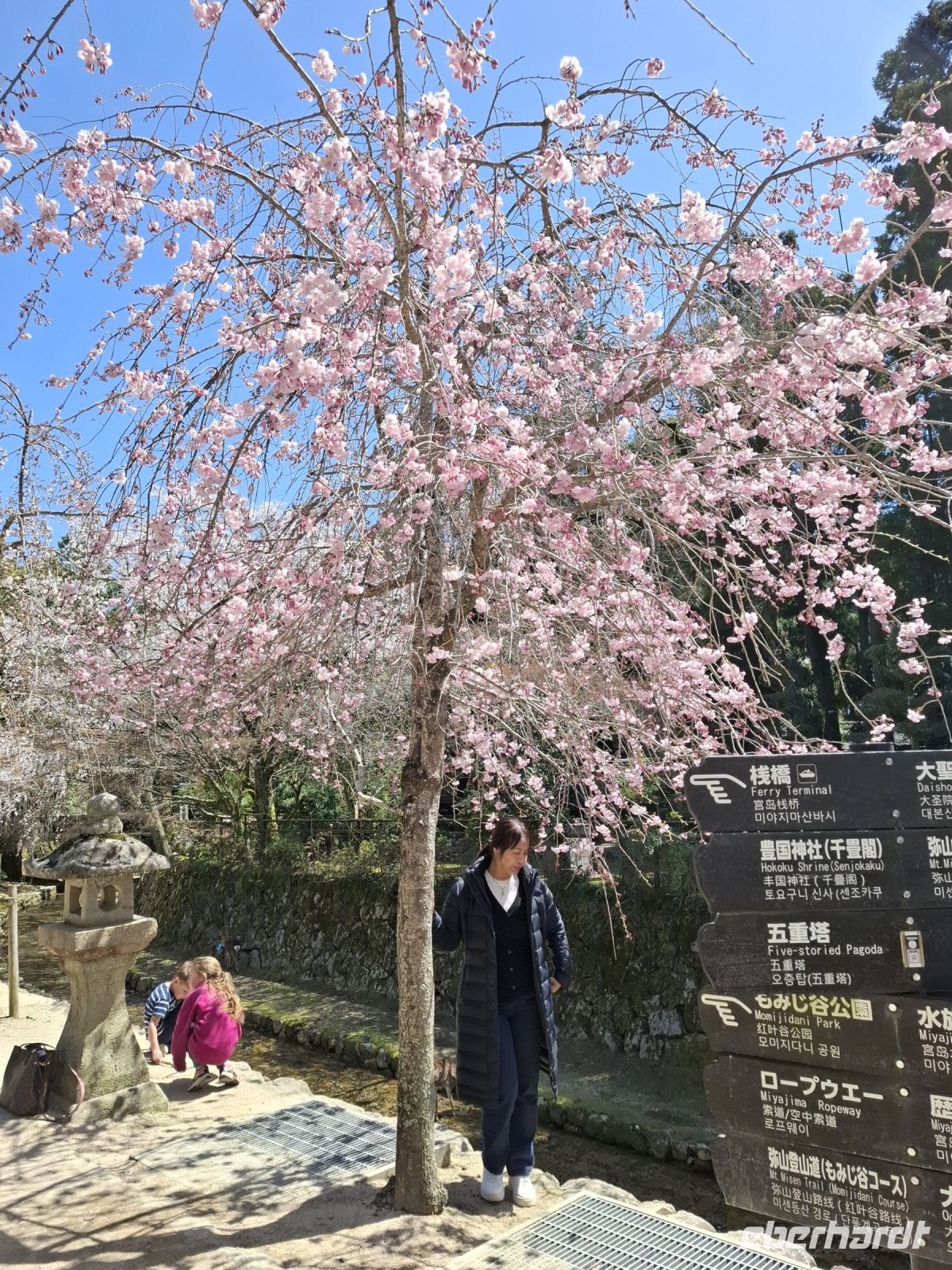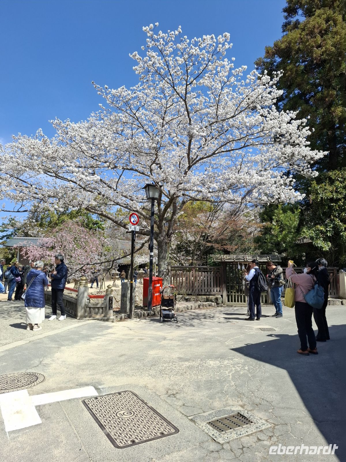 Im Hotel "The Knot" wird uns zum ersten Mal auf dieser Reise ein westliches Frühstück serviert. Müsli, Obst und Salat holen wir uns vom Buffet und bei dem Warmanteil können wir aus einer Speisekarte auswählen. Auch wenn heute eigentlich nicht ganz so viel Programm auf unserem Plan steht, treffen wir uns gegen halb, um zum nahegelegenen Bootsanleger zu spazieren. Auf dem Weg dahin begleitet uns ein Fluss an dessen Ufer wiederum Kirschbäume zu finden sind. So langsam aber sich befinden wir uns tatsächlich inmitten der beginnenden Kirschblüte - ein sehr schöner Anblick, der uns bei jedem Baum zum neuen Strahlen bringt. Kurz vor neun Uhr legt die Direktfähre, die wir aufgrund des hohen Wasserstandes noch nutzen können ab und nach rund 45 Minuten Fahrt erreichen wir die Insel Miyajima. Nachdem wir die Fähre verlassen haben, begegnen wir auch dem ersten Reh und Gudrun zeigt uns den Ort, wo wir uns am Mittag wieder treffen werden. Da wir so zeitig da sind, haben wir Glück, dass die Insel noch nicht so sehr überlaufen ist, wie sie dann am Mittag sein wird. Zudem ist noch viel Wasser da, so das wir das O-torri-Tor auch so fotografieren können, wie wir es von den Bildern her kennen. Der Tidenhub wird heute sehr groß sein: 3,15 Meter. Gemeinsam spazieren wir nun zum O-torri-Tor und trotz zahlreicher Touristen haben wir ausreichend Zeit und Möglichkeiten, dieses bekannte Tor zu fotografieren und in uns gedanklich aufzunehmen. Im Itsukushima-Schrein, den wir ums im Anschluss anschauen, haben wir das große Glück, einer Hochzeitszeremonie beizuwohnen. Es ist sehr eindrucksvoll und ehrfürchtig. Und das Brautpaar sieht sichtlich stolz aus und freut sich über so viel Interesse an ihrer Hochzeit. Was für ein außergewöhnlicher Zufall, das wir dies so miterleben durften. Auf dem Weg zum Daishoin-Tempel erfahren wir von Gudrun, dass heutzutage bereits 6000 Menschen auf der Insel Miyajima wohnen, eine beeindruckende Zahl. Auf dem Weg zum Schrein nutzen ein paar Gäste meiner Reisegruppe die Möglichkeit, die Glücksglocke erklingen zu lassen und wir hoffen nun alle, dass Glück ihr ständiger Begleiter sein wird. Nach den Gudruns Erklärungen im Tempel und den Besuch einer kleinen Grotte, löst sich unsere Reisegruppe auf und wir haben nun freie Zeit, um die Insel Miyajima für uns entdecken. Gegen Mittag, als die Touristenströme immer mehr werden, treffen wir uns und nehmen nun eine andere Fähre zurück auf das Festland. Wir erreichen einen Vorort von Hiroshima und setzen unsere weitere Rückfahrt mit zwei Metrolinien fort. Zurück am Hotel steht der Nachmittag unter dem Motto: freie Zeit. Einige Gäste kaufen ein paar Souvenirs, andere wiederum haben sich vorab von der Gruppe gelöst, um die Friedensburg zu besichtigen. Am Abend treffen wir uns am Hotel wieder, um gemeinsam in mehrere Taxen zu einem lokalen Restaurant zu fahren. Hiroshima ist nicht nur durch abscheuliche Kriegserlebnisse bekannt sondern auch für "japanische Pizza", die wir heute in einem typischen Okonomiyaki-Restaurant probieren.