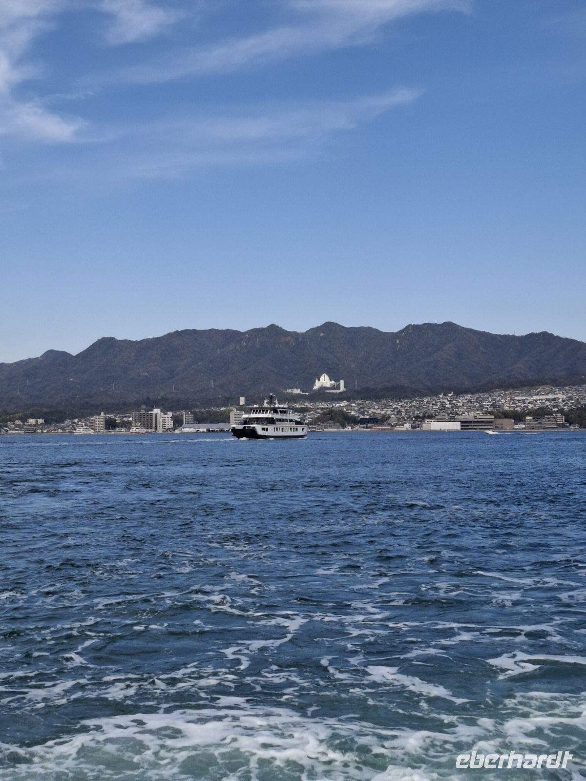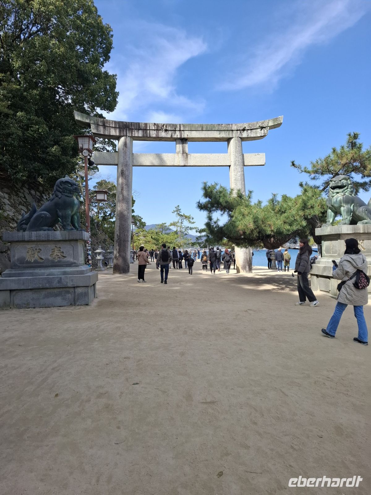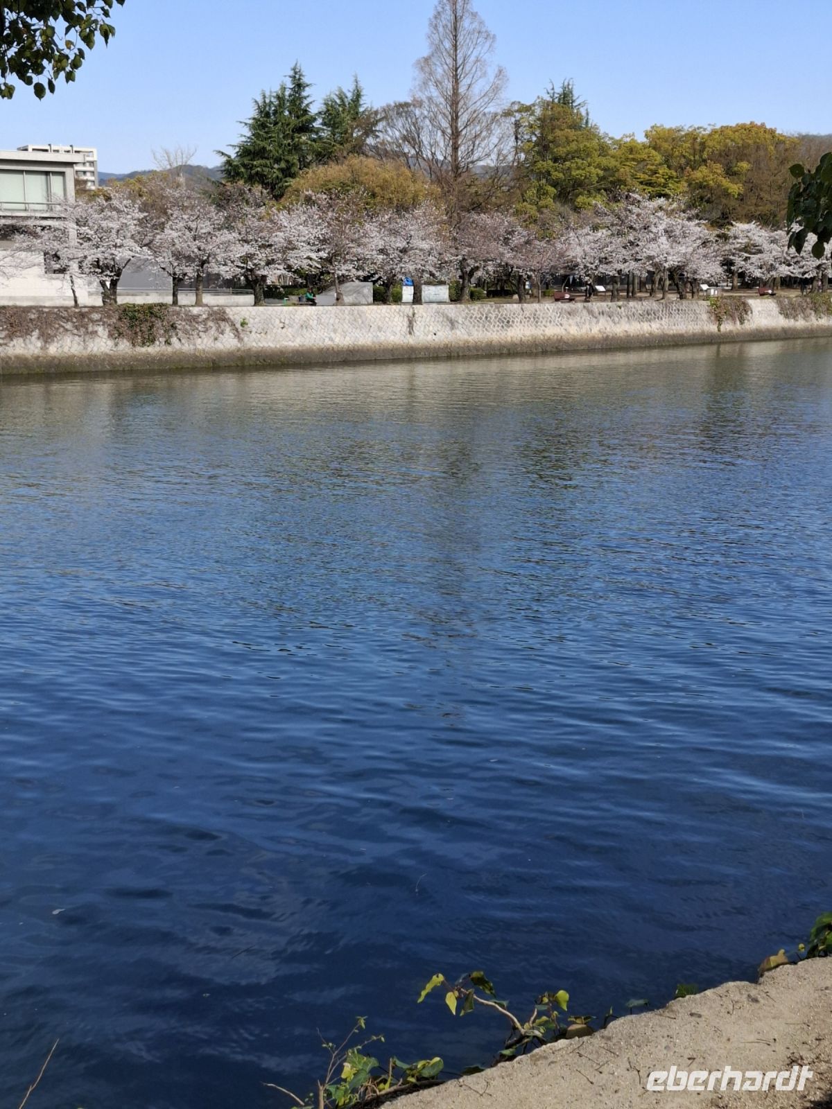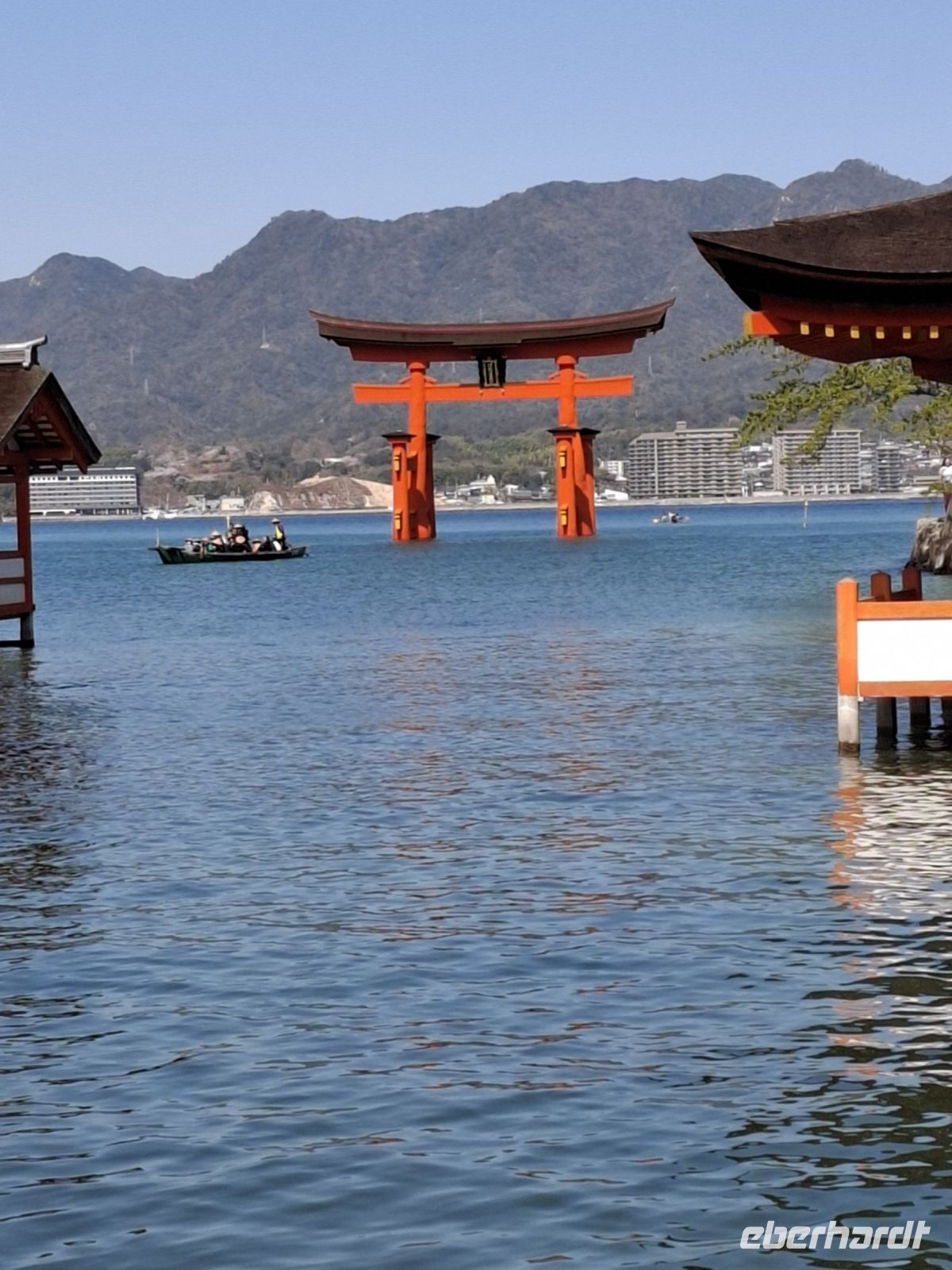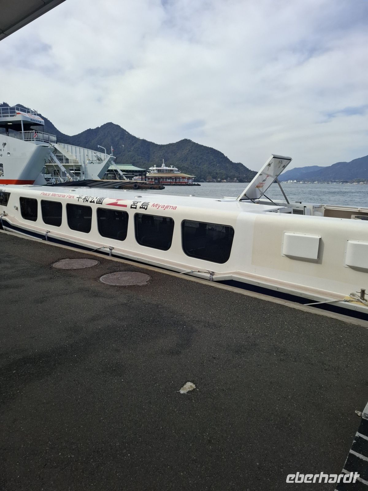 Im Hotel "The Knot" wird uns zum ersten Mal auf dieser Reise ein westliches Frühstück serviert. Müsli, Obst und Salat holen wir uns vom Buffet und bei dem Warmanteil können wir aus einer Speisekarte auswählen. Auch wenn heute eigentlich nicht ganz so viel Programm auf unserem Plan steht, treffen wir uns gegen halb, um zum nahegelegenen Bootsanleger zu spazieren. Auf dem Weg dahin begleitet uns ein Fluss an dessen Ufer wiederum Kirschbäume zu finden sind. So langsam aber sich befinden wir uns tatsächlich inmitten der beginnenden Kirschblüte - ein sehr schöner Anblick, der uns bei jedem Baum zum neuen Strahlen bringt. Kurz vor neun Uhr legt die Direktfähre, die wir aufgrund des hohen Wasserstandes noch nutzen können ab und nach rund 45 Minuten Fahrt erreichen wir die Insel Miyajima. Nachdem wir die Fähre verlassen haben, begegnen wir auch dem ersten Reh und Gudrun zeigt uns den Ort, wo wir uns am Mittag wieder treffen werden. Da wir so zeitig da sind, haben wir Glück, dass die Insel noch nicht so sehr überlaufen ist, wie sie dann am Mittag sein wird. Zudem ist noch viel Wasser da, so das wir das O-torri-Tor auch so fotografieren können, wie wir es von den Bildern her kennen. Der Tidenhub wird heute sehr groß sein: 3,15 Meter. Gemeinsam spazieren wir nun zum O-torri-Tor und trotz zahlreicher Touristen haben wir ausreichend Zeit und Möglichkeiten, dieses bekannte Tor zu fotografieren und in uns gedanklich aufzunehmen. Im Itsukushima-Schrein, den wir ums im Anschluss anschauen, haben wir das große Glück, einer Hochzeitszeremonie beizuwohnen. Es ist sehr eindrucksvoll und ehrfürchtig. Und das Brautpaar sieht sichtlich stolz aus und freut sich über so viel Interesse an ihrer Hochzeit. Was für ein außergewöhnlicher Zufall, das wir dies so miterleben durften. Auf dem Weg zum Daishoin-Tempel erfahren wir von Gudrun, dass heutzutage bereits 6000 Menschen auf der Insel Miyajima wohnen, eine beeindruckende Zahl. Auf dem Weg zum Schrein nutzen ein paar Gäste meiner Reisegruppe die Möglichkeit, die Glücksglocke erklingen zu lassen und wir hoffen nun alle, dass Glück ihr ständiger Begleiter sein wird. Nach den Gudruns Erklärungen im Tempel und den Besuch einer kleinen Grotte, löst sich unsere Reisegruppe auf und wir haben nun freie Zeit, um die Insel Miyajima für uns entdecken. Gegen Mittag, als die Touristenströme immer mehr werden, treffen wir uns und nehmen nun eine andere Fähre zurück auf das Festland. Wir erreichen einen Vorort von Hiroshima und setzen unsere weitere Rückfahrt mit zwei Metrolinien fort. Zurück am Hotel steht der Nachmittag unter dem Motto: freie Zeit. Einige Gäste kaufen ein paar Souvenirs, andere wiederum haben sich vorab von der Gruppe gelöst, um die Friedensburg zu besichtigen. Am Abend treffen wir uns am Hotel wieder, um gemeinsam in mehrere Taxen zu einem lokalen Restaurant zu fahren. Hiroshima ist nicht nur durch abscheuliche Kriegserlebnisse bekannt sondern auch für "japanische Pizza", die wir heute in einem typischen Okonomiyaki-Restaurant probieren.