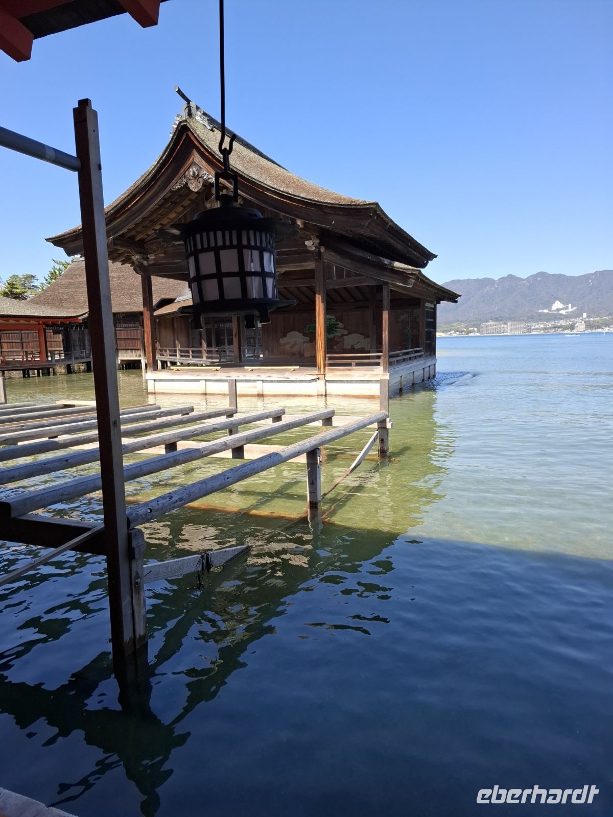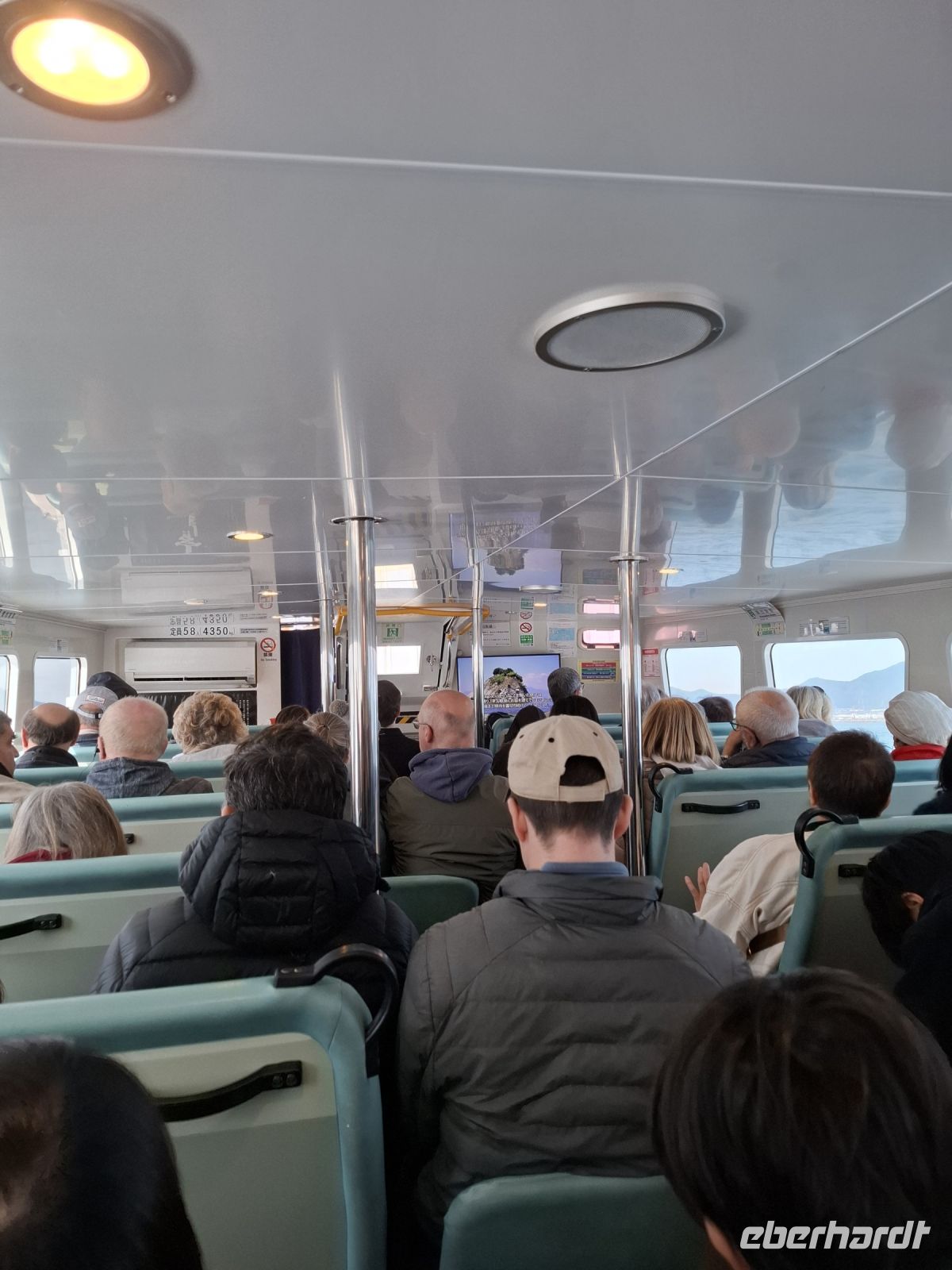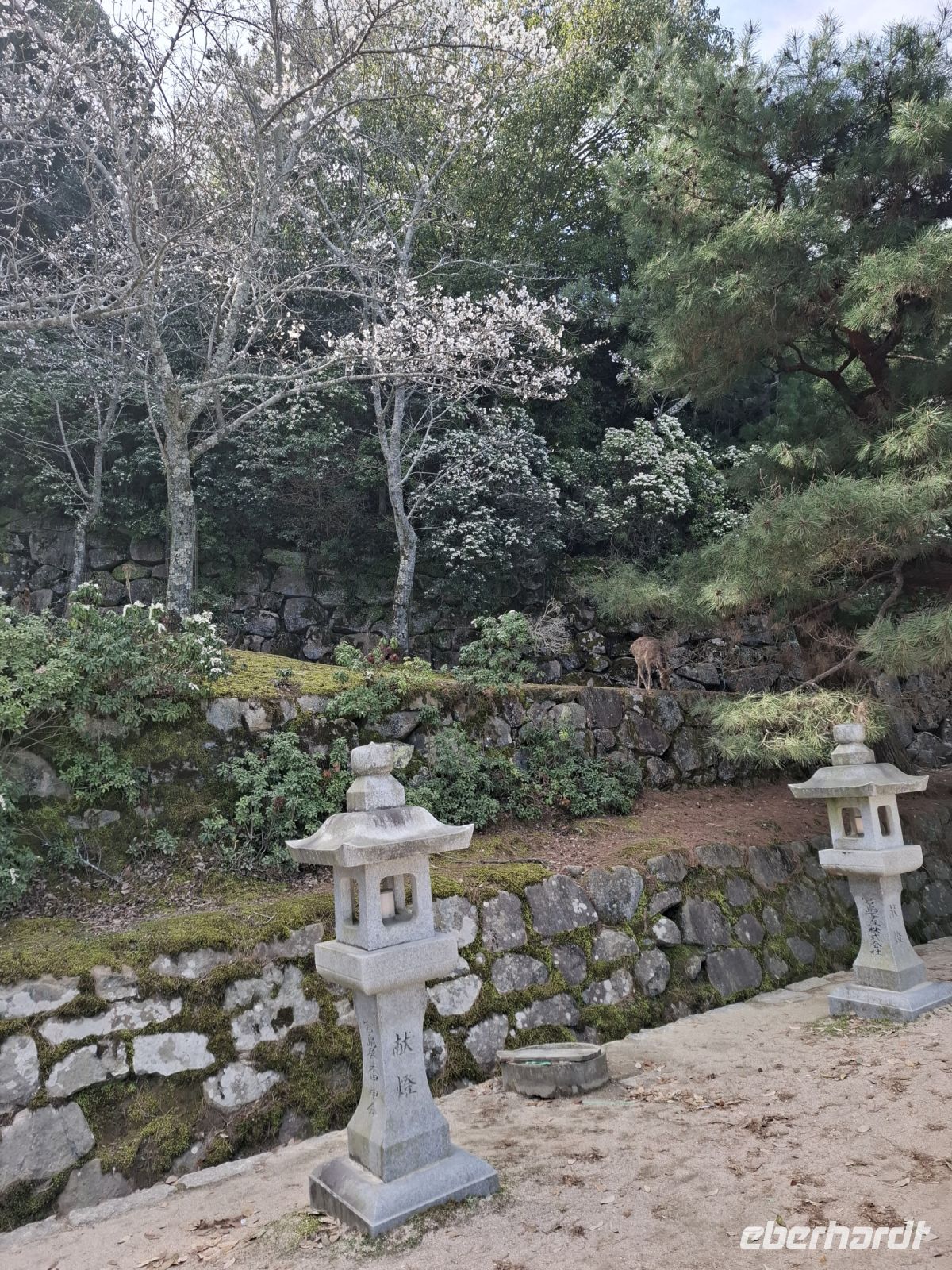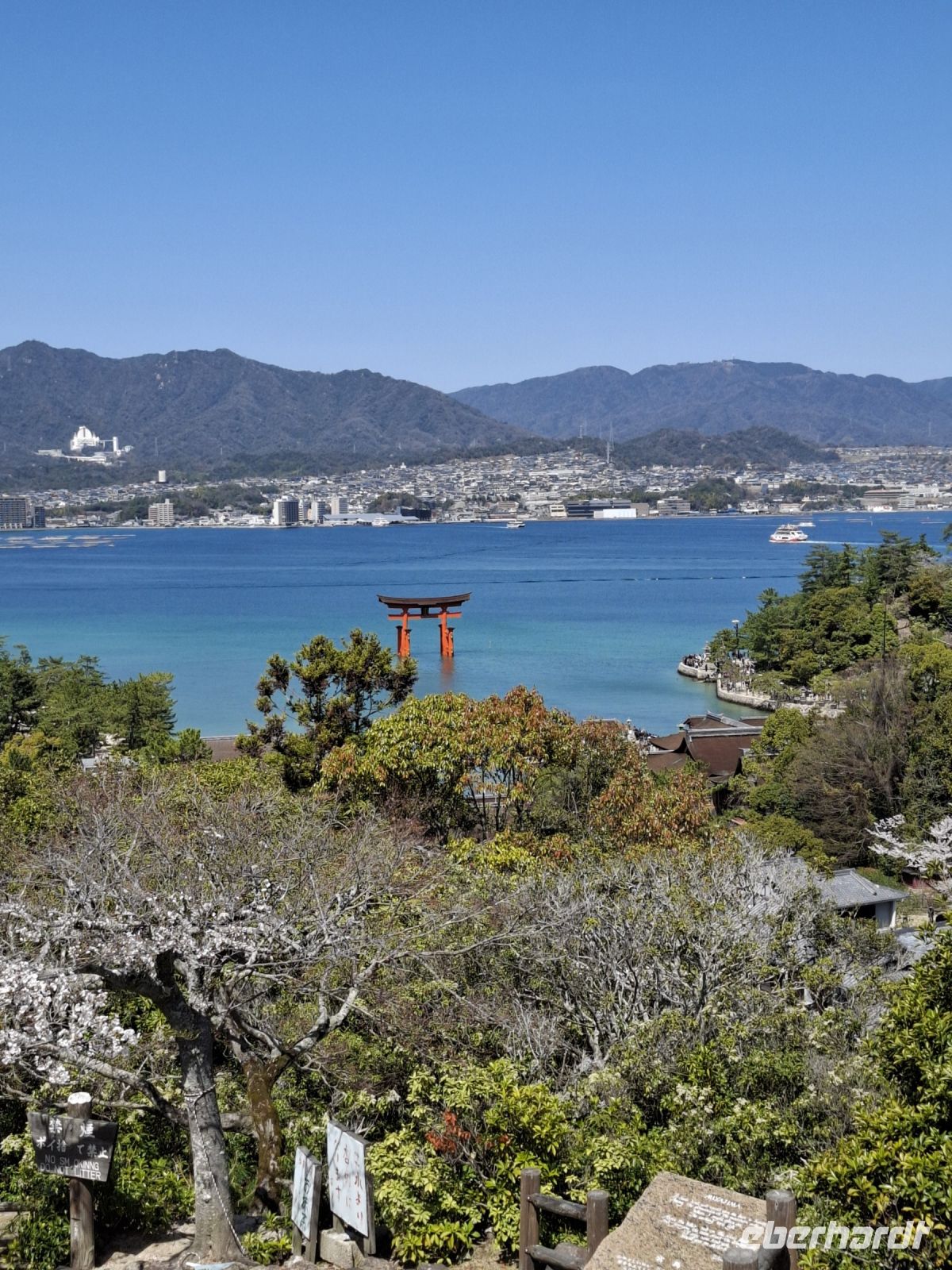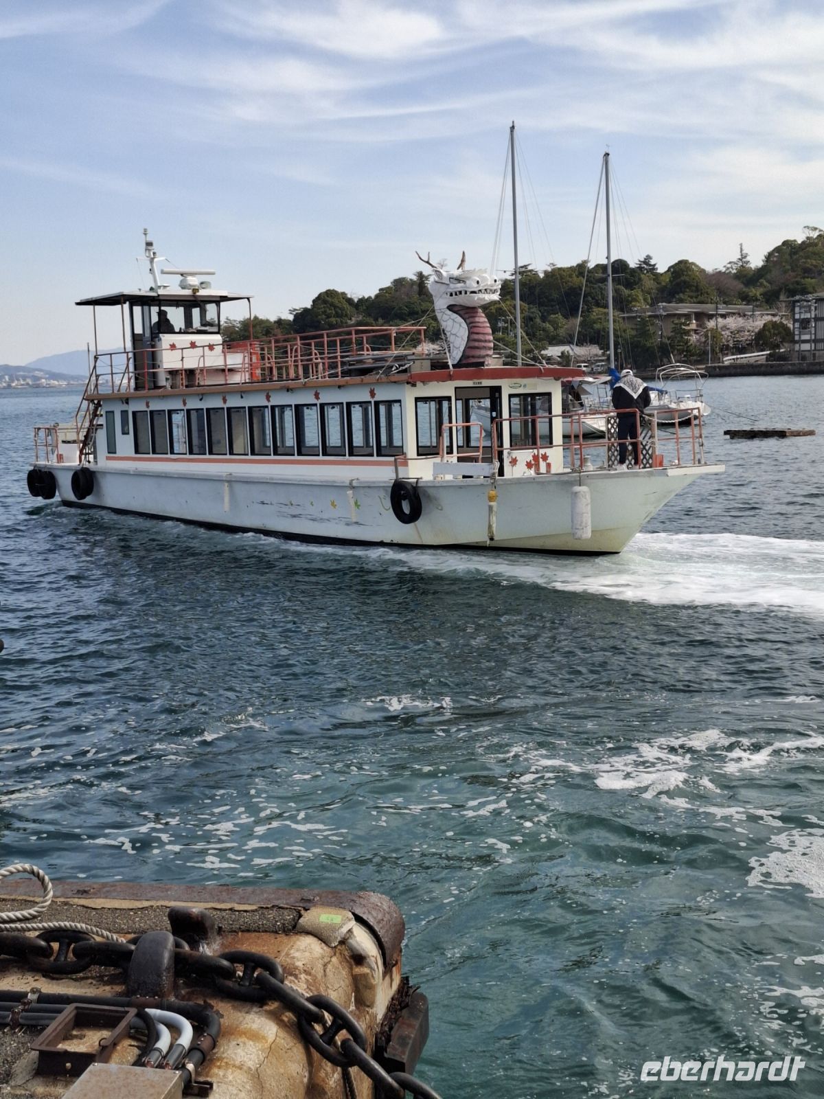 Im Hotel "The Knot" wird uns zum ersten Mal auf dieser Reise ein westliches Frühstück serviert. Müsli, Obst und Salat holen wir uns vom Buffet und bei dem Warmanteil können wir aus einer Speisekarte auswählen. Auch wenn heute eigentlich nicht ganz so viel Programm auf unserem Plan steht, treffen wir uns gegen halb, um zum nahegelegenen Bootsanleger zu spazieren. Auf dem Weg dahin begleitet uns ein Fluss an dessen Ufer wiederum Kirschbäume zu finden sind. So langsam aber sich befinden wir uns tatsächlich inmitten der beginnenden Kirschblüte - ein sehr schöner Anblick, der uns bei jedem Baum zum neuen Strahlen bringt. Kurz vor neun Uhr legt die Direktfähre, die wir aufgrund des hohen Wasserstandes noch nutzen können ab und nach rund 45 Minuten Fahrt erreichen wir die Insel Miyajima. Nachdem wir die Fähre verlassen haben, begegnen wir auch dem ersten Reh und Gudrun zeigt uns den Ort, wo wir uns am Mittag wieder treffen werden. Da wir so zeitig da sind, haben wir Glück, dass die Insel noch nicht so sehr überlaufen ist, wie sie dann am Mittag sein wird. Zudem ist noch viel Wasser da, so das wir das O-torri-Tor auch so fotografieren können, wie wir es von den Bildern her kennen. Der Tidenhub wird heute sehr groß sein: 3,15 Meter. Gemeinsam spazieren wir nun zum O-torri-Tor und trotz zahlreicher Touristen haben wir ausreichend Zeit und Möglichkeiten, dieses bekannte Tor zu fotografieren und in uns gedanklich aufzunehmen. Im Itsukushima-Schrein, den wir ums im Anschluss anschauen, haben wir das große Glück, einer Hochzeitszeremonie beizuwohnen. Es ist sehr eindrucksvoll und ehrfürchtig. Und das Brautpaar sieht sichtlich stolz aus und freut sich über so viel Interesse an ihrer Hochzeit. Was für ein außergewöhnlicher Zufall, das wir dies so miterleben durften. Auf dem Weg zum Daishoin-Tempel erfahren wir von Gudrun, dass heutzutage bereits 6000 Menschen auf der Insel Miyajima wohnen, eine beeindruckende Zahl. Auf dem Weg zum Schrein nutzen ein paar Gäste meiner Reisegruppe die Möglichkeit, die Glücksglocke erklingen zu lassen und wir hoffen nun alle, dass Glück ihr ständiger Begleiter sein wird. Nach den Gudruns Erklärungen im Tempel und den Besuch einer kleinen Grotte, löst sich unsere Reisegruppe auf und wir haben nun freie Zeit, um die Insel Miyajima für uns entdecken. Gegen Mittag, als die Touristenströme immer mehr werden, treffen wir uns und nehmen nun eine andere Fähre zurück auf das Festland. Wir erreichen einen Vorort von Hiroshima und setzen unsere weitere Rückfahrt mit zwei Metrolinien fort. Zurück am Hotel steht der Nachmittag unter dem Motto: freie Zeit. Einige Gäste kaufen ein paar Souvenirs, andere wiederum haben sich vorab von der Gruppe gelöst, um die Friedensburg zu besichtigen. Am Abend treffen wir uns am Hotel wieder, um gemeinsam in mehrere Taxen zu einem lokalen Restaurant zu fahren. Hiroshima ist nicht nur durch abscheuliche Kriegserlebnisse bekannt sondern auch für "japanische Pizza", die wir heute in einem typischen Okonomiyaki-Restaurant probieren.