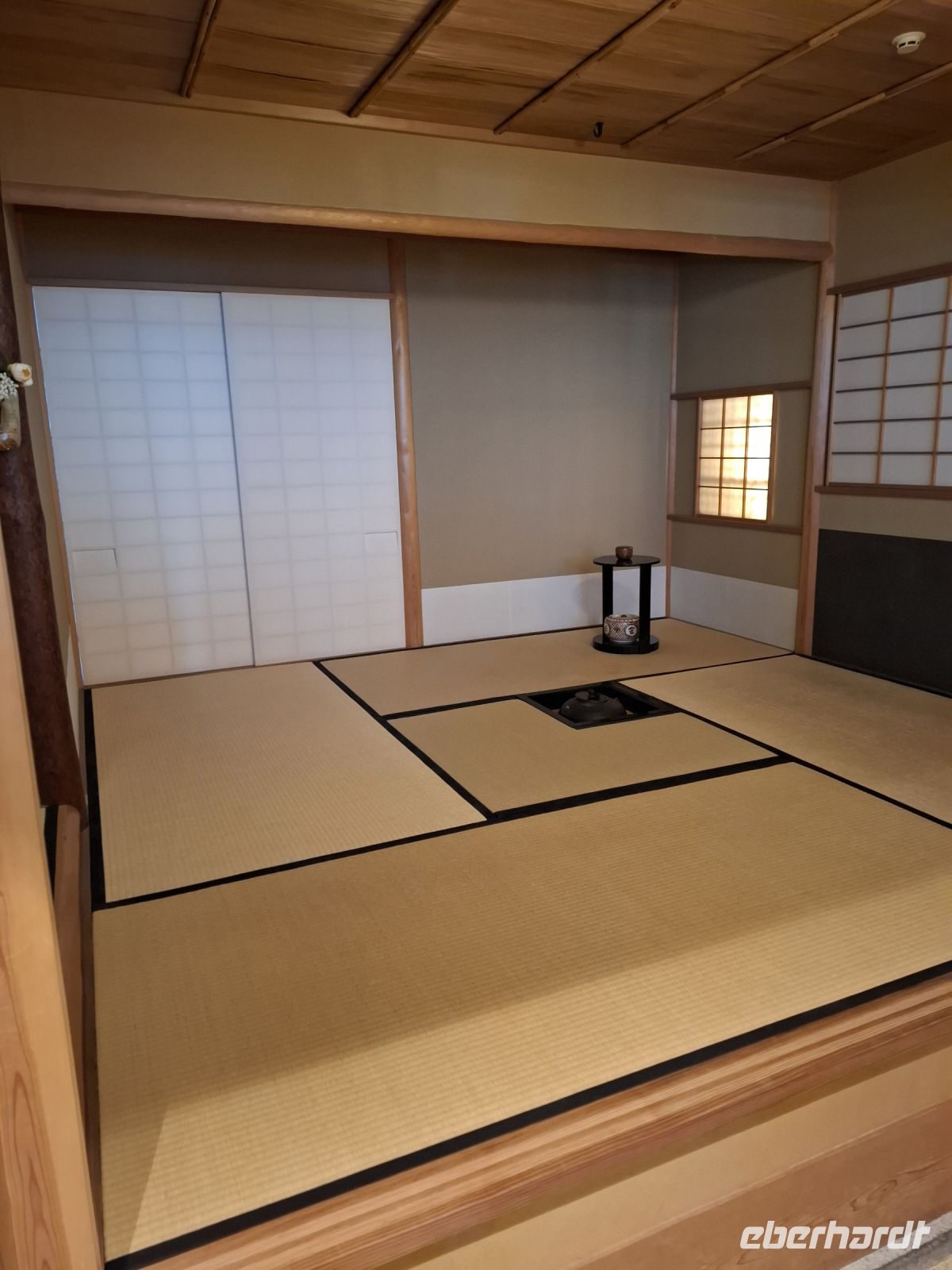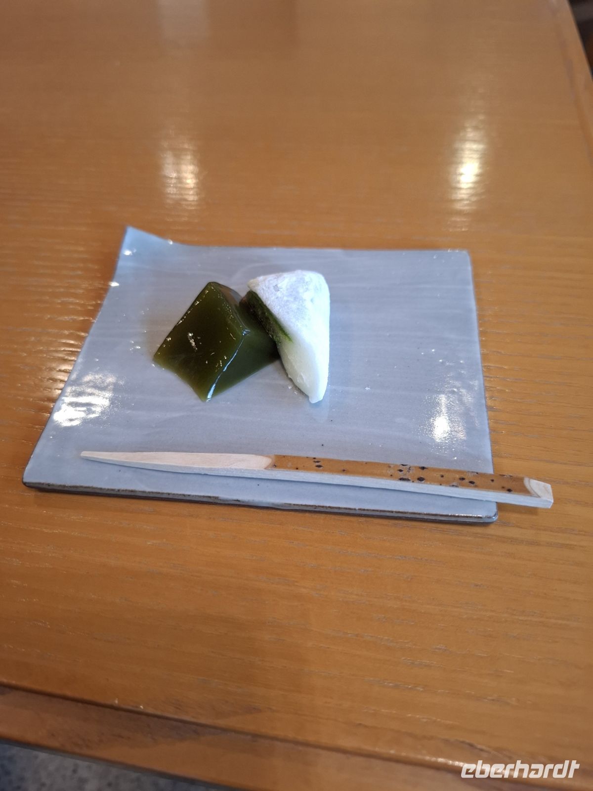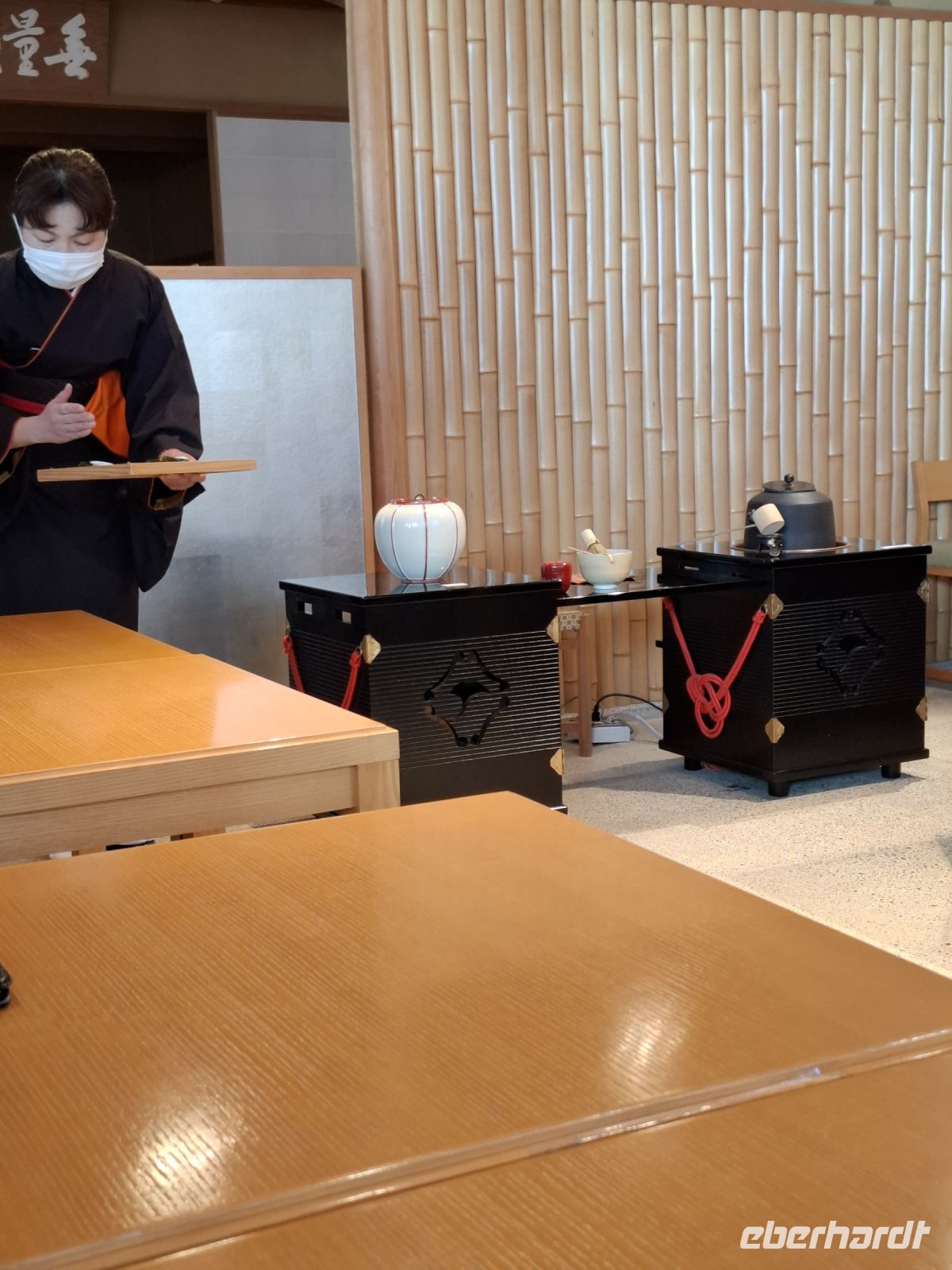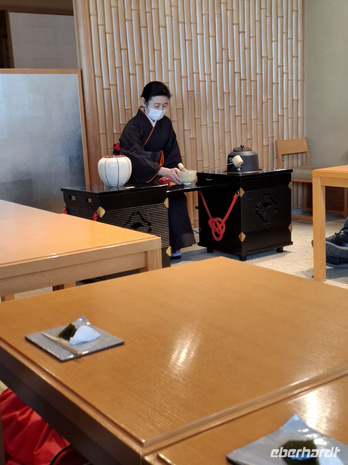 Unsere Mittagspause verbringen wir im Areal des Teramachi-Marktes, wo es zahlreiche Souvenirläden, Imbissstände und Restaurants gibt. Danach nehmen wir im Gästeraum eines Teehauses Platz,wo uns die japanischen Teezeremonie vorgestellt wird. Zunächst begrüßt uns die Teemeisterin mit einer traditionellen Verbeugung. Dann nimmt sie Platz und bereitet mit ruhiger Hand die notwendigen Utensilien wie Teeschale, Bambusbesen und Teelöffel vor. Zunächst wird der Matcha mit einem Bambusbesen in heißem Wasser aufgeschlagen, um einen gleichmäßigen, schaumigen Tee zu erzeugen. Währenddessen wird uns eine süße Kleinigkeit (ein Mochi) serviert, welches wir vor dem Teetrinken verspeisen. Nun erhalten wir eine Teeschale, in dem sich der Macha-Tee befindet. Vor dem Trinken des Tees, drehen wir die Schale, um die Teemeisterin zu ehren und anschließend trinken wir den Tee in drei bis vier Schlucken aus, wobei der letzte Schluck lauter geschlürft werden soll, um zu bekunden, dass uns der Tee schmeckt.