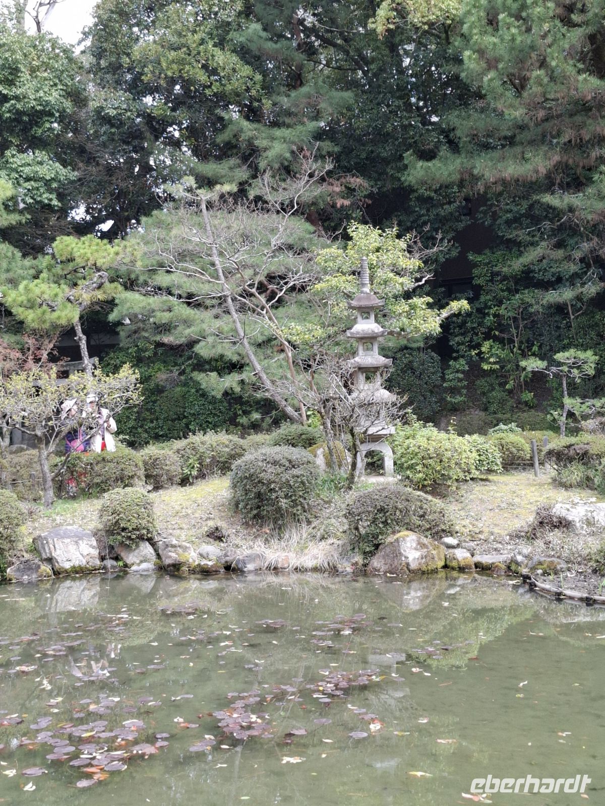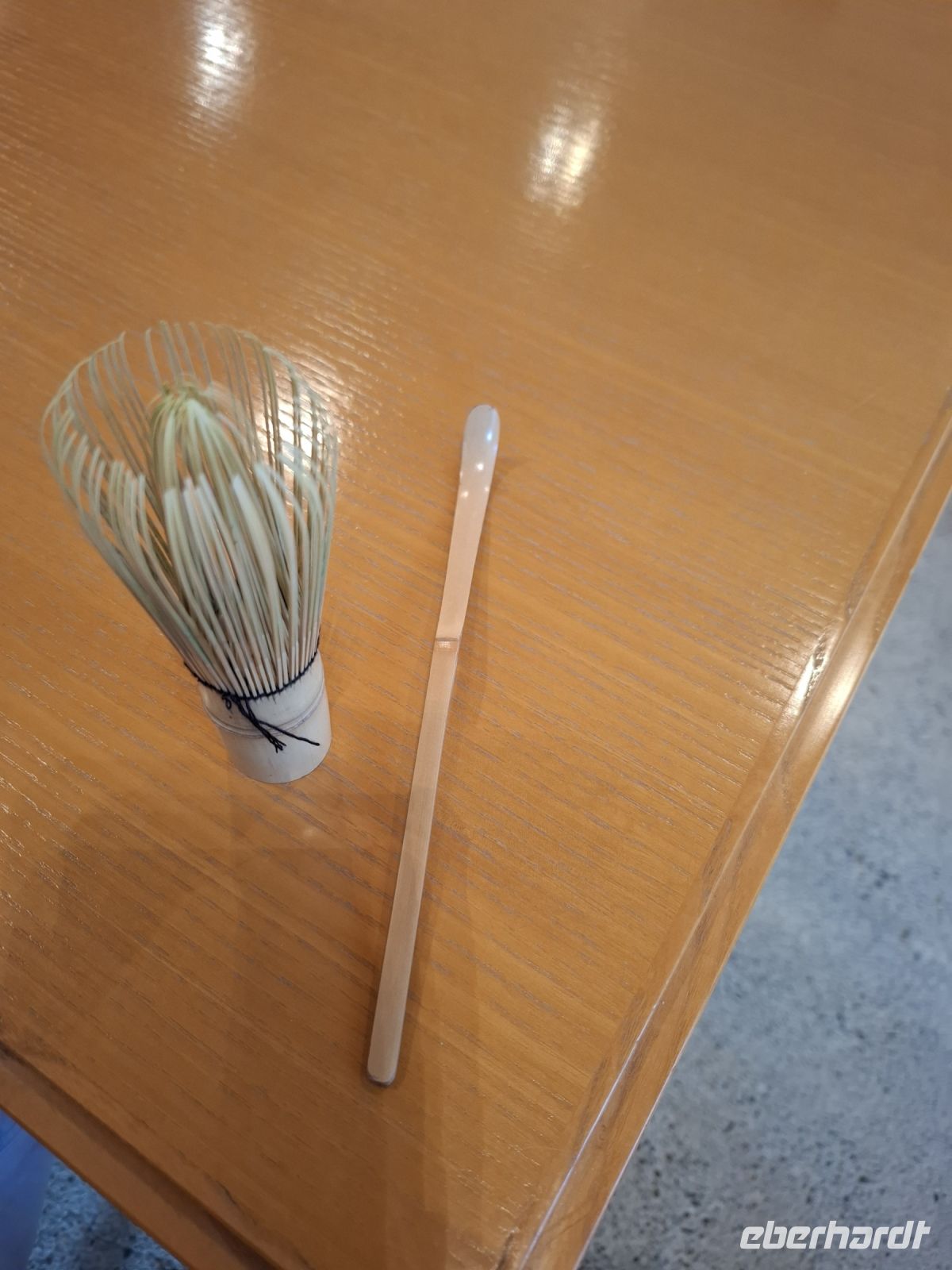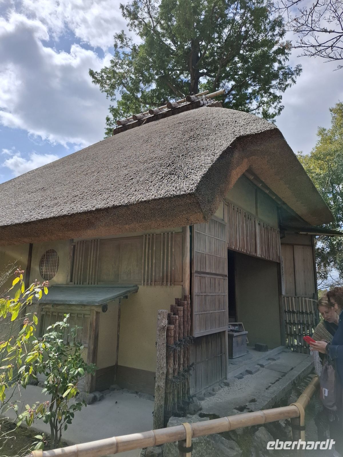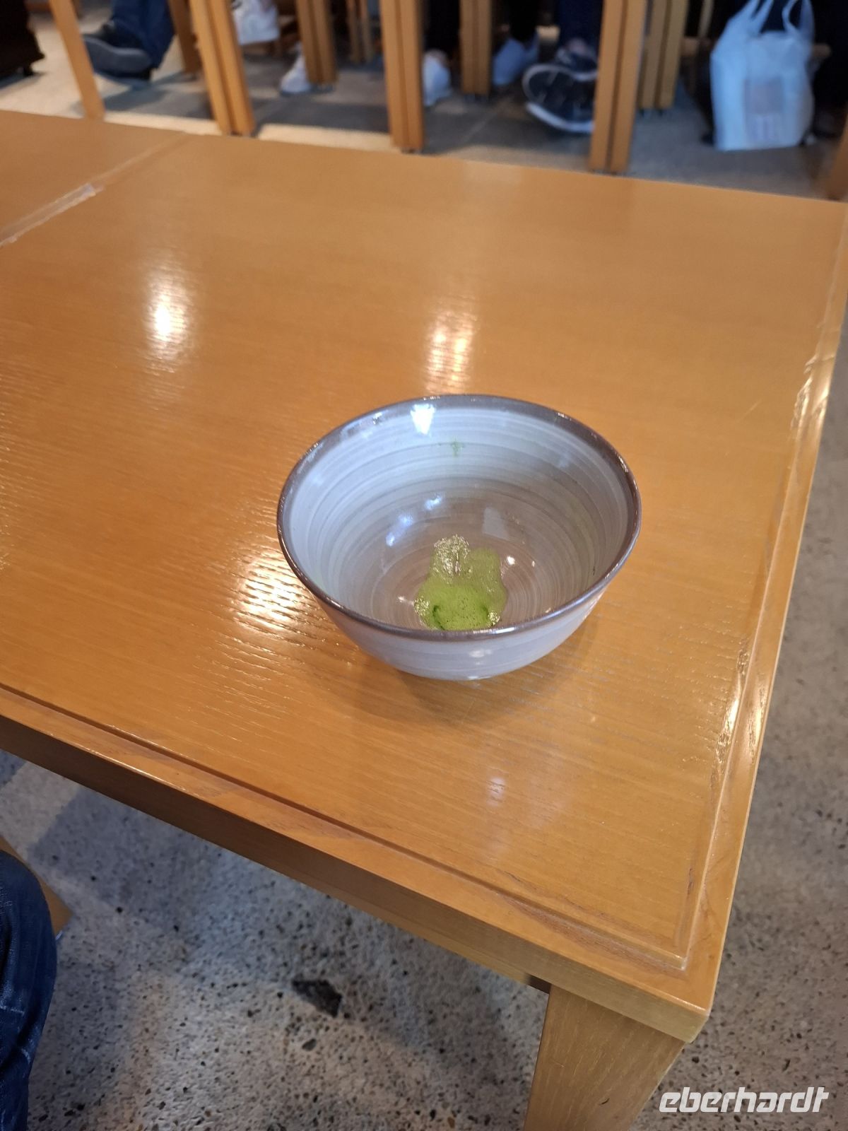 Unsere Mittagspause verbringen wir im Areal des Teramachi-Marktes, wo es zahlreiche Souvenirläden, Imbissstände und Restaurants gibt. Danach nehmen wir im Gästeraum eines Teehauses Platz,wo uns die japanischen Teezeremonie vorgestellt wird. Zunächst begrüßt uns die Teemeisterin mit einer traditionellen Verbeugung. Dann nimmt sie Platz und bereitet mit ruhiger Hand die notwendigen Utensilien wie Teeschale, Bambusbesen und Teelöffel vor. Zunächst wird der Matcha mit einem Bambusbesen in heißem Wasser aufgeschlagen, um einen gleichmäßigen, schaumigen Tee zu erzeugen. Währenddessen wird uns eine süße Kleinigkeit (ein Mochi) serviert, welches wir vor dem Teetrinken verspeisen. Nun erhalten wir eine Teeschale, in dem sich der Macha-Tee befindet. Vor dem Trinken des Tees, drehen wir die Schale, um die Teemeisterin zu ehren und anschließend trinken wir den Tee in drei bis vier Schlucken aus, wobei der letzte Schluck lauter geschlürft werden soll, um zu bekunden, dass uns der Tee schmeckt.