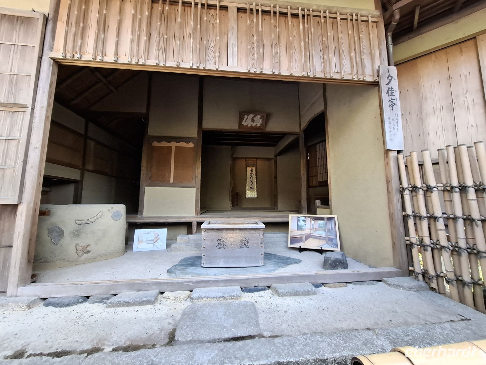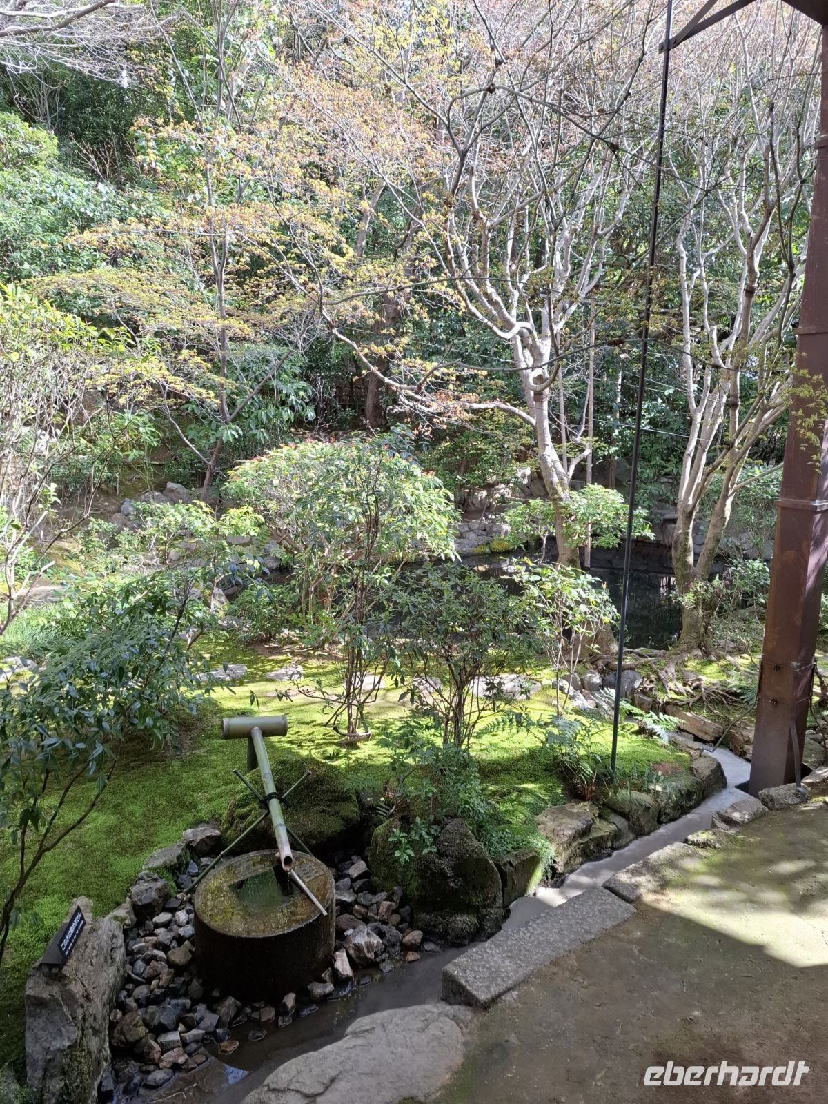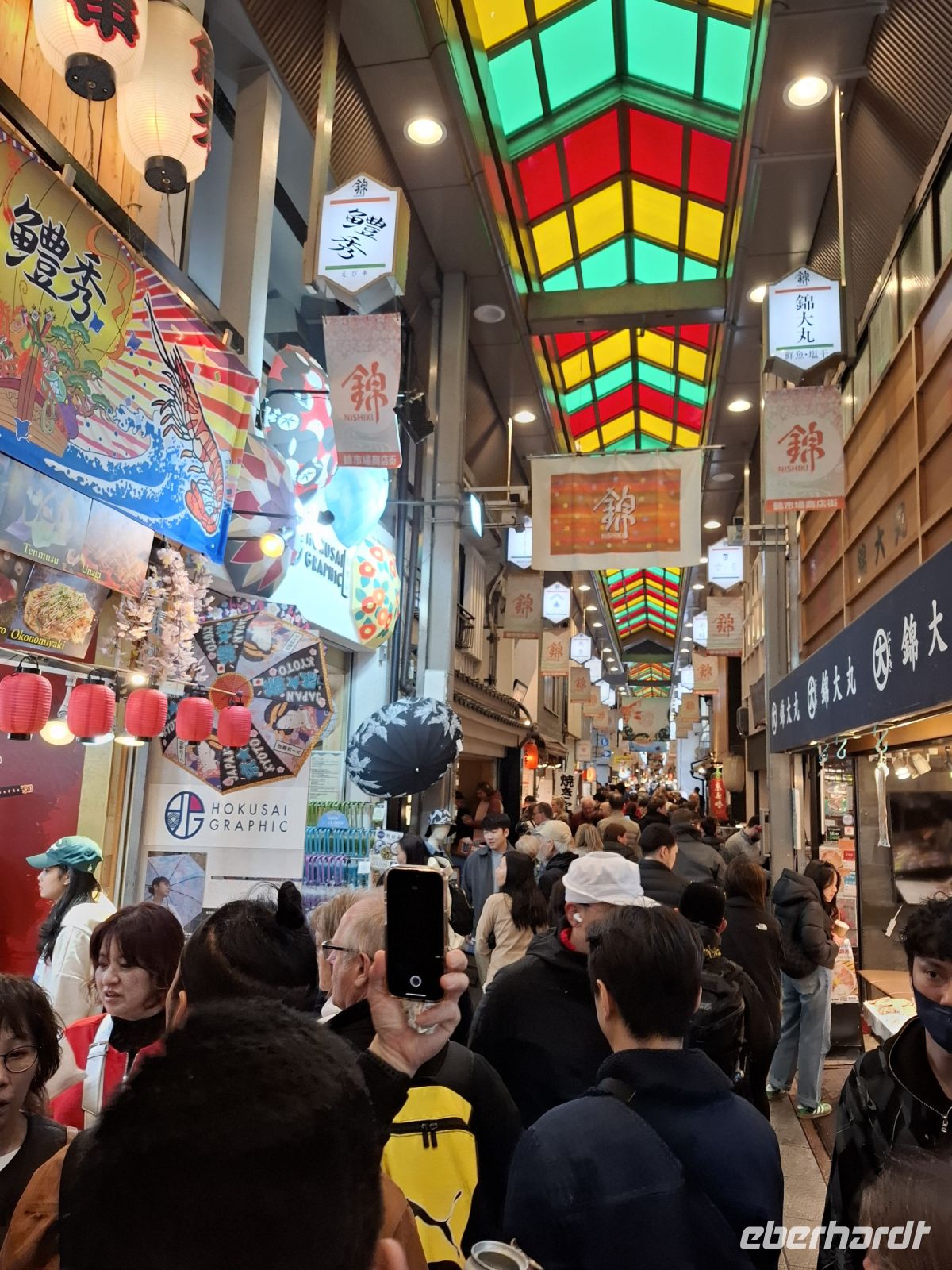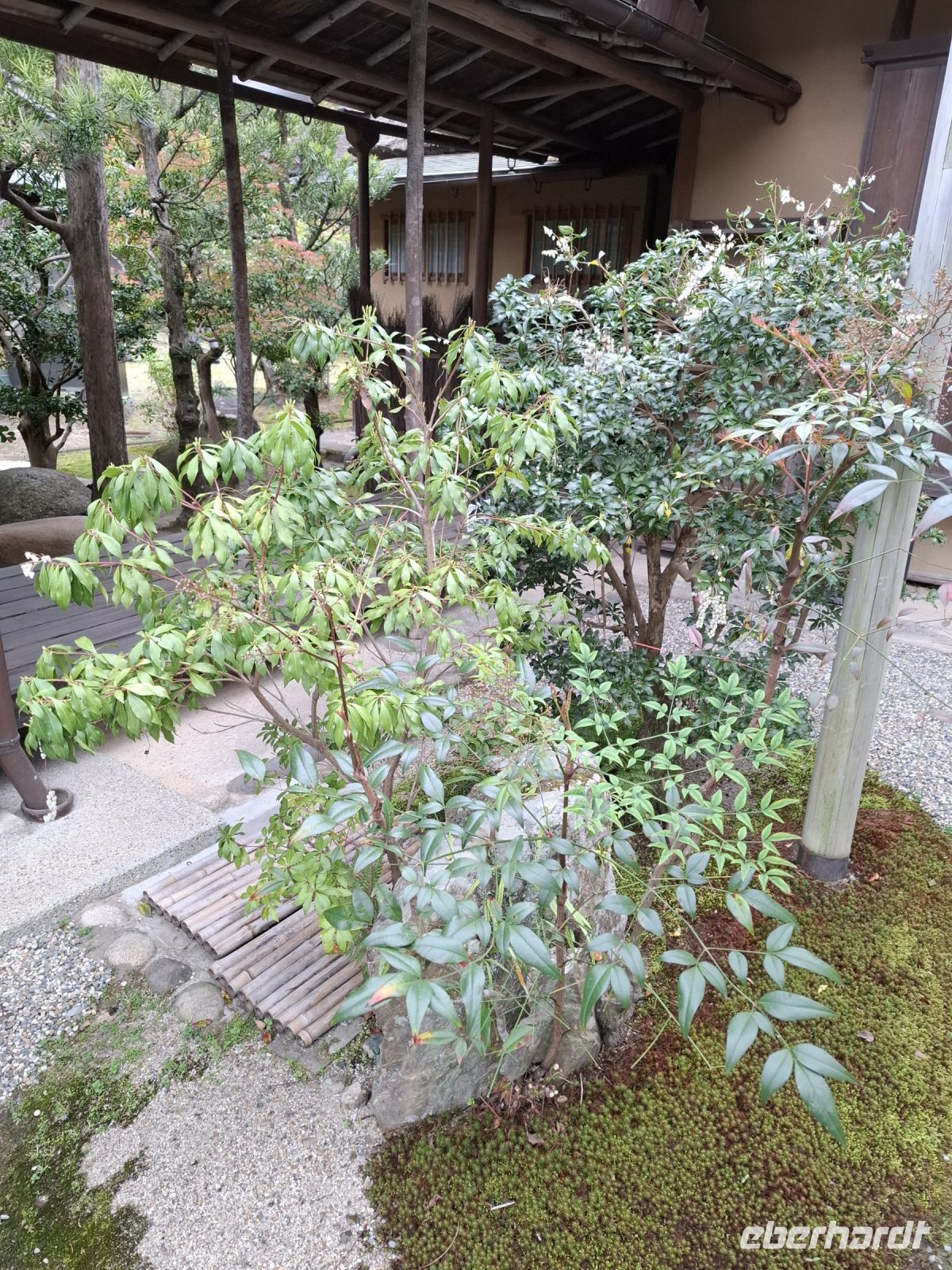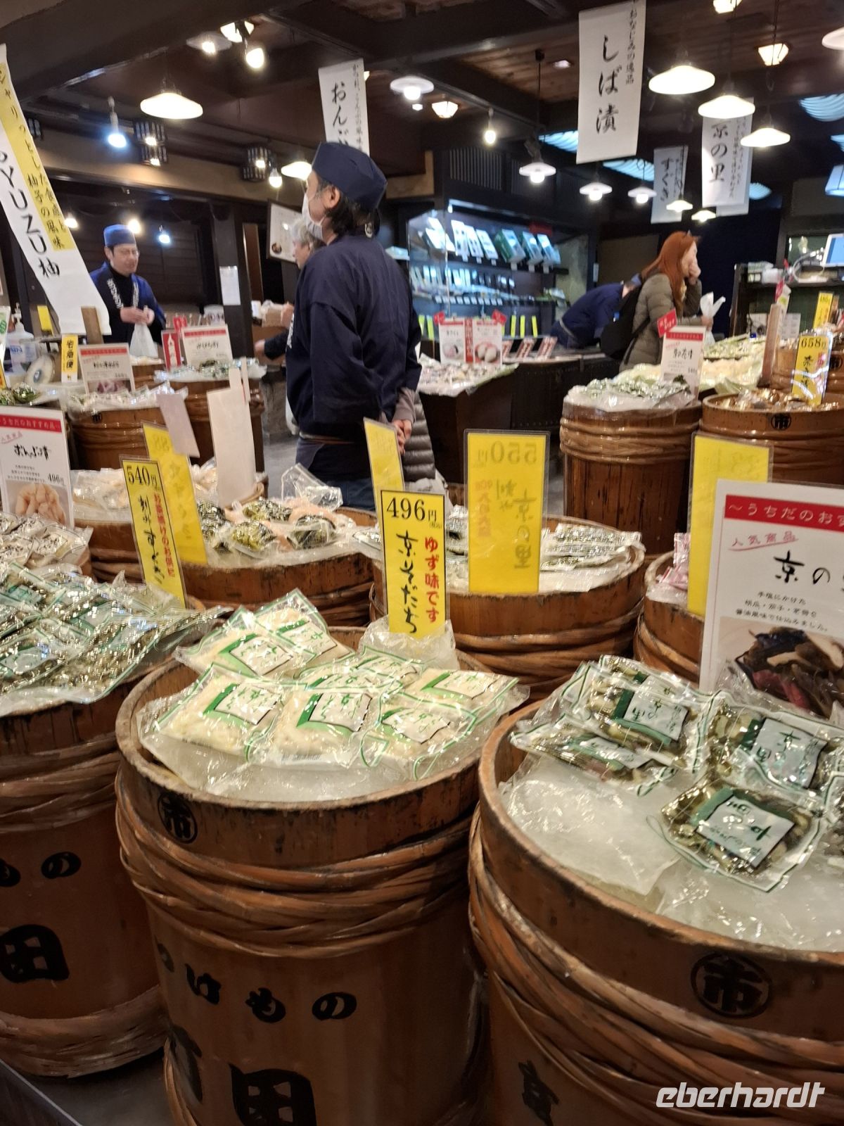 Unsere Mittagspause verbringen wir im Areal des Teramachi-Marktes, wo es zahlreiche Souvenirläden, Imbissstände und Restaurants gibt. Danach nehmen wir im Gästeraum eines Teehauses Platz,wo uns die japanischen Teezeremonie vorgestellt wird. Zunächst begrüßt uns die Teemeisterin mit einer traditionellen Verbeugung. Dann nimmt sie Platz und bereitet mit ruhiger Hand die notwendigen Utensilien wie Teeschale, Bambusbesen und Teelöffel vor. Zunächst wird der Matcha mit einem Bambusbesen in heißem Wasser aufgeschlagen, um einen gleichmäßigen, schaumigen Tee zu erzeugen. Währenddessen wird uns eine süße Kleinigkeit (ein Mochi) serviert, welches wir vor dem Teetrinken verspeisen. Nun erhalten wir eine Teeschale, in dem sich der Macha-Tee befindet. Vor dem Trinken des Tees, drehen wir die Schale, um die Teemeisterin zu ehren und anschließend trinken wir den Tee in drei bis vier Schlucken aus, wobei der letzte Schluck lauter geschlürft werden soll, um zu bekunden, dass uns der Tee schmeckt.
