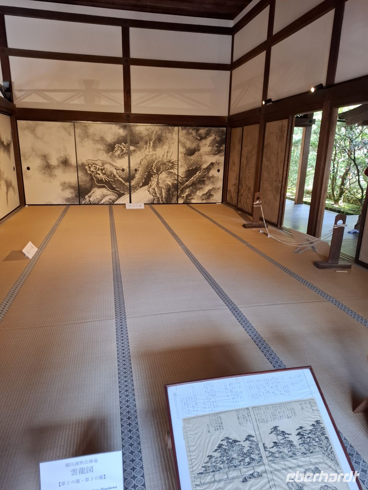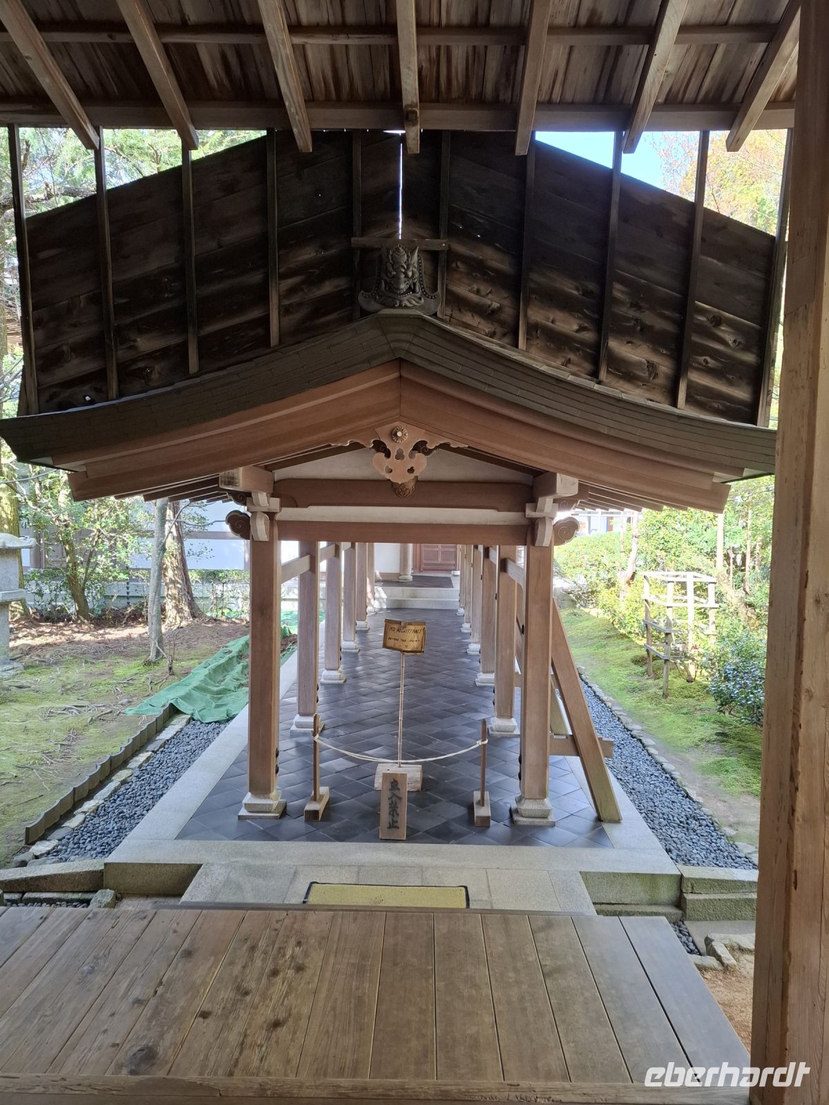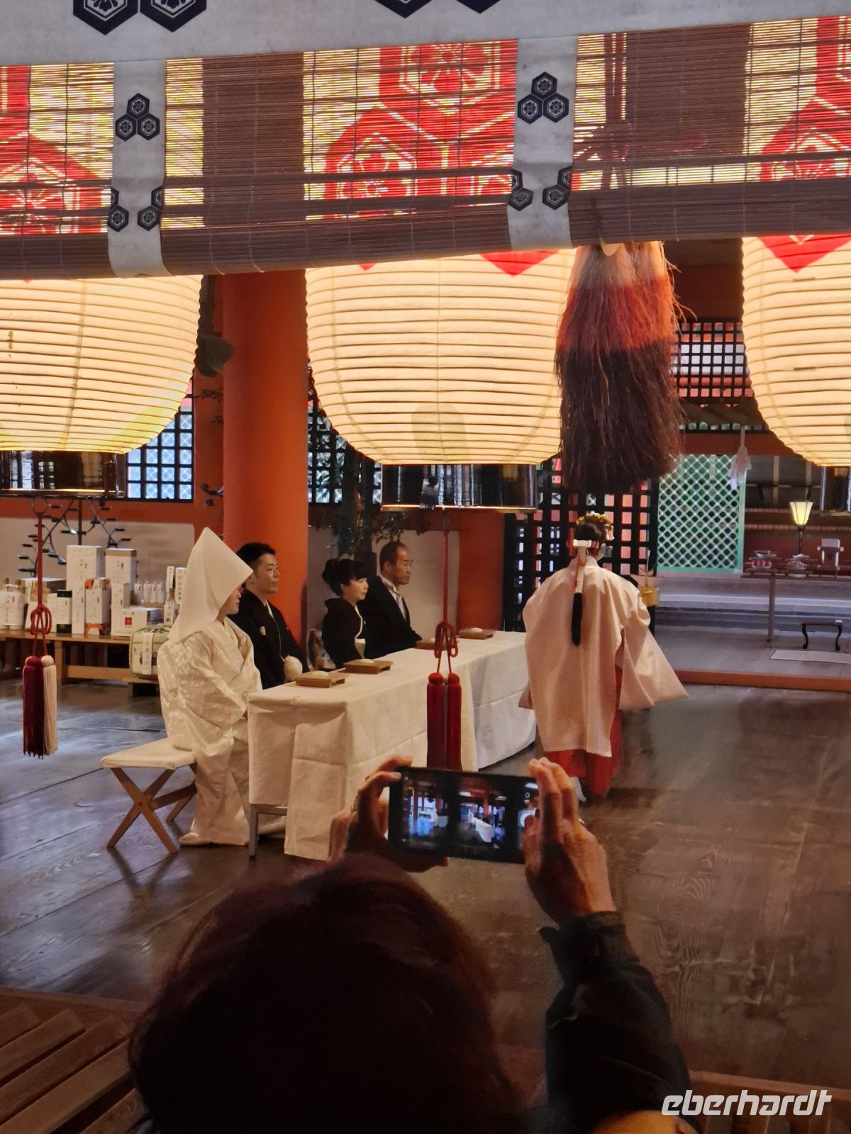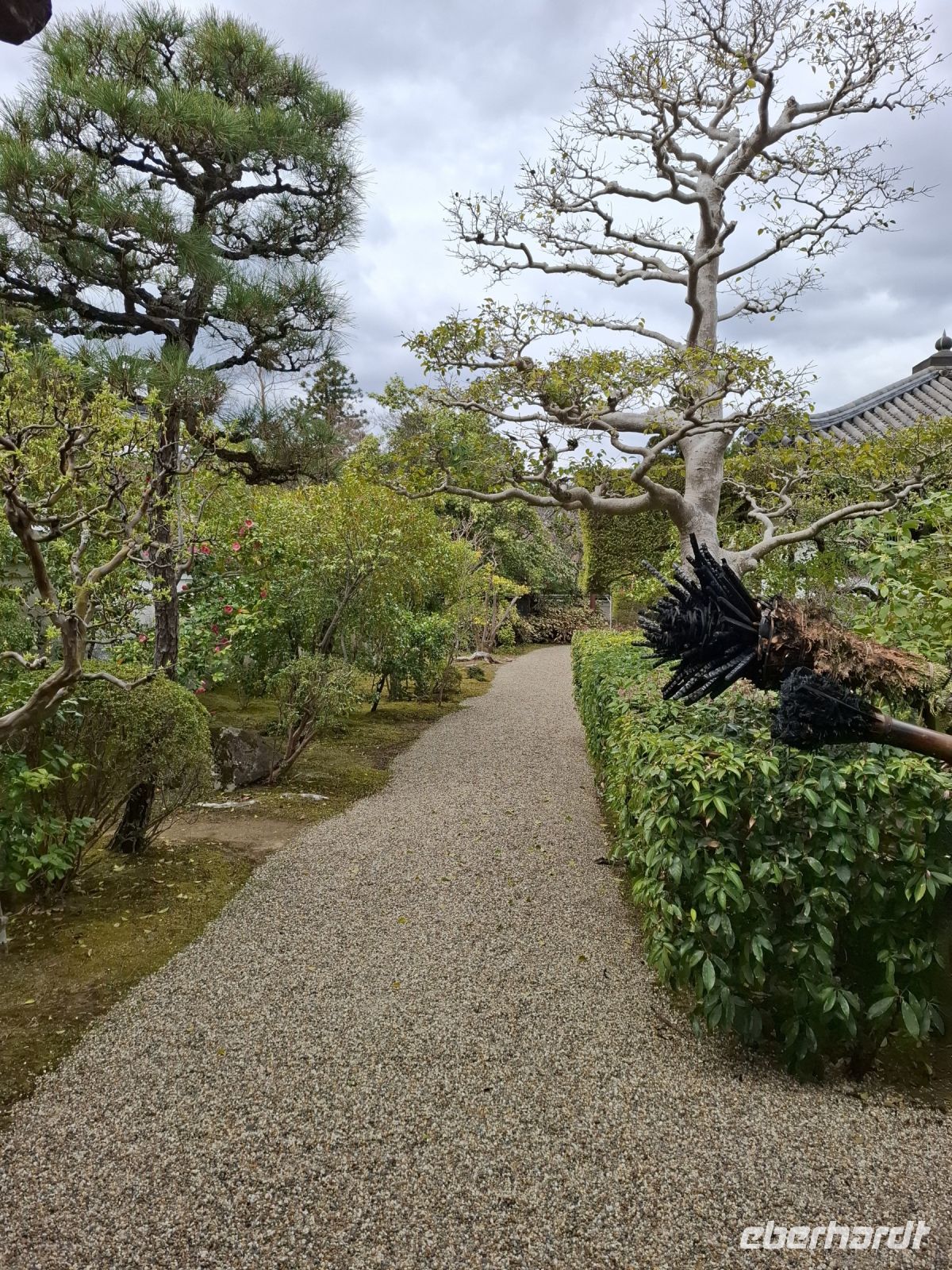 Unsere Mittagspause verbringen wir im Areal des Teramachi-Marktes, wo es zahlreiche Souvenirläden, Imbissstände und Restaurants gibt. Danach nehmen wir im Gästeraum eines Teehauses Platz,wo uns die japanischen Teezeremonie vorgestellt wird. Zunächst begrüßt uns die Teemeisterin mit einer traditionellen Verbeugung. Dann nimmt sie Platz und bereitet mit ruhiger Hand die notwendigen Utensilien wie Teeschale, Bambusbesen und Teelöffel vor. Zunächst wird der Matcha mit einem Bambusbesen in heißem Wasser aufgeschlagen, um einen gleichmäßigen, schaumigen Tee zu erzeugen. Währenddessen wird uns eine süße Kleinigkeit (ein Mochi) serviert, welches wir vor dem Teetrinken verspeisen. Nun erhalten wir eine Teeschale, in dem sich der Macha-Tee befindet. Vor dem Trinken des Tees, drehen wir die Schale, um die Teemeisterin zu ehren und anschließend trinken wir den Tee in drei bis vier Schlucken aus, wobei der letzte Schluck lauter geschlürft werden soll, um zu bekunden, dass uns der Tee schmeckt.