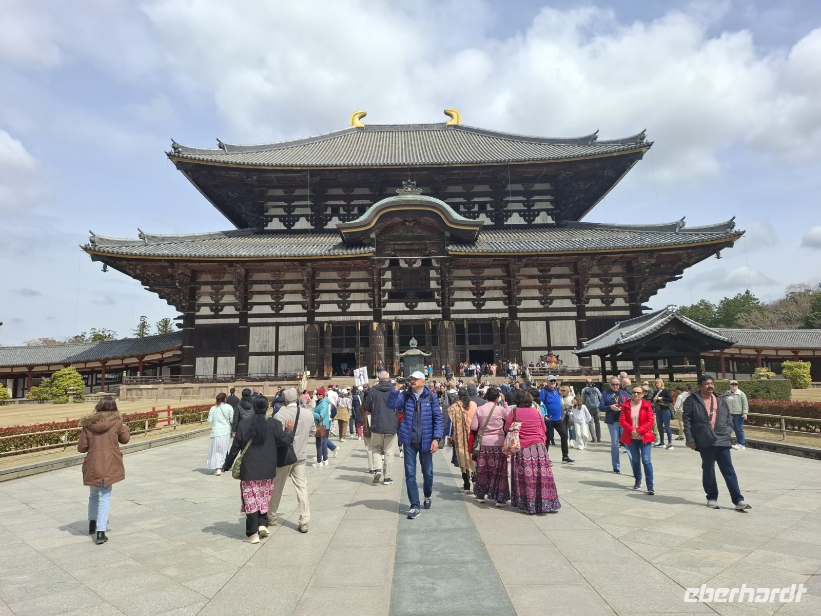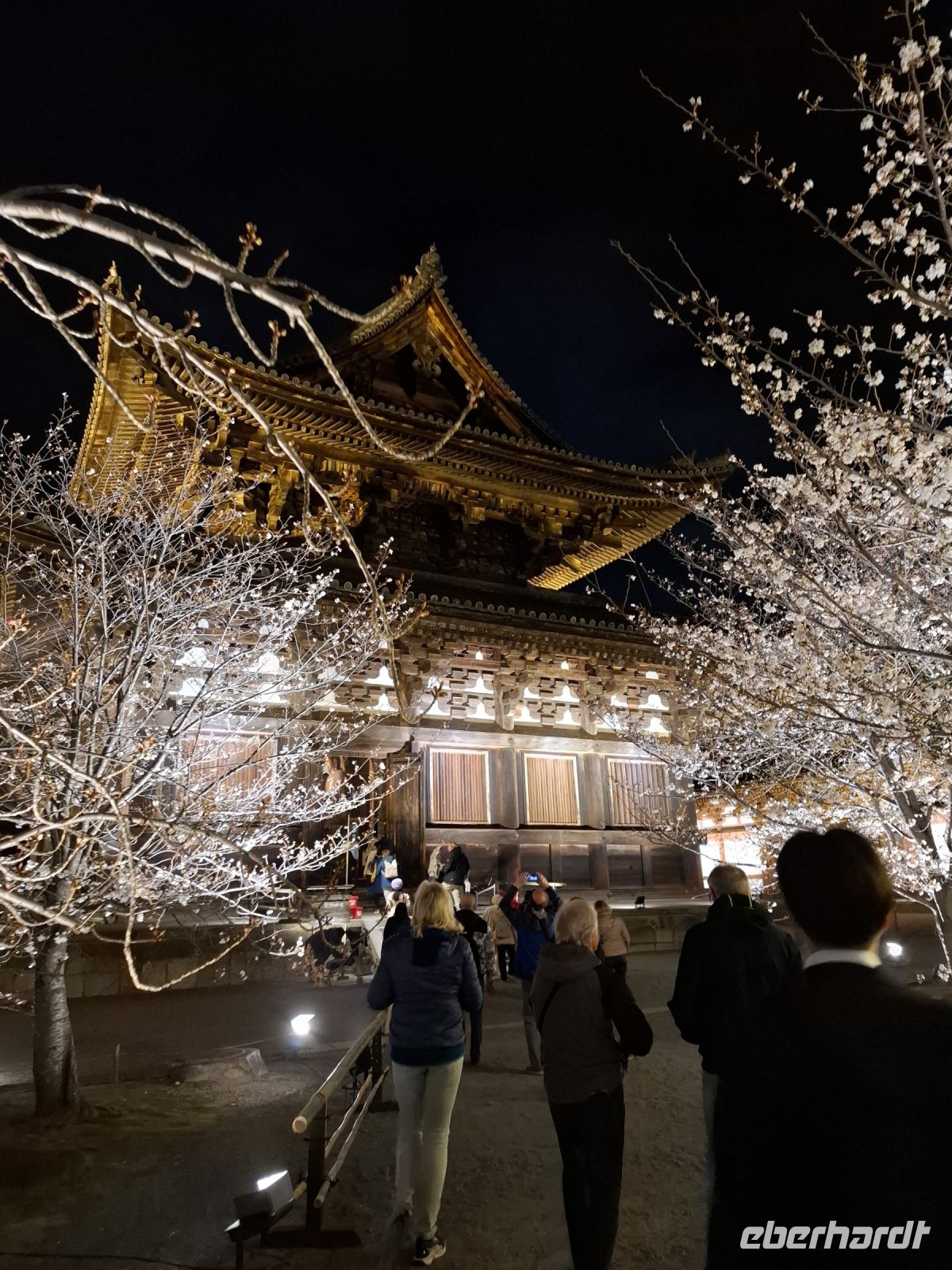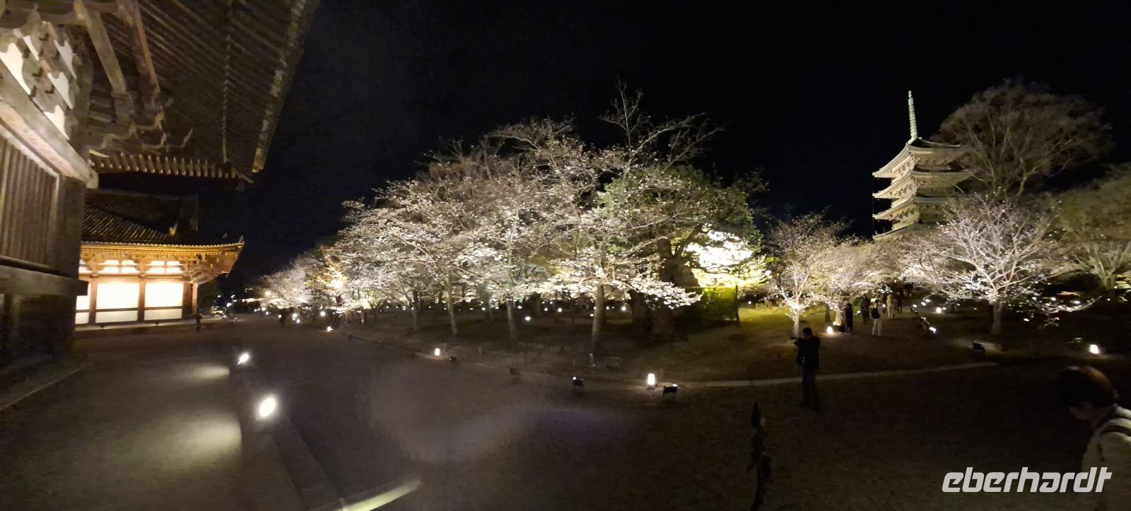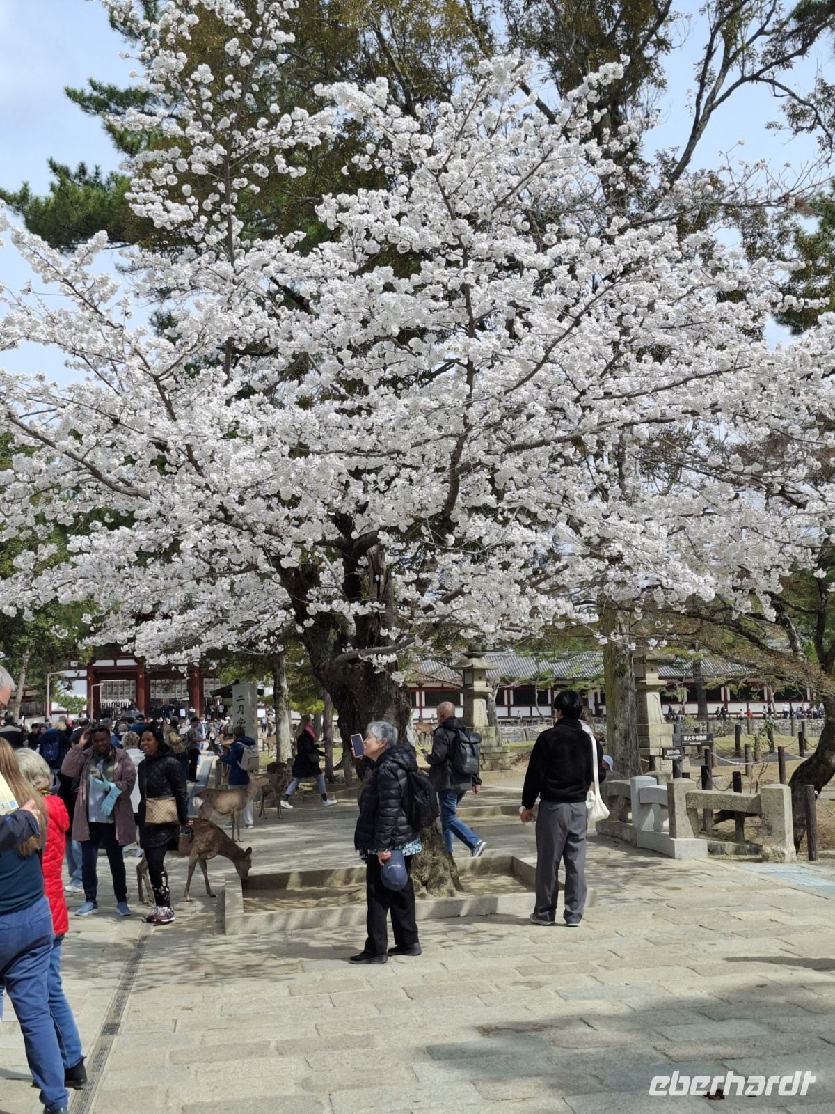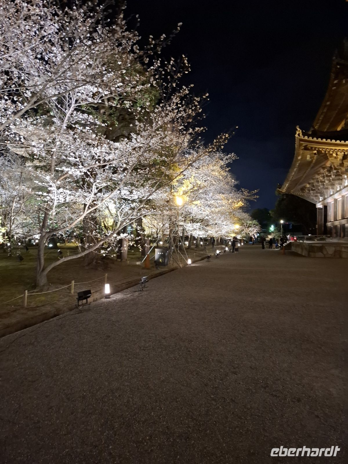 Da unser sich unser Hotel in einer kleineren Seitengasse befindet, ist es unserem Bus nicht möglich, direkt vor die Hoteltür zu fahren. Daher spazieren wir nach dem Frühstück entlang einer überdachten Mall zu unserem örtlichen Reisebus, der an der City-Hall auf uns wartet. Nachdem wir uns mit dem Bus-Chauffeur für den heutigen Tag bekannt gemacht haben, begeben wir uns auf unseren Ausflug nach Nara. Zunächst erfahren wir von Gudrun wieder eine Weisheit und eine Silbes des Tages, denen wir natürlich sehr interessiert lauschen. Da unsere Fahrtstrecke rund eine Stunde betragen wird, gibt uns Gudrun am heutigen Tag Einblicke in die allgemeine Wohnsituation der Japaner und die dazugehörigen Mietpreise. Je näher wir Nara kommen, desto mehr Informationen erhalten wir auch zur ersten permanenten Hauptstadt Japans. Nachdem wir das neue Busterminal hinter uns gelassen haben und wir weitere Kirschbäume erblicken konnten, sehen wir die ersten freilaufenden Sika-Hirsche, die sich ganz ungeniert den Menschen nähern, damit sie etwas zu fresse bekommen. Man hat hier die Möglichkeit, entsprechende Hirschkekse zu kaufen. Wenn man nicht aufpasst, ist man aber auch ganz schnell seinen Stadtplan los, da Papier auch auf der Speisekarte der Hirsche steht. Gemeinsam spazieren wir durch das große Tor und nach dem Ticketkauf besichtigen wir den Todai-ji-Tempel, das weltweit ältestes Holzgebäude und heute ein buddhistischer Tempel. Im seinem Inneren bestaunen wir die größte Buddha-Bronzestatue mit einer Höhe von 16 Metern. Als wir wieder hinaus kommen, besichtigen wir die etwas verwitterte Statue des Arhat Pindola. Der Sage nach, soll man, natürlich nach einem Münzeinwurf, die eigene schmerzende Körperstelle an der Statue berühren und anschließend die gleiche Stelle am eigenen Körper reiben. Danach soll dieser Körperteil unmittelbar geheilt sein. Einige Reisegäste probieren diesen Spaß aus aber ich befürchte, auf die Schmerzfreiheit des entsprechenden Körperteils warten sie bis heute. Danach führt uns Gudrun weiter über das Areal und wir sehen unter anderem noch eine kleine Pagode und einen weiteren Schrein. In der sich anschließende Zeit haben wir nun die Gelegenheit, uns im Landschaftsgarten von Nara umzuschauen oder sich den Horyuji-Tempel anzuschauen. Am Nachmittag sind wir zurück in Kyoto, wo wir uns am Abend erneut in der Hotellobby treffen. Gudrun organisiert uns Taxen und gemeinsam fahren wir zum illuminierten Garten rund um den Toji-Tempel. Eine wahrhaft magische Stimmung erwartet uns. Die Dunkelheit ist längst angebrochen und hunderte von Lichtern und Lampen leuchten sowohl die Toji-Tempel als auch die Kirschbäume mit ihren aufgebrochenen Blüten an. Ein Anblick, den ich gar nicht in Worten beschreiben kann (bitte schauen Sie sich die Bilder an) und der uns noch sehr lange in Erinnerung bleiben wird. Für mich persönlich war dieser abendliche Ausflug DAS Highlight auf dieser Reise.