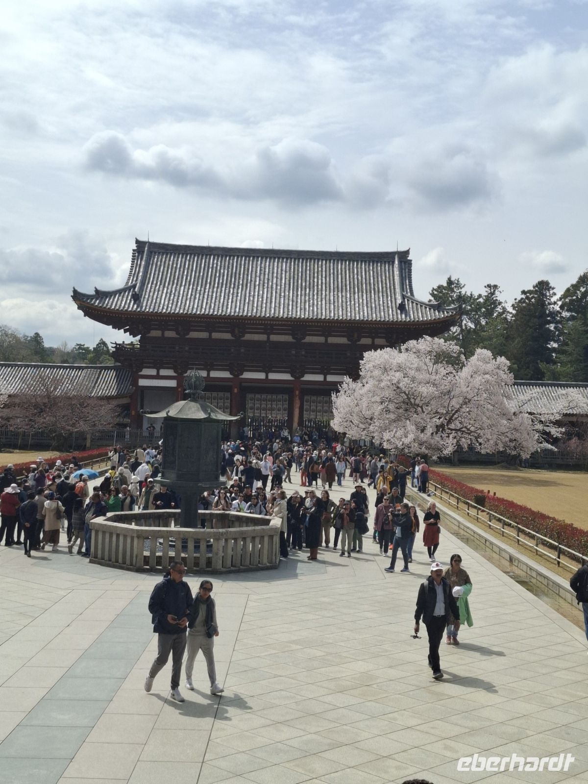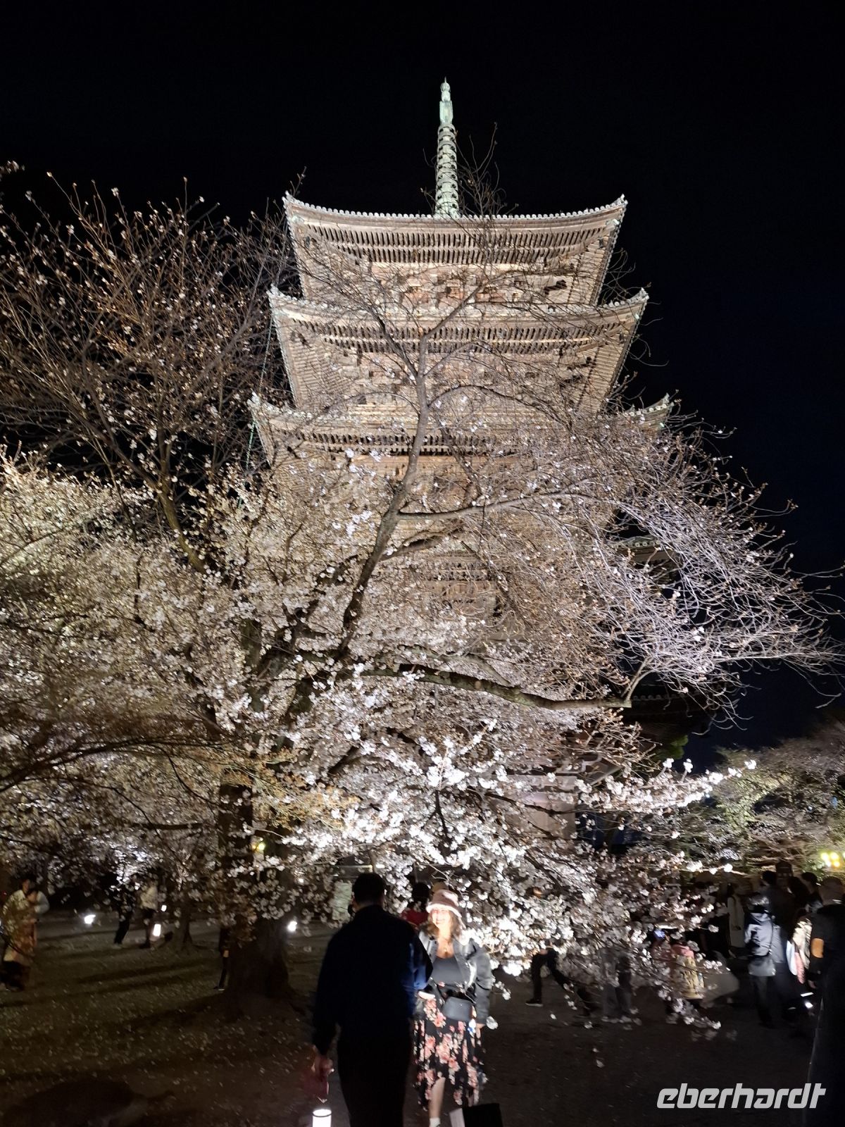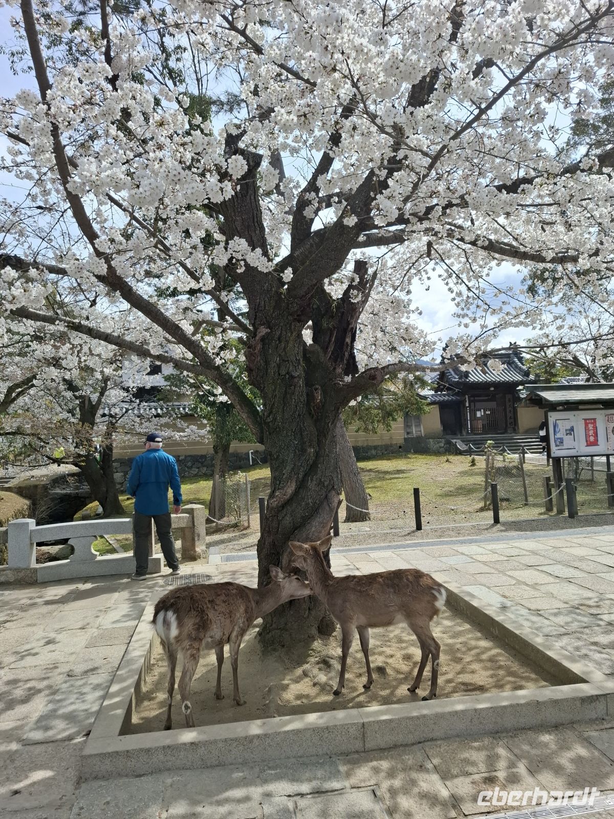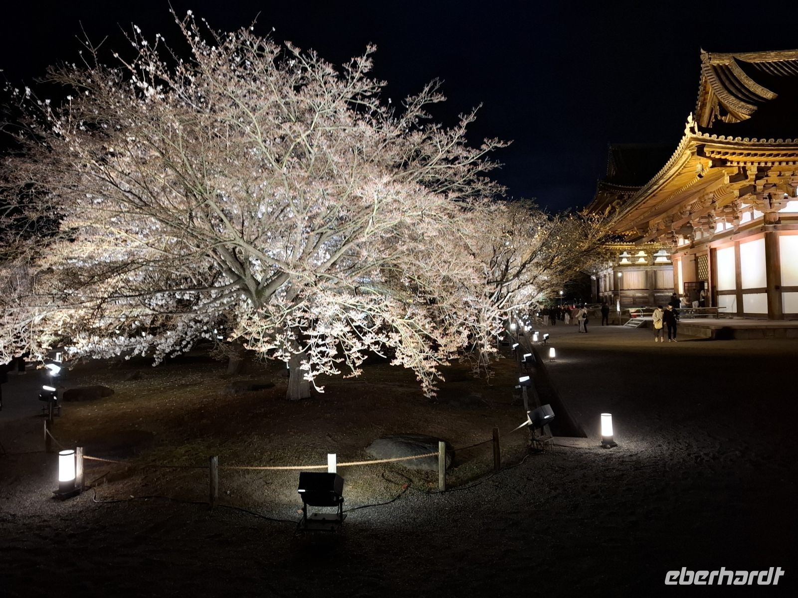 Da unser sich unser Hotel in einer kleineren Seitengasse befindet, ist es unserem Bus nicht möglich, direkt vor die Hoteltür zu fahren. Daher spazieren wir nach dem Frühstück entlang einer überdachten Mall zu unserem örtlichen Reisebus, der an der City-Hall auf uns wartet. Nachdem wir uns mit dem Bus-Chauffeur für den heutigen Tag bekannt gemacht haben, begeben wir uns auf unseren Ausflug nach Nara. Zunächst erfahren wir von Gudrun wieder eine Weisheit und eine Silbes des Tages, denen wir natürlich sehr interessiert lauschen. Da unsere Fahrtstrecke rund eine Stunde betragen wird, gibt uns Gudrun am heutigen Tag Einblicke in die allgemeine Wohnsituation der Japaner und die dazugehörigen Mietpreise. Je näher wir Nara kommen, desto mehr Informationen erhalten wir auch zur ersten permanenten Hauptstadt Japans. Nachdem wir das neue Busterminal hinter uns gelassen haben und wir weitere Kirschbäume erblicken konnten, sehen wir die ersten freilaufenden Sika-Hirsche, die sich ganz ungeniert den Menschen nähern, damit sie etwas zu fresse bekommen. Man hat hier die Möglichkeit, entsprechende Hirschkekse zu kaufen. Wenn man nicht aufpasst, ist man aber auch ganz schnell seinen Stadtplan los, da Papier auch auf der Speisekarte der Hirsche steht. Gemeinsam spazieren wir durch das große Tor und nach dem Ticketkauf besichtigen wir den Todai-ji-Tempel, das weltweit ältestes Holzgebäude und heute ein buddhistischer Tempel. Im seinem Inneren bestaunen wir die größte Buddha-Bronzestatue mit einer Höhe von 16 Metern. Als wir wieder hinaus kommen, besichtigen wir die etwas verwitterte Statue des Arhat Pindola. Der Sage nach, soll man, natürlich nach einem Münzeinwurf, die eigene schmerzende Körperstelle an der Statue berühren und anschließend die gleiche Stelle am eigenen Körper reiben. Danach soll dieser Körperteil unmittelbar geheilt sein. Einige Reisegäste probieren diesen Spaß aus aber ich befürchte, auf die Schmerzfreiheit des entsprechenden Körperteils warten sie bis heute. Danach führt uns Gudrun weiter über das Areal und wir sehen unter anderem noch eine kleine Pagode und einen weiteren Schrein. In der sich anschließende Zeit haben wir nun die Gelegenheit, uns im Landschaftsgarten von Nara umzuschauen oder sich den Horyuji-Tempel anzuschauen. Am Nachmittag sind wir zurück in Kyoto, wo wir uns am Abend erneut in der Hotellobby treffen. Gudrun organisiert uns Taxen und gemeinsam fahren wir zum illuminierten Garten rund um den Toji-Tempel. Eine wahrhaft magische Stimmung erwartet uns. Die Dunkelheit ist längst angebrochen und hunderte von Lichtern und Lampen leuchten sowohl die Toji-Tempel als auch die Kirschbäume mit ihren aufgebrochenen Blüten an. Ein Anblick, den ich gar nicht in Worten beschreiben kann (bitte schauen Sie sich die Bilder an) und der uns noch sehr lange in Erinnerung bleiben wird. Für mich persönlich war dieser abendliche Ausflug DAS Highlight auf dieser Reise.