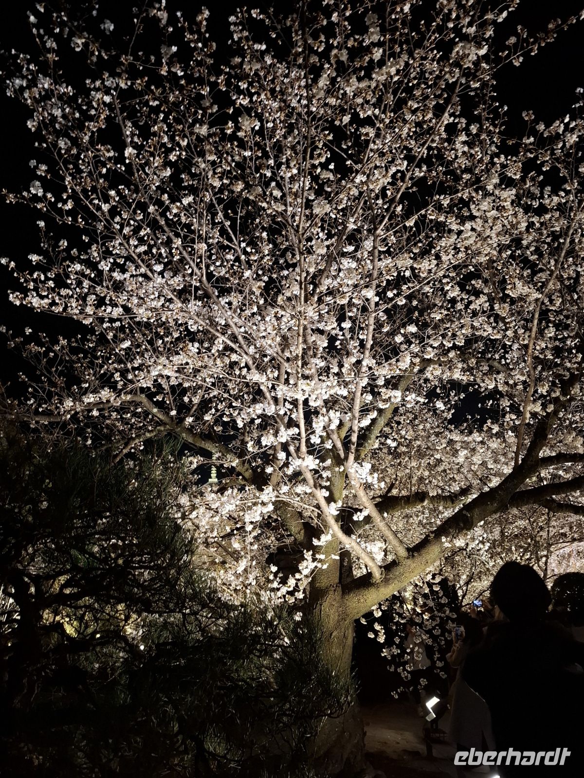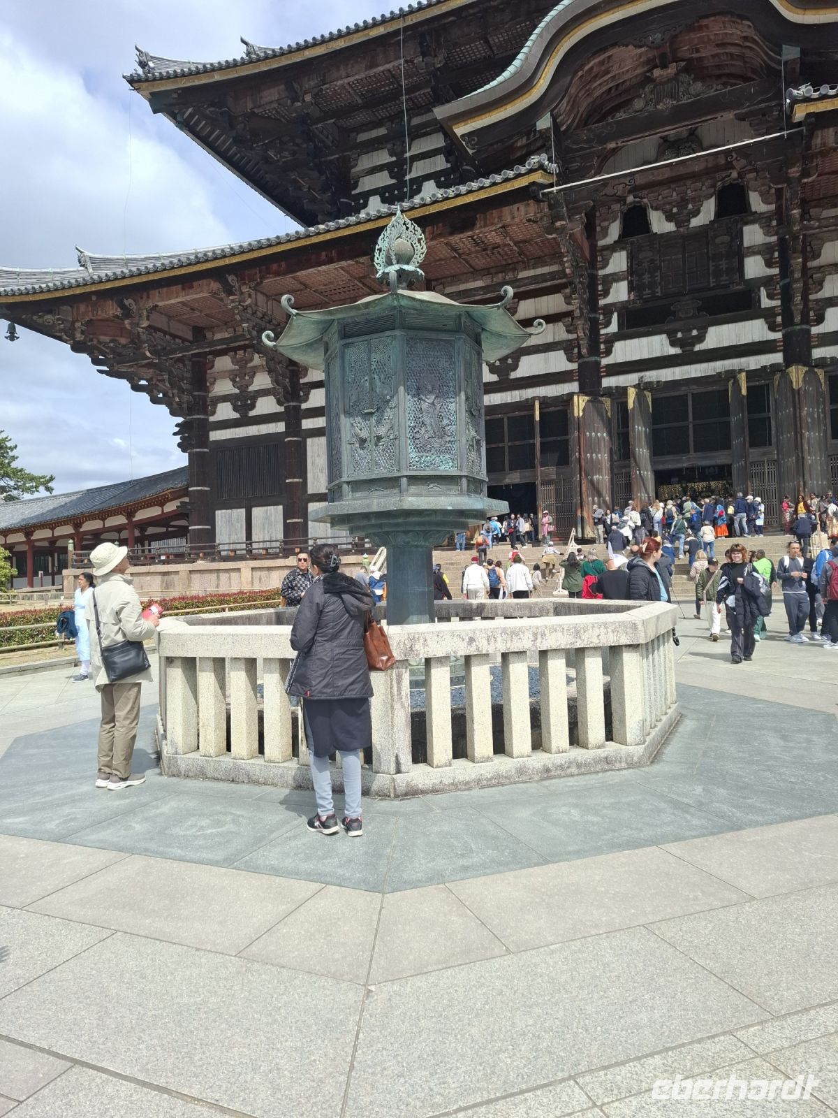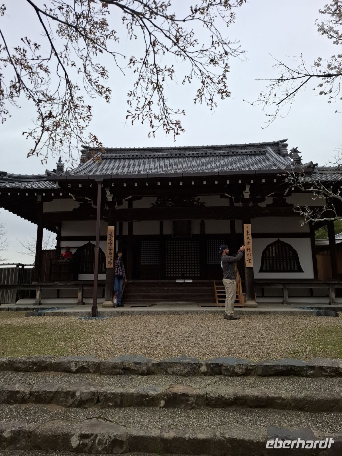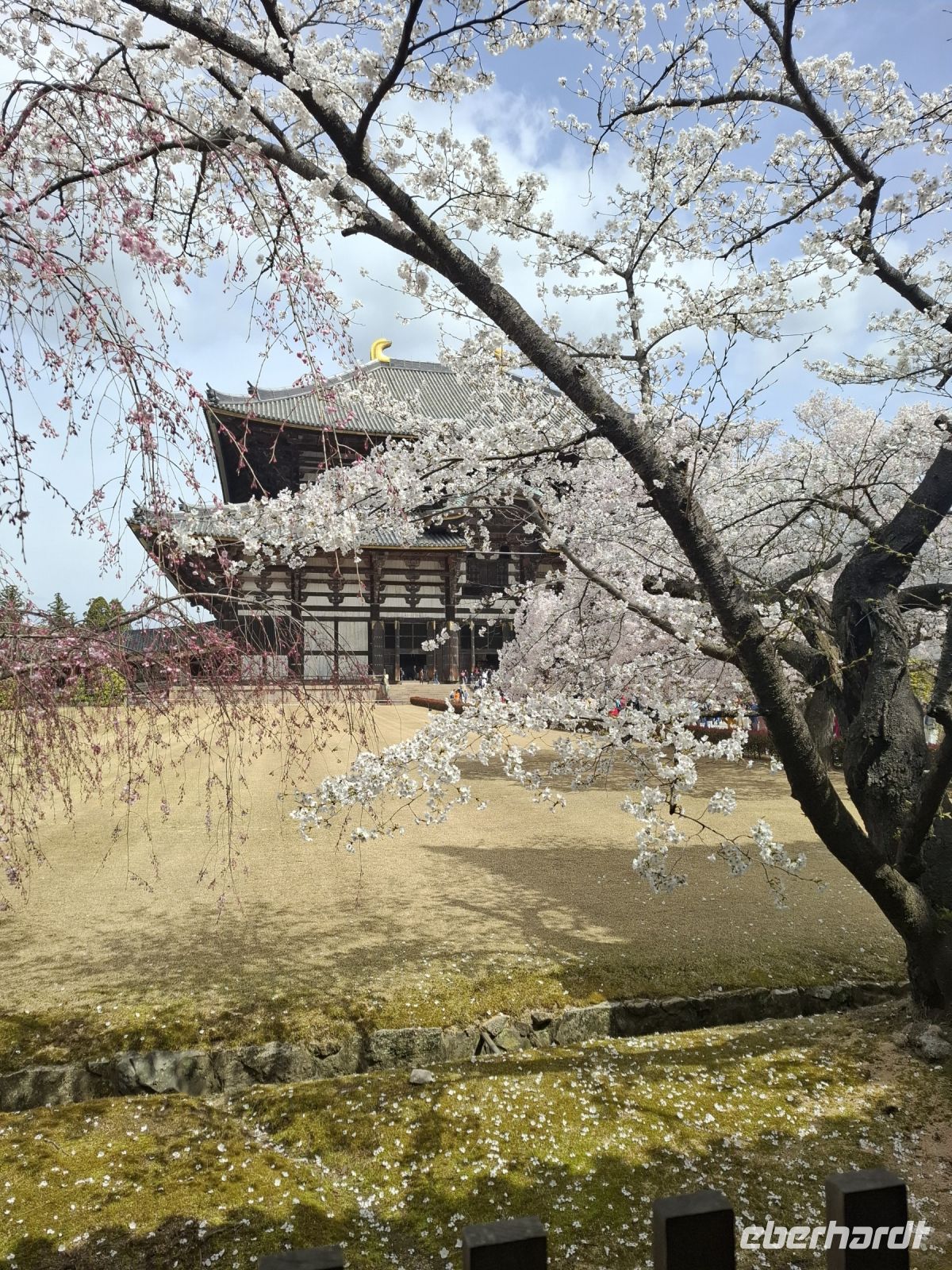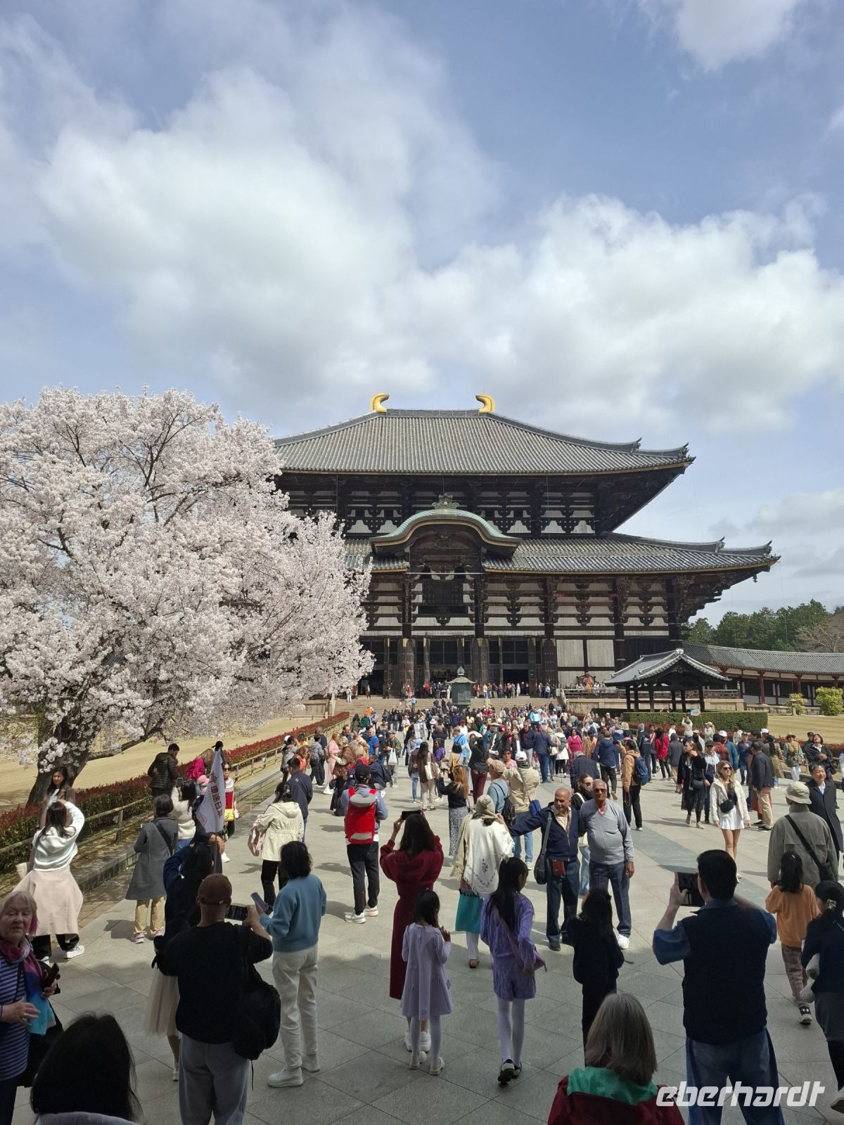 Da unser sich unser Hotel in einer kleineren Seitengasse befindet, ist es unserem Bus nicht möglich, direkt vor die Hoteltür zu fahren. Daher spazieren wir nach dem Frühstück entlang einer überdachten Mall zu unserem örtlichen Reisebus, der an der City-Hall auf uns wartet. Nachdem wir uns mit dem Bus-Chauffeur für den heutigen Tag bekannt gemacht haben, begeben wir uns auf unseren Ausflug nach Nara. Zunächst erfahren wir von Gudrun wieder eine Weisheit und eine Silbes des Tages, denen wir natürlich sehr interessiert lauschen. Da unsere Fahrtstrecke rund eine Stunde betragen wird, gibt uns Gudrun am heutigen Tag Einblicke in die allgemeine Wohnsituation der Japaner und die dazugehörigen Mietpreise. Je näher wir Nara kommen, desto mehr Informationen erhalten wir auch zur ersten permanenten Hauptstadt Japans. Nachdem wir das neue Busterminal hinter uns gelassen haben und wir weitere Kirschbäume erblicken konnten, sehen wir die ersten freilaufenden Sika-Hirsche, die sich ganz ungeniert den Menschen nähern, damit sie etwas zu fresse bekommen. Man hat hier die Möglichkeit, entsprechende Hirschkekse zu kaufen. Wenn man nicht aufpasst, ist man aber auch ganz schnell seinen Stadtplan los, da Papier auch auf der Speisekarte der Hirsche steht. Gemeinsam spazieren wir durch das große Tor und nach dem Ticketkauf besichtigen wir den Todai-ji-Tempel, das weltweit ältestes Holzgebäude und heute ein buddhistischer Tempel. Im seinem Inneren bestaunen wir die größte Buddha-Bronzestatue mit einer Höhe von 16 Metern. Als wir wieder hinaus kommen, besichtigen wir die etwas verwitterte Statue des Arhat Pindola. Der Sage nach, soll man, natürlich nach einem Münzeinwurf, die eigene schmerzende Körperstelle an der Statue berühren und anschließend die gleiche Stelle am eigenen Körper reiben. Danach soll dieser Körperteil unmittelbar geheilt sein. Einige Reisegäste probieren diesen Spaß aus aber ich befürchte, auf die Schmerzfreiheit des entsprechenden Körperteils warten sie bis heute. Danach führt uns Gudrun weiter über das Areal und wir sehen unter anderem noch eine kleine Pagode und einen weiteren Schrein. In der sich anschließende Zeit haben wir nun die Gelegenheit, uns im Landschaftsgarten von Nara umzuschauen oder sich den Horyuji-Tempel anzuschauen. Am Nachmittag sind wir zurück in Kyoto, wo wir uns am Abend erneut in der Hotellobby treffen. Gudrun organisiert uns Taxen und gemeinsam fahren wir zum illuminierten Garten rund um den Toji-Tempel. Eine wahrhaft magische Stimmung erwartet uns. Die Dunkelheit ist längst angebrochen und hunderte von Lichtern und Lampen leuchten sowohl die Toji-Tempel als auch die Kirschbäume mit ihren aufgebrochenen Blüten an. Ein Anblick, den ich gar nicht in Worten beschreiben kann (bitte schauen Sie sich die Bilder an) und der uns noch sehr lange in Erinnerung bleiben wird. Für mich persönlich war dieser abendliche Ausflug DAS Highlight auf dieser Reise.