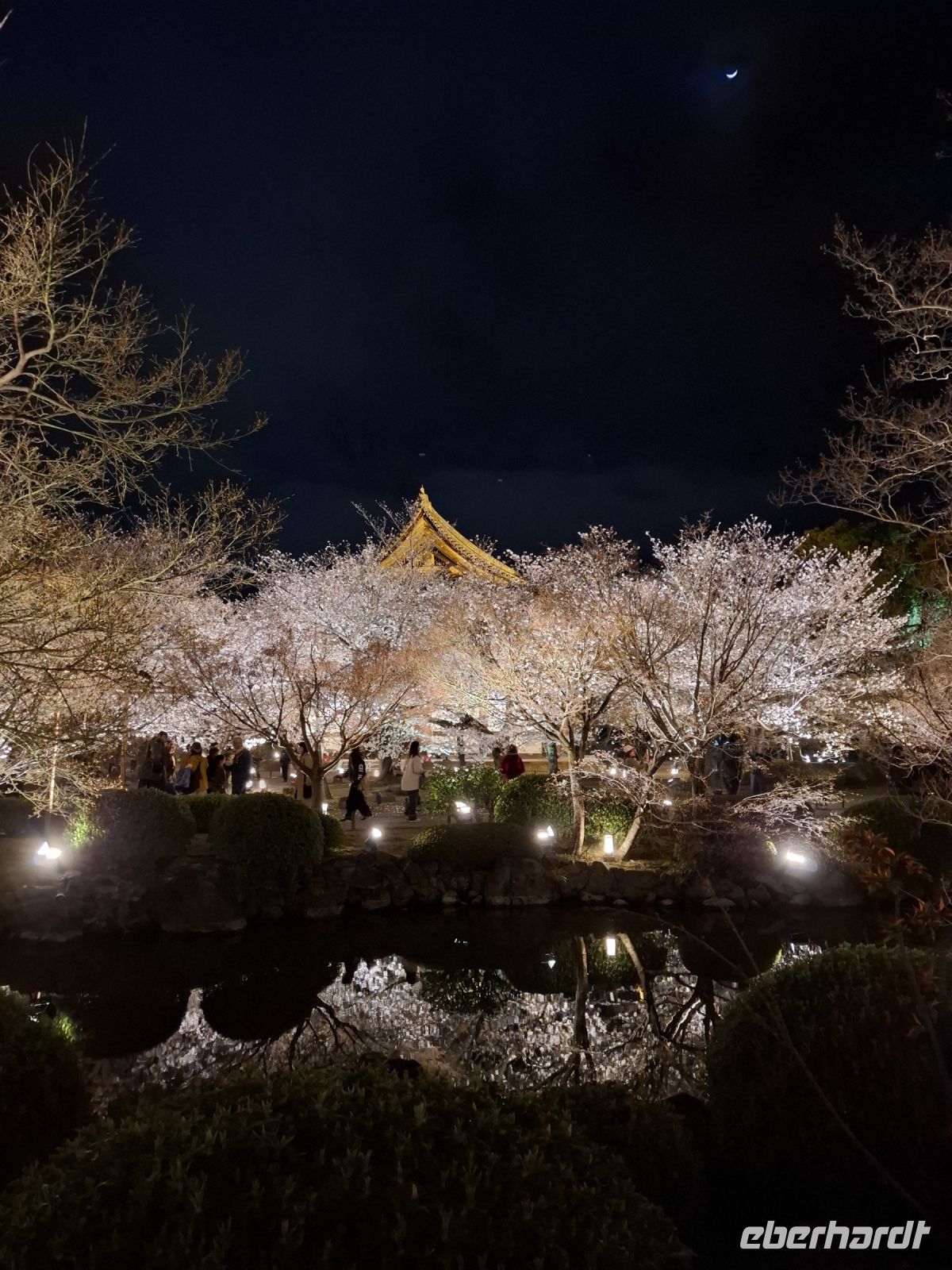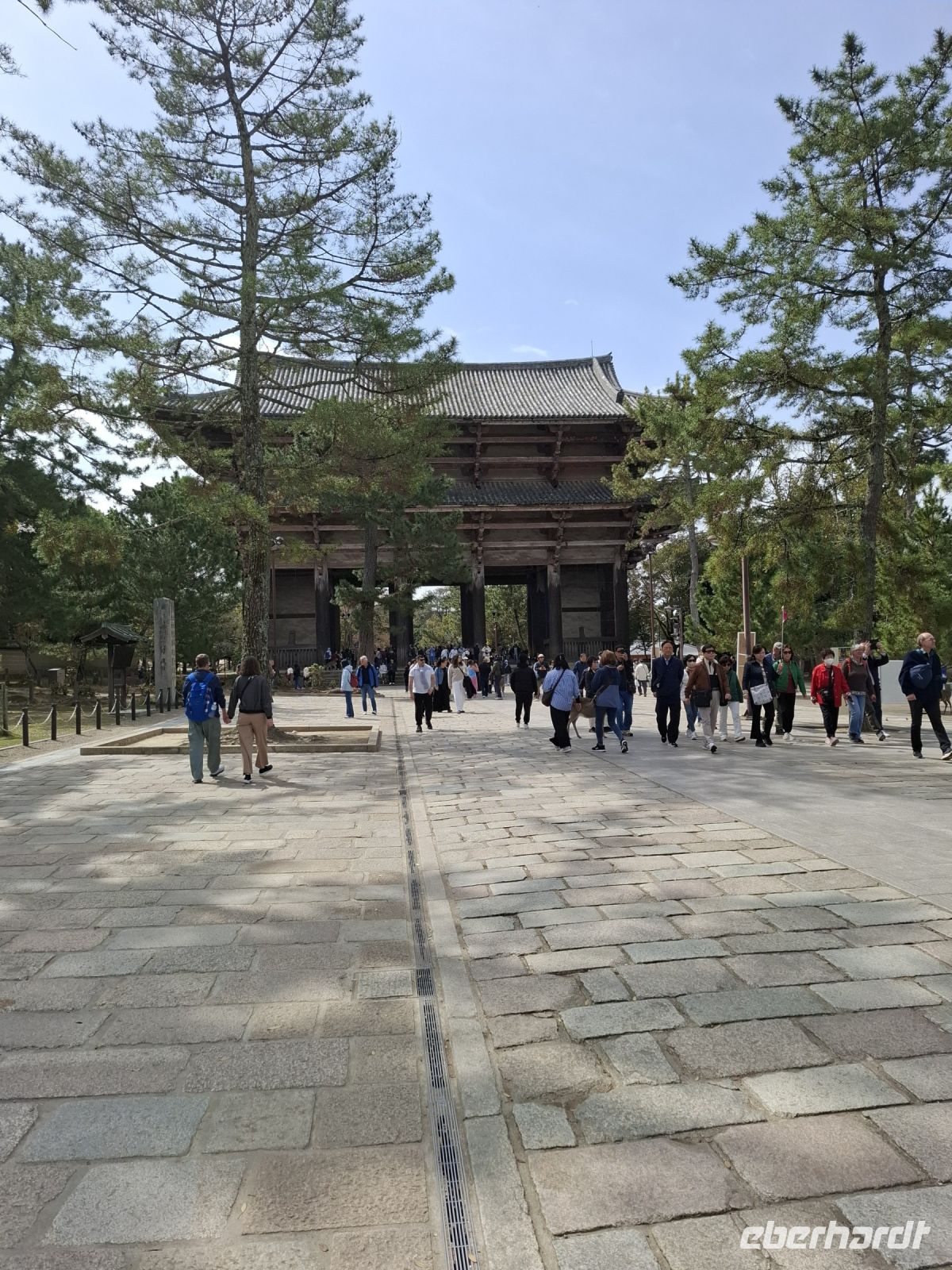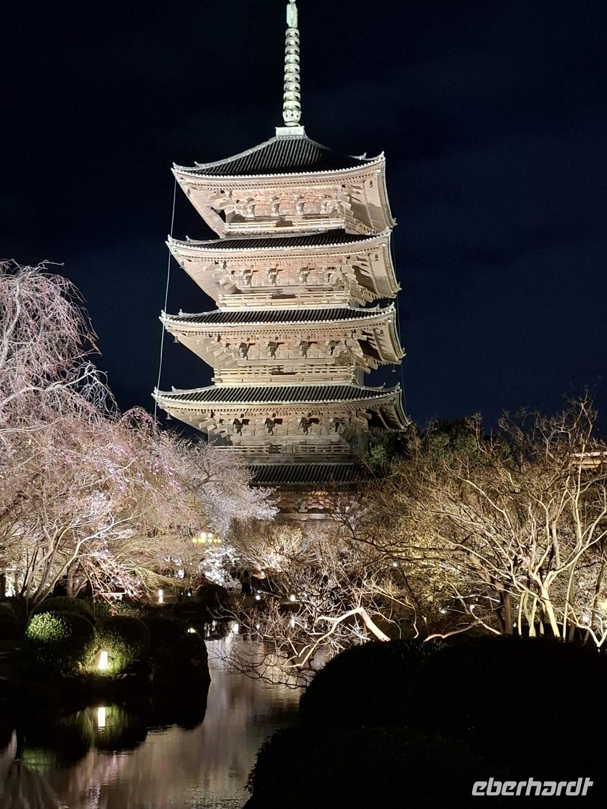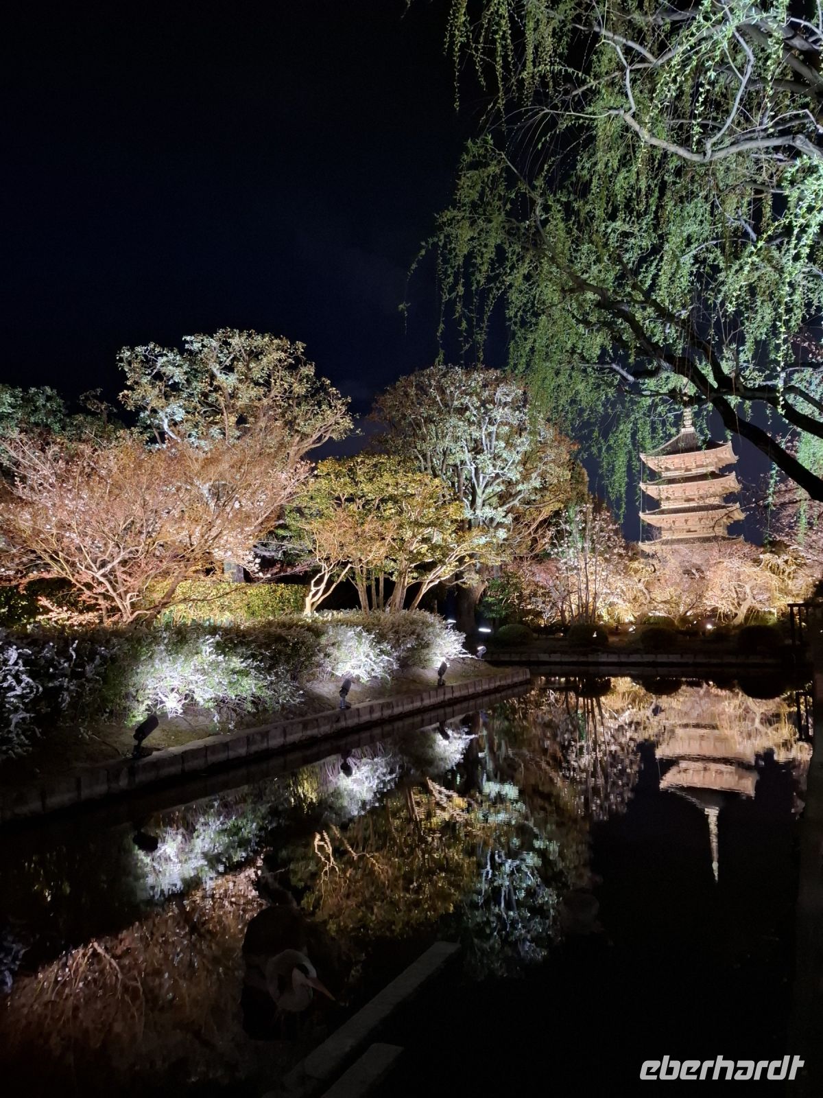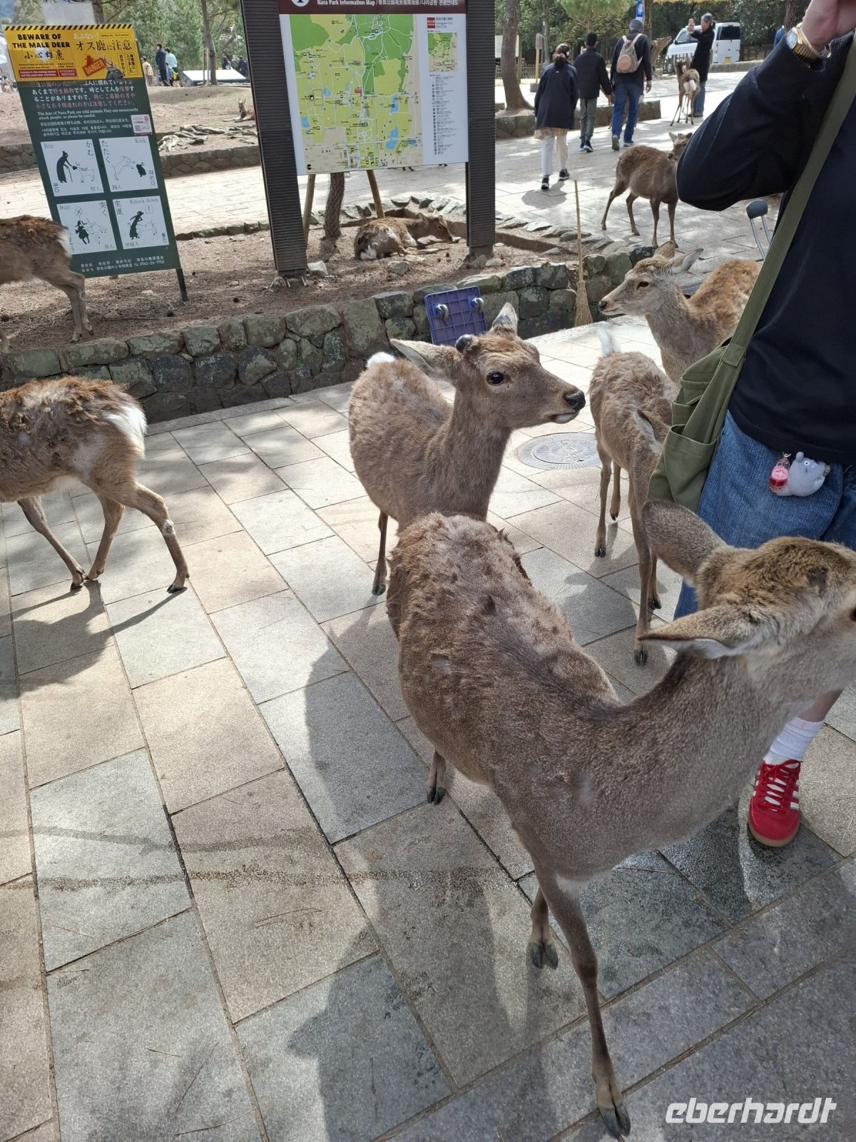 Da unser sich unser Hotel in einer kleineren Seitengasse befindet, ist es unserem Bus nicht möglich, direkt vor die Hoteltür zu fahren. Daher spazieren wir nach dem Frühstück entlang einer überdachten Mall zu unserem örtlichen Reisebus, der an der City-Hall auf uns wartet. Nachdem wir uns mit dem Bus-Chauffeur für den heutigen Tag bekannt gemacht haben, begeben wir uns auf unseren Ausflug nach Nara. Zunächst erfahren wir von Gudrun wieder eine Weisheit und eine Silbes des Tages, denen wir natürlich sehr interessiert lauschen. Da unsere Fahrtstrecke rund eine Stunde betragen wird, gibt uns Gudrun am heutigen Tag Einblicke in die allgemeine Wohnsituation der Japaner und die dazugehörigen Mietpreise. Je näher wir Nara kommen, desto mehr Informationen erhalten wir auch zur ersten permanenten Hauptstadt Japans. Nachdem wir das neue Busterminal hinter uns gelassen haben und wir weitere Kirschbäume erblicken konnten, sehen wir die ersten freilaufenden Sika-Hirsche, die sich ganz ungeniert den Menschen nähern, damit sie etwas zu fresse bekommen. Man hat hier die Möglichkeit, entsprechende Hirschkekse zu kaufen. Wenn man nicht aufpasst, ist man aber auch ganz schnell seinen Stadtplan los, da Papier auch auf der Speisekarte der Hirsche steht. Gemeinsam spazieren wir durch das große Tor und nach dem Ticketkauf besichtigen wir den Todai-ji-Tempel, das weltweit ältestes Holzgebäude und heute ein buddhistischer Tempel. Im seinem Inneren bestaunen wir die größte Buddha-Bronzestatue mit einer Höhe von 16 Metern. Als wir wieder hinaus kommen, besichtigen wir die etwas verwitterte Statue des Arhat Pindola. Der Sage nach, soll man, natürlich nach einem Münzeinwurf, die eigene schmerzende Körperstelle an der Statue berühren und anschließend die gleiche Stelle am eigenen Körper reiben. Danach soll dieser Körperteil unmittelbar geheilt sein. Einige Reisegäste probieren diesen Spaß aus aber ich befürchte, auf die Schmerzfreiheit des entsprechenden Körperteils warten sie bis heute. Danach führt uns Gudrun weiter über das Areal und wir sehen unter anderem noch eine kleine Pagode und einen weiteren Schrein. In der sich anschließende Zeit haben wir nun die Gelegenheit, uns im Landschaftsgarten von Nara umzuschauen oder sich den Horyuji-Tempel anzuschauen. Am Nachmittag sind wir zurück in Kyoto, wo wir uns am Abend erneut in der Hotellobby treffen. Gudrun organisiert uns Taxen und gemeinsam fahren wir zum illuminierten Garten rund um den Toji-Tempel. Eine wahrhaft magische Stimmung erwartet uns. Die Dunkelheit ist längst angebrochen und hunderte von Lichtern und Lampen leuchten sowohl die Toji-Tempel als auch die Kirschbäume mit ihren aufgebrochenen Blüten an. Ein Anblick, den ich gar nicht in Worten beschreiben kann (bitte schauen Sie sich die Bilder an) und der uns noch sehr lange in Erinnerung bleiben wird. Für mich persönlich war dieser abendliche Ausflug DAS Highlight auf dieser Reise.