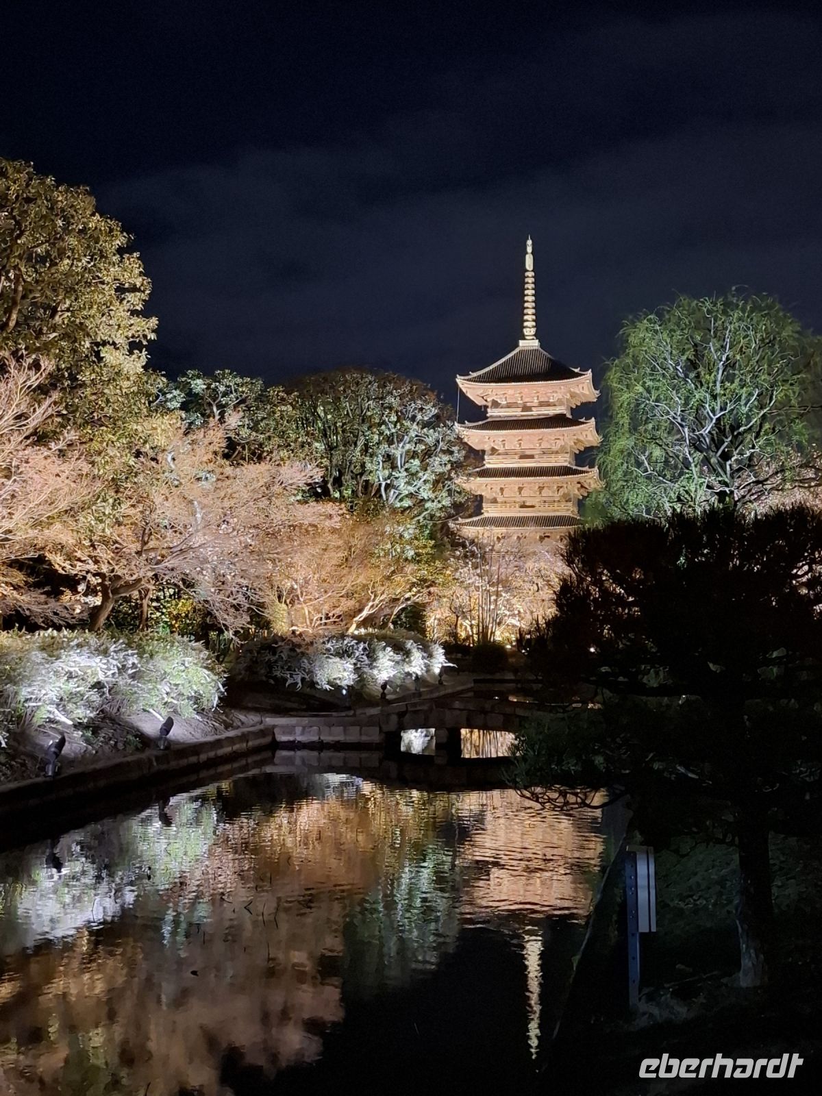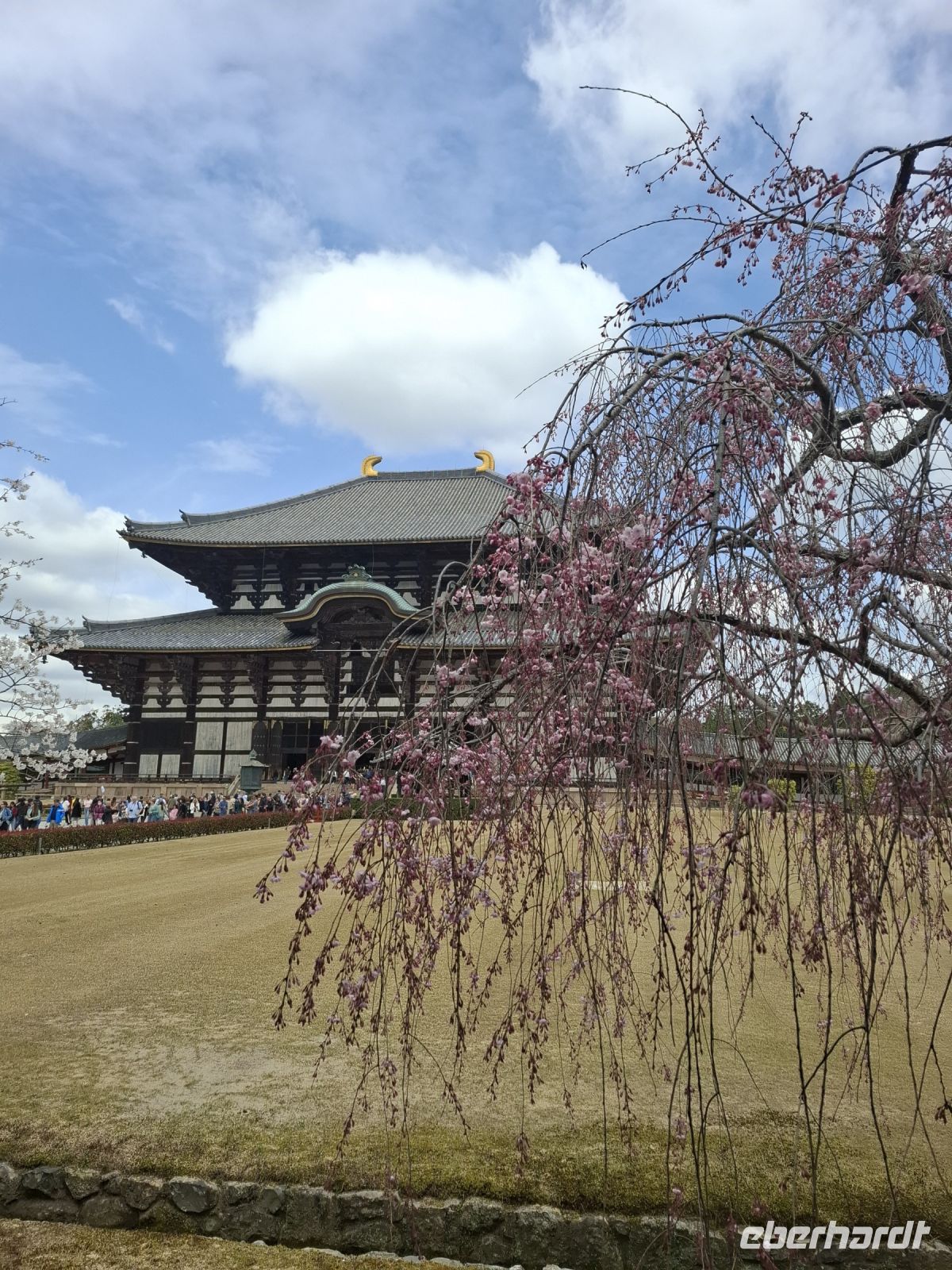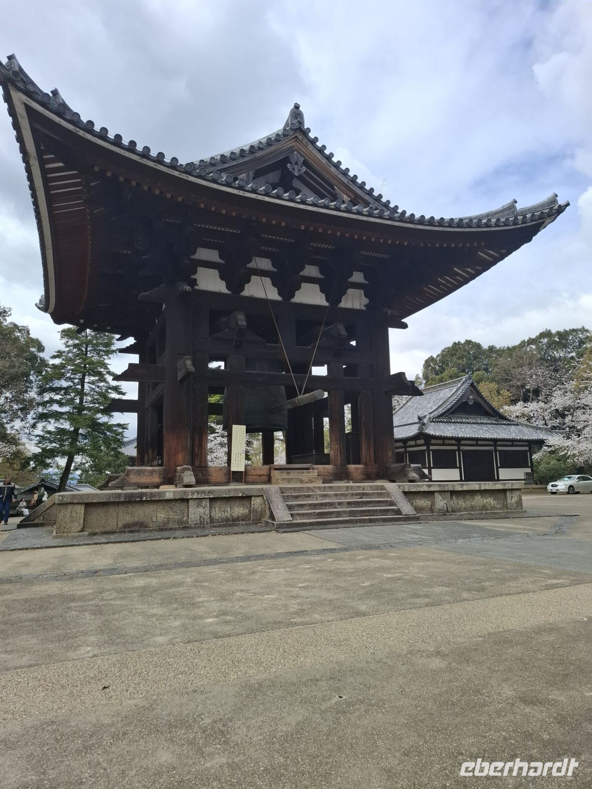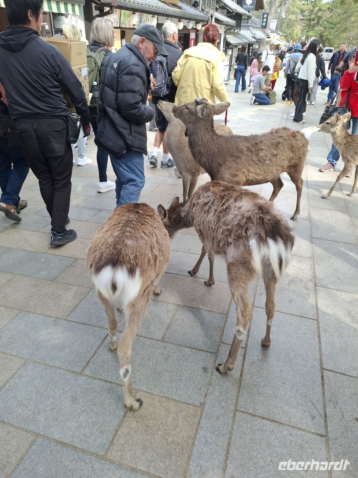 Da unser sich unser Hotel in einer kleineren Seitengasse befindet, ist es unserem Bus nicht möglich, direkt vor die Hoteltür zu fahren. Daher spazieren wir nach dem Frühstück entlang einer überdachten Mall zu unserem örtlichen Reisebus, der an der City-Hall auf uns wartet. Nachdem wir uns mit dem Bus-Chauffeur für den heutigen Tag bekannt gemacht haben, begeben wir uns auf unseren Ausflug nach Nara. Zunächst erfahren wir von Gudrun wieder eine Weisheit und eine Silbes des Tages, denen wir natürlich sehr interessiert lauschen. Da unsere Fahrtstrecke rund eine Stunde betragen wird, gibt uns Gudrun am heutigen Tag Einblicke in die allgemeine Wohnsituation der Japaner und die dazugehörigen Mietpreise. Je näher wir Nara kommen, desto mehr Informationen erhalten wir auch zur ersten permanenten Hauptstadt Japans. Nachdem wir das neue Busterminal hinter uns gelassen haben und wir weitere Kirschbäume erblicken konnten, sehen wir die ersten freilaufenden Sika-Hirsche, die sich ganz ungeniert den Menschen nähern, damit sie etwas zu fresse bekommen. Man hat hier die Möglichkeit, entsprechende Hirschkekse zu kaufen. Wenn man nicht aufpasst, ist man aber auch ganz schnell seinen Stadtplan los, da Papier auch auf der Speisekarte der Hirsche steht. Gemeinsam spazieren wir durch das große Tor und nach dem Ticketkauf besichtigen wir den Todai-ji-Tempel, das weltweit ältestes Holzgebäude und heute ein buddhistischer Tempel. Im seinem Inneren bestaunen wir die größte Buddha-Bronzestatue mit einer Höhe von 16 Metern. Als wir wieder hinaus kommen, besichtigen wir die etwas verwitterte Statue des Arhat Pindola. Der Sage nach, soll man, natürlich nach einem Münzeinwurf, die eigene schmerzende Körperstelle an der Statue berühren und anschließend die gleiche Stelle am eigenen Körper reiben. Danach soll dieser Körperteil unmittelbar geheilt sein. Einige Reisegäste probieren diesen Spaß aus aber ich befürchte, auf die Schmerzfreiheit des entsprechenden Körperteils warten sie bis heute. Danach führt uns Gudrun weiter über das Areal und wir sehen unter anderem noch eine kleine Pagode und einen weiteren Schrein. In der sich anschließende Zeit haben wir nun die Gelegenheit, uns im Landschaftsgarten von Nara umzuschauen oder sich den Horyuji-Tempel anzuschauen. Am Nachmittag sind wir zurück in Kyoto, wo wir uns am Abend erneut in der Hotellobby treffen. Gudrun organisiert uns Taxen und gemeinsam fahren wir zum illuminierten Garten rund um den Toji-Tempel. Eine wahrhaft magische Stimmung erwartet uns. Die Dunkelheit ist längst angebrochen und hunderte von Lichtern und Lampen leuchten sowohl die Toji-Tempel als auch die Kirschbäume mit ihren aufgebrochenen Blüten an. Ein Anblick, den ich gar nicht in Worten beschreiben kann (bitte schauen Sie sich die Bilder an) und der uns noch sehr lange in Erinnerung bleiben wird. Für mich persönlich war dieser abendliche Ausflug DAS Highlight auf dieser Reise.
