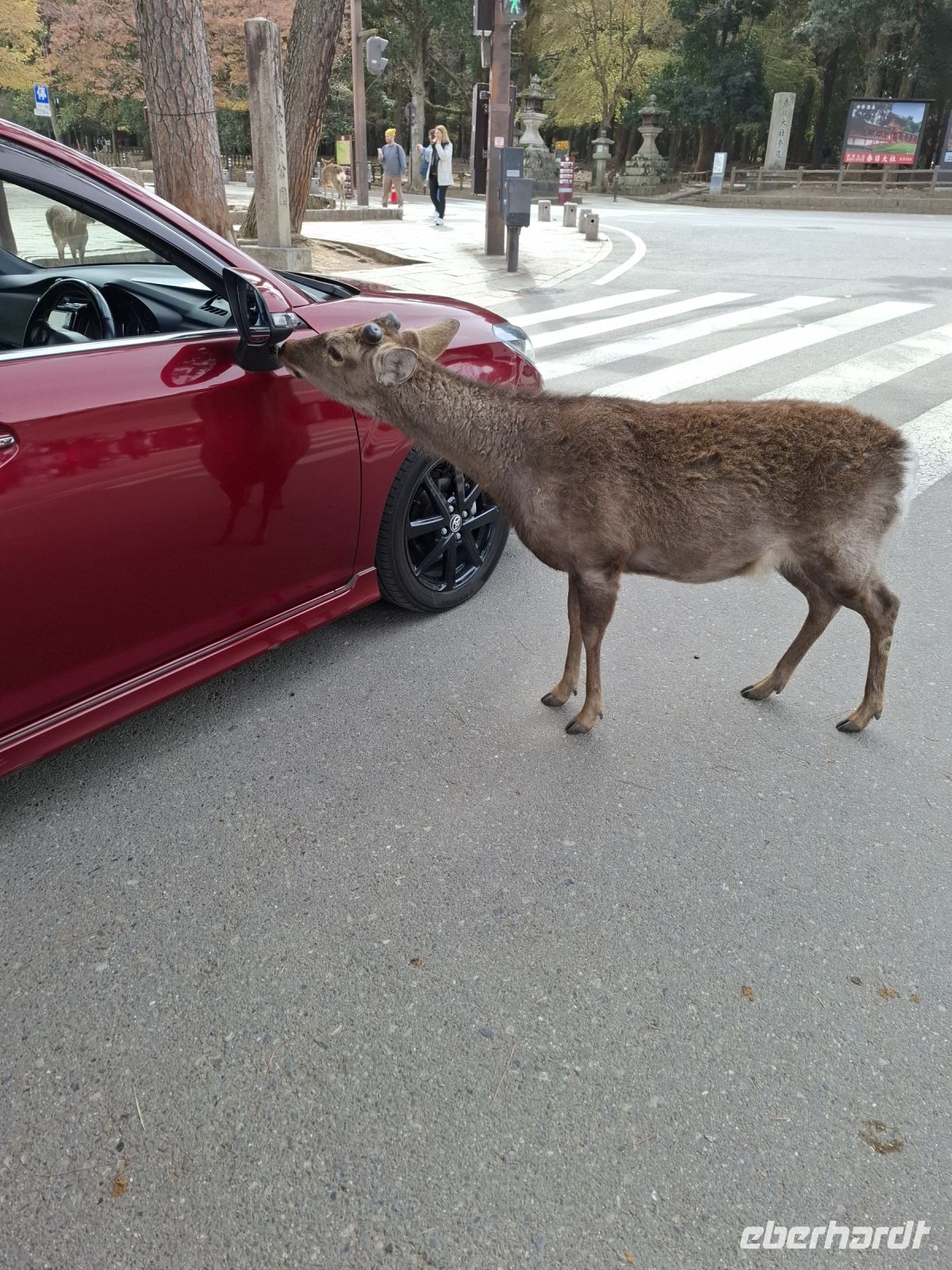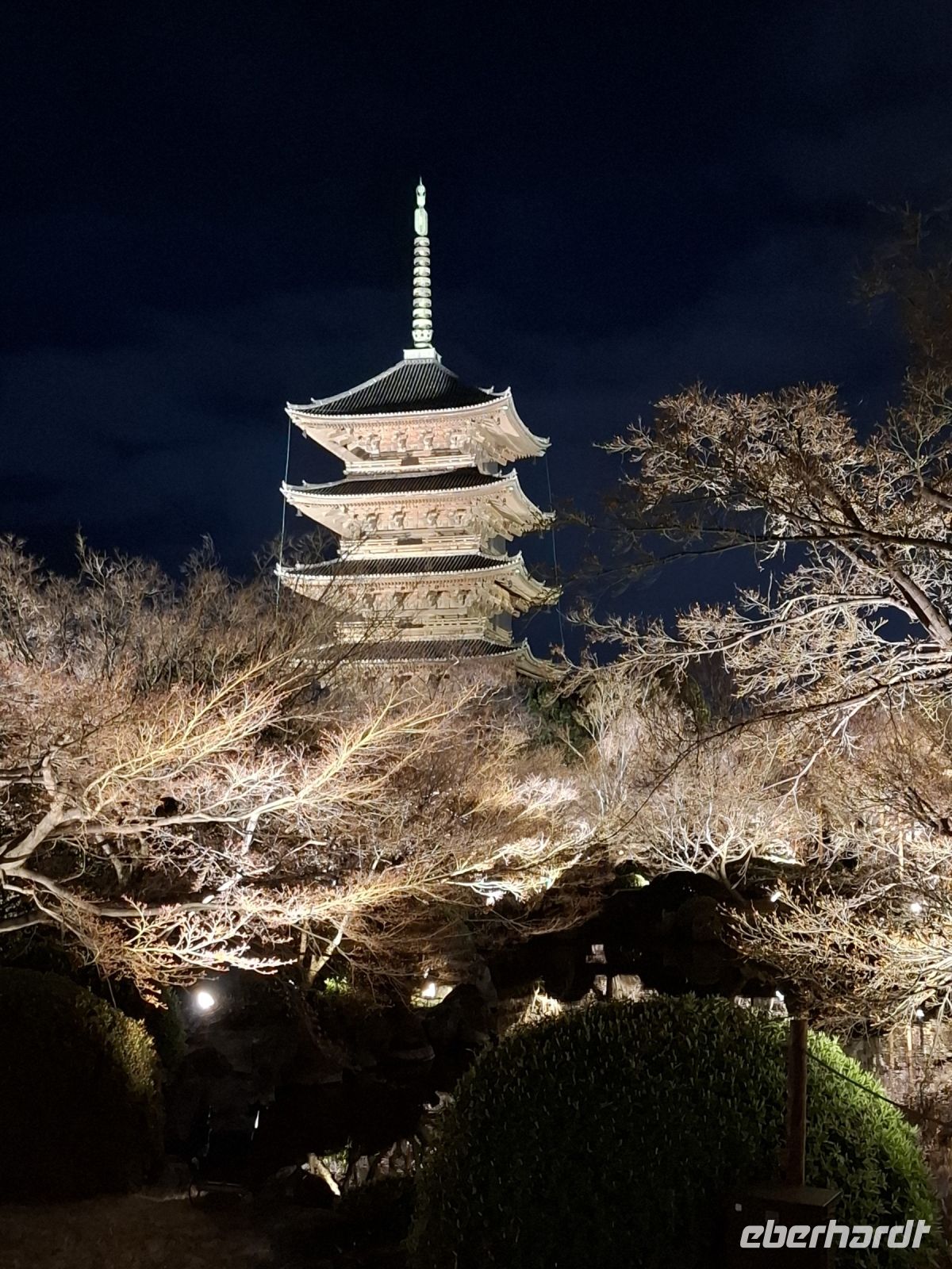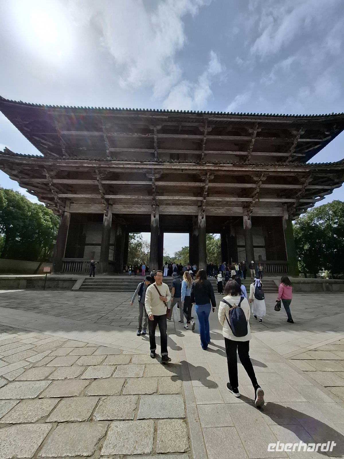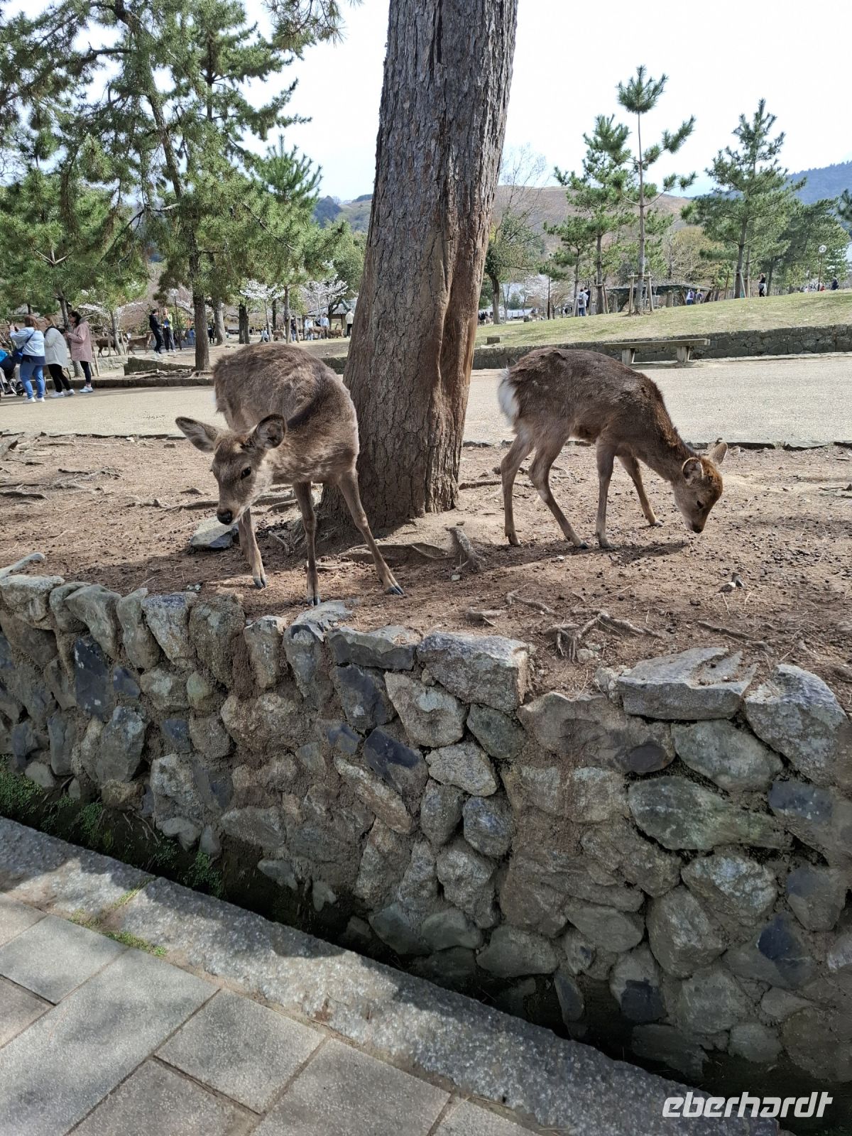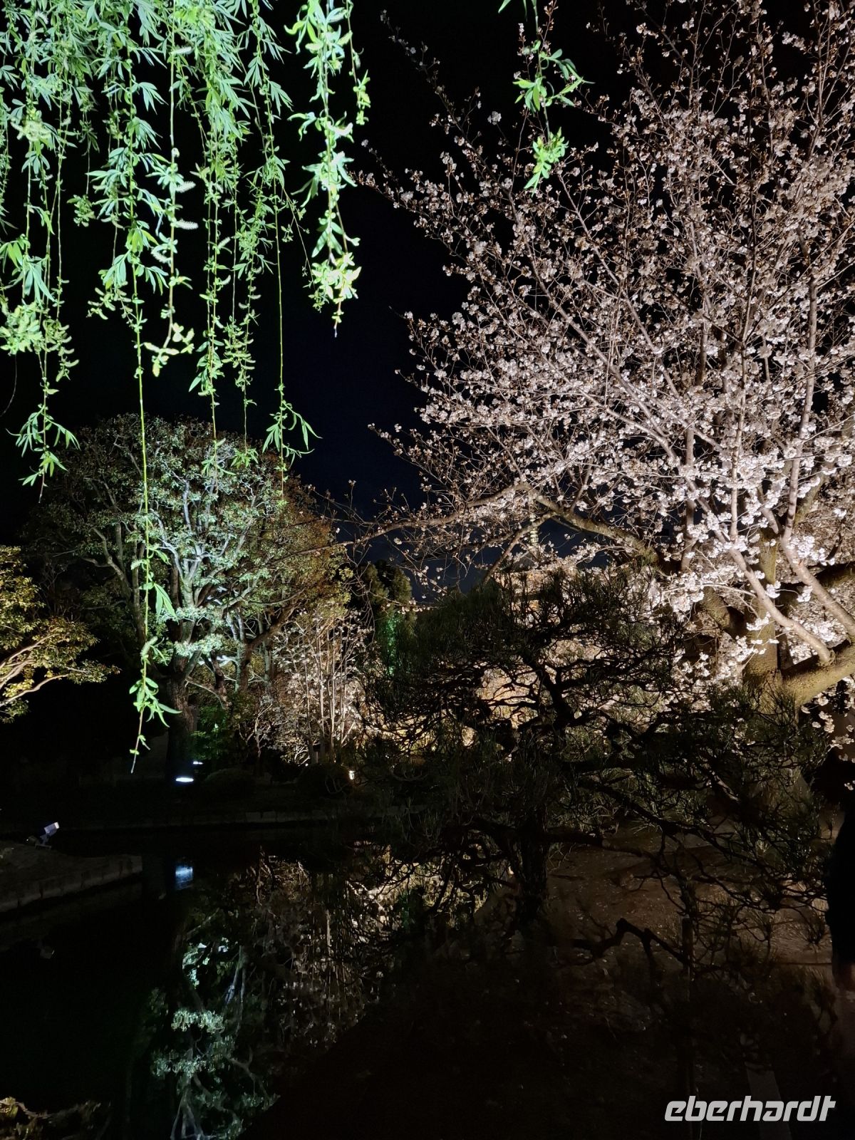 Da unser sich unser Hotel in einer kleineren Seitengasse befindet, ist es unserem Bus nicht möglich, direkt vor die Hoteltür zu fahren. Daher spazieren wir nach dem Frühstück entlang einer überdachten Mall zu unserem örtlichen Reisebus, der an der City-Hall auf uns wartet. Nachdem wir uns mit dem Bus-Chauffeur für den heutigen Tag bekannt gemacht haben, begeben wir uns auf unseren Ausflug nach Nara. Zunächst erfahren wir von Gudrun wieder eine Weisheit und eine Silbes des Tages, denen wir natürlich sehr interessiert lauschen. Da unsere Fahrtstrecke rund eine Stunde betragen wird, gibt uns Gudrun am heutigen Tag Einblicke in die allgemeine Wohnsituation der Japaner und die dazugehörigen Mietpreise. Je näher wir Nara kommen, desto mehr Informationen erhalten wir auch zur ersten permanenten Hauptstadt Japans. Nachdem wir das neue Busterminal hinter uns gelassen haben und wir weitere Kirschbäume erblicken konnten, sehen wir die ersten freilaufenden Sika-Hirsche, die sich ganz ungeniert den Menschen nähern, damit sie etwas zu fresse bekommen. Man hat hier die Möglichkeit, entsprechende Hirschkekse zu kaufen. Wenn man nicht aufpasst, ist man aber auch ganz schnell seinen Stadtplan los, da Papier auch auf der Speisekarte der Hirsche steht. Gemeinsam spazieren wir durch das große Tor und nach dem Ticketkauf besichtigen wir den Todai-ji-Tempel, das weltweit ältestes Holzgebäude und heute ein buddhistischer Tempel. Im seinem Inneren bestaunen wir die größte Buddha-Bronzestatue mit einer Höhe von 16 Metern. Als wir wieder hinaus kommen, besichtigen wir die etwas verwitterte Statue des Arhat Pindola. Der Sage nach, soll man, natürlich nach einem Münzeinwurf, die eigene schmerzende Körperstelle an der Statue berühren und anschließend die gleiche Stelle am eigenen Körper reiben. Danach soll dieser Körperteil unmittelbar geheilt sein. Einige Reisegäste probieren diesen Spaß aus aber ich befürchte, auf die Schmerzfreiheit des entsprechenden Körperteils warten sie bis heute. Danach führt uns Gudrun weiter über das Areal und wir sehen unter anderem noch eine kleine Pagode und einen weiteren Schrein. In der sich anschließende Zeit haben wir nun die Gelegenheit, uns im Landschaftsgarten von Nara umzuschauen oder sich den Horyuji-Tempel anzuschauen. Am Nachmittag sind wir zurück in Kyoto, wo wir uns am Abend erneut in der Hotellobby treffen. Gudrun organisiert uns Taxen und gemeinsam fahren wir zum illuminierten Garten rund um den Toji-Tempel. Eine wahrhaft magische Stimmung erwartet uns. Die Dunkelheit ist längst angebrochen und hunderte von Lichtern und Lampen leuchten sowohl die Toji-Tempel als auch die Kirschbäume mit ihren aufgebrochenen Blüten an. Ein Anblick, den ich gar nicht in Worten beschreiben kann (bitte schauen Sie sich die Bilder an) und der uns noch sehr lange in Erinnerung bleiben wird. Für mich persönlich war dieser abendliche Ausflug DAS Highlight auf dieser Reise.