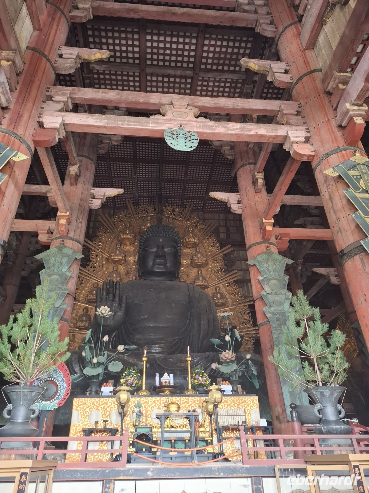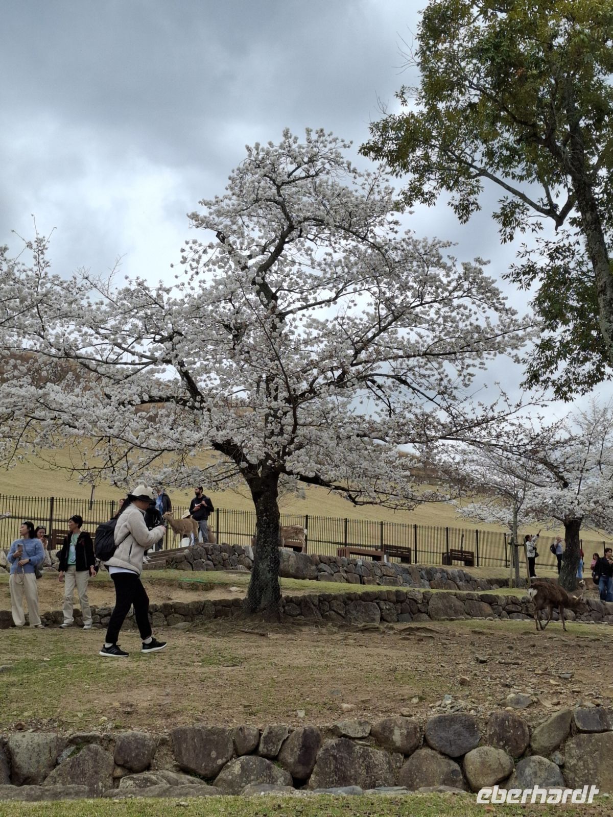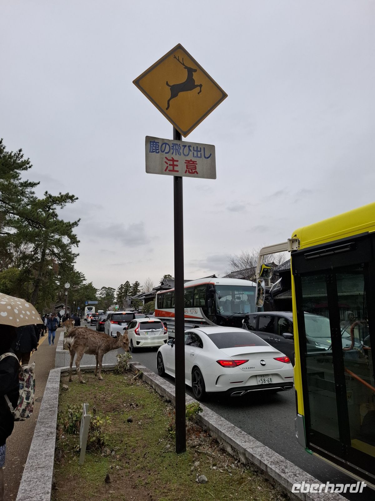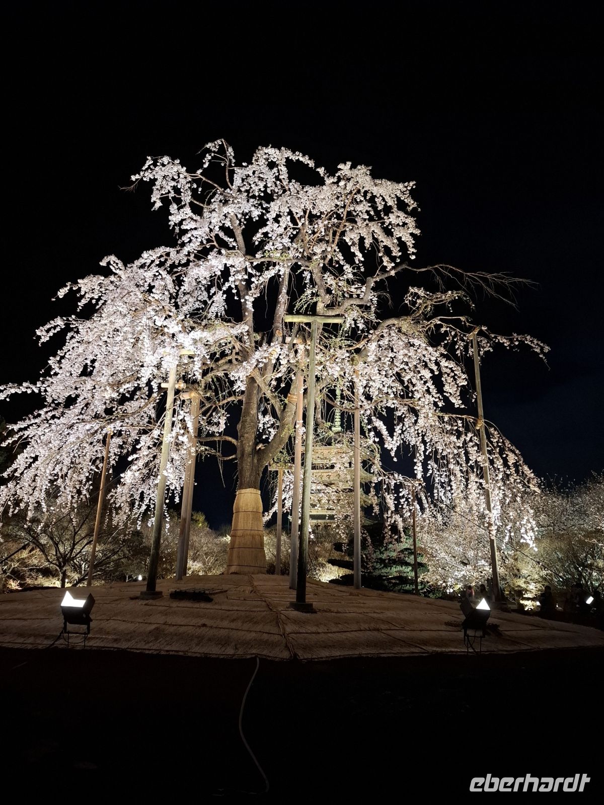 Da unser sich unser Hotel in einer kleineren Seitengasse befindet, ist es unserem Bus nicht möglich, direkt vor die Hoteltür zu fahren. Daher spazieren wir nach dem Frühstück entlang einer überdachten Mall zu unserem örtlichen Reisebus, der an der City-Hall auf uns wartet. Nachdem wir uns mit dem Bus-Chauffeur für den heutigen Tag bekannt gemacht haben, begeben wir uns auf unseren Ausflug nach Nara. Zunächst erfahren wir von Gudrun wieder eine Weisheit und eine Silbes des Tages, denen wir natürlich sehr interessiert lauschen. Da unsere Fahrtstrecke rund eine Stunde betragen wird, gibt uns Gudrun am heutigen Tag Einblicke in die allgemeine Wohnsituation der Japaner und die dazugehörigen Mietpreise. Je näher wir Nara kommen, desto mehr Informationen erhalten wir auch zur ersten permanenten Hauptstadt Japans. Nachdem wir das neue Busterminal hinter uns gelassen haben und wir weitere Kirschbäume erblicken konnten, sehen wir die ersten freilaufenden Sika-Hirsche, die sich ganz ungeniert den Menschen nähern, damit sie etwas zu fresse bekommen. Man hat hier die Möglichkeit, entsprechende Hirschkekse zu kaufen. Wenn man nicht aufpasst, ist man aber auch ganz schnell seinen Stadtplan los, da Papier auch auf der Speisekarte der Hirsche steht. Gemeinsam spazieren wir durch das große Tor und nach dem Ticketkauf besichtigen wir den Todai-ji-Tempel, das weltweit ältestes Holzgebäude und heute ein buddhistischer Tempel. Im seinem Inneren bestaunen wir die größte Buddha-Bronzestatue mit einer Höhe von 16 Metern. Als wir wieder hinaus kommen, besichtigen wir die etwas verwitterte Statue des Arhat Pindola. Der Sage nach, soll man, natürlich nach einem Münzeinwurf, die eigene schmerzende Körperstelle an der Statue berühren und anschließend die gleiche Stelle am eigenen Körper reiben. Danach soll dieser Körperteil unmittelbar geheilt sein. Einige Reisegäste probieren diesen Spaß aus aber ich befürchte, auf die Schmerzfreiheit des entsprechenden Körperteils warten sie bis heute. Danach führt uns Gudrun weiter über das Areal und wir sehen unter anderem noch eine kleine Pagode und einen weiteren Schrein. In der sich anschließende Zeit haben wir nun die Gelegenheit, uns im Landschaftsgarten von Nara umzuschauen oder sich den Horyuji-Tempel anzuschauen. Am Nachmittag sind wir zurück in Kyoto, wo wir uns am Abend erneut in der Hotellobby treffen. Gudrun organisiert uns Taxen und gemeinsam fahren wir zum illuminierten Garten rund um den Toji-Tempel. Eine wahrhaft magische Stimmung erwartet uns. Die Dunkelheit ist längst angebrochen und hunderte von Lichtern und Lampen leuchten sowohl die Toji-Tempel als auch die Kirschbäume mit ihren aufgebrochenen Blüten an. Ein Anblick, den ich gar nicht in Worten beschreiben kann (bitte schauen Sie sich die Bilder an) und der uns noch sehr lange in Erinnerung bleiben wird. Für mich persönlich war dieser abendliche Ausflug DAS Highlight auf dieser Reise.