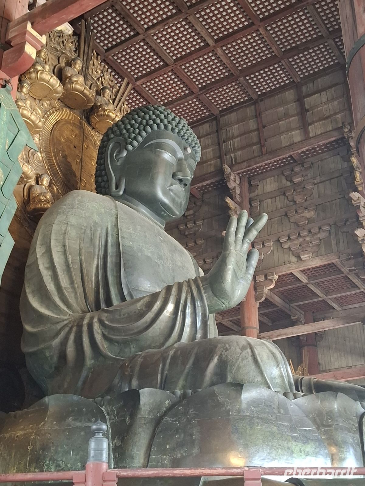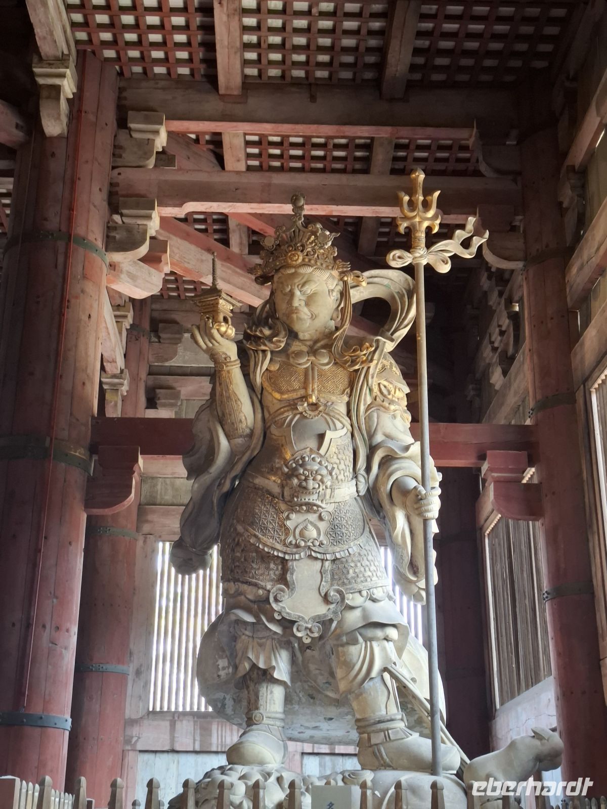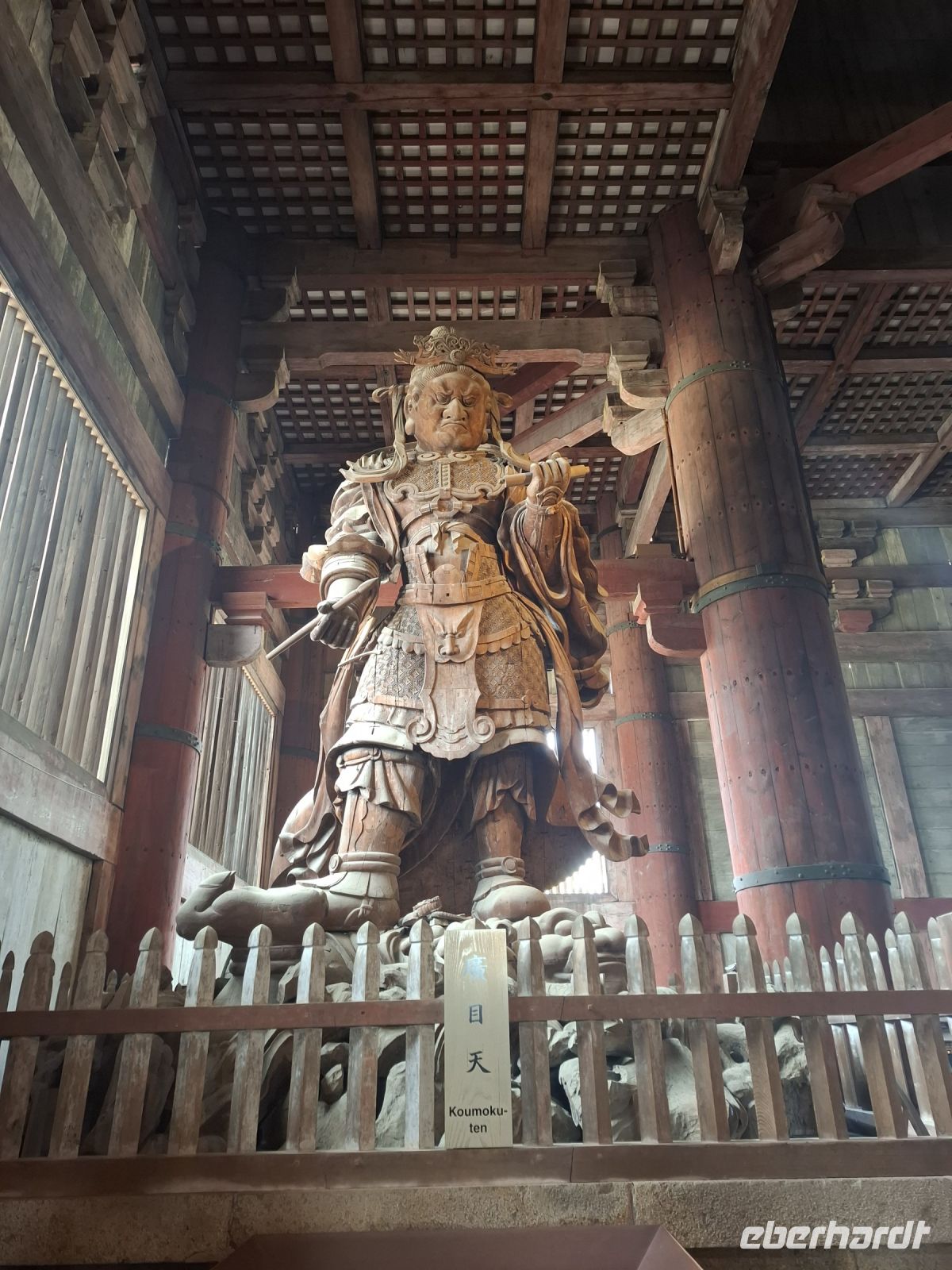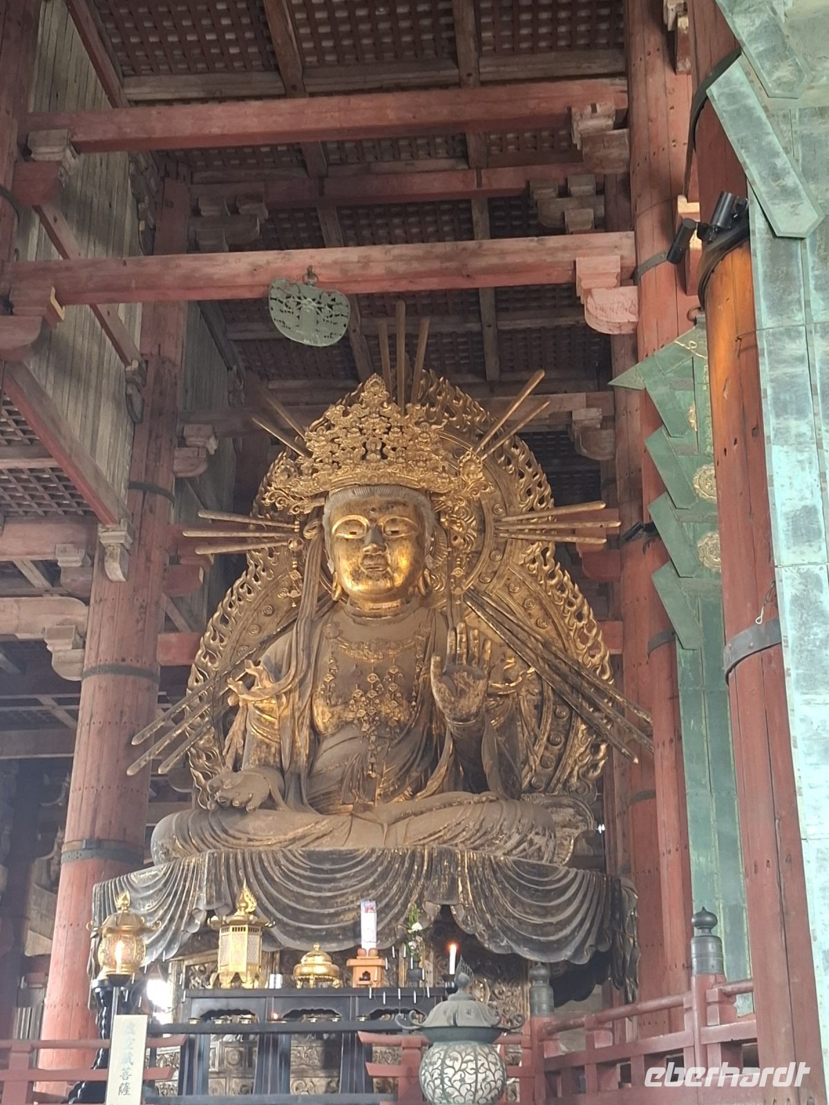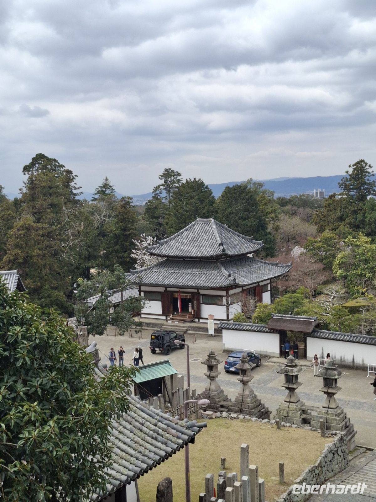 Da unser sich unser Hotel in einer kleineren Seitengasse befindet, ist es unserem Bus nicht möglich, direkt vor die Hoteltür zu fahren. Daher spazieren wir nach dem Frühstück entlang einer überdachten Mall zu unserem örtlichen Reisebus, der an der City-Hall auf uns wartet. Nachdem wir uns mit dem Bus-Chauffeur für den heutigen Tag bekannt gemacht haben, begeben wir uns auf unseren Ausflug nach Nara. Zunächst erfahren wir von Gudrun wieder eine Weisheit und eine Silbes des Tages, denen wir natürlich sehr interessiert lauschen. Da unsere Fahrtstrecke rund eine Stunde betragen wird, gibt uns Gudrun am heutigen Tag Einblicke in die allgemeine Wohnsituation der Japaner und die dazugehörigen Mietpreise. Je näher wir Nara kommen, desto mehr Informationen erhalten wir auch zur ersten permanenten Hauptstadt Japans. Nachdem wir das neue Busterminal hinter uns gelassen haben und wir weitere Kirschbäume erblicken konnten, sehen wir die ersten freilaufenden Sika-Hirsche, die sich ganz ungeniert den Menschen nähern, damit sie etwas zu fresse bekommen. Man hat hier die Möglichkeit, entsprechende Hirschkekse zu kaufen. Wenn man nicht aufpasst, ist man aber auch ganz schnell seinen Stadtplan los, da Papier auch auf der Speisekarte der Hirsche steht. Gemeinsam spazieren wir durch das große Tor und nach dem Ticketkauf besichtigen wir den Todai-ji-Tempel, das weltweit ältestes Holzgebäude und heute ein buddhistischer Tempel. Im seinem Inneren bestaunen wir die größte Buddha-Bronzestatue mit einer Höhe von 16 Metern. Als wir wieder hinaus kommen, besichtigen wir die etwas verwitterte Statue des Arhat Pindola. Der Sage nach, soll man, natürlich nach einem Münzeinwurf, die eigene schmerzende Körperstelle an der Statue berühren und anschließend die gleiche Stelle am eigenen Körper reiben. Danach soll dieser Körperteil unmittelbar geheilt sein. Einige Reisegäste probieren diesen Spaß aus aber ich befürchte, auf die Schmerzfreiheit des entsprechenden Körperteils warten sie bis heute. Danach führt uns Gudrun weiter über das Areal und wir sehen unter anderem noch eine kleine Pagode und einen weiteren Schrein. In der sich anschließende Zeit haben wir nun die Gelegenheit, uns im Landschaftsgarten von Nara umzuschauen oder sich den Horyuji-Tempel anzuschauen. Am Nachmittag sind wir zurück in Kyoto, wo wir uns am Abend erneut in der Hotellobby treffen. Gudrun organisiert uns Taxen und gemeinsam fahren wir zum illuminierten Garten rund um den Toji-Tempel. Eine wahrhaft magische Stimmung erwartet uns. Die Dunkelheit ist längst angebrochen und hunderte von Lichtern und Lampen leuchten sowohl die Toji-Tempel als auch die Kirschbäume mit ihren aufgebrochenen Blüten an. Ein Anblick, den ich gar nicht in Worten beschreiben kann (bitte schauen Sie sich die Bilder an) und der uns noch sehr lange in Erinnerung bleiben wird. Für mich persönlich war dieser abendliche Ausflug DAS Highlight auf dieser Reise.