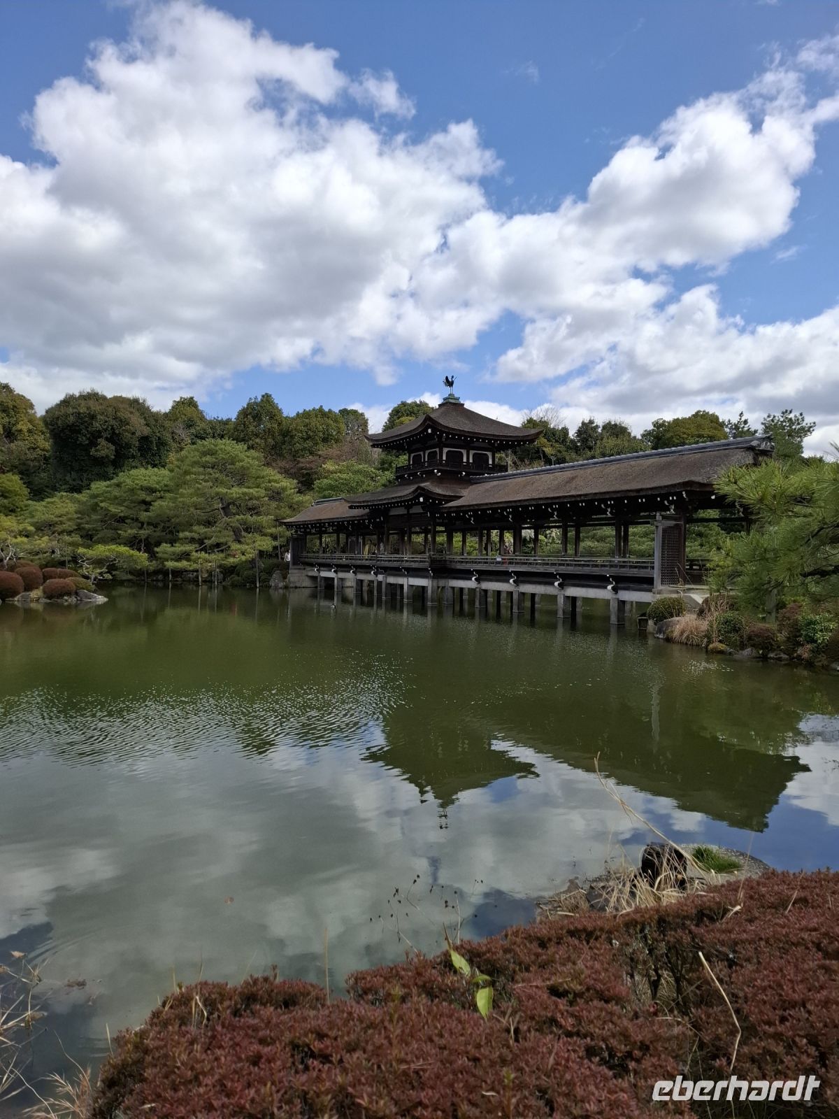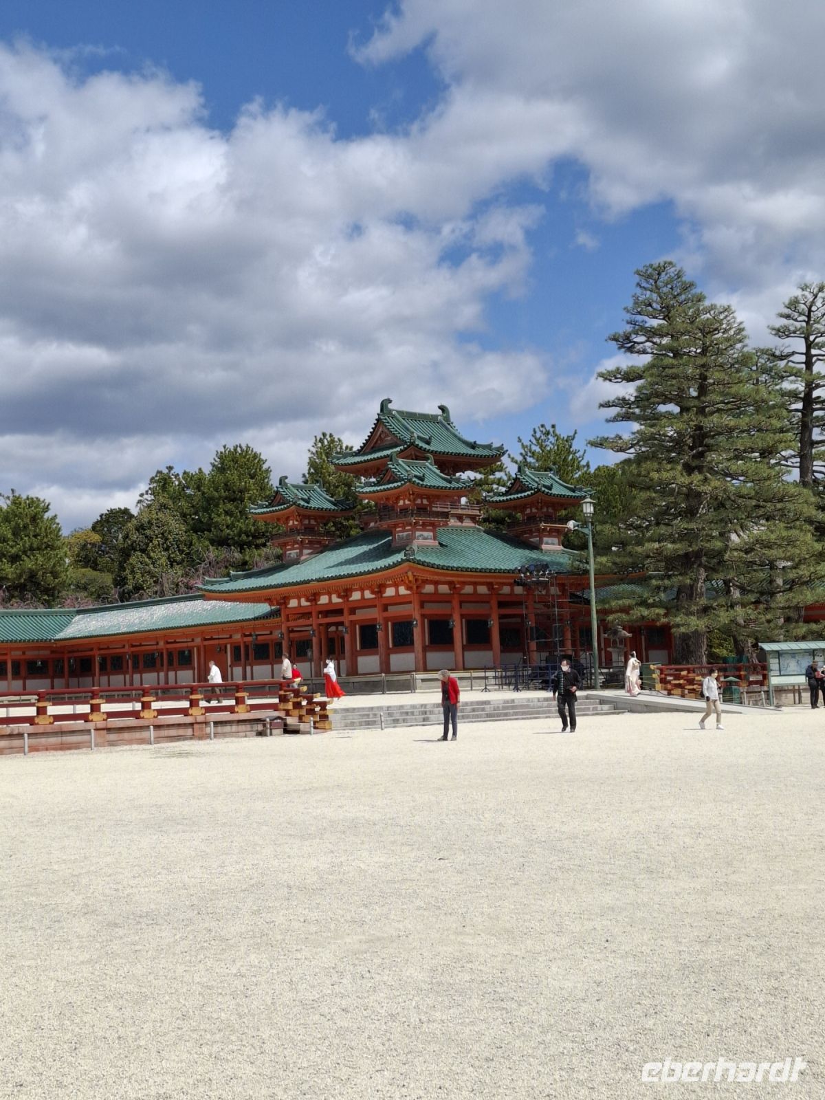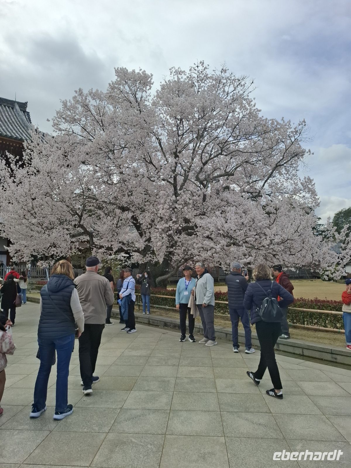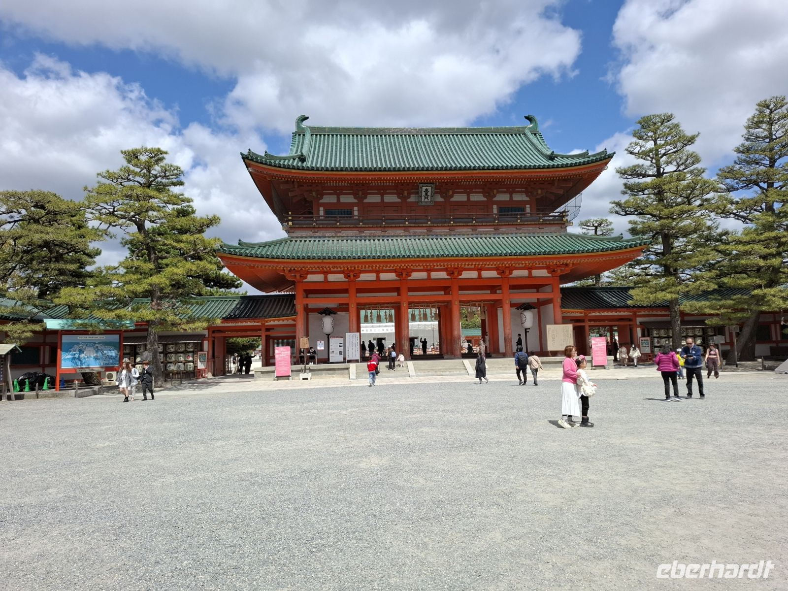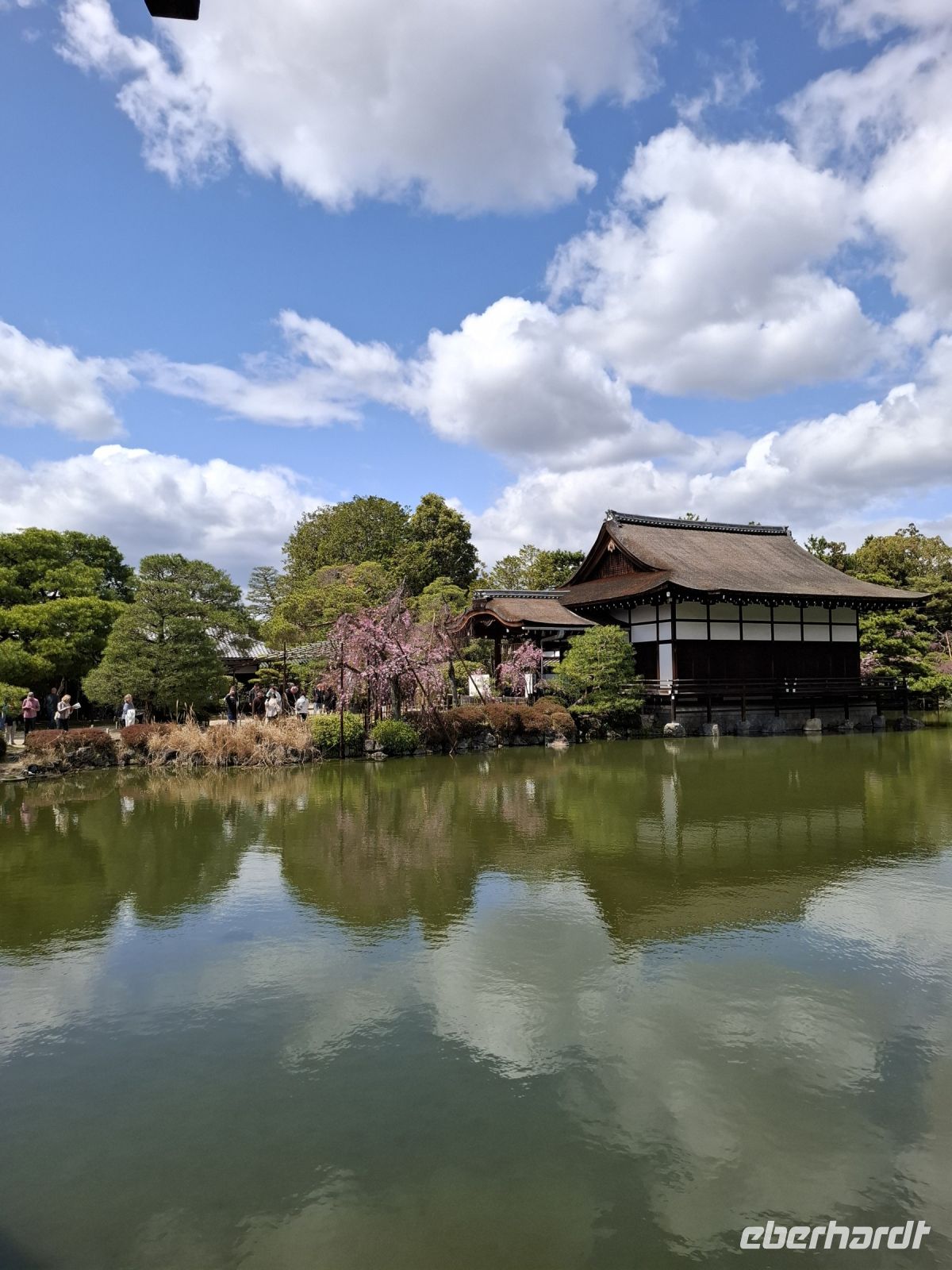Der letzte Ausflugs-Tag auf unserer Rundreise durch Japan ist angebrochen. Zum vorletzten Mal lauschen wir der Weisheit des Tages und steigen dann am Parkplatz des Ryoanji-Tempels aus. Nach dem Ticketkauf besichtigen wir den Ryoanji-Tempel und platzieren uns auf der Holzveranda um den Ausführungen Gudruns zu lauschen. Dabei blicken wir auf den minimalistisch angelegten Garten, der von der Holzveranda aus abgeht. Gudrun führt uns weiter durch die Anlage dieses Zen-Gartens. Durch einen Gang mit alten Bäumen und entlang kleinerer Pfade führt Sie uns sicher an den Schönheiten dieser Anlage vorbei. Unser nächstes Ziel ist der nur rund 5 Minuten entfernt gelegene Kinkakuji-Tempel, der auch unter dem Namen "Goldener Pavillon" bekannt geworden ist. Der Tempel ist vollständig mit Blattgold bedeckt, was ihm einen ikonischen Glanz verleiht. Hier sind nun schon sehr viel mehr Menschen mit uns in der Anlage und gemeinsam strömen wir zum Teich, von wo aus wir den besten (Foto)Blick auf den goldenen Pavillon genießen. Leider haben wir nicht das ganz so große Glück, das Spiegelbild des Pavillon im Teich zu erblicken, da der Wind leichte Wellen erzeugt aber an einer Stelle am Wasser haben wir ein Kleinbild des Tempels im Wasser erblicken können. Die letzte Anlage auf unserer Rundreise ist der Besuch am Heian-Schrein. Er wurde im Jahr 1895 errichtet und feiert somit in diesem Jahr sein 130jähriges Bestehen. Wir betreten durch das imposante rote Torri-Tor und schlendern auch hier durch die schön gestaltete Gartenanlage. Der Garten ist sorgfältig angelegt und vereint verschiedene Elemente traditioneller japanischer Gärten wie zum Beispiell Teiche, Brücken, Bambushaine und steinerne Wege. Auch hier bewundern wir die wunderschönen Kirschblüten, die in der Sonne tanzen.