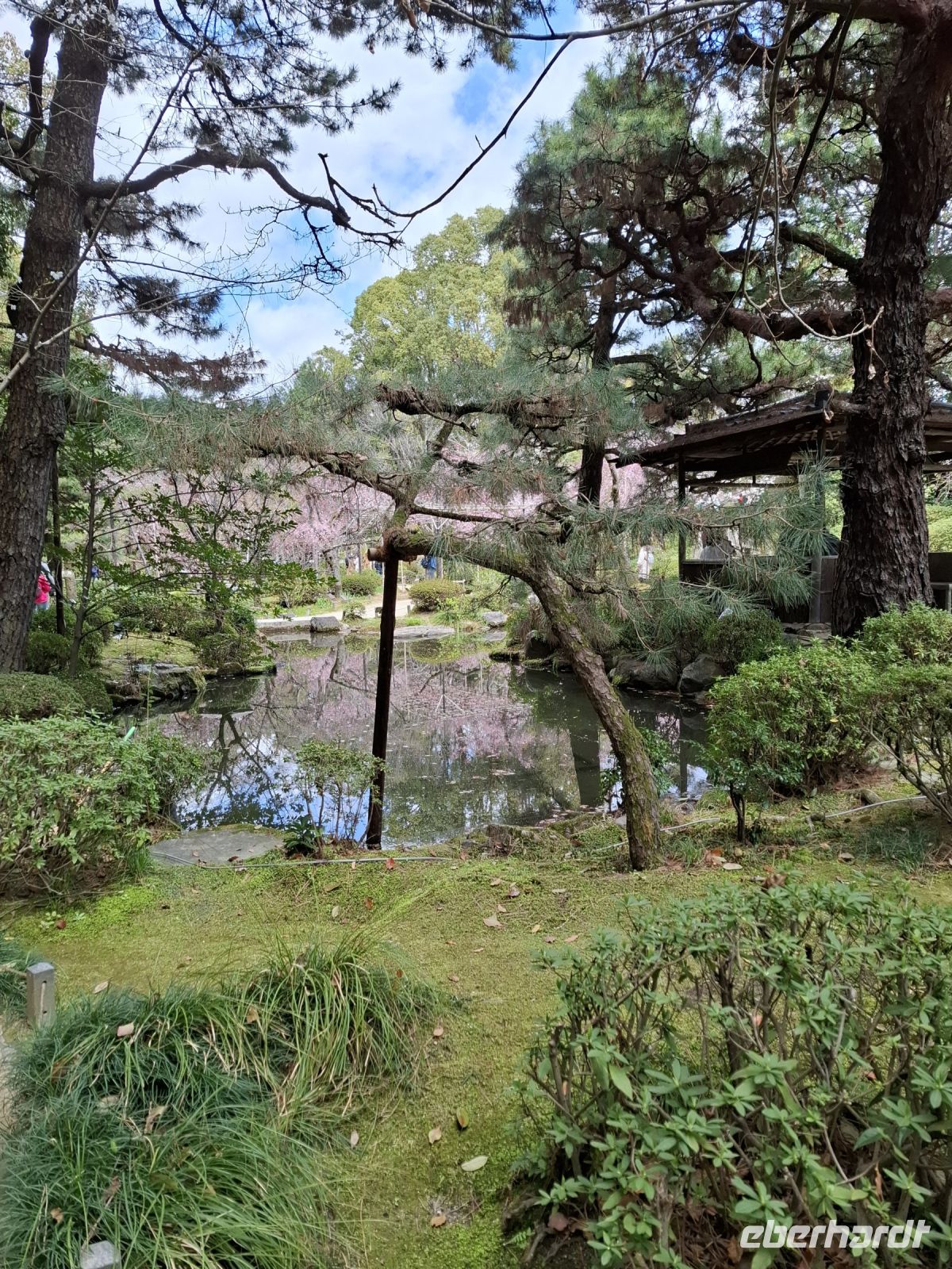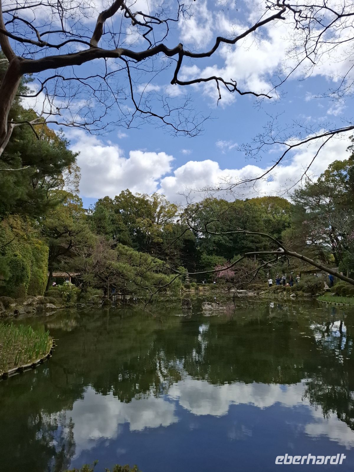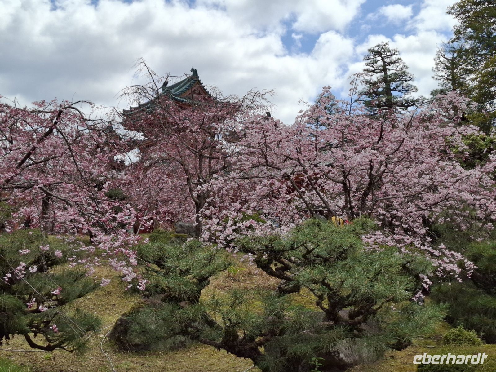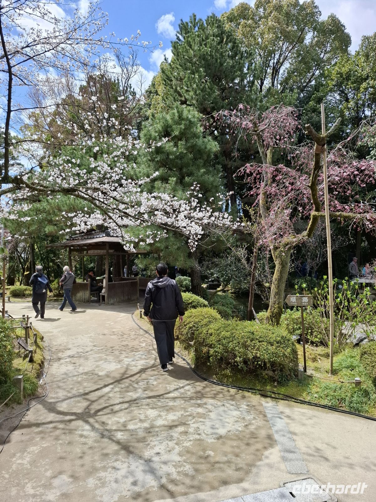 Der letzte Ausflugs-Tag auf unserer Rundreise durch Japan ist angebrochen. Zum vorletzten Mal lauschen wir der Weisheit des Tages und steigen dann am Parkplatz des Ryoanji-Tempels aus. Nach dem Ticketkauf besichtigen wir den Ryoanji-Tempel und platzieren uns auf der Holzveranda um den Ausführungen Gudruns zu lauschen. Dabei blicken wir auf den minimalistisch angelegten Garten, der von der Holzveranda aus abgeht. Gudrun führt uns weiter durch die Anlage dieses Zen-Gartens. Durch einen Gang mit alten Bäumen und entlang kleinerer Pfade führt Sie uns sicher an den Schönheiten dieser Anlage vorbei. Unser nächstes Ziel ist der nur rund 5 Minuten entfernt gelegene Kinkakuji-Tempel, der auch unter dem Namen "Goldener Pavillon" bekannt geworden ist. Der Tempel ist vollständig mit Blattgold bedeckt, was ihm einen ikonischen Glanz verleiht. Hier sind nun schon sehr viel mehr Menschen mit uns in der Anlage und gemeinsam strömen wir zum Teich, von wo aus wir den besten (Foto)Blick auf den goldenen Pavillon genießen. Leider haben wir nicht das ganz so große Glück, das Spiegelbild des Pavillon im Teich zu erblicken, da der Wind leichte Wellen erzeugt aber an einer Stelle am Wasser haben wir ein Kleinbild des Tempels im Wasser erblicken können. Die letzte Anlage auf unserer Rundreise ist der Besuch am Heian-Schrein. Er wurde im Jahr 1895 errichtet und feiert somit in diesem Jahr sein 130jähriges Bestehen. Wir betreten durch das imposante rote Torri-Tor und schlendern auch hier durch die schön gestaltete Gartenanlage. Der Garten ist sorgfältig angelegt und vereint verschiedene Elemente traditioneller japanischer Gärten wie zum Beispiell Teiche, Brücken, Bambushaine und steinerne Wege. Auch hier bewundern wir die wunderschönen Kirschblüten, die in der Sonne tanzen.