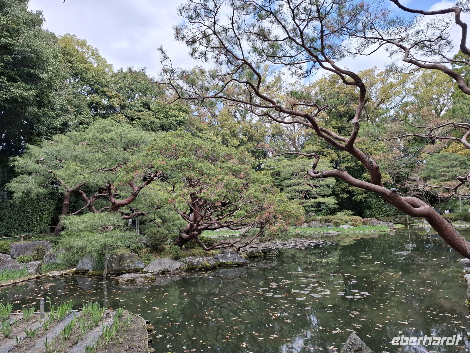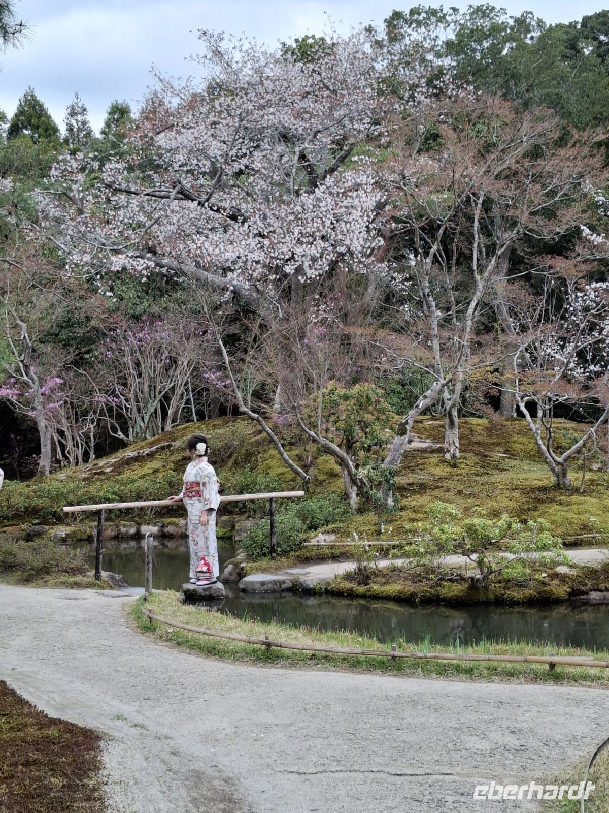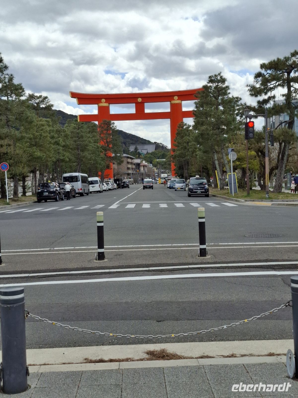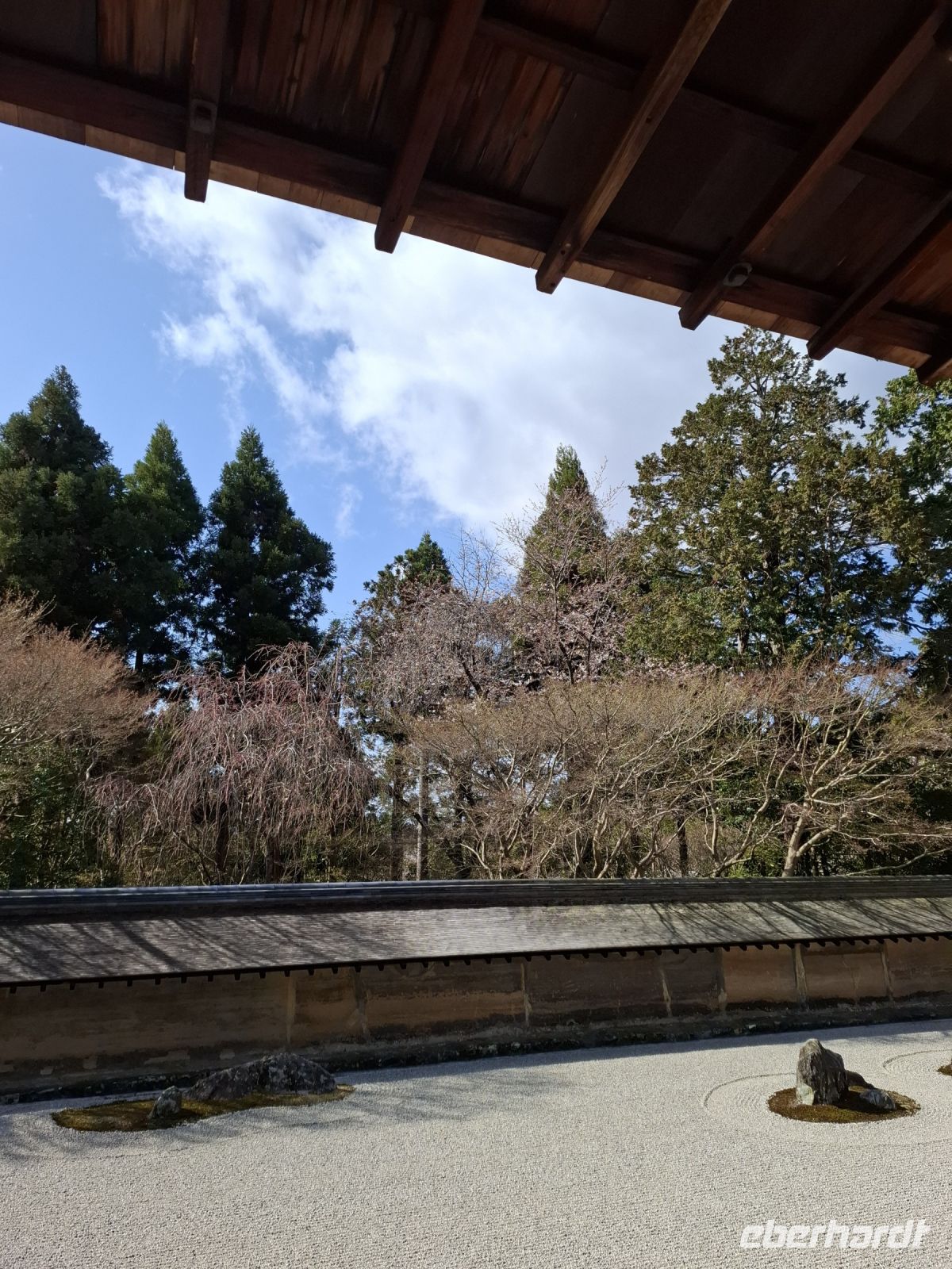 Der letzte Ausflugs-Tag auf unserer Rundreise durch Japan ist angebrochen. Zum vorletzten Mal lauschen wir der Weisheit des Tages und steigen dann am Parkplatz des Ryoanji-Tempels aus. Nach dem Ticketkauf besichtigen wir den Ryoanji-Tempel und platzieren uns auf der Holzveranda um den Ausführungen Gudruns zu lauschen. Dabei blicken wir auf den minimalistisch angelegten Garten, der von der Holzveranda aus abgeht. Gudrun führt uns weiter durch die Anlage dieses Zen-Gartens. Durch einen Gang mit alten Bäumen und entlang kleinerer Pfade führt Sie uns sicher an den Schönheiten dieser Anlage vorbei. Unser nächstes Ziel ist der nur rund 5 Minuten entfernt gelegene Kinkakuji-Tempel, der auch unter dem Namen "Goldener Pavillon" bekannt geworden ist. Der Tempel ist vollständig mit Blattgold bedeckt, was ihm einen ikonischen Glanz verleiht. Hier sind nun schon sehr viel mehr Menschen mit uns in der Anlage und gemeinsam strömen wir zum Teich, von wo aus wir den besten (Foto)Blick auf den goldenen Pavillon genießen. Leider haben wir nicht das ganz so große Glück, das Spiegelbild des Pavillon im Teich zu erblicken, da der Wind leichte Wellen erzeugt aber an einer Stelle am Wasser haben wir ein Kleinbild des Tempels im Wasser erblicken können. Die letzte Anlage auf unserer Rundreise ist der Besuch am Heian-Schrein. Er wurde im Jahr 1895 errichtet und feiert somit in diesem Jahr sein 130jähriges Bestehen. Wir betreten durch das imposante rote Torri-Tor und schlendern auch hier durch die schön gestaltete Gartenanlage. Der Garten ist sorgfältig angelegt und vereint verschiedene Elemente traditioneller japanischer Gärten wie zum Beispiell Teiche, Brücken, Bambushaine und steinerne Wege. Auch hier bewundern wir die wunderschönen Kirschblüten, die in der Sonne tanzen.
