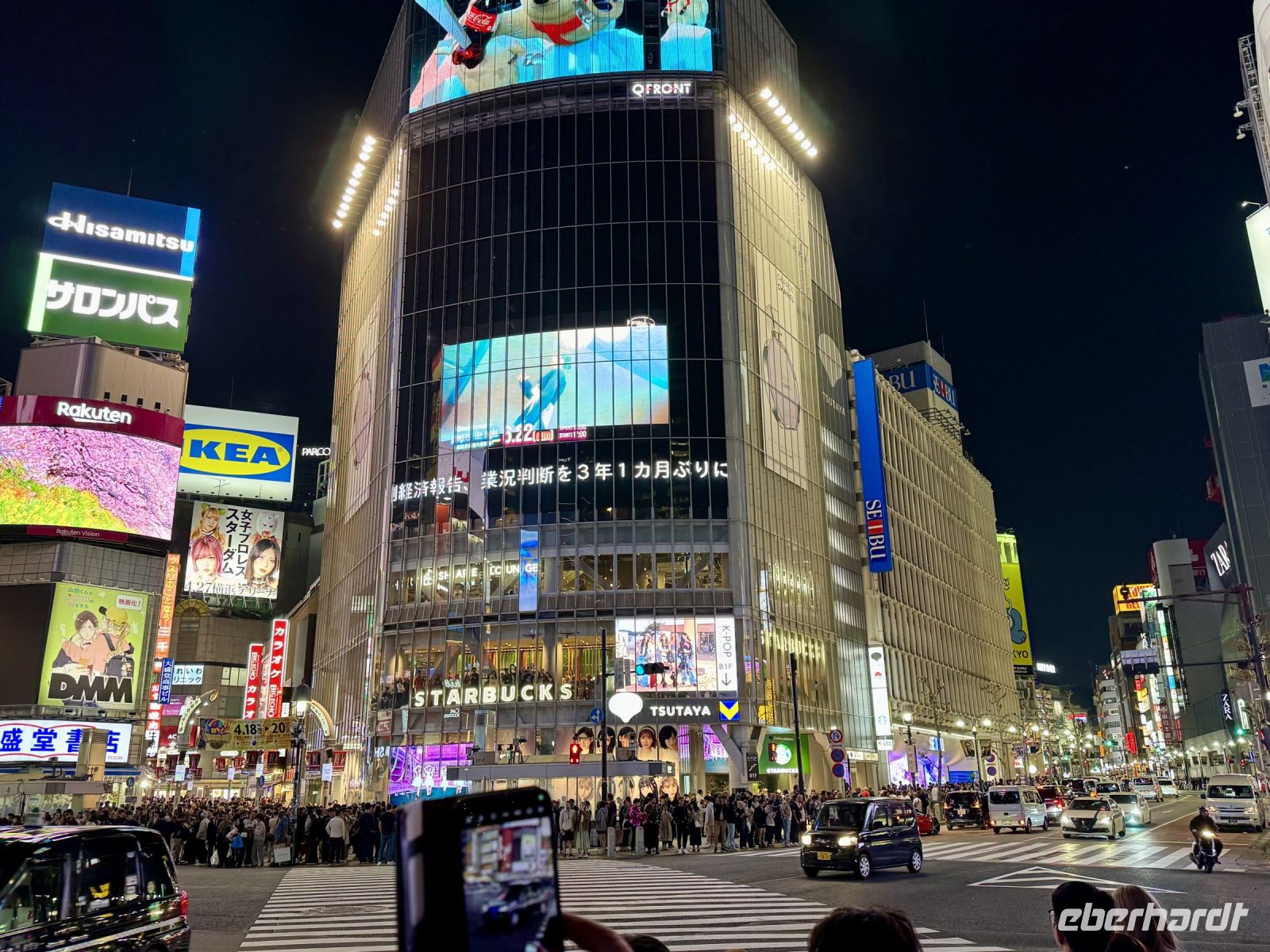 So langsam kommen wir nach der ersten Nacht in unserem Hotel auch körperlich in Japan an und gewöhnen uns an die Zeitumstellung. Mit dem japanischen Frühstück steht allerdings bereits die nächste Umgewöhnung bevor. Die Auswahl sowohl an heimischen als auch eher westlichen Speisen ist beeindruckend. Wo anfangen? Hinsichtlich unserer Stadtrundfahrt in Tokio ist zumindest diese Frage eindeutig geklärt: Wir fahren zuerst zum Meiji-Schrein und erkunden mit Hartmut diese weitläufige grüne Oase im Herzen der Stadt. Leider sind die vielen aufgestapelten Sake-Fässer am Eingang alle leer. Dafür sehen wir bei einer traditionellen Taufe nach shintoistischen Ritualen zu – wir haben wirklich Glück und sind anscheinend immer zur richtigen Zeit am richtigen Ort! Zur Mittagszeit verschlägt es uns in das noble Einkaufsviertel Ginza, wo wir im Kaufhauskomplex „Ginza Six“ Katzen-Kunst und den schönen Dachgarten bewundern. Ferner steht am Nachmittag ein Abstecher nach Asakusa auf dem Programm. Wir parken unweit der Asahi-Brauerei und laufen über den Fluss zum berühmten Donnertor. Die Ladenstraße Nakamise-dori zum Tempel ist von vielen kleinen Shops für Souvenirs und Leckereien gesäumt und sehr gut besucht, weshalb wir uns besser individuell zum Treffpunkt am Kannon-Tempel durchschlagen. Nach der Rückfahrt zu unserem Hotel in Ikebukuro können wir uns etwas ausruhen und stärken, denn der Tag ist noch nicht vorbei! Am Abend quetschen wir uns zu den Einheimischen in die Ringbahn und fahren nach Shibuya zur wohl berühmtesten Kreuzung der Welt, die vom treuen Hund Hachiko bewacht wird. Das Überqueren der Kreuzung ist ein surreales Erlebnis: ein Zusammenfluss von Menschen zu einem großen Meer aus Köpfen und Körpern (und Handys), das ebenso schnell wieder auseinanderfließt. Während sich Hartmut bei Ikea einen Hot Dog gönnt, kehre ich mit drei Damen in einem Ramen-Restaurant ein. Wir bestellen und bezahlen stilecht am Automaten, wie es sich für Japan gehört. Ein Vorgeschmack auch auf die Restaurantkultur der Zukunft in Deutschland? Während mehr und mehr Einheimische nach Shibuya strömen, um am Freitagabend den Beginn des Wochenendes zu feiern, fahren wir schließlich nach einem langen Tag mit dem Zug nach Ikebukuro zurück.
