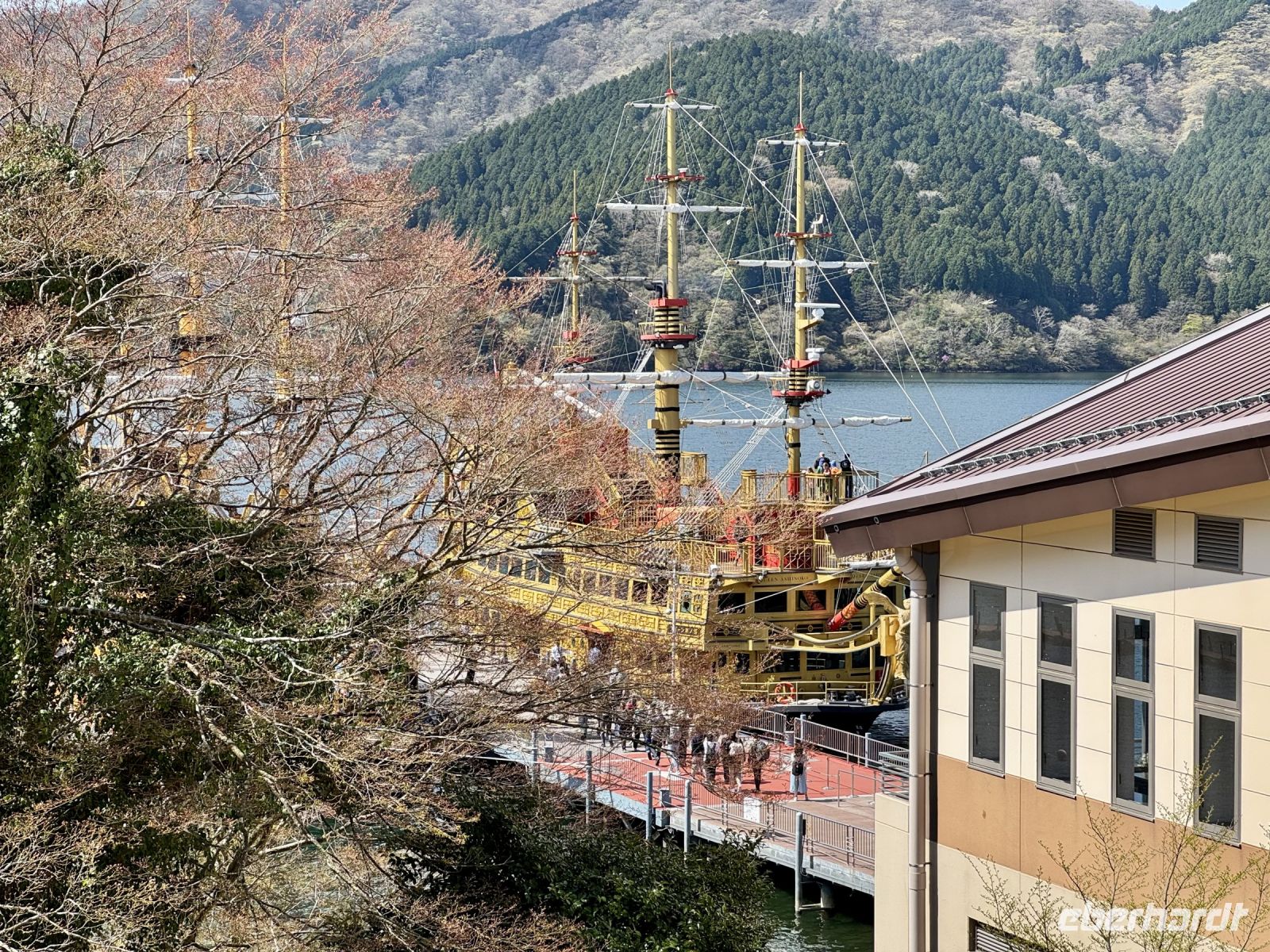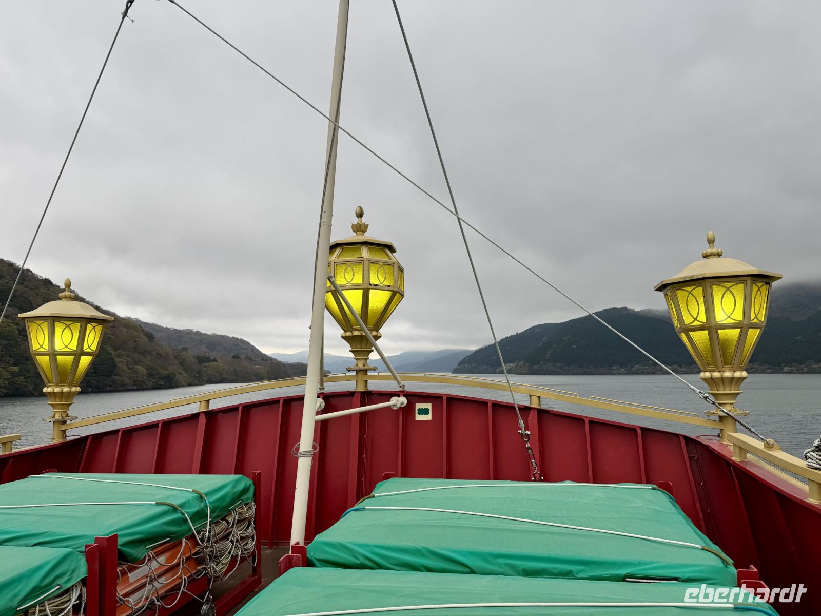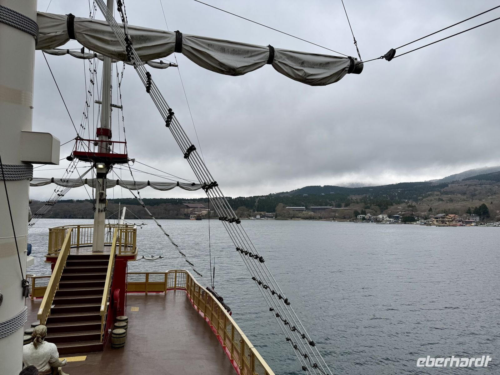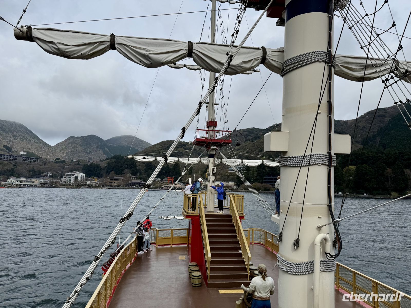 Wir verlassen nun endgültig die derzeitige Hauptstadt Japans und werden am Hasedera-Tempel in Kamakura mit Trommelwirbel begrüßt. Die Gruppe tritt als Teil eines Marktes auf, der gerade auf dem Tempelgelände und auch außen herum stattfindet. Wir können hier Sake und lokale Köstlichkeiten probieren, nachdem wir pflichtschuldig gemäß Hartmuts Anweisung um die Gebetsmühle gelaufen sind, um unsere Weisheit zu erweitern. Oder wir genießen einfach die Aussicht auf das Meer und beobachten die Windsurfer. Weisheit und Erleuchtung verspricht auch die große Buddha-Statue von Kamakura, die wir nach einem kurzen Spaziergang erreichen. Statt über Erleuchtung würden wir uns heute aber auch einfach nur über besseres Wetter freuen. Zwar bleibt es vorerst trocken, doch ziehen Wolkenfelder über das Land und verhüllen auch den Fuji, den wir bei unserer Weiterfahrt immerhin noch am Horizont ausmachen können. Für schöne Fotos reicht das Wetter aber nicht. Auch während der Bootsfahrt über den Ashi-See haben wir bzgl. des Fujis kein Glück. Die Bootsfahrt haben wir auf den heutigen Tag vorgezogen, damit wir morgen mehr Zeit für den Fuji haben — die Wetterprognose ist gut. Das Schiff ist ein Kuriosum und sorgt in seiner Gestaltung für Erheiterung. An der Endstation dürfen wir mit offizieller Erlaubnis vom Chef den Souvenirladen stürmen, bevor uns Ouashi-san zu unserem nahe gelegenen Ryokan bringt. Wir freuen uns alle über unseren eigenen Onsen auf dem Balkon und testen das heiße Thermalwasser auch gleich an. Zum traditionellen Abendessen erscheinen wir alle im Yukata, einer leichten Kimono-Variante. Jeder Tisch darf mit allerlei verschiedenen Zutaten wortwörtlich sein eigenes Süppchen kochen, während die vielen Vorspeisen (darunter eingelegtes Gemüse und Sashimi) nach und nach im Mund verschwinden. Egal ob vegetarisch oder klassisch mit Fleisch – die Nudelsuppe, die wir uns im Laufe des Abends zusammenrühren, entpuppt sich als ausgesprochen schmackhaft! Hartmut will unseren Aufenthalt gleich um eine Woche verlängern, was wir gut nachvollziehen können.