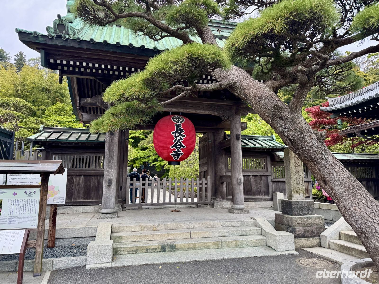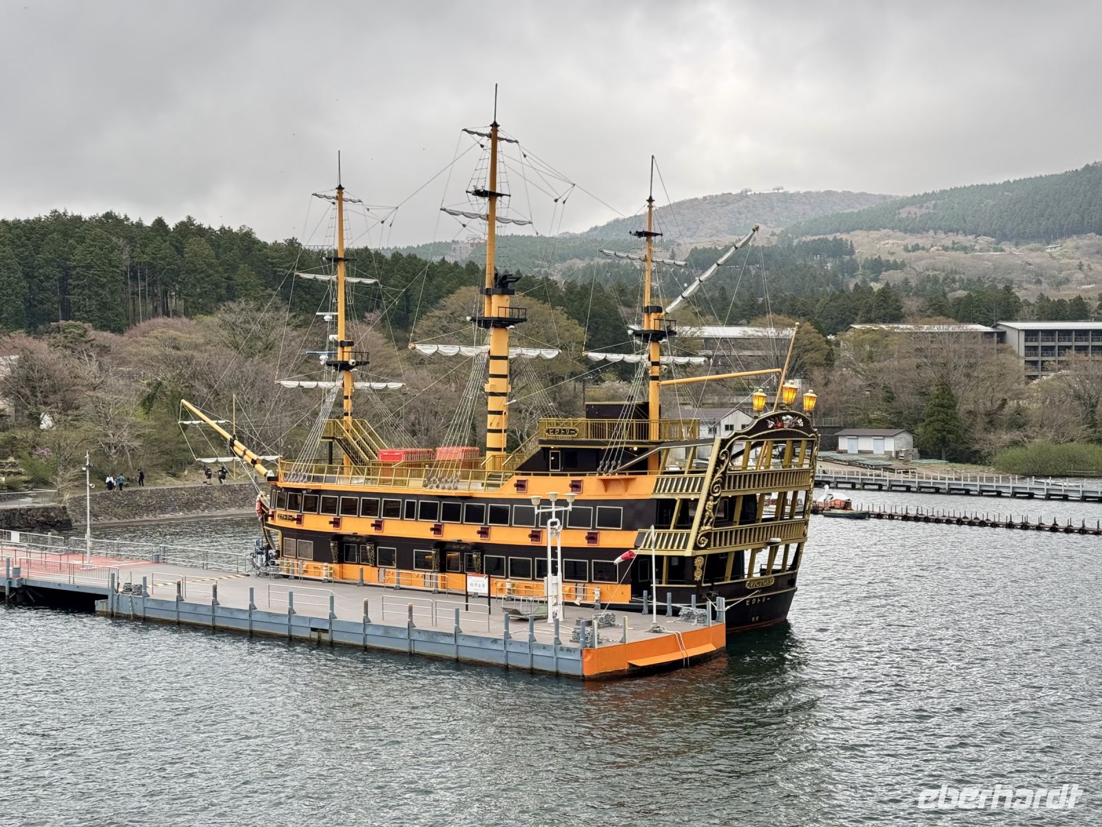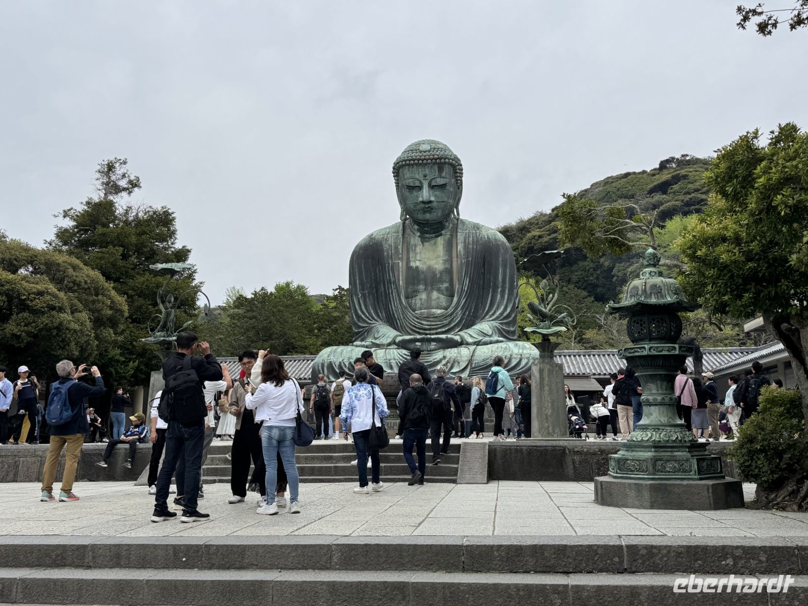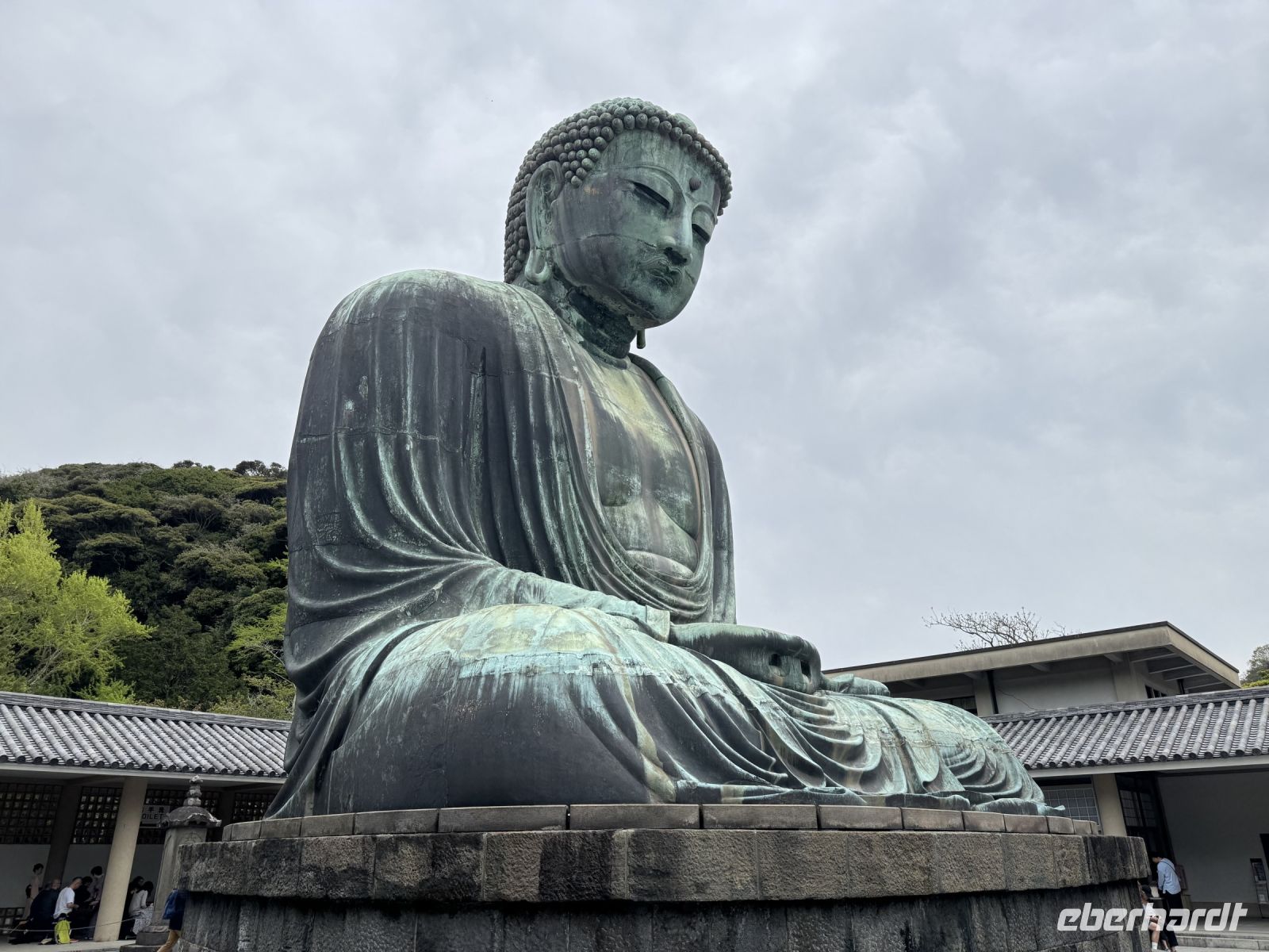 Wir verlassen nun endgültig die derzeitige Hauptstadt Japans und werden am Hasedera-Tempel in Kamakura mit Trommelwirbel begrüßt. Die Gruppe tritt als Teil eines Marktes auf, der gerade auf dem Tempelgelände und auch außen herum stattfindet. Wir können hier Sake und lokale Köstlichkeiten probieren, nachdem wir pflichtschuldig gemäß Hartmuts Anweisung um die Gebetsmühle gelaufen sind, um unsere Weisheit zu erweitern. Oder wir genießen einfach die Aussicht auf das Meer und beobachten die Windsurfer. Weisheit und Erleuchtung verspricht auch die große Buddha-Statue von Kamakura, die wir nach einem kurzen Spaziergang erreichen. Statt über Erleuchtung würden wir uns heute aber auch einfach nur über besseres Wetter freuen. Zwar bleibt es vorerst trocken, doch ziehen Wolkenfelder über das Land und verhüllen auch den Fuji, den wir bei unserer Weiterfahrt immerhin noch am Horizont ausmachen können. Für schöne Fotos reicht das Wetter aber nicht. Auch während der Bootsfahrt über den Ashi-See haben wir bzgl. des Fujis kein Glück. Die Bootsfahrt haben wir auf den heutigen Tag vorgezogen, damit wir morgen mehr Zeit für den Fuji haben — die Wetterprognose ist gut. Das Schiff ist ein Kuriosum und sorgt in seiner Gestaltung für Erheiterung. An der Endstation dürfen wir mit offizieller Erlaubnis vom Chef den Souvenirladen stürmen, bevor uns Ouashi-san zu unserem nahe gelegenen Ryokan bringt. Wir freuen uns alle über unseren eigenen Onsen auf dem Balkon und testen das heiße Thermalwasser auch gleich an. Zum traditionellen Abendessen erscheinen wir alle im Yukata, einer leichten Kimono-Variante. Jeder Tisch darf mit allerlei verschiedenen Zutaten wortwörtlich sein eigenes Süppchen kochen, während die vielen Vorspeisen (darunter eingelegtes Gemüse und Sashimi) nach und nach im Mund verschwinden. Egal ob vegetarisch oder klassisch mit Fleisch – die Nudelsuppe, die wir uns im Laufe des Abends zusammenrühren, entpuppt sich als ausgesprochen schmackhaft! Hartmut will unseren Aufenthalt gleich um eine Woche verlängern, was wir gut nachvollziehen können.