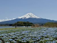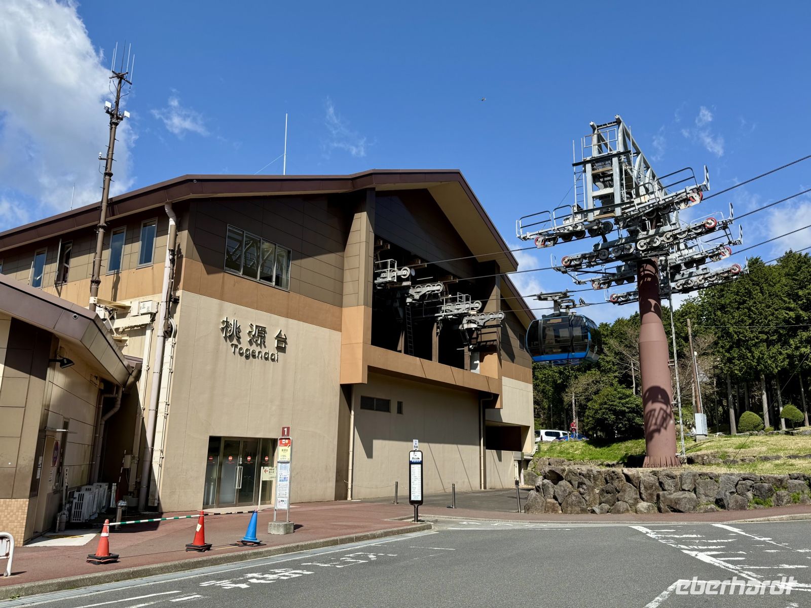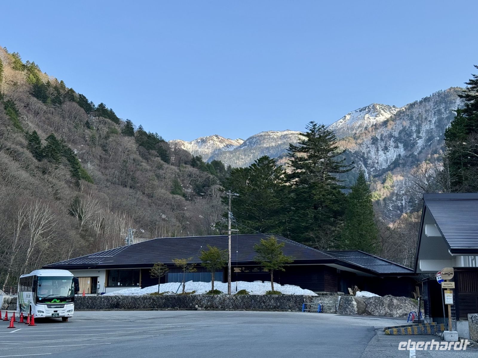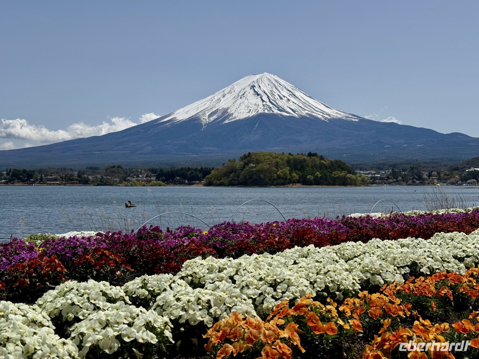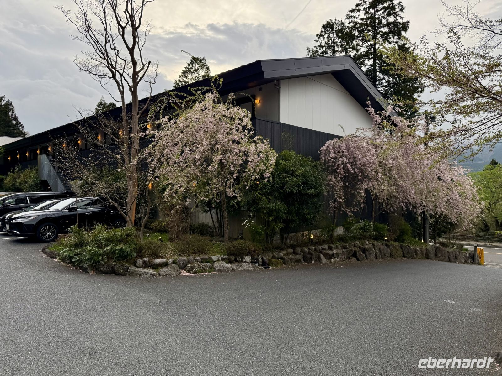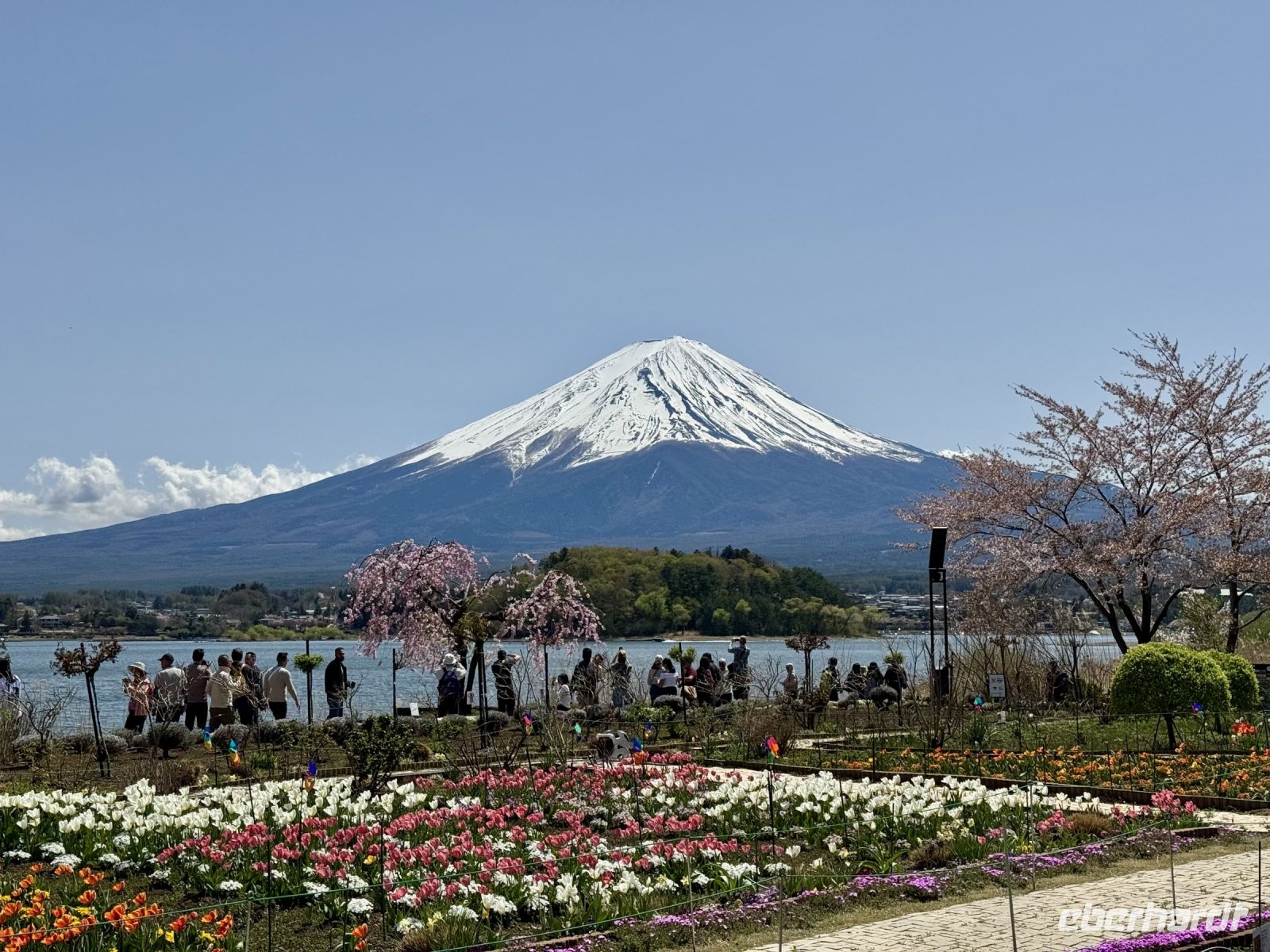 Auch zum Frühstück in unserem tollen Ryokan erscheinen wir teilweise noch im Yukata. Die Auswahl ist wieder groß und unser Gemüse dünstet auf der Flamme vor sich hin. Das traditionell halbrohe Ei verstecken wir zur Erheiterung des Personals im Bambuskorb und lassen es lieber durchkochen. Der weitere Tag steht weitestgehend im Zeichen des Fuji, den wir aus verschiedenen Perspektiven kennenlernen und fotografieren wollen. Daher kehren wir zur Gondelstation zurück und fahren mit der Seilbahn zum Owakudani-Tal. Schwefelgeruch empfängt uns hier und es steigt überall Dampf aus der Erde auf. Der Fuji-san scheut sich leider vorerst noch und verhüllt sich hinter einer Wolkenschicht, obwohl ansonsten viel Sonnenschein herrscht. Hartmut versprüht dennoch Optimismus: Wir werden ihn heute schon noch sehen! Also geht es mit der Seilbahn weiter zur Endstation, wo uns Ouashi-san mit dem Bus erwartet. Hartmut soll recht behalten. Die Wolken lösen sich nach und nach auf und geben den Blick auf den schneebedeckten Gipfel frei. Bei einem spontanen Stopp an einem Konbini machen wir ein paar Fotos, doch die schönsten Motive ergeben sich später im Oishi-Park am Kawaguchi-See. Ein buntes Blumenmeer, der blaue See und dahinter der schneebedeckt Fuji — einfach perfekt! Dazu gibt es Softeis und leckere Erdbeeren, nur leider nicht genug Zeit für alles! Am Nachmittag setzen wir unsere Reise durch die Bergwelt der Japanischen Alpen fort, unterbrochen von einer Mittags- und späten Kaffeepause an Raststätten. In den Bergen wird es merklich kühler und es liegt hier und da noch Schnee am Straßenrand. Unser Hotel in Takayama sieht sehr schick aus und es gibt eine Lounge und einen Spa-Bereich in der obersten Etage. Ein Teil der Gruppe zieht am Abend noch mit Hartmut los und begibt sich auf die Suche nach einem kleinen Abendessen.