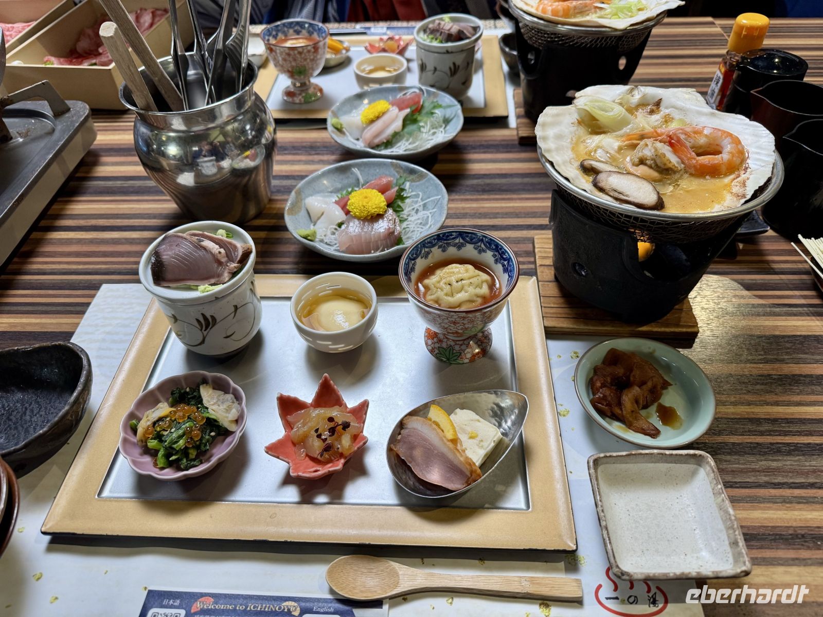 ich danke euch allen für die vielen netten Gespräche und tollen gemeinsamen Erlebnisse auf dieser Reise – alle im Yukata beim Abendessen/Suppekochen im Ryokan nach einem Entspannungsbad im Onsen, das hat schon was! Hartmut habe ich ja oben schon ausführlich gelobt und auch unsere Busfahrer waren toll und zuvorkommend. Das ausgedruckte Foto von Ouashi-san bekommt einen Ehrenplatz. Ich würde mich wirklich sehr freuen, wenn ich euch alle bald wieder als Gäste auf einer Eberhardt-Reise begrüßen darf.
