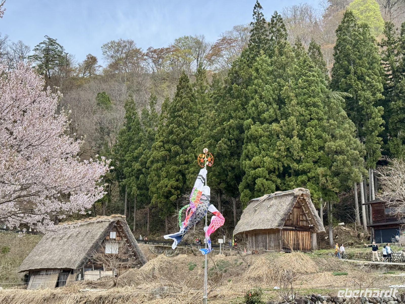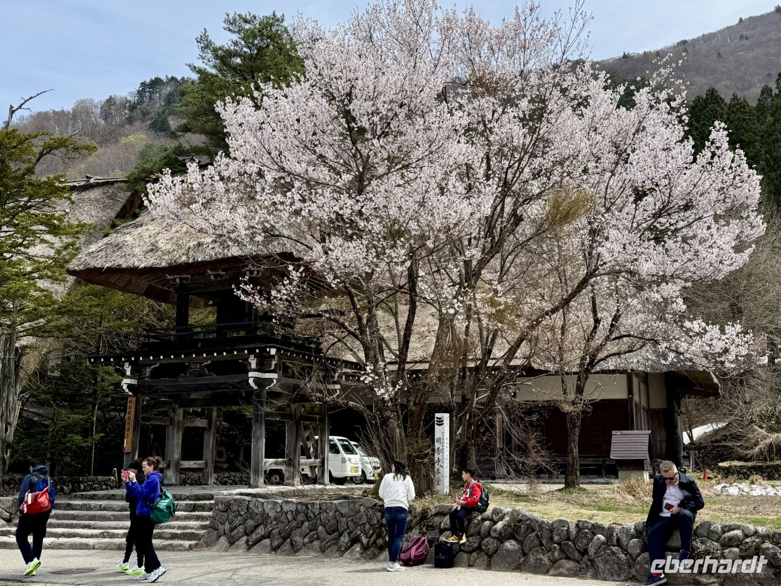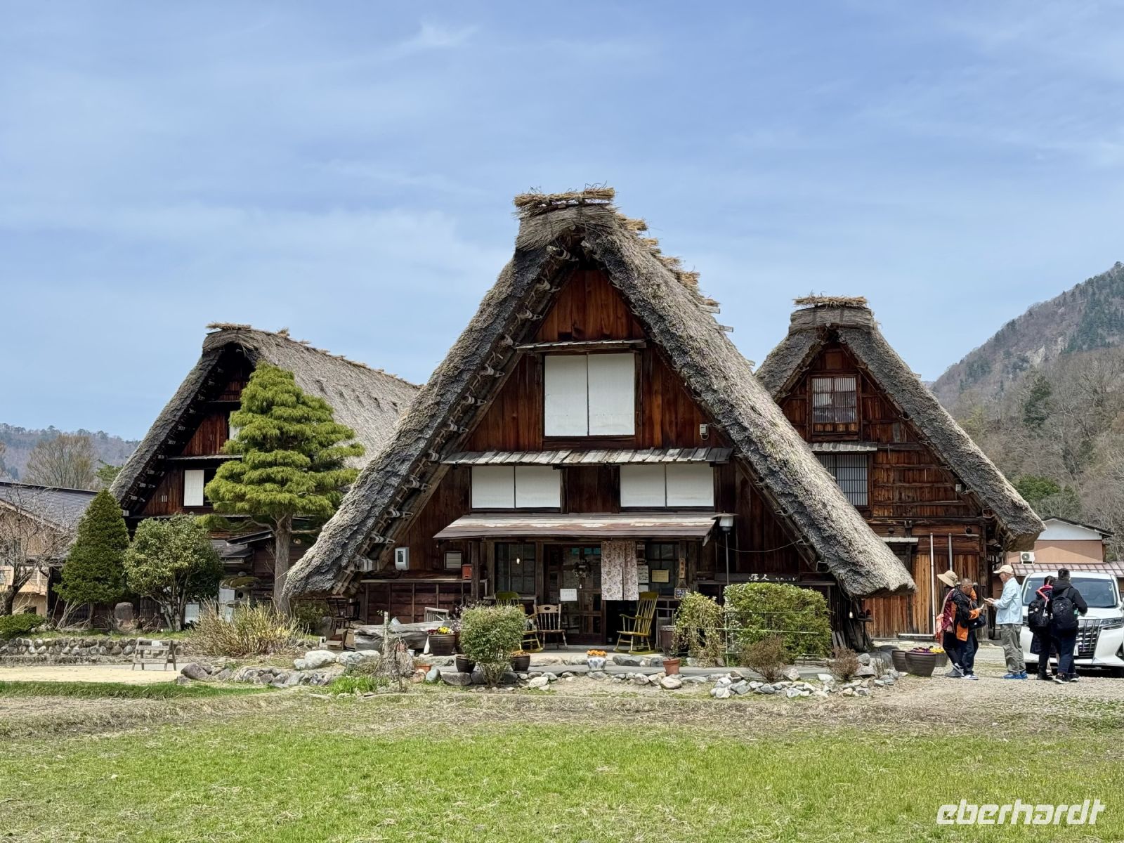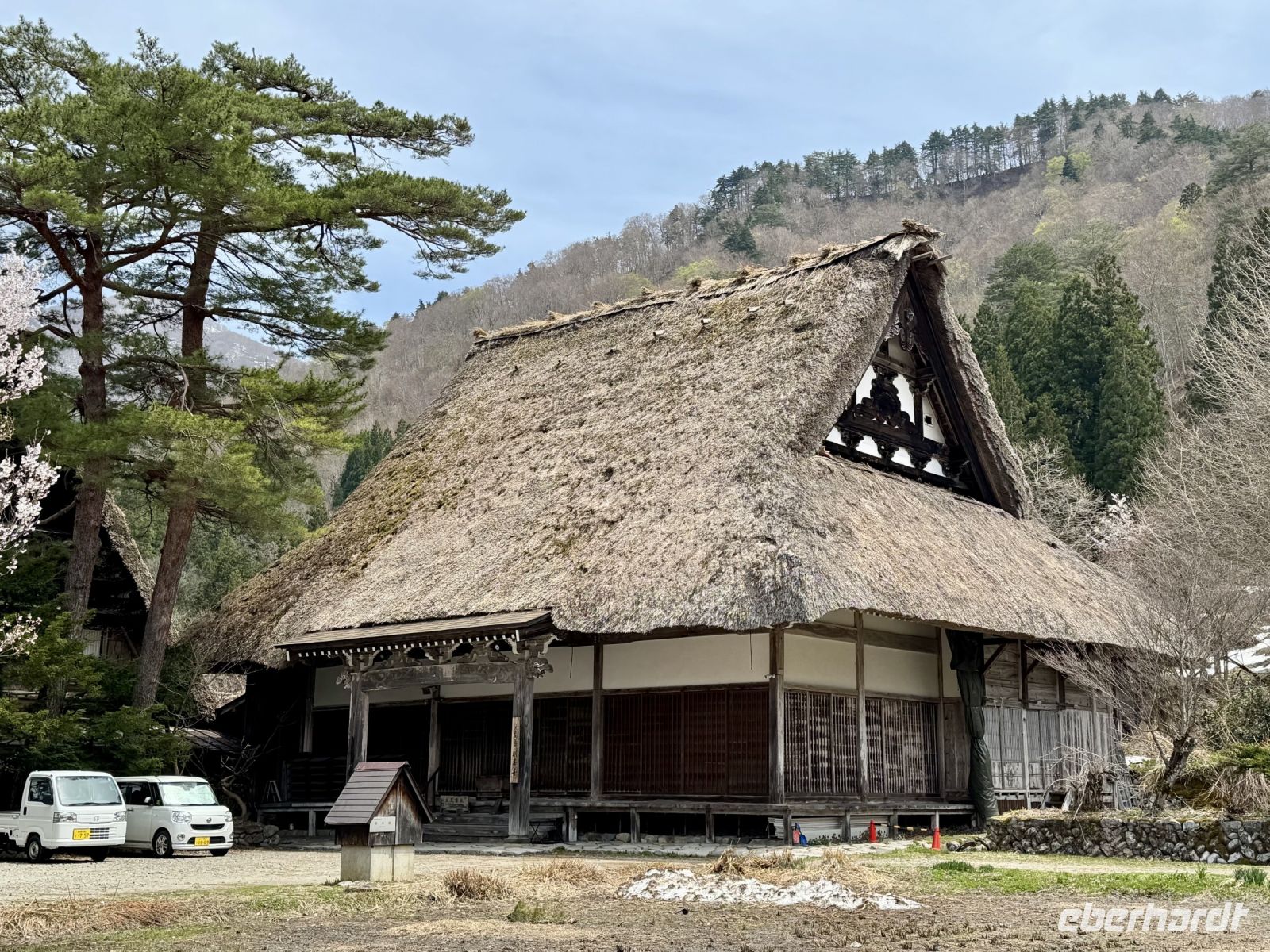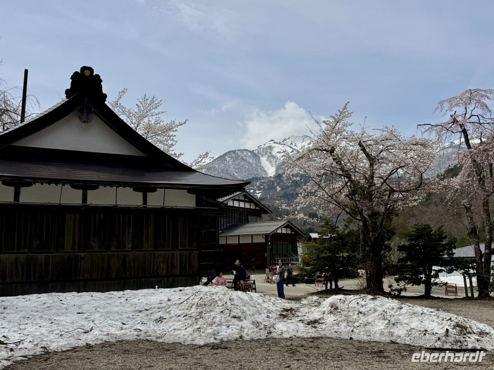 In mehrfacher Hinsicht wollen wir heute in die Vergangenheit Japans reisen, vor allem in die Edo-Zeit. Wir beginnen jedoch mit einem kleinen Spaziergang zum Morgenmarkt am Fluss. Unterwegs gibt es bereits viel zu entdecken: versteckte kleine Schreine, hübsche alte Häuser aus Holz, ein niedliches kleines Auto, Dekoration in den Schaufenstern. In Takayama ist die Kirschblüte noch in vollem Gange. Vor allem am Fluss sehen wir viele prächtige Bäume. Auf dem Morgenmarkt wird Obst und Gemüse feilgeboten, aber auch Andenken aus Holz und allerlei süße Sachen. Und überall hängen die kleinen roten Puppen, die Affenbabys darstellen sollen. Ouashi-san hat derweil umgeparkt und erwartet uns auf dem großen Busparkplatz. Von dort aus fahren wir durch die Berge ins Museumsdorf Shirakawago. Auch hier stoßen wir auf viele blühende Kirschbäume, die vor den schilfgedeckten Bauernhäusern und schneebedeckten Gipfeln der Japanischen Alpen tolle Fotomotive abgeben. Nach einem weiteren kleinen Spaziergang mit Hartmut besichtigen wir ein traditionelles Bauernhaus mit Ahnenschrein, Feuerstelle und riesigem Dachboden. Nach unserer Rückkehr nach Takayama müssen wir uns am Hotel nun leider von Ouashi-san verabschieden. Ein „Sayonara“ ist für diesen tollen und herzlichen Fahrer mehr als angebracht, der die Messlatte sehr hoch gesetzt hat. Er muss nun weiter nach Osaka fahren und dort die nächste Gruppe in Empfang nehmen. Aufgrund der Expo haben Reiseleiter und Busfahrer gerade generell richtig viel zu tun. Das Jinya-Museum schließt am Nachmittag den Kreis zu unserem Tagesausflug nach Nikko am vierten Tag. Es war ein regionales Verwaltungsgebäude des Tokugawa-Shogunats und lässt die Zeit der Samurai-Herrschaft u. a. mit Großraumbüros, Küche mit Reistöpfen, kleiner Teestube und einer Sänfte für die edlen Herren vor unseren Augen auferstehen. Ein Bummel durch das umgebende Viertel von Takayama mit vielen Gebäuden aus ebenjener Epoche, also der Edo-Zeit, rundet diesen tollen Programmpunkt ab. Hartmut hat heute die Spendierhosen an und lädt uns spontan zu einer Sake-Verkostung ein. Nur ein paar Häuser weiter können wir von einer wirklich köstlichen Miso-Brühe probieren. Das weckt die Vorfreude auf unser Abendessen mit regional typischem Hida-Rindfleisch in einem Grillrestaurant. Auch hier dürfen/müssen wir selbst Hand anlegen, denn das Grillgut kommt roh auf den Tisch – und zwar in riesigen Mengen. Fast genug für ein Dorffest.