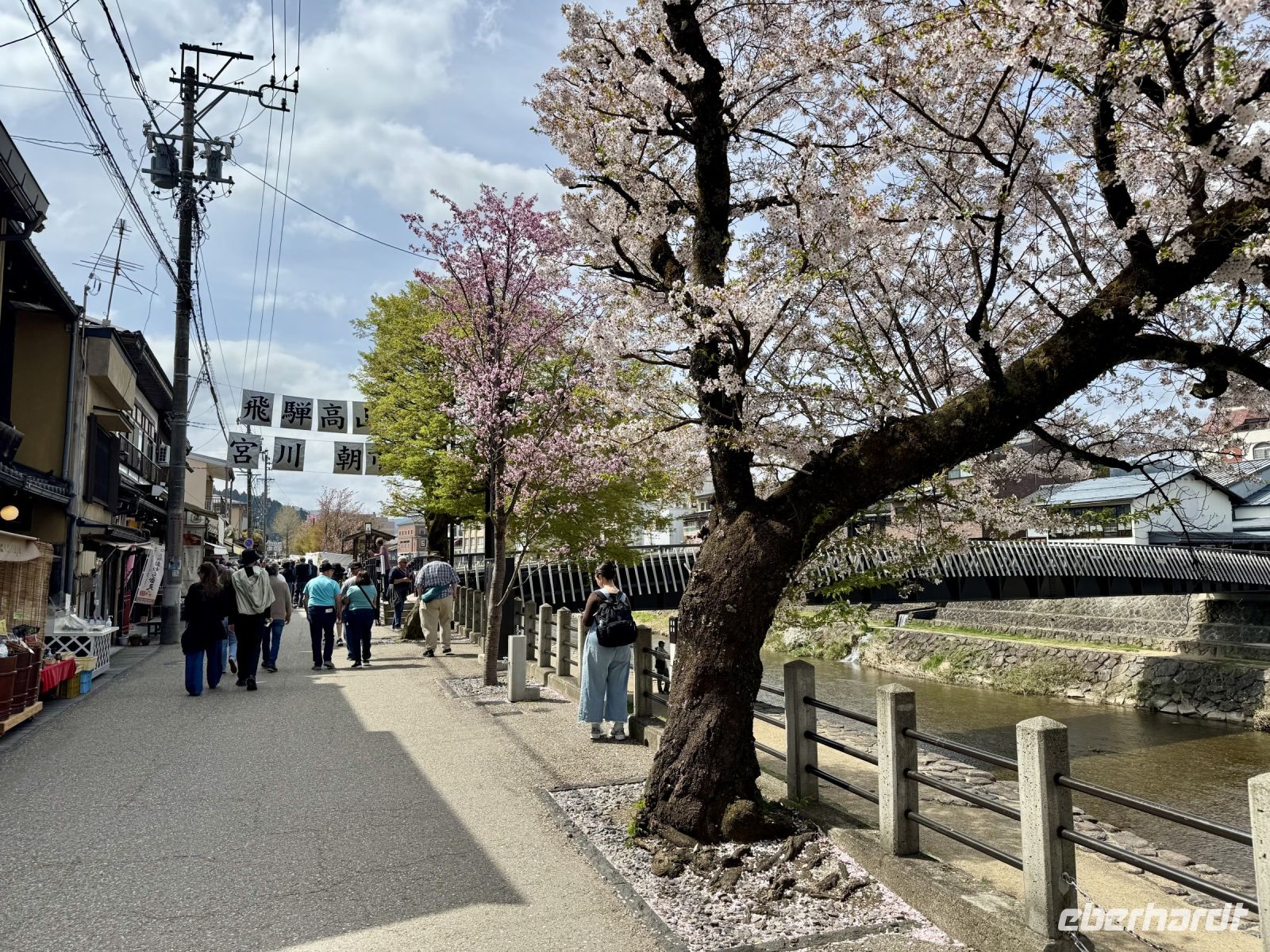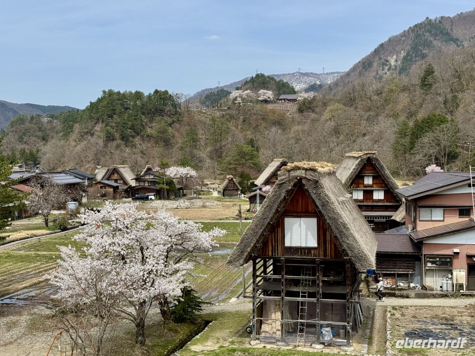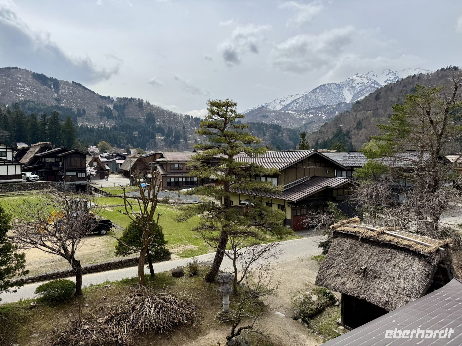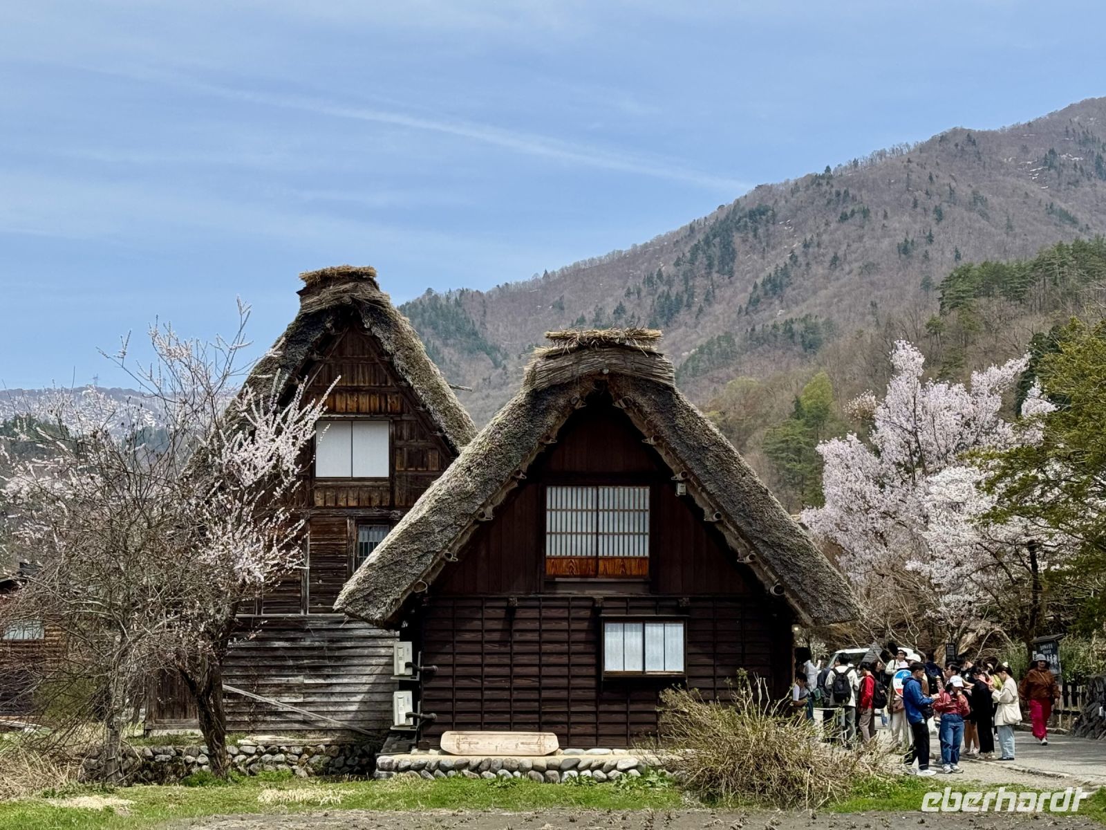 In mehrfacher Hinsicht wollen wir heute in die Vergangenheit Japans reisen, vor allem in die Edo-Zeit. Wir beginnen jedoch mit einem kleinen Spaziergang zum Morgenmarkt am Fluss. Unterwegs gibt es bereits viel zu entdecken: versteckte kleine Schreine, hübsche alte Häuser aus Holz, ein niedliches kleines Auto, Dekoration in den Schaufenstern. In Takayama ist die Kirschblüte noch in vollem Gange. Vor allem am Fluss sehen wir viele prächtige Bäume. Auf dem Morgenmarkt wird Obst und Gemüse feilgeboten, aber auch Andenken aus Holz und allerlei süße Sachen. Und überall hängen die kleinen roten Puppen, die Affenbabys darstellen sollen. Ouashi-san hat derweil umgeparkt und erwartet uns auf dem großen Busparkplatz. Von dort aus fahren wir durch die Berge ins Museumsdorf Shirakawago. Auch hier stoßen wir auf viele blühende Kirschbäume, die vor den schilfgedeckten Bauernhäusern und schneebedeckten Gipfeln der Japanischen Alpen tolle Fotomotive abgeben. Nach einem weiteren kleinen Spaziergang mit Hartmut besichtigen wir ein traditionelles Bauernhaus mit Ahnenschrein, Feuerstelle und riesigem Dachboden. Nach unserer Rückkehr nach Takayama müssen wir uns am Hotel nun leider von Ouashi-san verabschieden. Ein „Sayonara“ ist für diesen tollen und herzlichen Fahrer mehr als angebracht, der die Messlatte sehr hoch gesetzt hat. Er muss nun weiter nach Osaka fahren und dort die nächste Gruppe in Empfang nehmen. Aufgrund der Expo haben Reiseleiter und Busfahrer gerade generell richtig viel zu tun. Das Jinya-Museum schließt am Nachmittag den Kreis zu unserem Tagesausflug nach Nikko am vierten Tag. Es war ein regionales Verwaltungsgebäude des Tokugawa-Shogunats und lässt die Zeit der Samurai-Herrschaft u. a. mit Großraumbüros, Küche mit Reistöpfen, kleiner Teestube und einer Sänfte für die edlen Herren vor unseren Augen auferstehen. Ein Bummel durch das umgebende Viertel von Takayama mit vielen Gebäuden aus ebenjener Epoche, also der Edo-Zeit, rundet diesen tollen Programmpunkt ab. Hartmut hat heute die Spendierhosen an und lädt uns spontan zu einer Sake-Verkostung ein. Nur ein paar Häuser weiter können wir von einer wirklich köstlichen Miso-Brühe probieren. Das weckt die Vorfreude auf unser Abendessen mit regional typischem Hida-Rindfleisch in einem Grillrestaurant. Auch hier dürfen/müssen wir selbst Hand anlegen, denn das Grillgut kommt roh auf den Tisch – und zwar in riesigen Mengen. Fast genug für ein Dorffest.