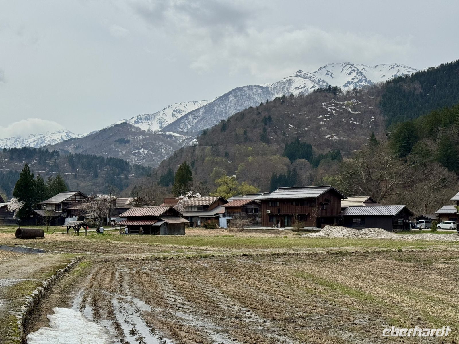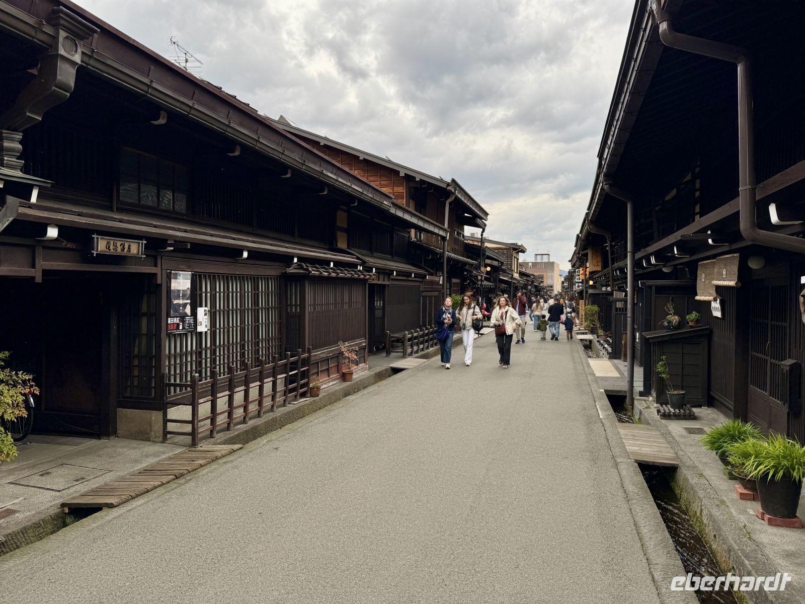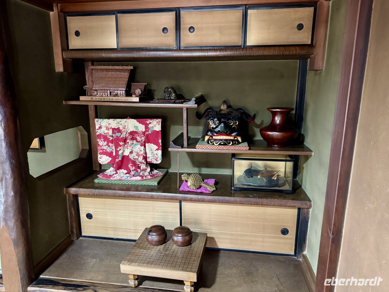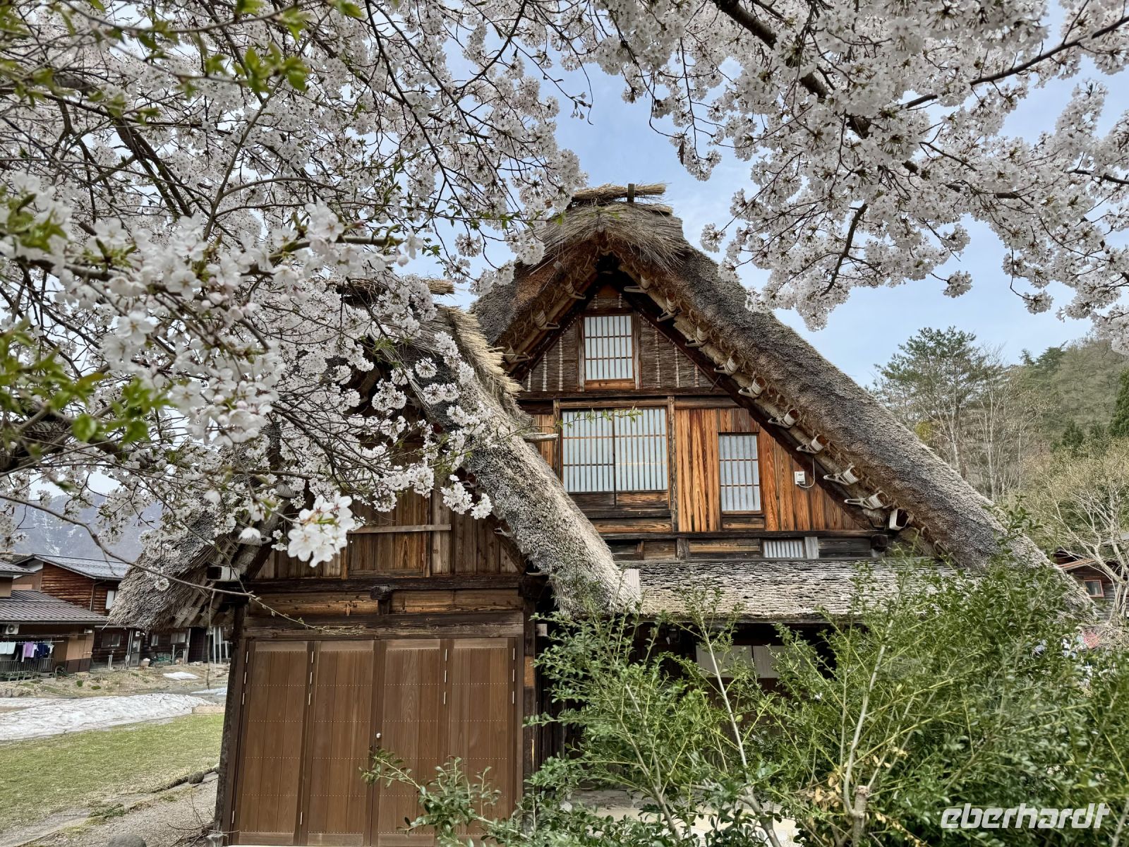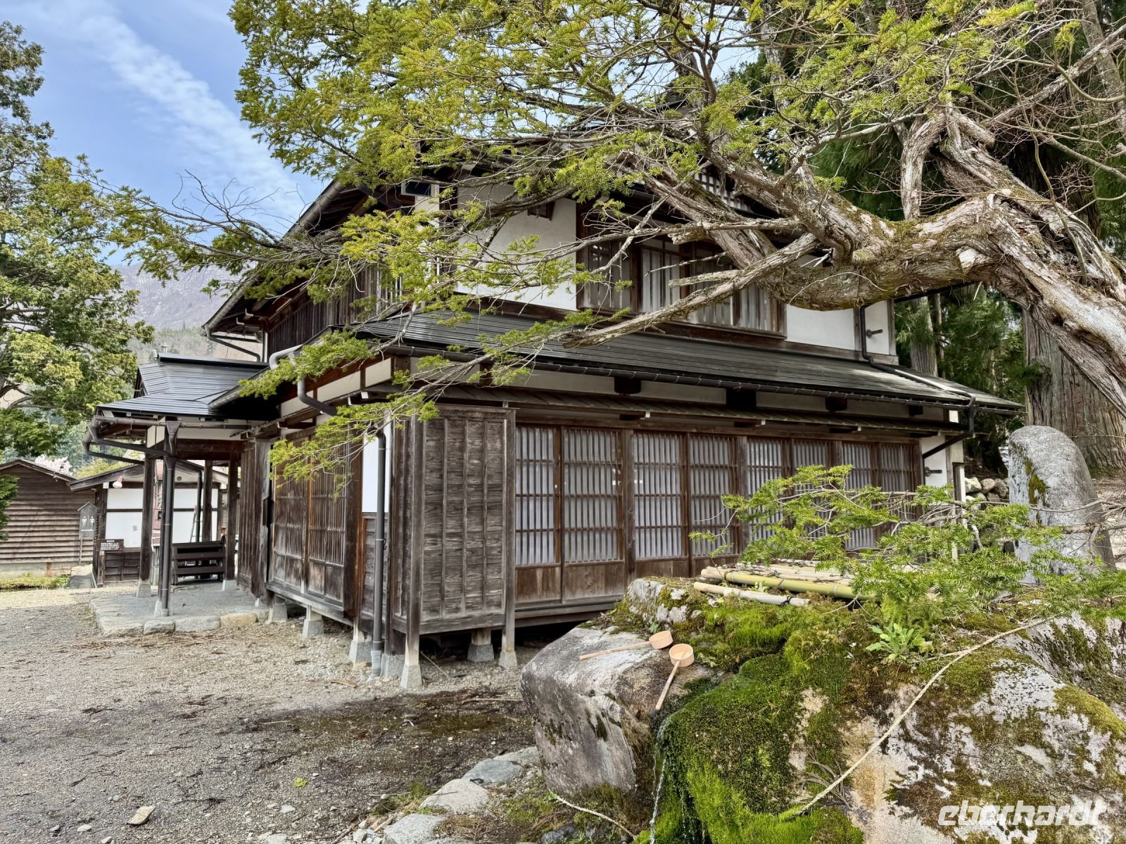 In mehrfacher Hinsicht wollen wir heute in die Vergangenheit Japans reisen, vor allem in die Edo-Zeit. Wir beginnen jedoch mit einem kleinen Spaziergang zum Morgenmarkt am Fluss. Unterwegs gibt es bereits viel zu entdecken: versteckte kleine Schreine, hübsche alte Häuser aus Holz, ein niedliches kleines Auto, Dekoration in den Schaufenstern. In Takayama ist die Kirschblüte noch in vollem Gange. Vor allem am Fluss sehen wir viele prächtige Bäume. Auf dem Morgenmarkt wird Obst und Gemüse feilgeboten, aber auch Andenken aus Holz und allerlei süße Sachen. Und überall hängen die kleinen roten Puppen, die Affenbabys darstellen sollen. Ouashi-san hat derweil umgeparkt und erwartet uns auf dem großen Busparkplatz. Von dort aus fahren wir durch die Berge ins Museumsdorf Shirakawago. Auch hier stoßen wir auf viele blühende Kirschbäume, die vor den schilfgedeckten Bauernhäusern und schneebedeckten Gipfeln der Japanischen Alpen tolle Fotomotive abgeben. Nach einem weiteren kleinen Spaziergang mit Hartmut besichtigen wir ein traditionelles Bauernhaus mit Ahnenschrein, Feuerstelle und riesigem Dachboden. Nach unserer Rückkehr nach Takayama müssen wir uns am Hotel nun leider von Ouashi-san verabschieden. Ein „Sayonara“ ist für diesen tollen und herzlichen Fahrer mehr als angebracht, der die Messlatte sehr hoch gesetzt hat. Er muss nun weiter nach Osaka fahren und dort die nächste Gruppe in Empfang nehmen. Aufgrund der Expo haben Reiseleiter und Busfahrer gerade generell richtig viel zu tun. Das Jinya-Museum schließt am Nachmittag den Kreis zu unserem Tagesausflug nach Nikko am vierten Tag. Es war ein regionales Verwaltungsgebäude des Tokugawa-Shogunats und lässt die Zeit der Samurai-Herrschaft u. a. mit Großraumbüros, Küche mit Reistöpfen, kleiner Teestube und einer Sänfte für die edlen Herren vor unseren Augen auferstehen. Ein Bummel durch das umgebende Viertel von Takayama mit vielen Gebäuden aus ebenjener Epoche, also der Edo-Zeit, rundet diesen tollen Programmpunkt ab. Hartmut hat heute die Spendierhosen an und lädt uns spontan zu einer Sake-Verkostung ein. Nur ein paar Häuser weiter können wir von einer wirklich köstlichen Miso-Brühe probieren. Das weckt die Vorfreude auf unser Abendessen mit regional typischem Hida-Rindfleisch in einem Grillrestaurant. Auch hier dürfen/müssen wir selbst Hand anlegen, denn das Grillgut kommt roh auf den Tisch – und zwar in riesigen Mengen. Fast genug für ein Dorffest.