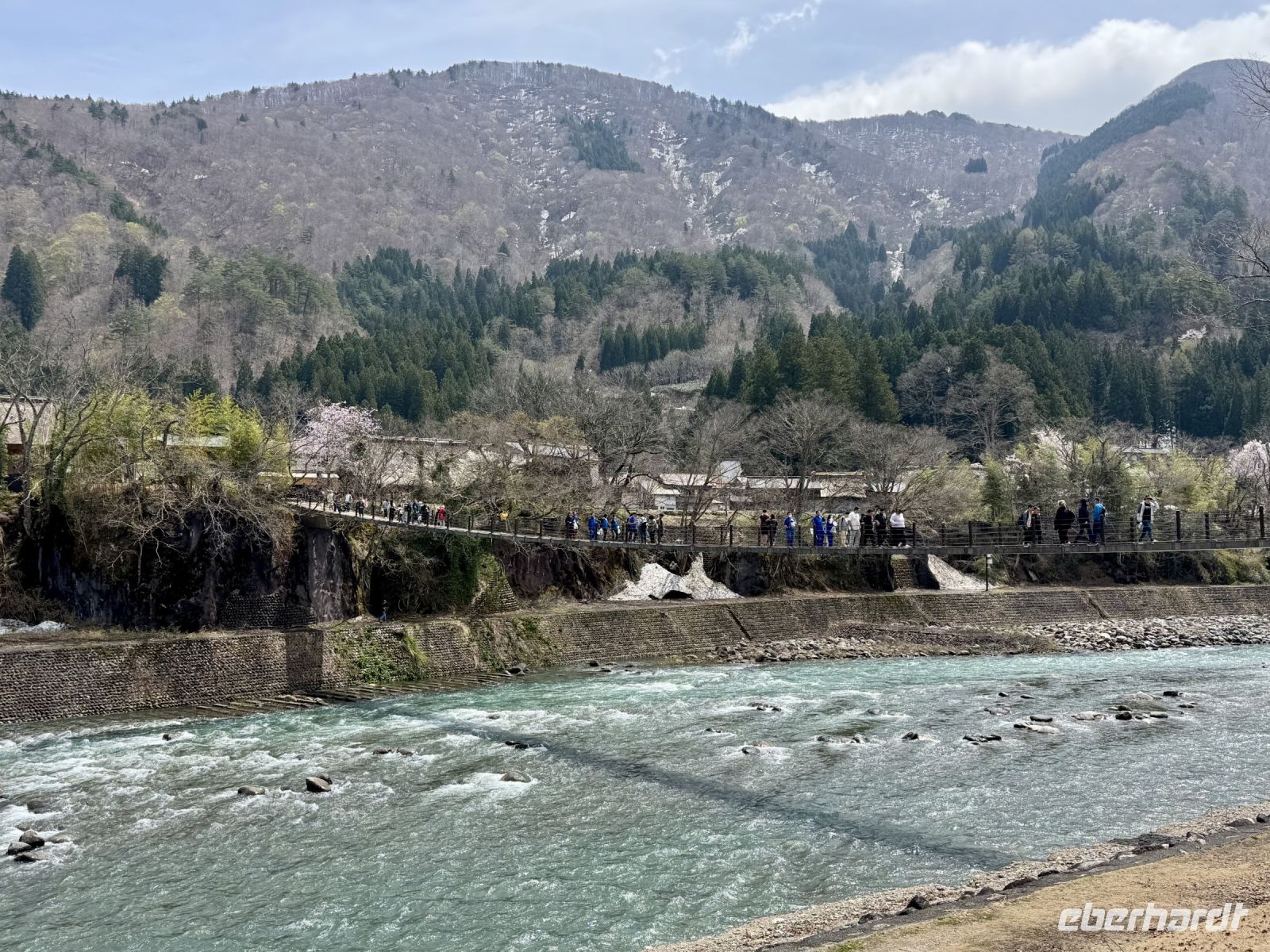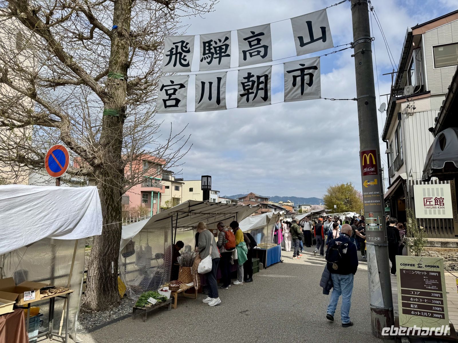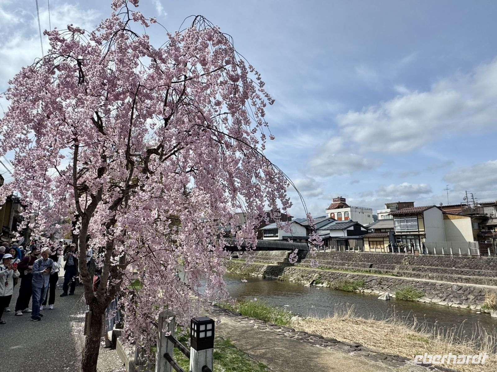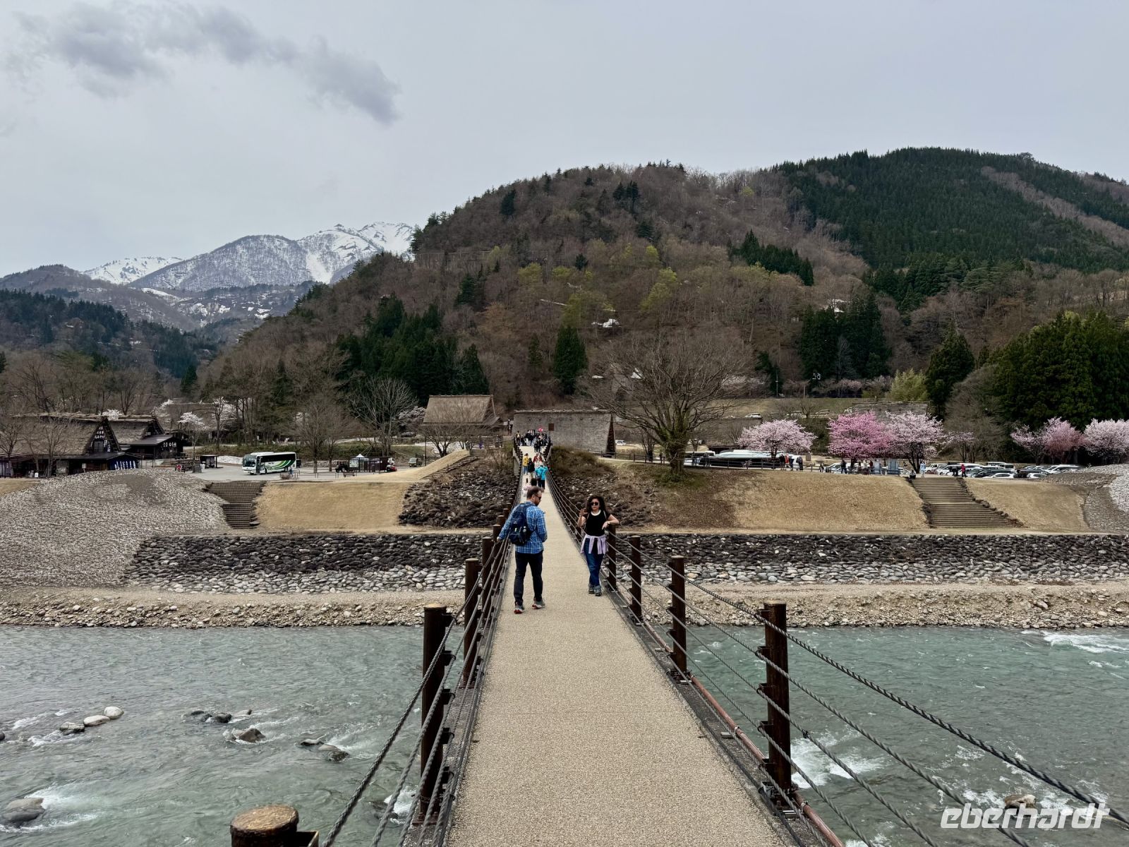 In mehrfacher Hinsicht wollen wir heute in die Vergangenheit Japans reisen, vor allem in die Edo-Zeit. Wir beginnen jedoch mit einem kleinen Spaziergang zum Morgenmarkt am Fluss. Unterwegs gibt es bereits viel zu entdecken: versteckte kleine Schreine, hübsche alte Häuser aus Holz, ein niedliches kleines Auto, Dekoration in den Schaufenstern. In Takayama ist die Kirschblüte noch in vollem Gange. Vor allem am Fluss sehen wir viele prächtige Bäume. Auf dem Morgenmarkt wird Obst und Gemüse feilgeboten, aber auch Andenken aus Holz und allerlei süße Sachen. Und überall hängen die kleinen roten Puppen, die Affenbabys darstellen sollen. Ouashi-san hat derweil umgeparkt und erwartet uns auf dem großen Busparkplatz. Von dort aus fahren wir durch die Berge ins Museumsdorf Shirakawago. Auch hier stoßen wir auf viele blühende Kirschbäume, die vor den schilfgedeckten Bauernhäusern und schneebedeckten Gipfeln der Japanischen Alpen tolle Fotomotive abgeben. Nach einem weiteren kleinen Spaziergang mit Hartmut besichtigen wir ein traditionelles Bauernhaus mit Ahnenschrein, Feuerstelle und riesigem Dachboden. Nach unserer Rückkehr nach Takayama müssen wir uns am Hotel nun leider von Ouashi-san verabschieden. Ein „Sayonara“ ist für diesen tollen und herzlichen Fahrer mehr als angebracht, der die Messlatte sehr hoch gesetzt hat. Er muss nun weiter nach Osaka fahren und dort die nächste Gruppe in Empfang nehmen. Aufgrund der Expo haben Reiseleiter und Busfahrer gerade generell richtig viel zu tun. Das Jinya-Museum schließt am Nachmittag den Kreis zu unserem Tagesausflug nach Nikko am vierten Tag. Es war ein regionales Verwaltungsgebäude des Tokugawa-Shogunats und lässt die Zeit der Samurai-Herrschaft u. a. mit Großraumbüros, Küche mit Reistöpfen, kleiner Teestube und einer Sänfte für die edlen Herren vor unseren Augen auferstehen. Ein Bummel durch das umgebende Viertel von Takayama mit vielen Gebäuden aus ebenjener Epoche, also der Edo-Zeit, rundet diesen tollen Programmpunkt ab. Hartmut hat heute die Spendierhosen an und lädt uns spontan zu einer Sake-Verkostung ein. Nur ein paar Häuser weiter können wir von einer wirklich köstlichen Miso-Brühe probieren. Das weckt die Vorfreude auf unser Abendessen mit regional typischem Hida-Rindfleisch in einem Grillrestaurant. Auch hier dürfen/müssen wir selbst Hand anlegen, denn das Grillgut kommt roh auf den Tisch – und zwar in riesigen Mengen. Fast genug für ein Dorffest.