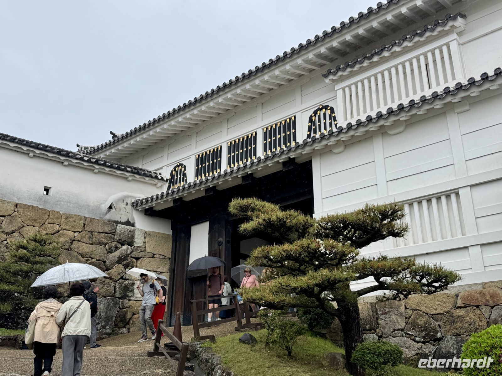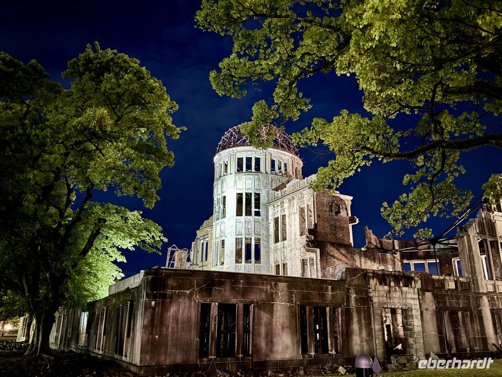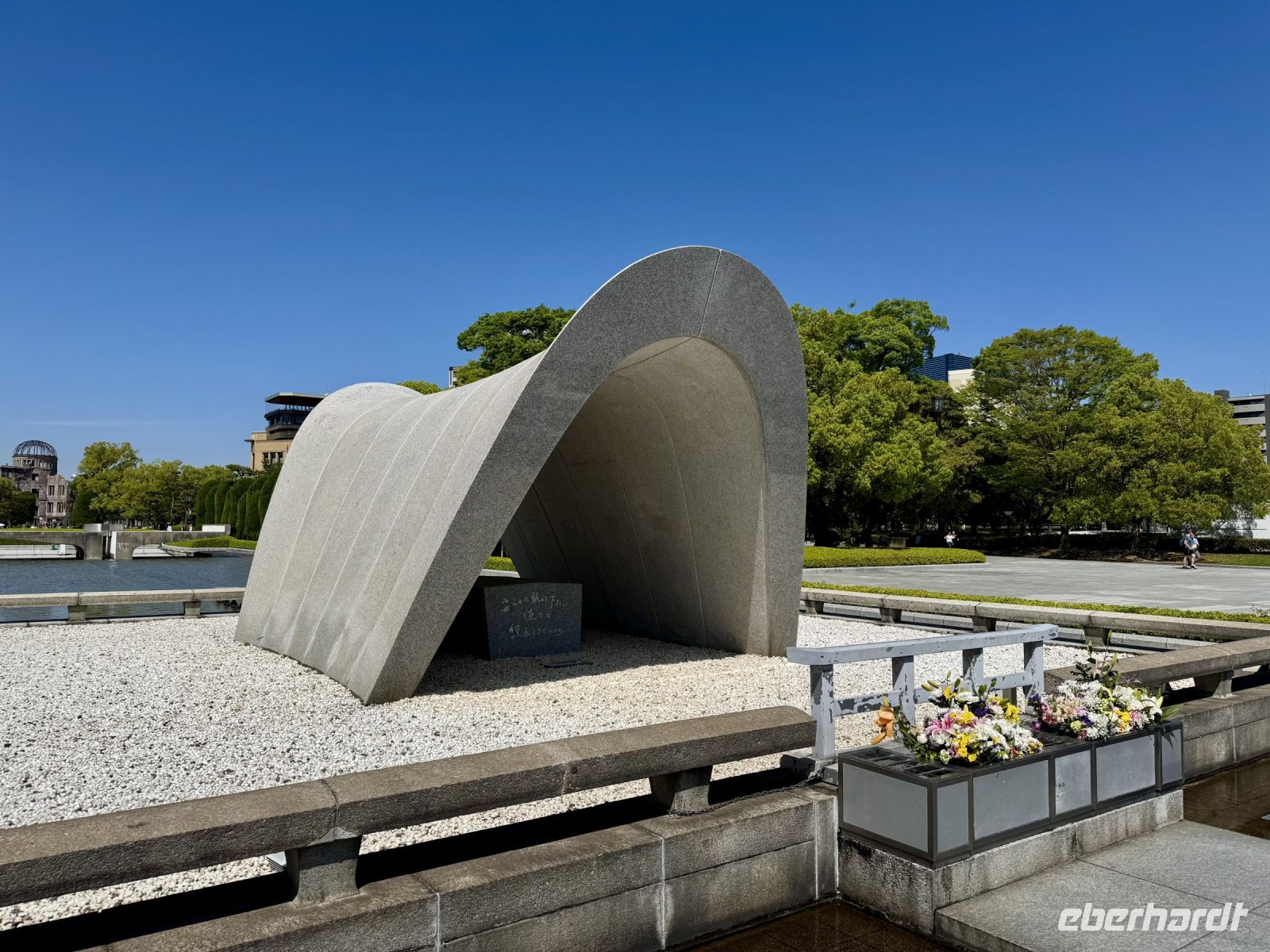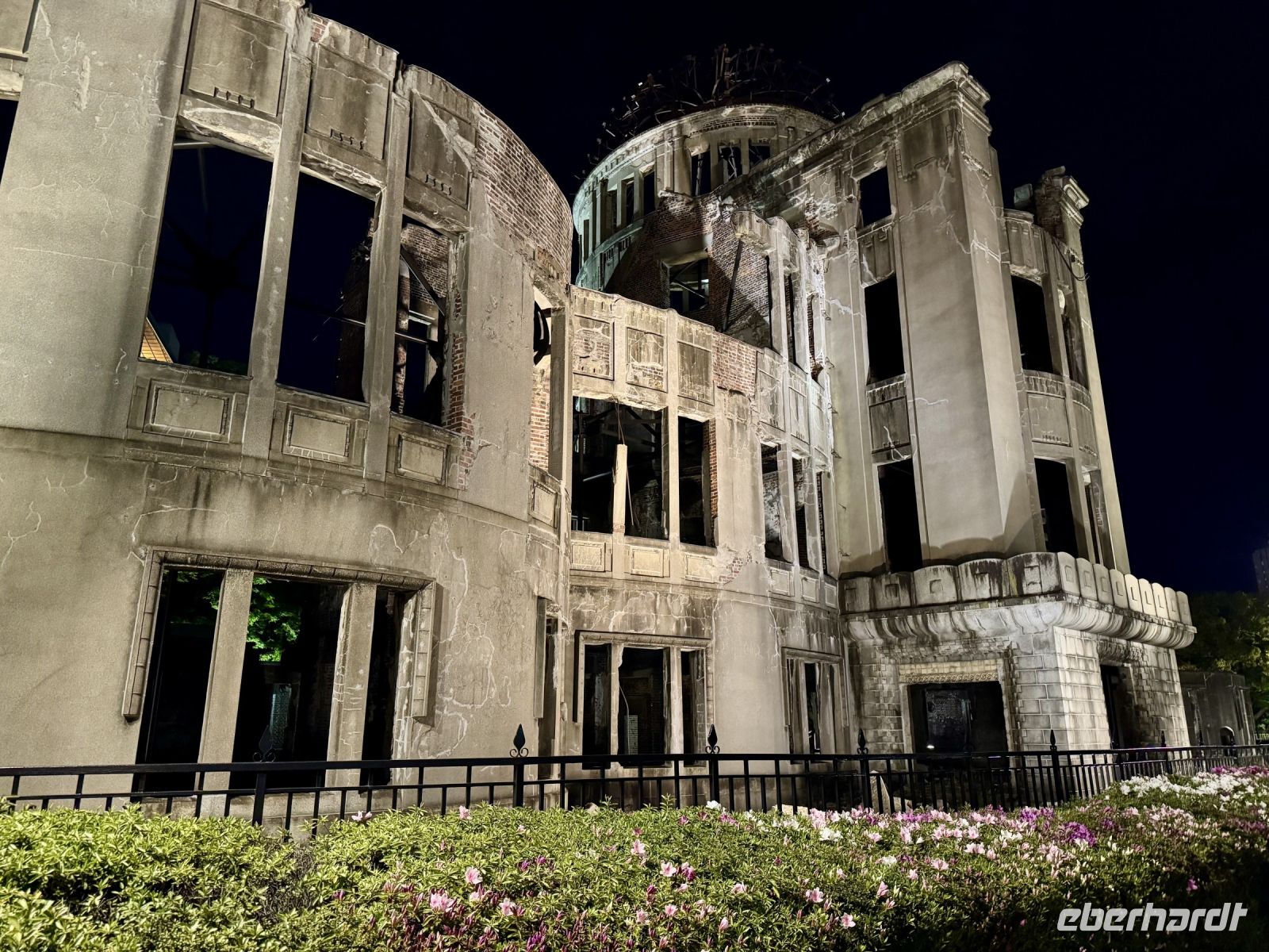 Wir verabschieden uns von unseren Koffern, die immer noch in der Lobby stehen, immerhin bereits fein säuberlich vermessen und etikettiert. Im leichten Regen laufen wir nur mit Handgepäck die kurze Strecke zum Bahnhof und besteigen den Regionalzug nach Nagoya. Diese Zugfahrt erweist sich trotz Regen als landschaftlich reizvoll, denn die Strecke führt durch viele grüne Täler und kleine Dörfer. Im berühmten Shinkansen des Typs N700S herrscht dagegen eher nüchterne Flugzeugatmosphäre: eine Dreierreihe auf der einen Seite, eine Zweierreihe auf der anderen und nur kleine Fenster. Bei fast 300 Kilometern pro Stunde rauscht die Welt im Eiltempo vorbei. Ich will mich angesichts der starken Beschleunigung reflexartig anschnallen und warte nur auf den Augenblick des Abhebens. Der bleibt zum Glück aber aus. In Himeji machen wir einen Zwischenstopp, verstauen unser Handgepäck im Schließfach und marschieren im Nieselregen zur ikonischen Burg des weißen Reihers. Im leichten Regen wirkt sie wie eine geheimnisvolle und uneinnehmbare Festung aus einem Fantasy-Roman. Oder wie Hartmut es ausdrückt: „Bei schönem Wetter kann ja jeder gute Fotos machen.“ Die Herausforderung steht also. Wer mit mir das Innere der Burg besichtigen will, steht gleich vor der nächsten Herausforderung: vielen Treppen mit steilen Stufen. Die beiden Tüten mit Schirm bzw. Schuhen sind auch nicht gerade hilfreich. Aber es lohnt sich, denn so eine alte Samurai-Burg aus Holz hat ihren ganz eigenen Charme und ist mit einer europäischen Ritterburg nicht zu vergleichen. Von Himeji nach Hiroshima braucht der Shinkansen dann ziemlich genau eine Stunde. Und natürlich ist er pünktlich, wir sind ja schließlich in Japan. Unser Hotel in Hiroshima erreichen wir per Taxi und können uns noch ein bisschen ausruhen, bevor wir für unseren Pizza-Abend zum Bahnhof zurückfahren. Wobei eine japanische Okonomiyaki nicht mit unserer Vorstellung von Pizza zu vergleichen ist. Sie wird vor unseren Augen aus Kraut, Teig, Nudeln und Ei sowie einigen Geheimzutaten frisch zubereitet und erweist sich als sehr lecker. Zur Abwechslung fahren wir mit der Straßenbahn zurück in Richtung unserer Unterkunft und machen noch einen kurzen nächtlichen Spaziergang durch den Friedenspark am Fluss. Beim Anblick des beleuchteten Atombomben-Doms wird mir jedoch schlagartig ganz anders. Bis jetzt hatte ich dieses dunkle Kapitel der Menschheitsgeschichte noch ganz gut verdrängen können, doch plötzlich tauchen die Bilder aus Filmen und Dokumentationen vor meinem geistigen Auge wieder auf. (Ein ähnlich starkes Schwindelgefühl hatte ich verspürt, als ich im Smithsonian Museum in Washington vor einer Interkontinentalrakete mit 8–10 atomaren Sprengköpfen mit jeweils einem Vielfachen der Sprengkraft der Hiroshima-Bombe stand.) Ein schnelles Schokoladeneis auf die Faust vertreibt zum Glück die trübseligen Gedanken vorerst wieder – morgen werden wir uns diesem Thema noch ausführlicher widmen.