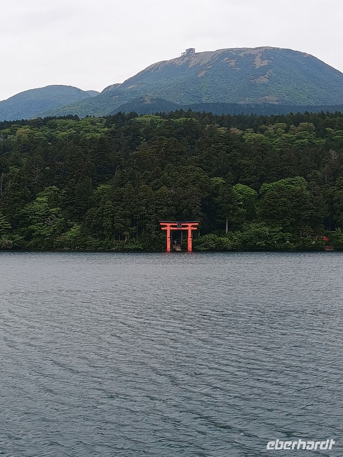 Nach unserem gemeinsamen Frühstück checken wir aus unserem schönen Hotel aus und fahren mit dem Bus zur Seilbahnstation, die uns zum Owakudani-Tal bringen soll. Owakudani Tal liegt auf 1044 m und der letzte Ausbruch war vor 3000 Jahren, viele fahren heute hoch, um die Aussicht auf den Fuji zu genießen. Auch wir haben Glück und können bereits während der Seilbahnfahrt einige Blicke auf den noch verdeckten Fuji werfen. Oben können wir die Schwefelquellen begutachten, und für einen kurzen Moment ist der Fuji tatsächlich komplett sichtbar. Berühmt sind hier vor allem die schwarzen Eier, die in dem vulkanisch heißen Schwefelwasser gekocht werden. Ein Mythos besagt, dass wer ein schwarzes Ei isst sein Leben um 7 Jahre verlängert. Also holen natürlich auch wir uns jeder solch ein Ei.