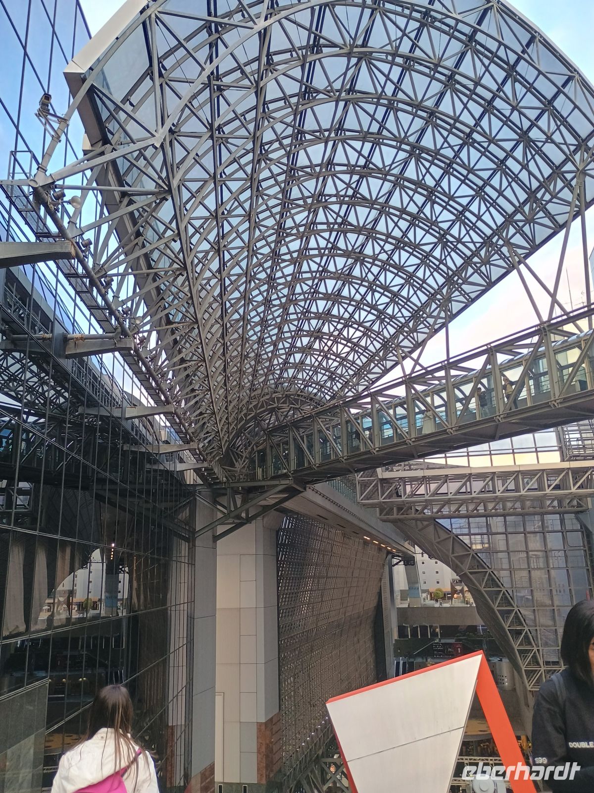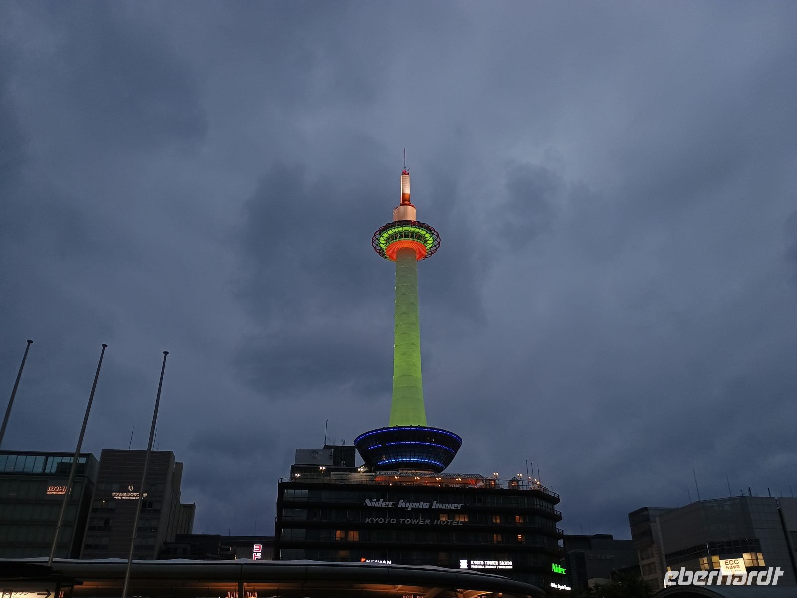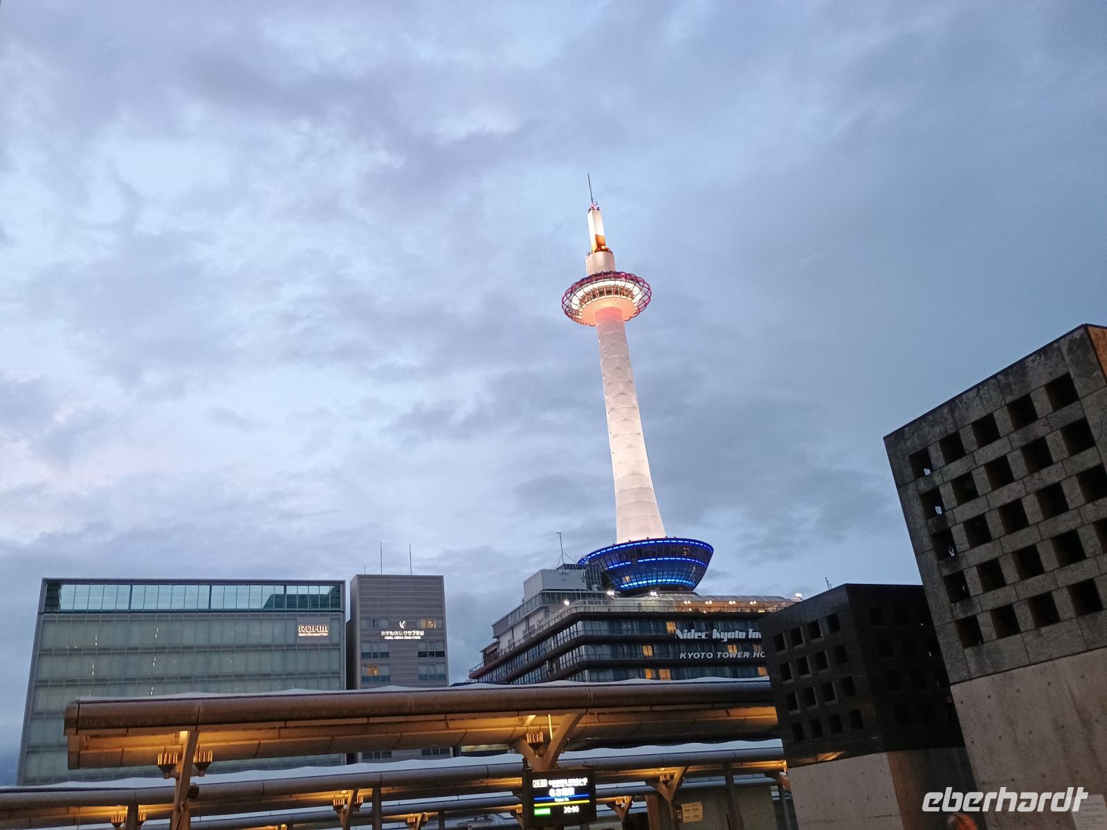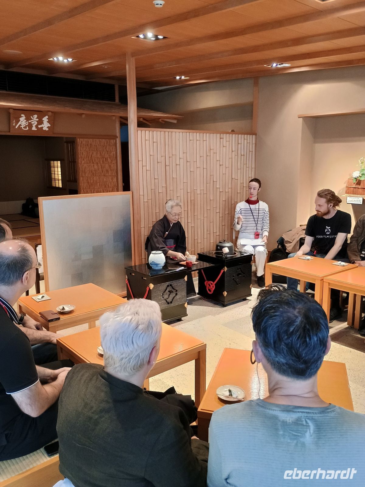 Weiter geht es zum Heian Schrein, ein farbenfroher Shinto-Schrein, der anlässlich der 1100-Jahr-Feier Kyotos im Jahr 1895 erbaut wurde. Auch dieser Schrein ist wieder umgeben von einer weitläufigen Gartenanlage mit Teichen und Brücken. Bei dem Spaziergang durch den Garten sehen wir sogar noch eine Hochzeitsgesellschaft, welche in schönen Kimonos gekleidet ist. Vor der Anlage gibt es passend zum Samstag einen kleinen Trödelmarkt. Mit dem Bus fahren wir zurück zum Hotel und genießen unsere Mittagspause. Viele packen schon einmal ihre Koffer oder nutzen die Zeit für einen kurzen Mittagsschlaf. Zum späten Nachmittag geht es für uns zu einer traditionellen Teezeremonie, hier wird für jeden von uns ein Matcha-Tee vorbereitet zum Probieren. Da Matcha allerdings etwas bitter schmeckt, bekommen wir zuerst eine kleine Süßigkeit zu essen. Danach entscheiden wir uns, unsere Zeit bis zum Abendessen am Bahnhof Kyoto zu verbringen, dieser ist nämlich ein architektonisches Meisterwerk. Neben beleuchtenden Treppen gibt es hier auch einen Skywalk, von dem wir einen Blick auf die Stadt und den Kyoto Tower haben.