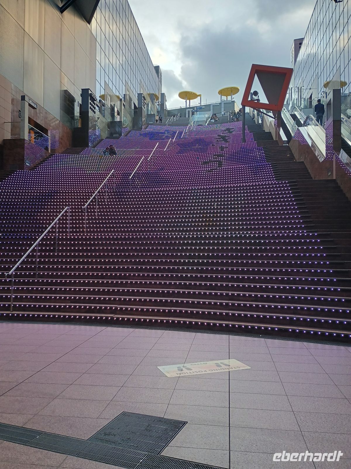 Unser nächstes Highlight, das TeamLab steht unter dem Motto, Kunst am eigenen Körper zu erfahren. Die Kunstwerke bewegen sich und ziehen durch alle Räume. Jeder geht individuell in seinem Tempo durch die Ausstellung. Danach geht es weiter in den Stadtteil Asakusa, dort findet man den ältesten Tempel, den Sensjo-ji. Der Tempel zählt zu den wichtigsten Sehenswürdigkeiten in Tokio und ist komplett widersprüchlich zu dem Meji-Schrein den wir am Morgen besucht haben. Bevor es jedoch hineingeht, laufen wir noch zum Sumida Fluss, wo wir einen schönen Blick auf den gestrigen besuchten Skytree erhalten. Der Tempel wurde bereits im Jahr 645 gegründet und ist damit der älteste Tempel Tokios. Zu dieser Zeit war Tokio noch ein Fischerdorf. Laut der Legende entdeckten zwei Fischerbrüder im Jahr 628 im Sumida-Fluss eine kleine Statue der Göttin Kannon. Ein wohlhabender Mann erkannte die Bedeutung der Figur, bekehrte sich zum Buddhismus und verwandelte sein Haus in einen Tempel – daraus entstand der Senso-ji. Der Tempel ist schon einmal abgebrannt, wurde bei einem Erdbeben und im Zweiten Weltkrieg zerstört. 1852 wurde der Tempel neu aufgebaut, und zwar diesmal mit Stahlbeton. Am Abend geht es für uns mit der Metro von unserem Hotel zur berühmten Shibuya-Kreuzung. Schon im Bahnhof haben wir einen Blick auf die Kreuzung von oben und begutachten das Treiben. Hier gibt es gut 10 Zebrareifen, die sich sternförmig kreuzen und Fußgänger aus allen Richtungen die Kreuzung überqueren können. Es wird gesagt, dass gut 2500 Personen bei jedem Umlauf gleichzeitig über die Kreuzung laufen. Hier findet man auch die Hachiko-Statue, eine Statue des treuen Hundes Hachiko, der dort jahrelang auf sein Herrchen wartete, auch noch als dieser auf der Arbeit plötzlich verstorben war.