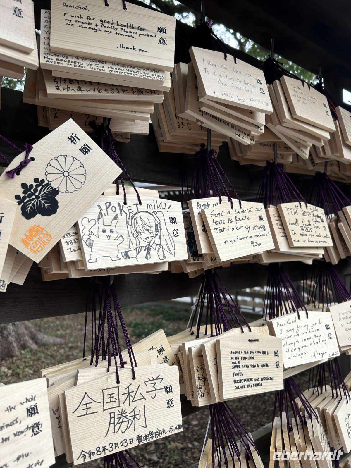 Nachdem uns der Vortag noch mit Sonnenschein verwöhnt hatte, zeigte sich Tokio heute von seiner regnerischen Seite – und das ausgiebig. Also schnappten wir uns unsere Regenschirme und machten uns auf den Weg zum Meiji-Schrein. Die Anlage, idyllisch in einem weitläufigen Waldgebiet gelegen, stammt aus der Kaiserzeit und ist bis heute eine wichtige religiöse Stätte des Shintoismus. Trotz des Regens herrschte eine besondere Atmosphäre, und wir hatten sogar das Glück, eine Zeremonie zu beobachten sowie Familien in traditioneller Kleidung zu sehen. Hier begegneten uns auch zum ersten Mal die sogenannten Omamori – kleine, kunstvoll gestaltete Glücksbringer aus Stoff. Diese gibt es wirklich für sämtliche Lebenslagen, wie Sicherheit im Verkehr, das Bestehen einer Prüfung oder den richtigen Partner zu finden.