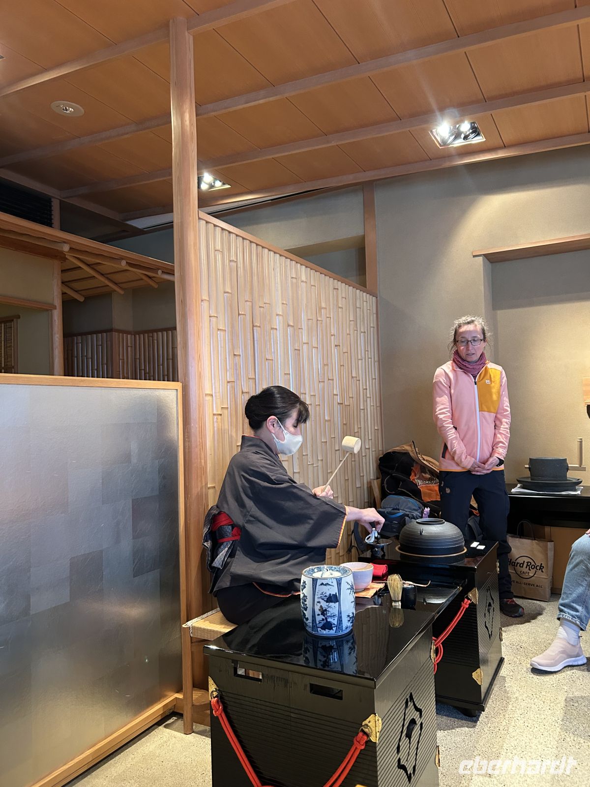 Anschließend brachte uns Danica noch zum Nishiki-Markt, wo man wunderbar Snacks und Souvenirs kaufen konnte. Hier hatten wir etwas Zeit für einen Kaffee oder einen kleinen Spaziergang am Flussufer, bei dem wir die Sakura bewundern konnten. Danach nahmen wir an einer Teezeremonie teil. Dabei lernten wir, wie Matcha traditionell zubereitet wird, wie man die Teeschale richtig hält und genossen dazu ein kleines Reisküchlein.