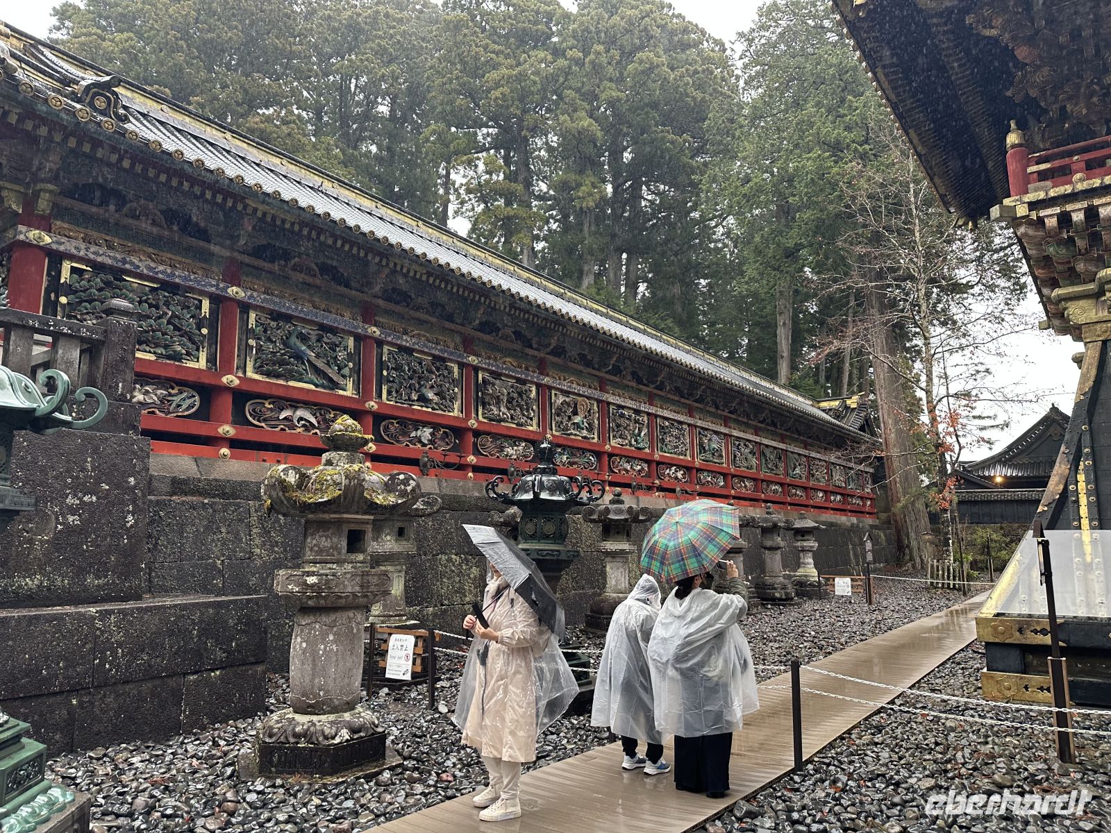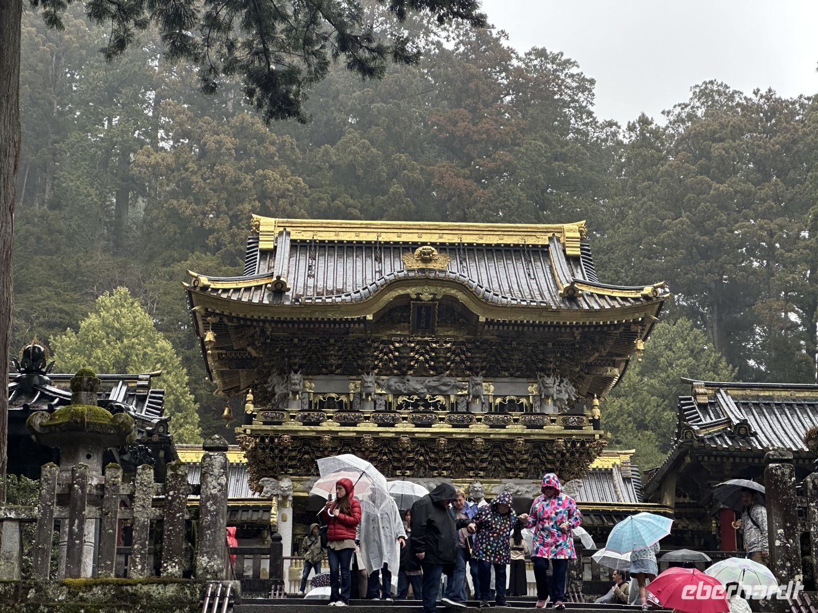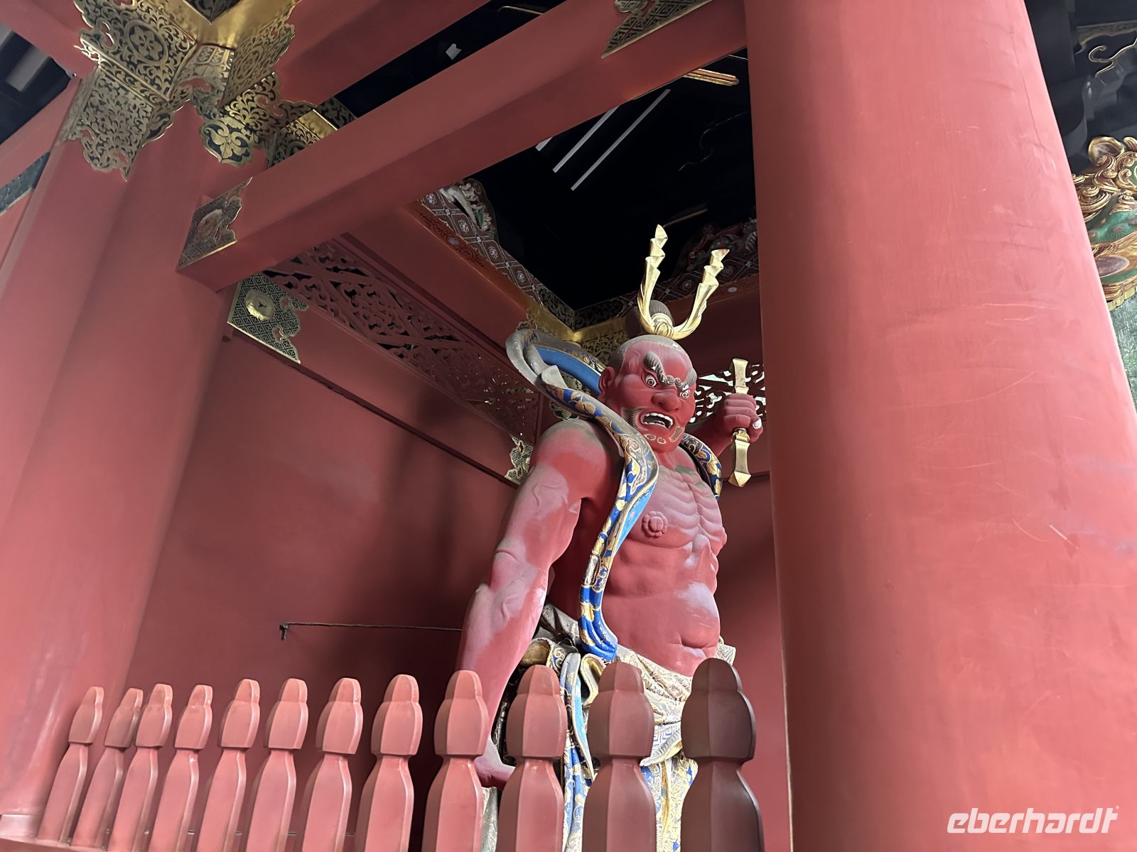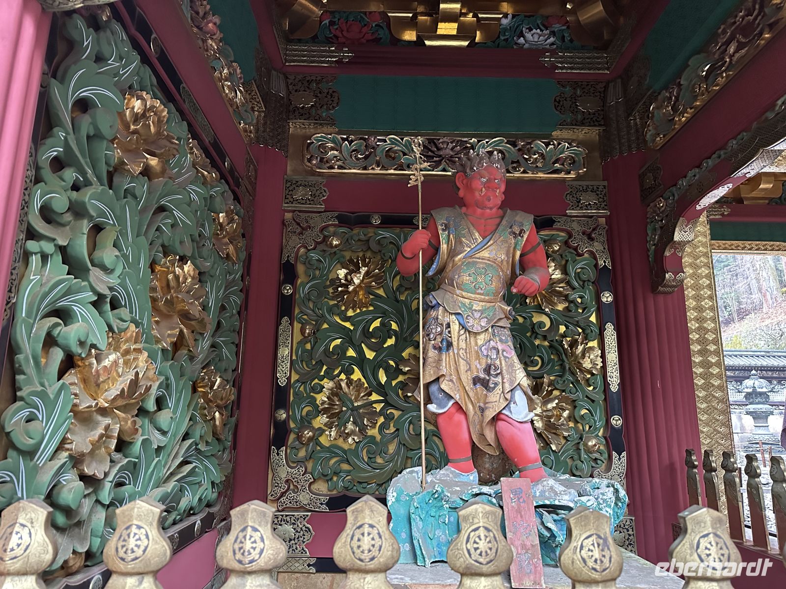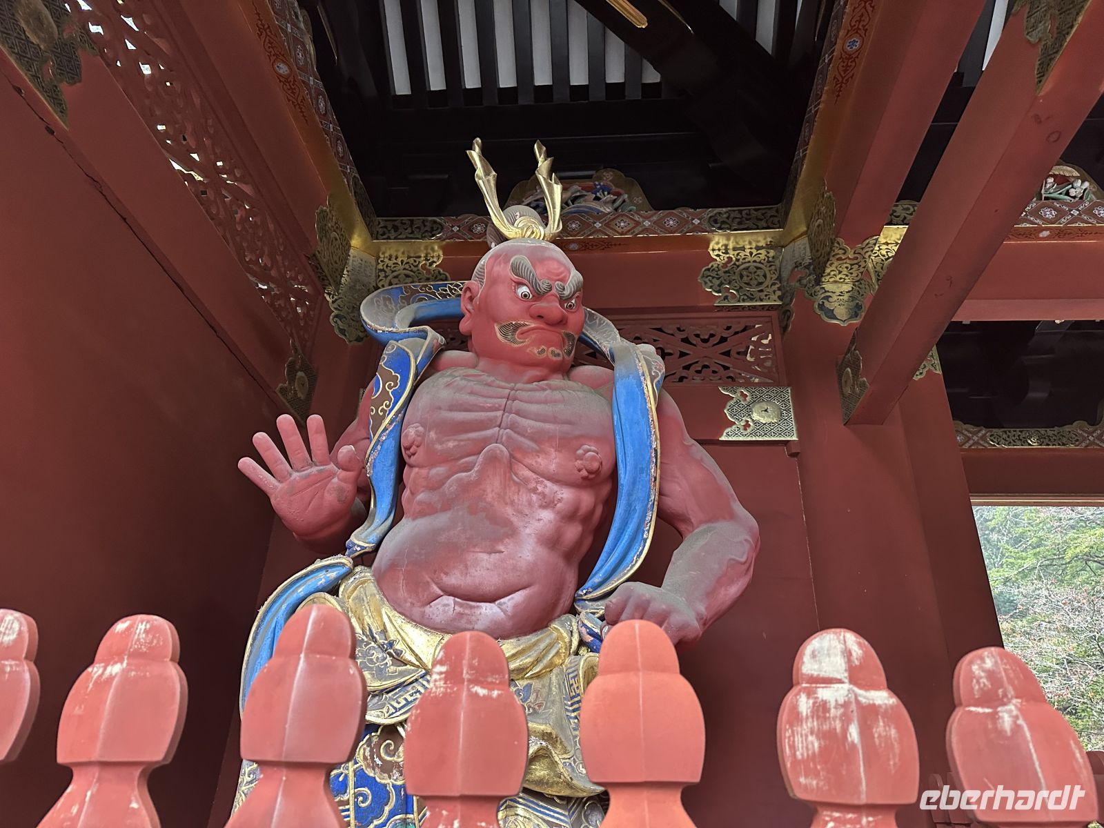 Heute führt uns unser Weg nach Nikko, das uns mit einem wolkenverhangenen Himmel und kräftigem Regen empfängt. Doch gerade das Wetter verleiht diesem Ort eine ganz eigene, fast mystische Atmosphäre. Wenn der Nebel zwischen den riesigen, uralten Zedern hängt und der Regen auf die aufwendig verzierten Dächer trommelt, wirkt die gesamte Anlage wie aus einer anderen Zeit. Am Eingang zum Toshogu Schrein fallen uns sofort die imposanten Wächterfiguren am Nio-mon Tor auf. Es sind zwei dieser gewaltigen Nio-Statuen, die jeweils in einer Nische links und rechts des Durchgangs stehen. Die Figuren sind in einem kräftigen Zinnoberrot gehalten, was im Kontrast zu dem dunklen Holz des Tores und dem grauen Regenwetter besonders leuchtend hervorsticht. Diese Wächter sind muskulöse Gestalten mit wildem Gesichtsausdruck. Einer der beiden hat den Mund geöffnet, während der andere ihn fest geschlossen hält. Das ist kein Zufall: Der offene Mund steht für den Laut Ah und der geschlossene für Un. Zusammen symbolisieren sie den Anfang und das Ende. Ihre drohende Haltung und die erhobenen Hände signalisieren jedem Besucher, dass alles Böse draußen bleiben muss. Durch die feuchte Luft und den Regen wirkten die kräftigen Farben und die glänzenden Augen der Figuren heute besonders lebendig und furchteinflößend. Nachdem wir das erste Tor mit den zwei roten Nio-Wächtern passiert haben, erreichen wir das prachtvolle Yomeimon-Tor, das auch als Tor des Sonnenuntergangs bekannt ist. Hier treffen wir auf zwei weitere beeindruckende Wächterfiguren, die in den Nischen des Tores sitzen.