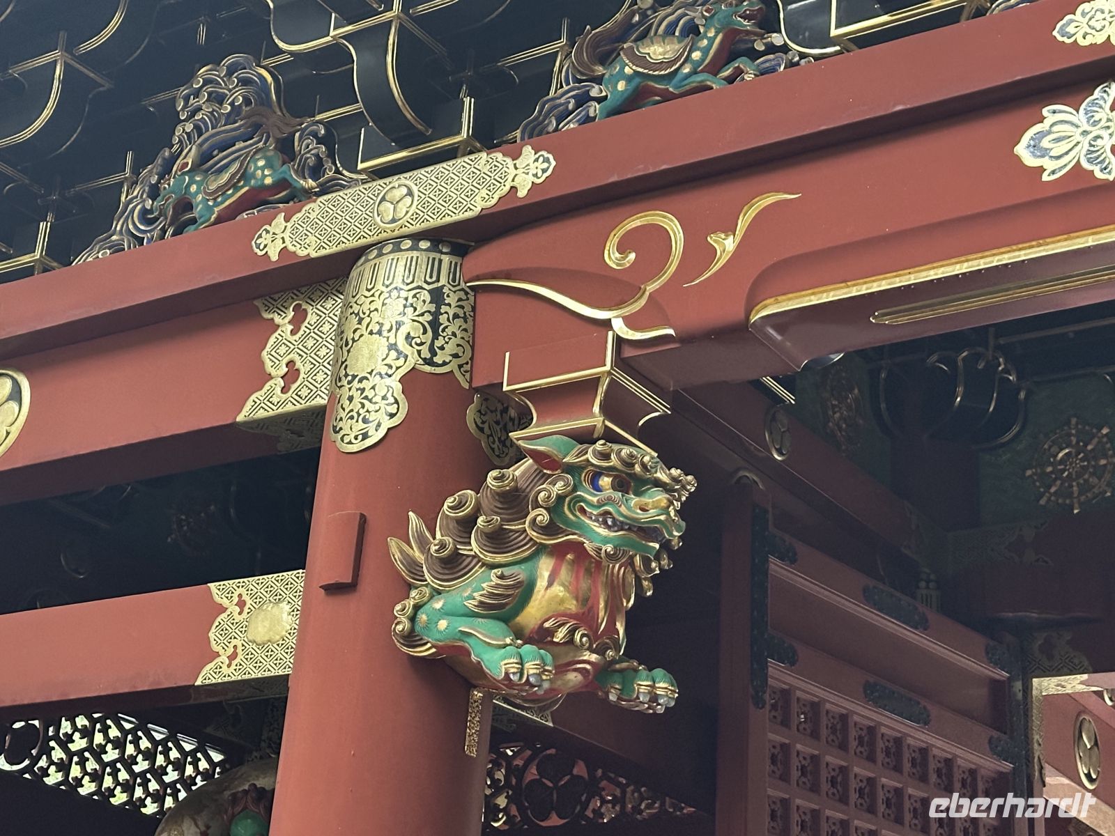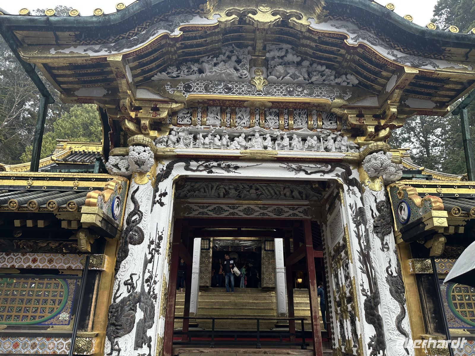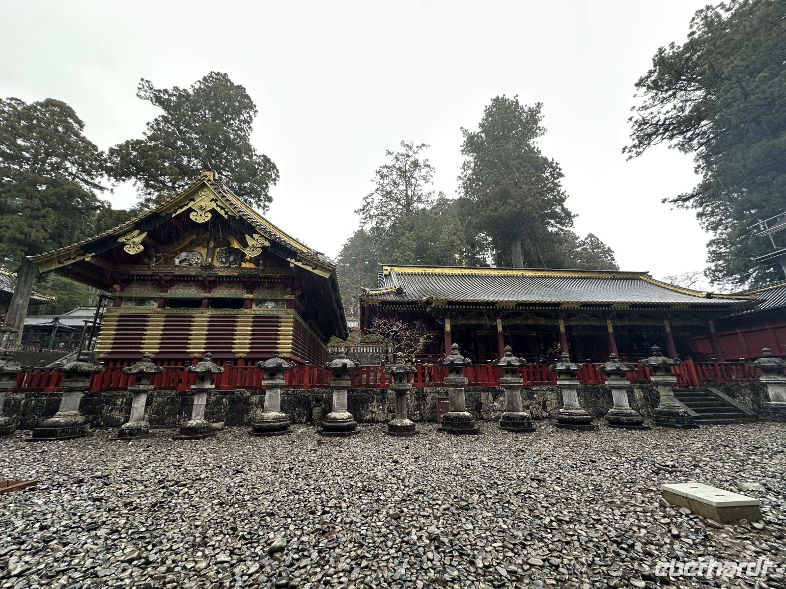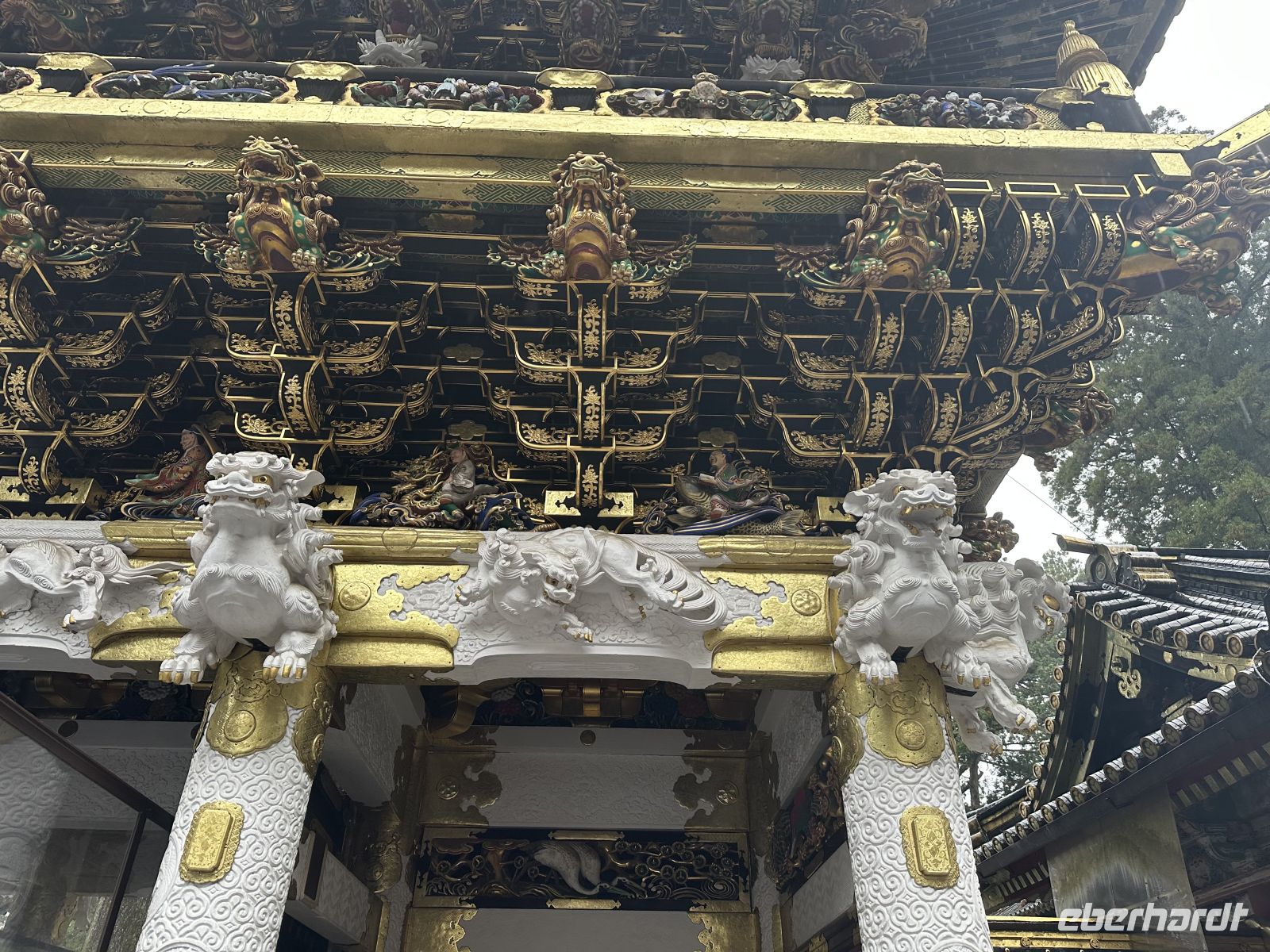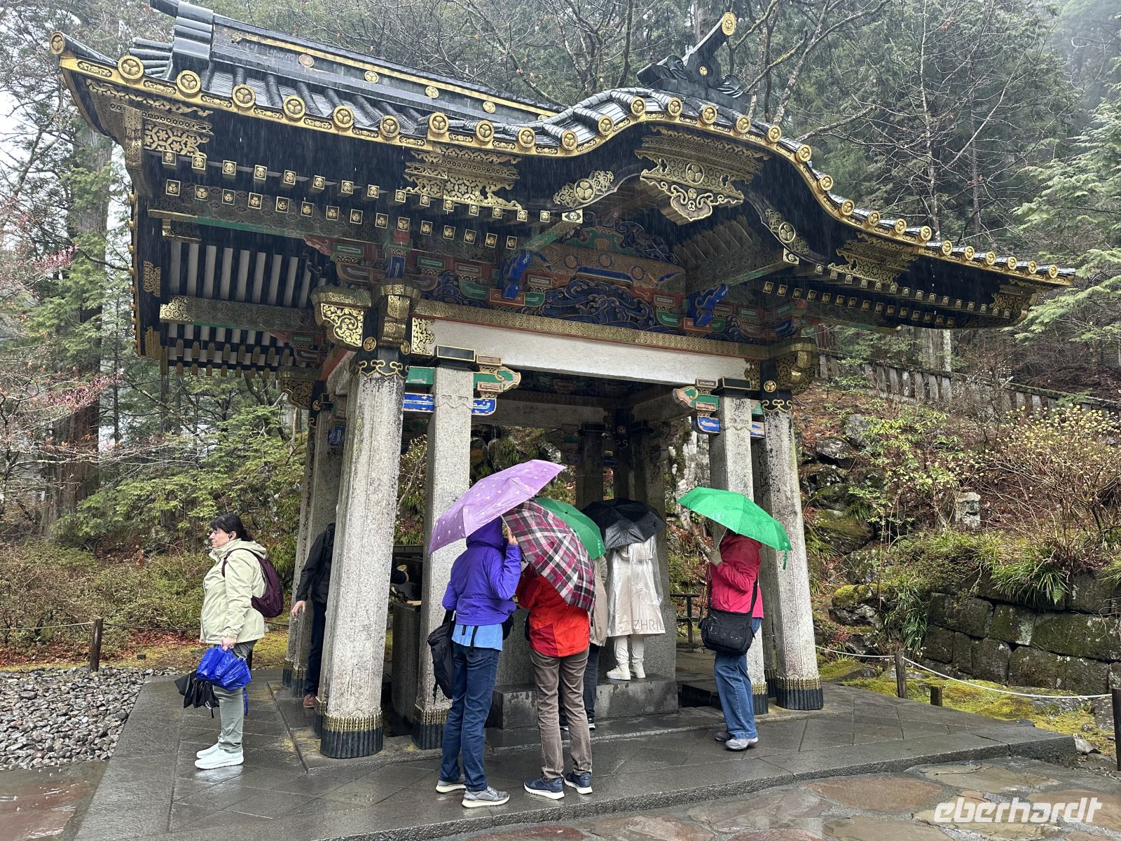 Heute führt uns unser Weg nach Nikko, das uns mit einem wolkenverhangenen Himmel und kräftigem Regen empfängt. Doch gerade das Wetter verleiht diesem Ort eine ganz eigene, fast mystische Atmosphäre. Wenn der Nebel zwischen den riesigen, uralten Zedern hängt und der Regen auf die aufwendig verzierten Dächer trommelt, wirkt die gesamte Anlage wie aus einer anderen Zeit. Am Eingang zum Toshogu Schrein fallen uns sofort die imposanten Wächterfiguren am Nio-mon Tor auf. Es sind zwei dieser gewaltigen Nio-Statuen, die jeweils in einer Nische links und rechts des Durchgangs stehen. Die Figuren sind in einem kräftigen Zinnoberrot gehalten, was im Kontrast zu dem dunklen Holz des Tores und dem grauen Regenwetter besonders leuchtend hervorsticht. Diese Wächter sind muskulöse Gestalten mit wildem Gesichtsausdruck. Einer der beiden hat den Mund geöffnet, während der andere ihn fest geschlossen hält. Das ist kein Zufall: Der offene Mund steht für den Laut Ah und der geschlossene für Un. Zusammen symbolisieren sie den Anfang und das Ende. Ihre drohende Haltung und die erhobenen Hände signalisieren jedem Besucher, dass alles Böse draußen bleiben muss. Durch die feuchte Luft und den Regen wirkten die kräftigen Farben und die glänzenden Augen der Figuren heute besonders lebendig und furchteinflößend. Nachdem wir das erste Tor mit den zwei roten Nio-Wächtern passiert haben, erreichen wir das prachtvolle Yomeimon-Tor, das auch als Tor des Sonnenuntergangs bekannt ist. Hier treffen wir auf zwei weitere beeindruckende Wächterfiguren, die in den Nischen des Tores sitzen.