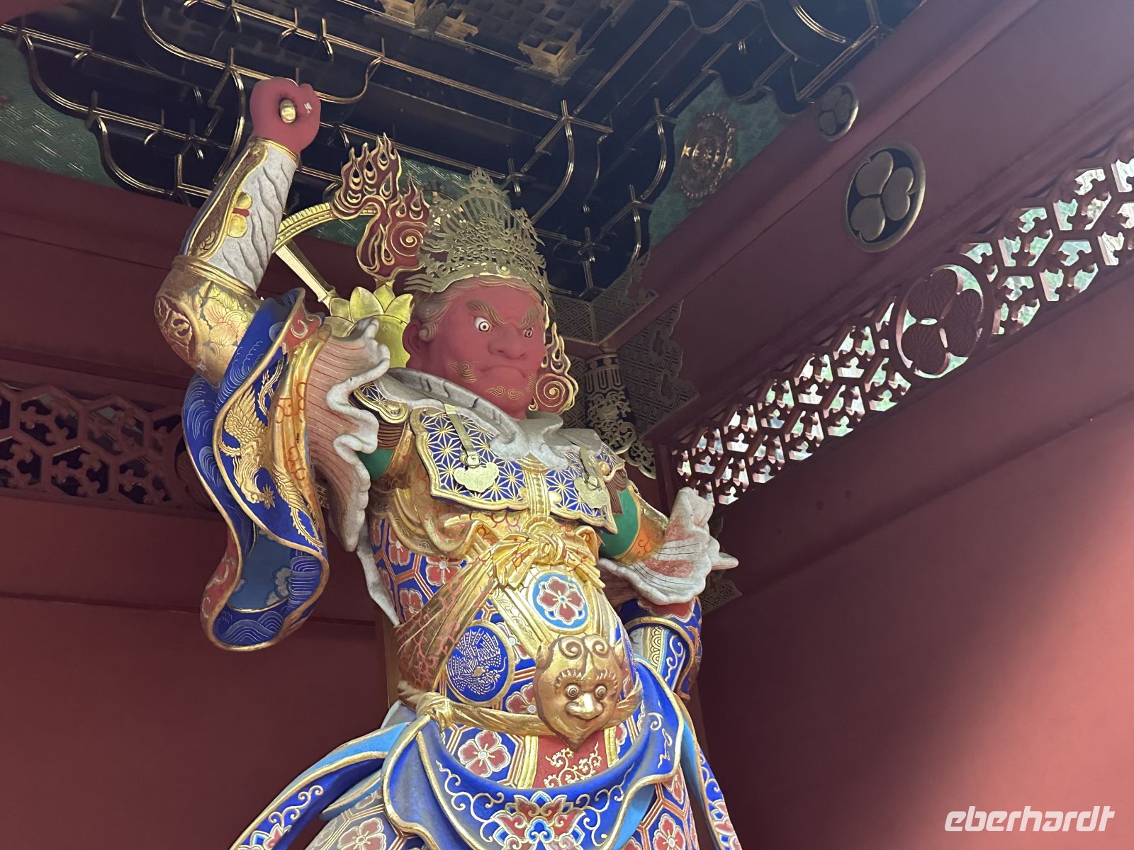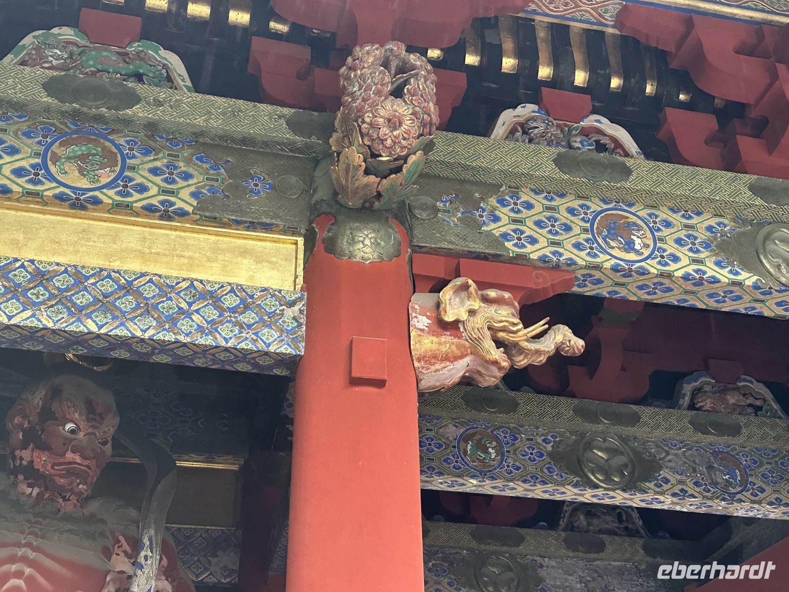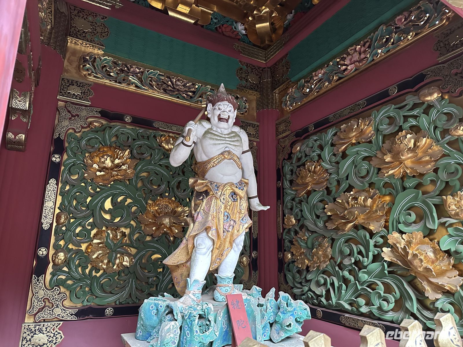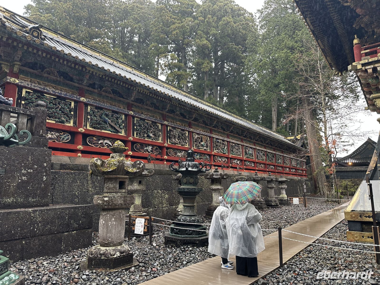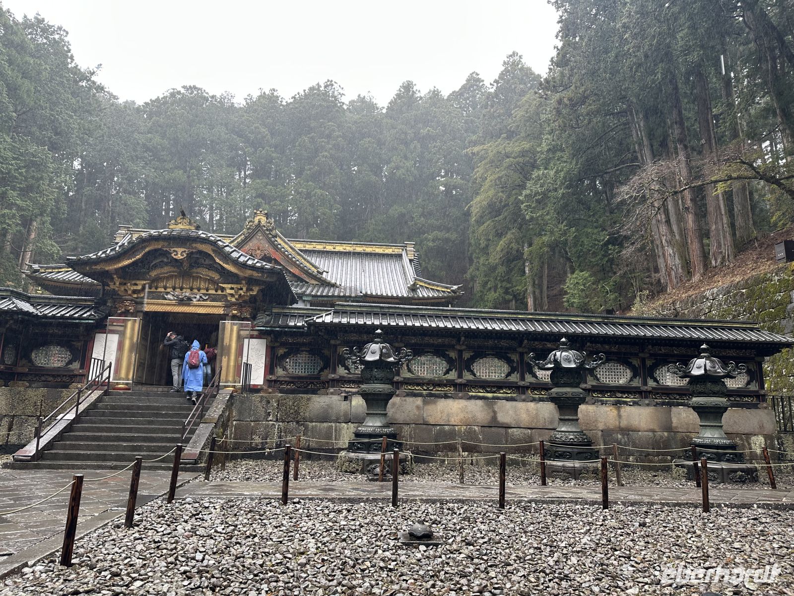 Heute führt uns unser Weg nach Nikko, das uns mit einem wolkenverhangenen Himmel und kräftigem Regen empfängt. Doch gerade das Wetter verleiht diesem Ort eine ganz eigene, fast mystische Atmosphäre. Wenn der Nebel zwischen den riesigen, uralten Zedern hängt und der Regen auf die aufwendig verzierten Dächer trommelt, wirkt die gesamte Anlage wie aus einer anderen Zeit. Am Eingang zum Toshogu Schrein fallen uns sofort die imposanten Wächterfiguren am Nio-mon Tor auf. Es sind zwei dieser gewaltigen Nio-Statuen, die jeweils in einer Nische links und rechts des Durchgangs stehen. Die Figuren sind in einem kräftigen Zinnoberrot gehalten, was im Kontrast zu dem dunklen Holz des Tores und dem grauen Regenwetter besonders leuchtend hervorsticht. Diese Wächter sind muskulöse Gestalten mit wildem Gesichtsausdruck. Einer der beiden hat den Mund geöffnet, während der andere ihn fest geschlossen hält. Das ist kein Zufall: Der offene Mund steht für den Laut Ah und der geschlossene für Un. Zusammen symbolisieren sie den Anfang und das Ende. Ihre drohende Haltung und die erhobenen Hände signalisieren jedem Besucher, dass alles Böse draußen bleiben muss. Durch die feuchte Luft und den Regen wirkten die kräftigen Farben und die glänzenden Augen der Figuren heute besonders lebendig und furchteinflößend. Nachdem wir das erste Tor mit den zwei roten Nio-Wächtern passiert haben, erreichen wir das prachtvolle Yomeimon-Tor, das auch als Tor des Sonnenuntergangs bekannt ist. Hier treffen wir auf zwei weitere beeindruckende Wächterfiguren, die in den Nischen des Tores sitzen.
