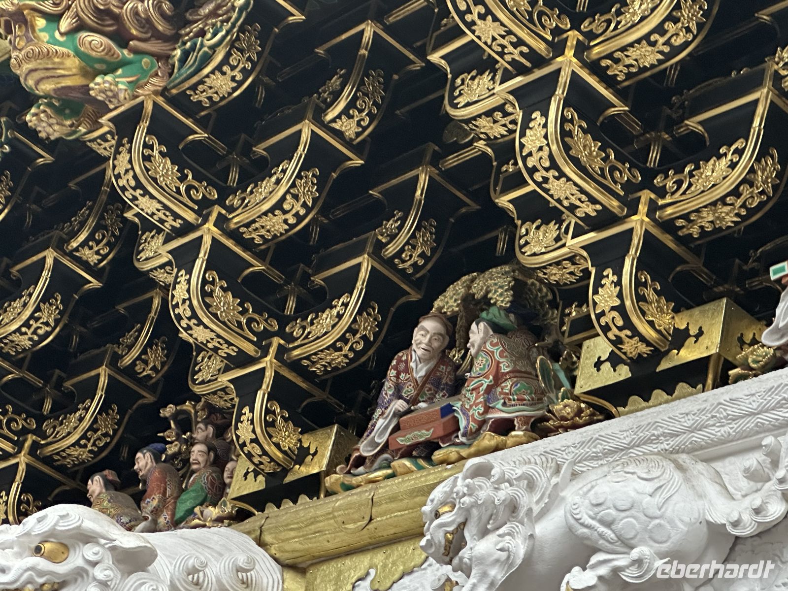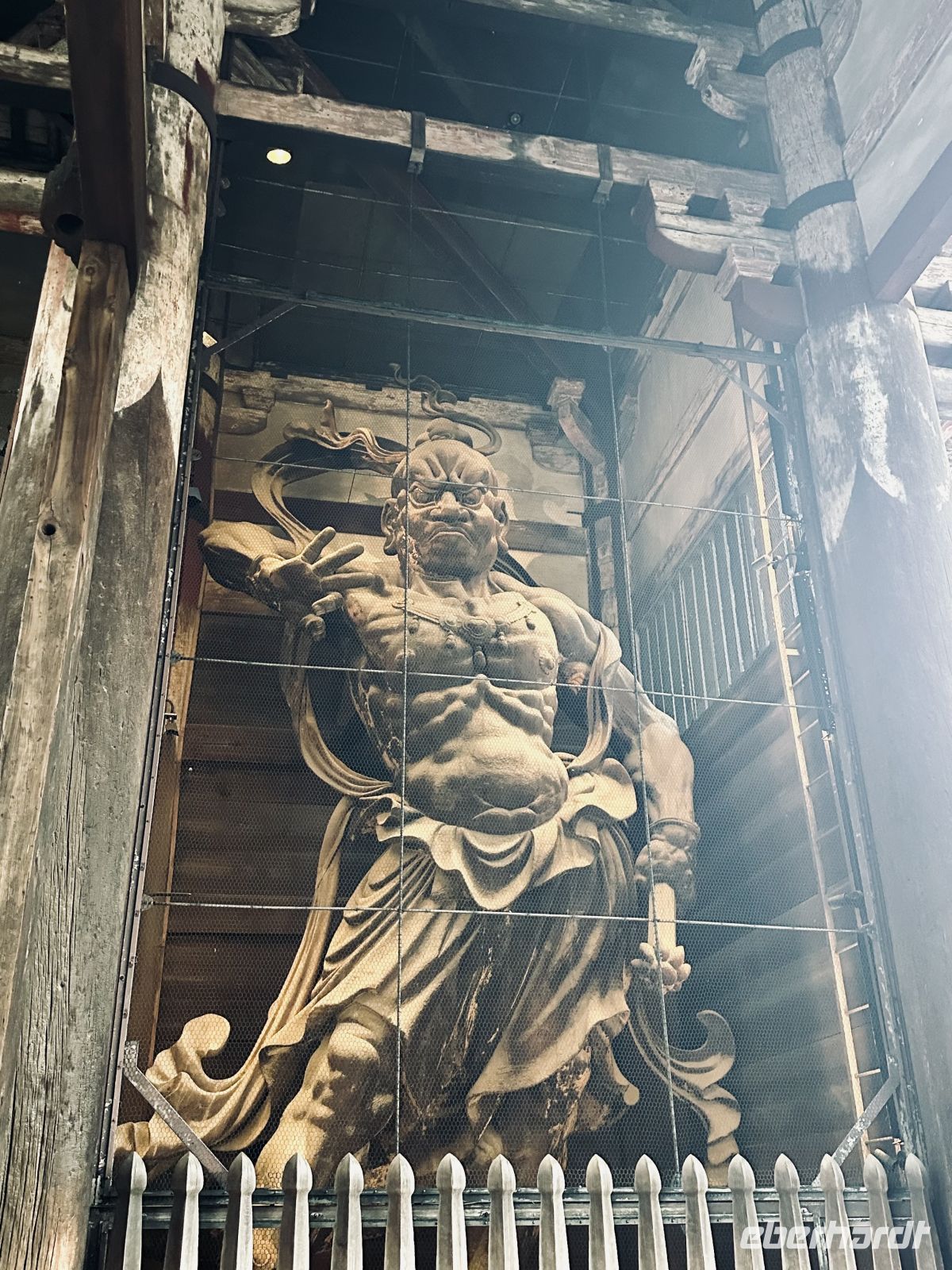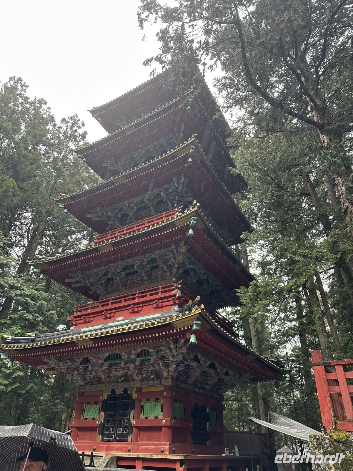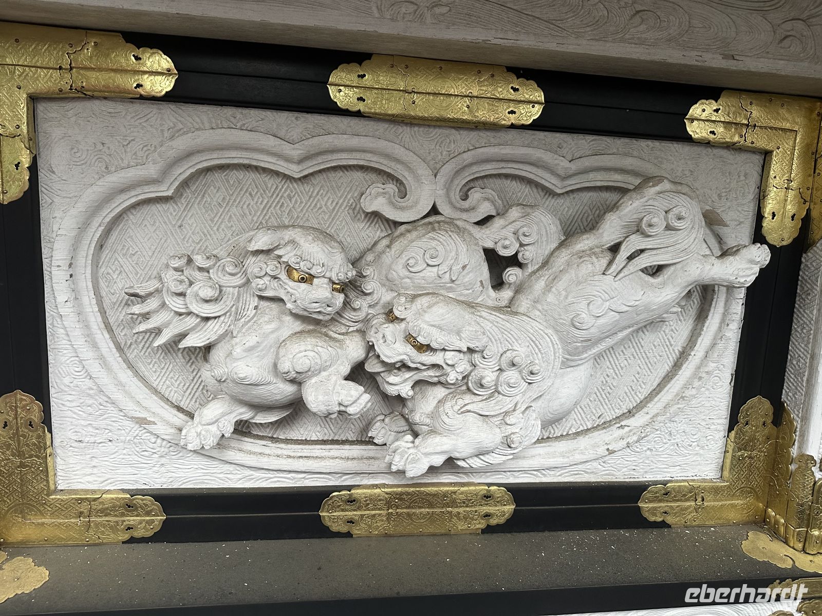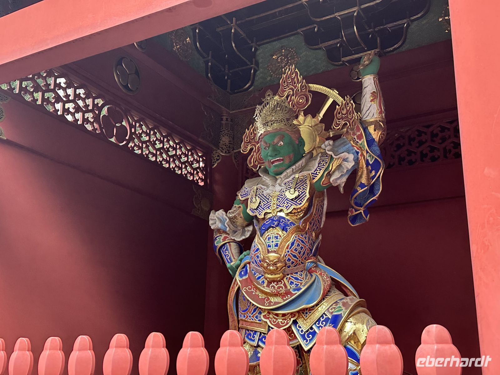 Heute führt uns unser Weg nach Nikko, das uns mit einem wolkenverhangenen Himmel und kräftigem Regen empfängt. Doch gerade das Wetter verleiht diesem Ort eine ganz eigene, fast mystische Atmosphäre. Wenn der Nebel zwischen den riesigen, uralten Zedern hängt und der Regen auf die aufwendig verzierten Dächer trommelt, wirkt die gesamte Anlage wie aus einer anderen Zeit. Am Eingang zum Toshogu Schrein fallen uns sofort die imposanten Wächterfiguren am Nio-mon Tor auf. Es sind zwei dieser gewaltigen Nio-Statuen, die jeweils in einer Nische links und rechts des Durchgangs stehen. Die Figuren sind in einem kräftigen Zinnoberrot gehalten, was im Kontrast zu dem dunklen Holz des Tores und dem grauen Regenwetter besonders leuchtend hervorsticht. Diese Wächter sind muskulöse Gestalten mit wildem Gesichtsausdruck. Einer der beiden hat den Mund geöffnet, während der andere ihn fest geschlossen hält. Das ist kein Zufall: Der offene Mund steht für den Laut Ah und der geschlossene für Un. Zusammen symbolisieren sie den Anfang und das Ende. Ihre drohende Haltung und die erhobenen Hände signalisieren jedem Besucher, dass alles Böse draußen bleiben muss. Durch die feuchte Luft und den Regen wirkten die kräftigen Farben und die glänzenden Augen der Figuren heute besonders lebendig und furchteinflößend. Nachdem wir das erste Tor mit den zwei roten Nio-Wächtern passiert haben, erreichen wir das prachtvolle Yomeimon-Tor, das auch als Tor des Sonnenuntergangs bekannt ist. Hier treffen wir auf zwei weitere beeindruckende Wächterfiguren, die in den Nischen des Tores sitzen.