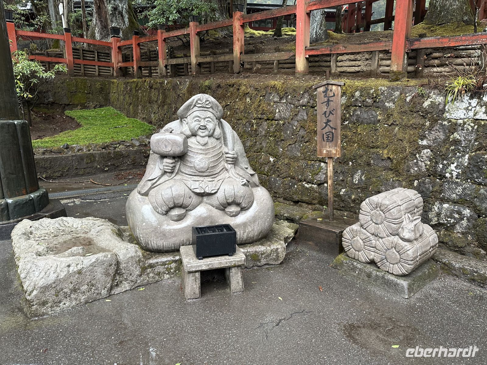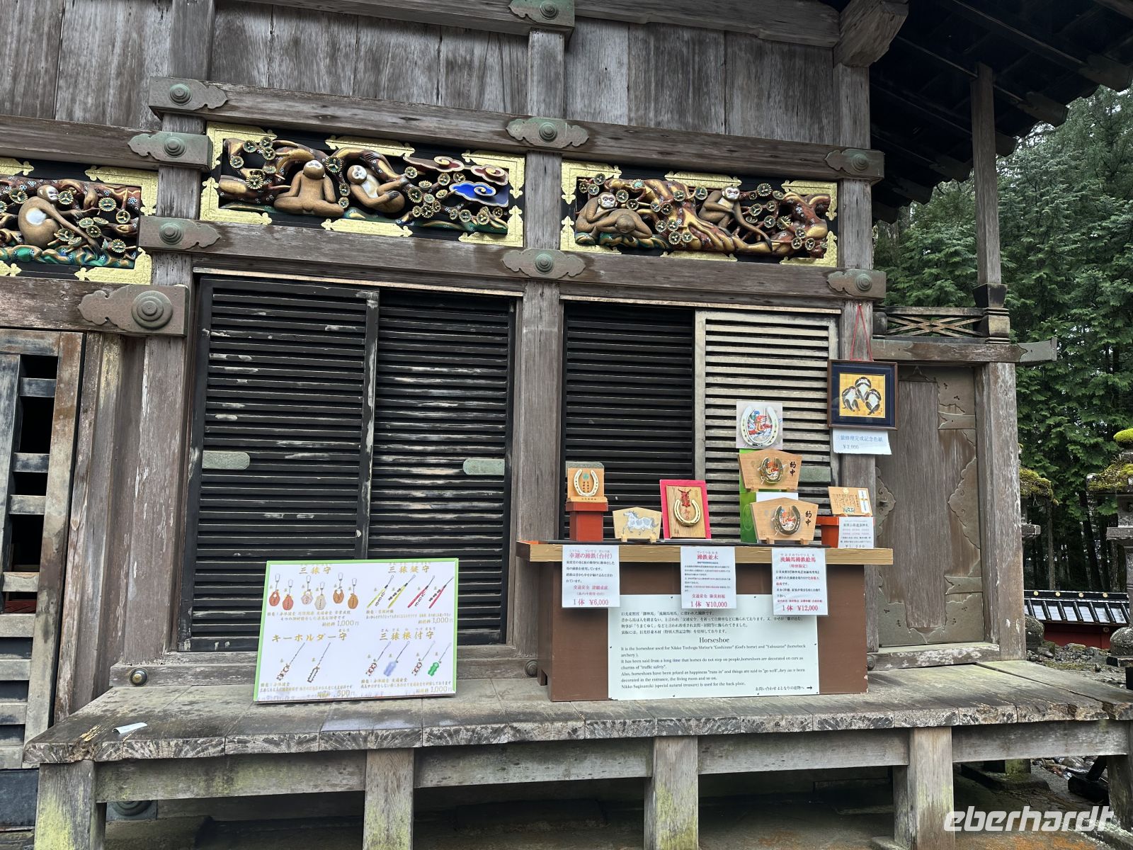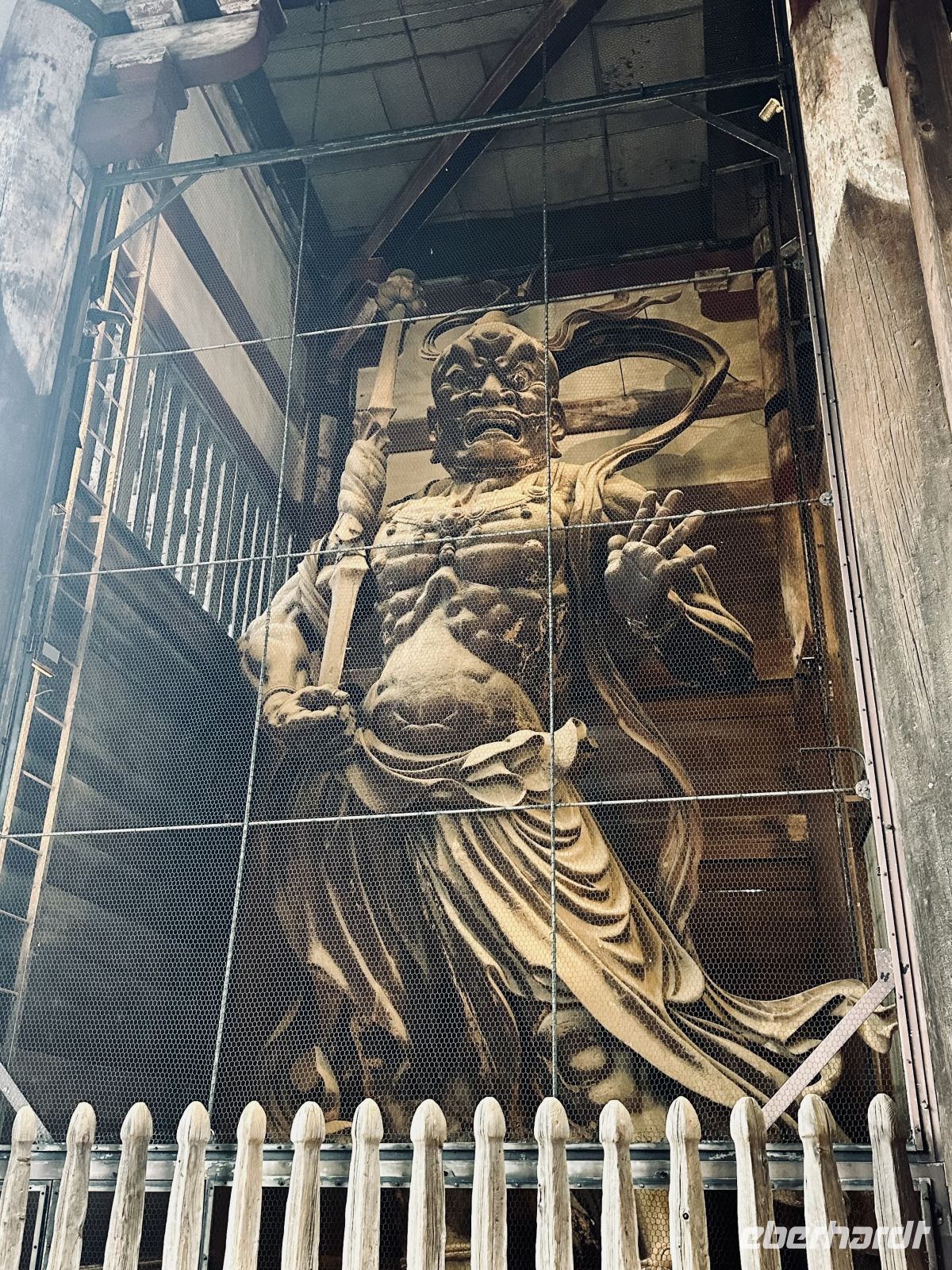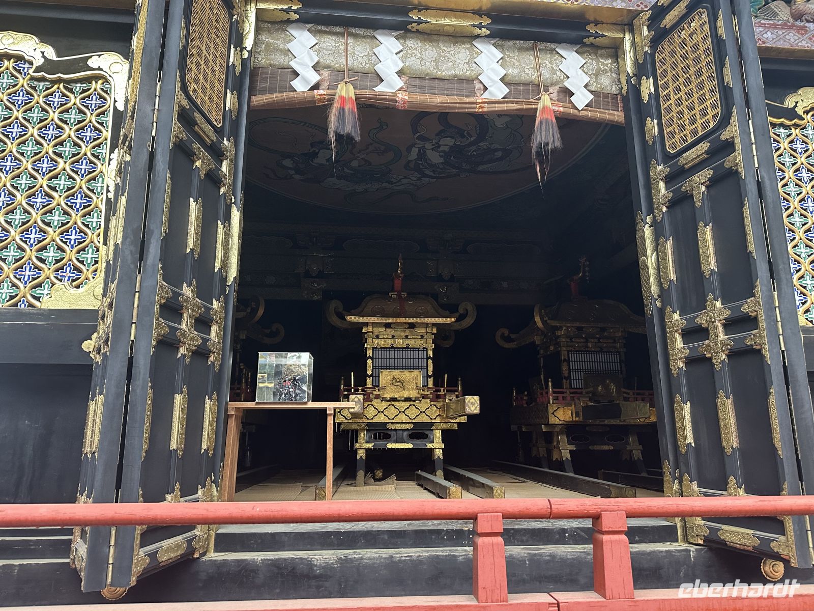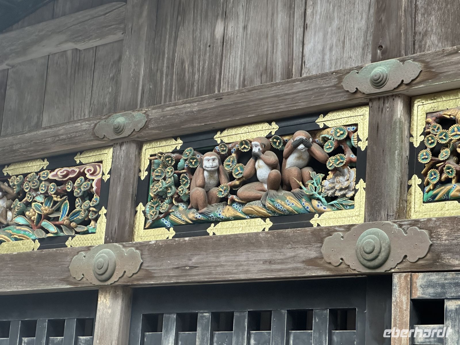 Heute führt uns unser Weg nach Nikko, das uns mit einem wolkenverhangenen Himmel und kräftigem Regen empfängt. Doch gerade das Wetter verleiht diesem Ort eine ganz eigene, fast mystische Atmosphäre. Wenn der Nebel zwischen den riesigen, uralten Zedern hängt und der Regen auf die aufwendig verzierten Dächer trommelt, wirkt die gesamte Anlage wie aus einer anderen Zeit. Am Eingang zum Toshogu Schrein fallen uns sofort die imposanten Wächterfiguren am Nio-mon Tor auf. Es sind zwei dieser gewaltigen Nio-Statuen, die jeweils in einer Nische links und rechts des Durchgangs stehen. Die Figuren sind in einem kräftigen Zinnoberrot gehalten, was im Kontrast zu dem dunklen Holz des Tores und dem grauen Regenwetter besonders leuchtend hervorsticht. Diese Wächter sind muskulöse Gestalten mit wildem Gesichtsausdruck. Einer der beiden hat den Mund geöffnet, während der andere ihn fest geschlossen hält. Das ist kein Zufall: Der offene Mund steht für den Laut Ah und der geschlossene für Un. Zusammen symbolisieren sie den Anfang und das Ende. Ihre drohende Haltung und die erhobenen Hände signalisieren jedem Besucher, dass alles Böse draußen bleiben muss. Durch die feuchte Luft und den Regen wirkten die kräftigen Farben und die glänzenden Augen der Figuren heute besonders lebendig und furchteinflößend. Nachdem wir das erste Tor mit den zwei roten Nio-Wächtern passiert haben, erreichen wir das prachtvolle Yomeimon-Tor, das auch als Tor des Sonnenuntergangs bekannt ist. Hier treffen wir auf zwei weitere beeindruckende Wächterfiguren, die in den Nischen des Tores sitzen.