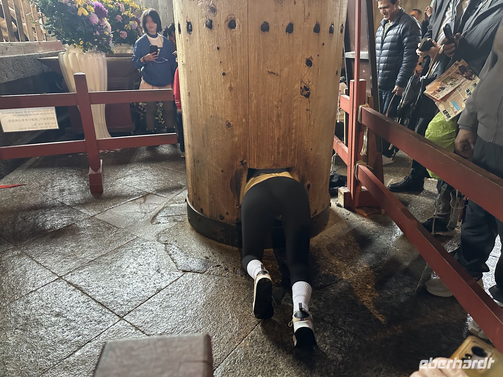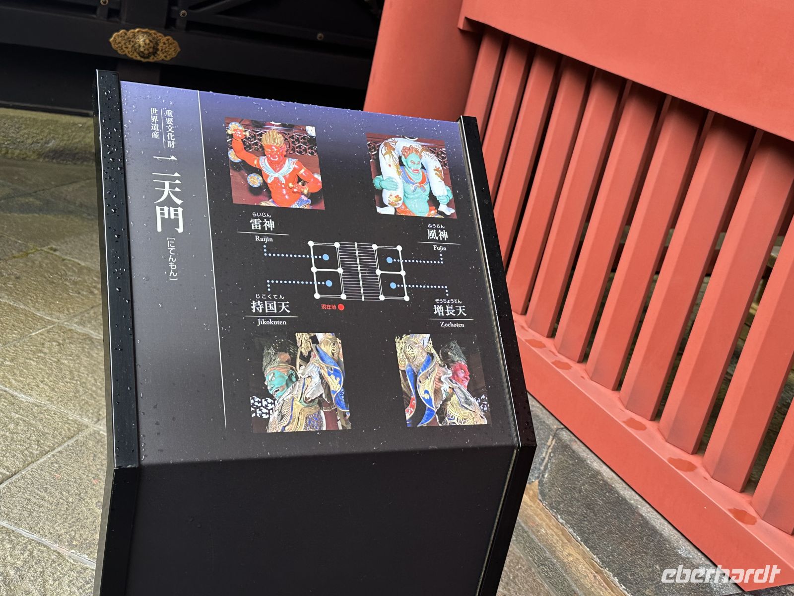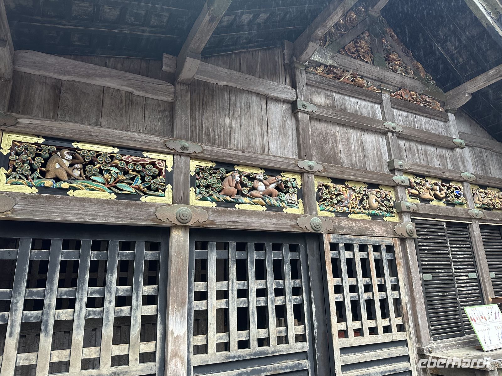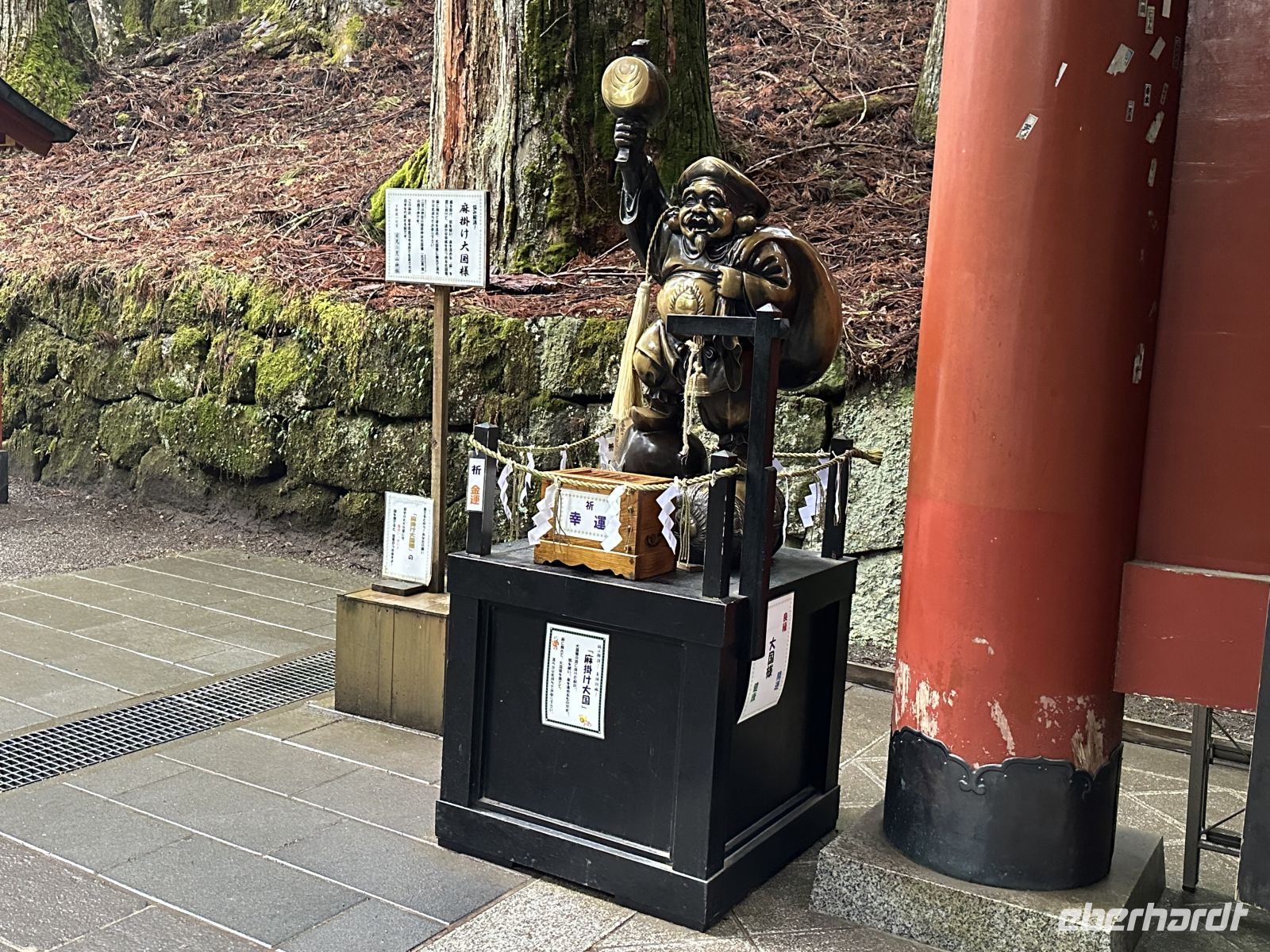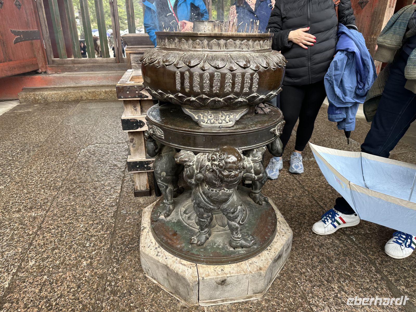 Heute führt uns unser Weg nach Nikko, das uns mit einem wolkenverhangenen Himmel und kräftigem Regen empfängt. Doch gerade das Wetter verleiht diesem Ort eine ganz eigene, fast mystische Atmosphäre. Wenn der Nebel zwischen den riesigen, uralten Zedern hängt und der Regen auf die aufwendig verzierten Dächer trommelt, wirkt die gesamte Anlage wie aus einer anderen Zeit. Am Eingang zum Toshogu Schrein fallen uns sofort die imposanten Wächterfiguren am Nio-mon Tor auf. Es sind zwei dieser gewaltigen Nio-Statuen, die jeweils in einer Nische links und rechts des Durchgangs stehen. Die Figuren sind in einem kräftigen Zinnoberrot gehalten, was im Kontrast zu dem dunklen Holz des Tores und dem grauen Regenwetter besonders leuchtend hervorsticht. Diese Wächter sind muskulöse Gestalten mit wildem Gesichtsausdruck. Einer der beiden hat den Mund geöffnet, während der andere ihn fest geschlossen hält. Das ist kein Zufall: Der offene Mund steht für den Laut Ah und der geschlossene für Un. Zusammen symbolisieren sie den Anfang und das Ende. Ihre drohende Haltung und die erhobenen Hände signalisieren jedem Besucher, dass alles Böse draußen bleiben muss. Durch die feuchte Luft und den Regen wirkten die kräftigen Farben und die glänzenden Augen der Figuren heute besonders lebendig und furchteinflößend. Nachdem wir das erste Tor mit den zwei roten Nio-Wächtern passiert haben, erreichen wir das prachtvolle Yomeimon-Tor, das auch als Tor des Sonnenuntergangs bekannt ist. Hier treffen wir auf zwei weitere beeindruckende Wächterfiguren, die in den Nischen des Tores sitzen.