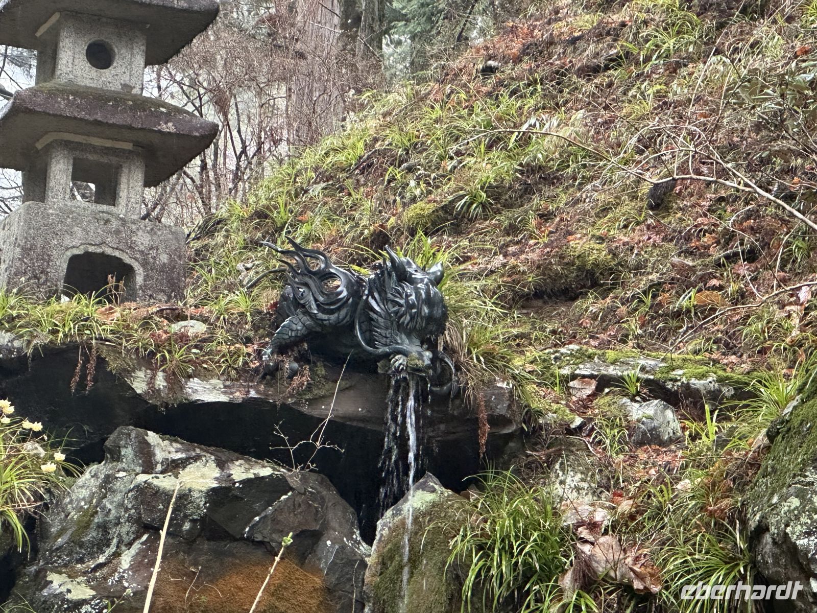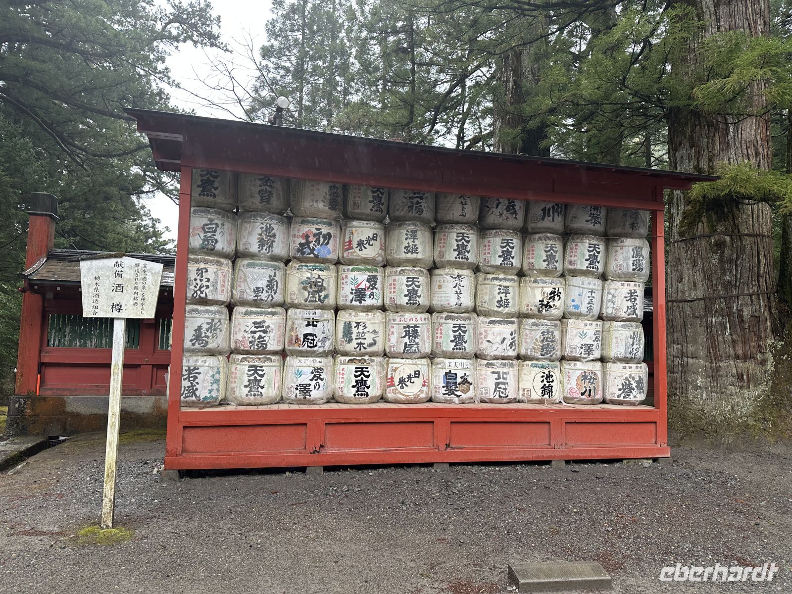 Auf der einen Seite befindet sich eine weiße Wächterfigur und auf der anderen Seite eine grüne. Diese Figuren sind als Zuishin bekannt und stellen bewaffnete kaiserliche Leibwächter aus der Heian-Zeit dar. Sie tragen traditionelle Gewänder, halten Pfeil und Bogen in den Händen und tragen Schwerter an ihrer Seite. Wir spazieren weiter durch die prachtvolle Anlage, die für ihren extremen Reichtum an Gold und Schnitzereien bekannt ist. Ein besonderes Highlight ist die Nemuri-neko, die berühmte schlafende Katze. Diese kleine, aber meisterhaft geschnitzte Figur schläft friedlich zwischen Pfingstrosen. Man sagt, dass ihre Ruhe ein Symbol für den Frieden im Japan der damaligen Zeit ist. Der Regen verstärkt die Farben des roten Lacks und des glänzenden Blattgolds, was im Kontrast zum dunklen Wald besonders eindrucksvoll aussieht. Am Nachmittag fahren wir weiter hinauf in die Bergwelt von Nikko. Wir erreichen den Chuzenji See, der auf über 1200 Metern Höhe liegt. Bei einem Fotostopp lassen wir die weite Wasserfläche auf uns wirken, die heute durch den Regen und die Wolken besonders dramatisch und stimmungsvoll erscheint. Ganz in der Nähe besuchen wir die Kegon Wasserfälle. Es ist beeindruckend zu sehen, wie das Wasser fast einhundert Meter tief in die Schlucht stürzt. Die Gischt vermischt sich mit dem Regen, und das Tosen des Wassers ist weithin zu hören. Nach diesem ereignisreichen Tag im nassen und kühlen Hochland machen wir uns an die Rückreise nach Tokio, wo wir uns auf die Wärme des Hotels und auf ein Bad im Onsen freuen.