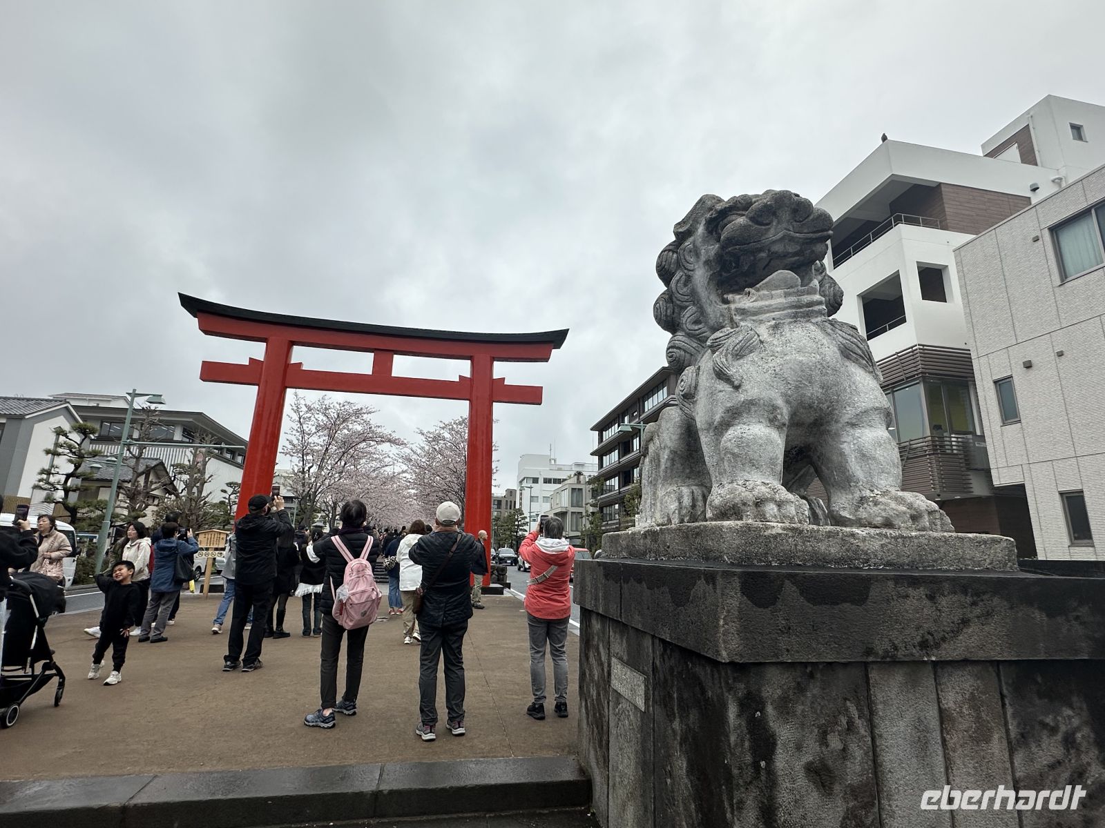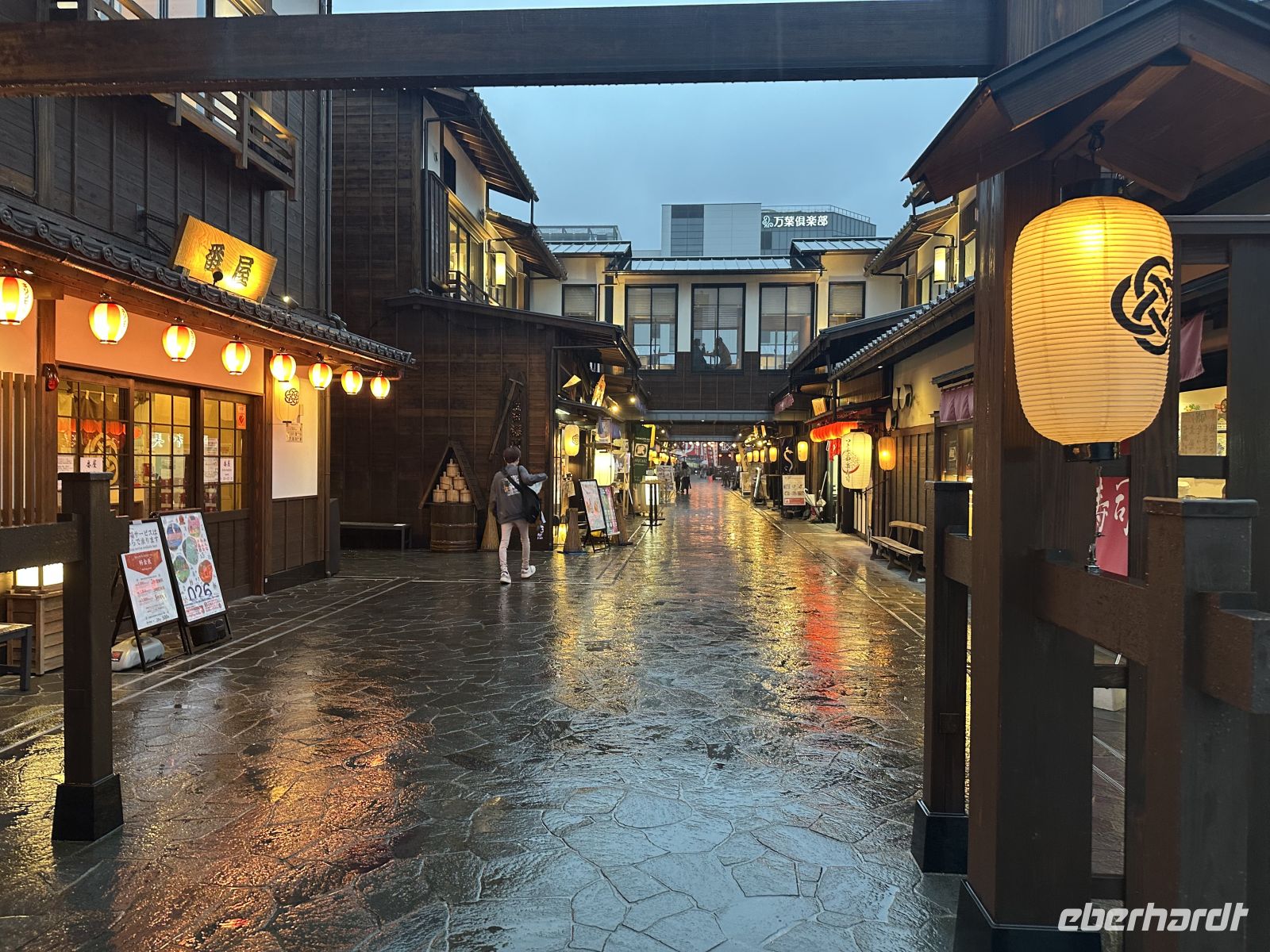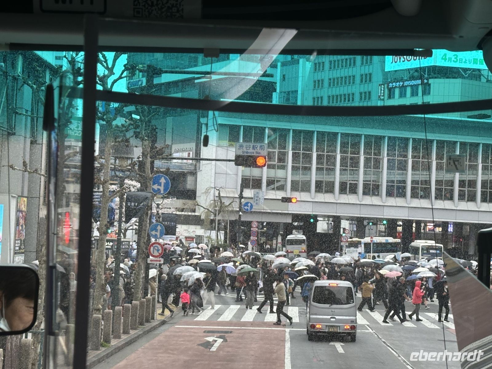 Während wir unsere Fahrt fortsetzen, zeigt sich Tokio von seiner nassen Seite: Ein kräftiger japanischer Frühlingsregen setzt ein. Vom Bus aus erleben wir ein besonderes Spektakel: die berühmte Shibuya-Kreuzung. Trotz des Regens wälzen sich Menschenmassen über die Straße, sobald die Ampeln auf Grün springen. Es ist ein faszinierendes Bild – ein fast endloses Meer aus meist durchsichtigen Regenschirmen, das sich diszipliniert und lautlos in alle Richtungen bewegt. Anschließend erreichen wir Ginza, das wohl exklusivste Einkaufsviertel der Stadt. Hier bewundern wir die Architektur der Luxuskaufhäuser und die perfekt dekorierten Schaufenster, die im Regengrau besonders hell leuchten. Als wir in Asakusa ankommen, regnet es mittlerweile wie verrückt. Doch das hält uns nicht auf. Wir schreiten durch das berühmte Kaminarimon, dem Donnertor mit seiner riesigen roten Laterne. Diese wird flankiert von den furchteinflößenden Statuen der Wind- und Donnergötter und wir betreten nun den heiligen Bezirk des Senso-ji. Dieser Tempel ist nicht nur der älteste der Stadt, sondern auch ein Ort tiefer Legenden: Wir erfahren, dass er bereits im 7. Jahrhundert gegründet wurde, nachdem Fischer eine goldene Statue der Göttin Kannon im nahegelegenen Fluss fanden. Trotz des prasselnden Regens spazieren wir über die Nakamise-Dori zur Haupthalle, immer darauf bedacht, im Menschengewimmel die Gruppe nicht zu verlieren. Ein besonderes Erlebnis ist der große Weihrauchkessel vor dem Tempel. Wir beobachten, wie sich die Gläubigen den heiligen Rauch zufächeln, der Körper und Geist reinigen und heilen soll. Einige von uns fordern ihr Schicksal heraus und ziehen ein Omikuji – ein traditionelles Glückslos. Man schüttelt eine Metalldose, bis ein nummeriertes Stäbchen herausfällt, welches einem dann die entsprechende Weissagung zuweist. Von „Großem Glück“ bis „Pech“ ist alles dabei. Wer ein weniger gutes Los zieht, knotet es kurzerhand an ein bereitstehendes Metallgestell, um das Unheil symbolisch am Tempel zurückzulassen. Nach der Besichtigung genießen wir trotz des Wetters etwas Freizeit. Die kleinen Gassen rund um den Tempel bieten unzählige Möglichkeiten: Manche nutzen die Zeit für einen wärmenden Tee, andere erstehen Souvenirs wie handgefertigte Fächer oder kosten die frisch gebackenen Senbei (Reiscracker). Diese individuelle Zeit erlaubt es jedem, Asakusa in seinem eigenen Tempo zu entdecken, bevor wir uns wieder sammeln. Nach diesem ereignisreichen und ziemlich feuchten Tag kehren wir in unser Hotel zurück. Doch bevor wir den Abend ganz beenden, nutzen einige von uns die ideale Lage unseres Quartiers: Direkt gegenüber vom Hotel befindet sich das neu gestaltete Viertel Koto-Toyosu. In den traditionell gestalteten Gassen, die an das historische Tokio erinnern, kehren wir zum Abendessen ein. Es ist eine gemütliche Atmosphäre, die einen wunderbaren Kontrast zum modernen Hotelbau bildet. Zum Abschluss des Tages wartet das hoteleigene Onsen. Im heißen Thermalwasser aufzuwärmen ist ein wahrer Segen und lässt uns die Anstrengungen des Tages sofort vergessen.