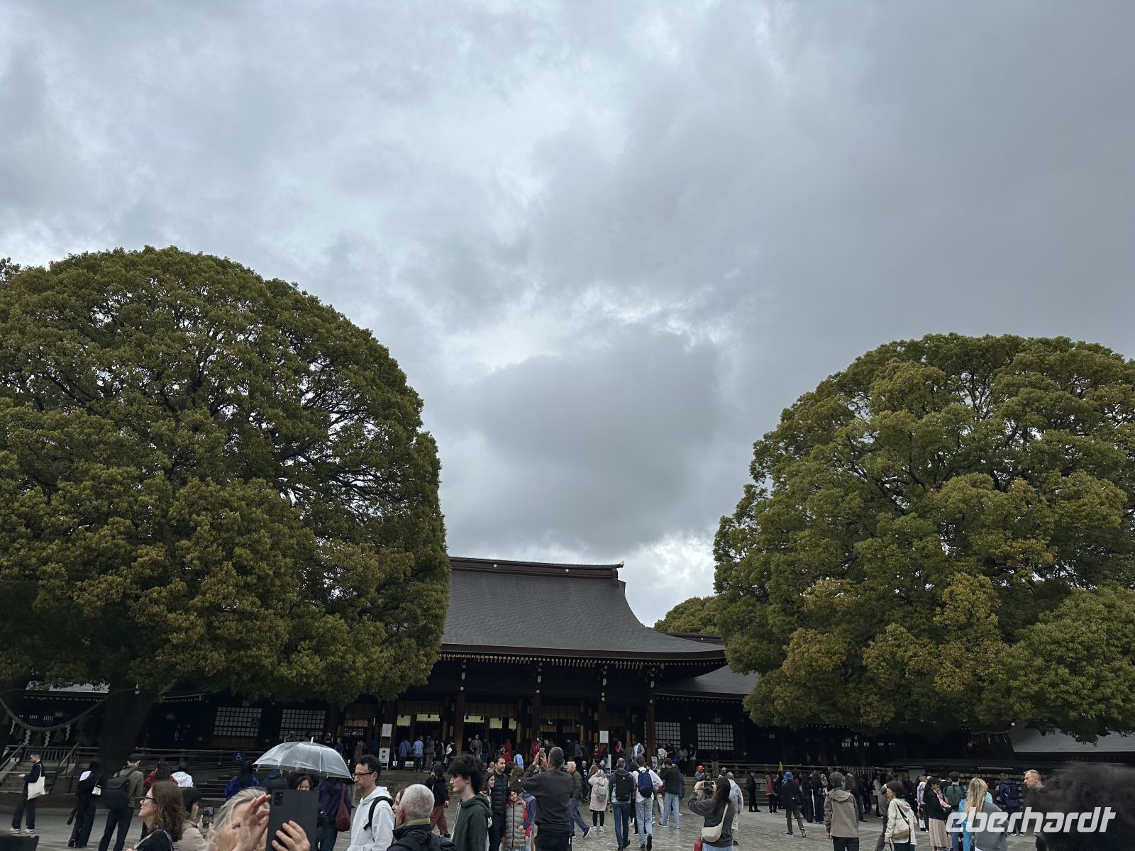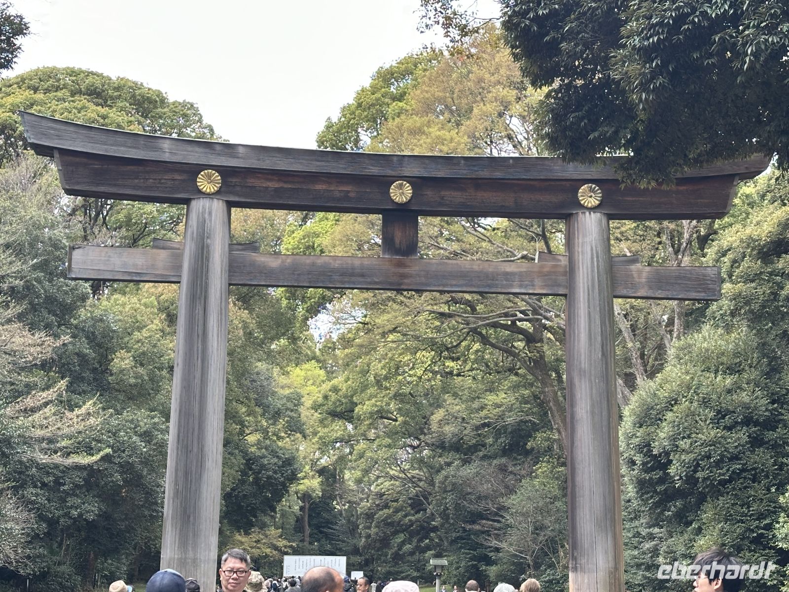 Nach einem japanischen Frühstück starten wir den Tag mit einer umfassenden Stadtrundfahrt. Unser Weg führt uns zunächst zum Meiji-Schrein, einer der bedeutendsten Shinto-Stätten des Landes. Inmitten eines riesigen, künstlich angelegten Waldes gelegen, bietet dieser Ort eine wohltuende Ruhe zum geschäftigen Treiben der Stadt. Bevor wir das heilige Gelände betreten, machen wir uns mit den Traditionen vertraut: Wir halten kurz inne und verbeugen uns respektvoll unter dem großen Torii, dem hölzernen Eingangstor, das die Grenze zwischen der profanen und der heiligen Welt markiert. Kurz vor dem eigentlichen Schrein vollziehen wir die rituelle Reinigung am Brunnen, dem Temizuya. Mit einer Schöpfkelle aus Holz waschen wir uns nacheinander die linke und die rechte Hand und spülen uns symbolisch den Mund aus. Diese Zeremonie dient dazu, sich von alltäglichen Verunreinigungen zu befreien, um den Gottheiten rein gegenüberzutreten. Der Schrein selbst ist dem Andenken an Kaiser Meiji und seine Gemahlin gewidmet. Seine Regierungszeit, von 1868 bis 1912, markiert den Wendepunkt Japans von einem abgeschotteten Feudalstaat hin zu einer modernen Weltmacht. Wir erfahren, dass der Schrein nicht nur ein religiöser Ort ist, sondern auch ein Symbol für die nationale Identität und die Verbindung zwischen dem Kaiserhaus und dem Volk.