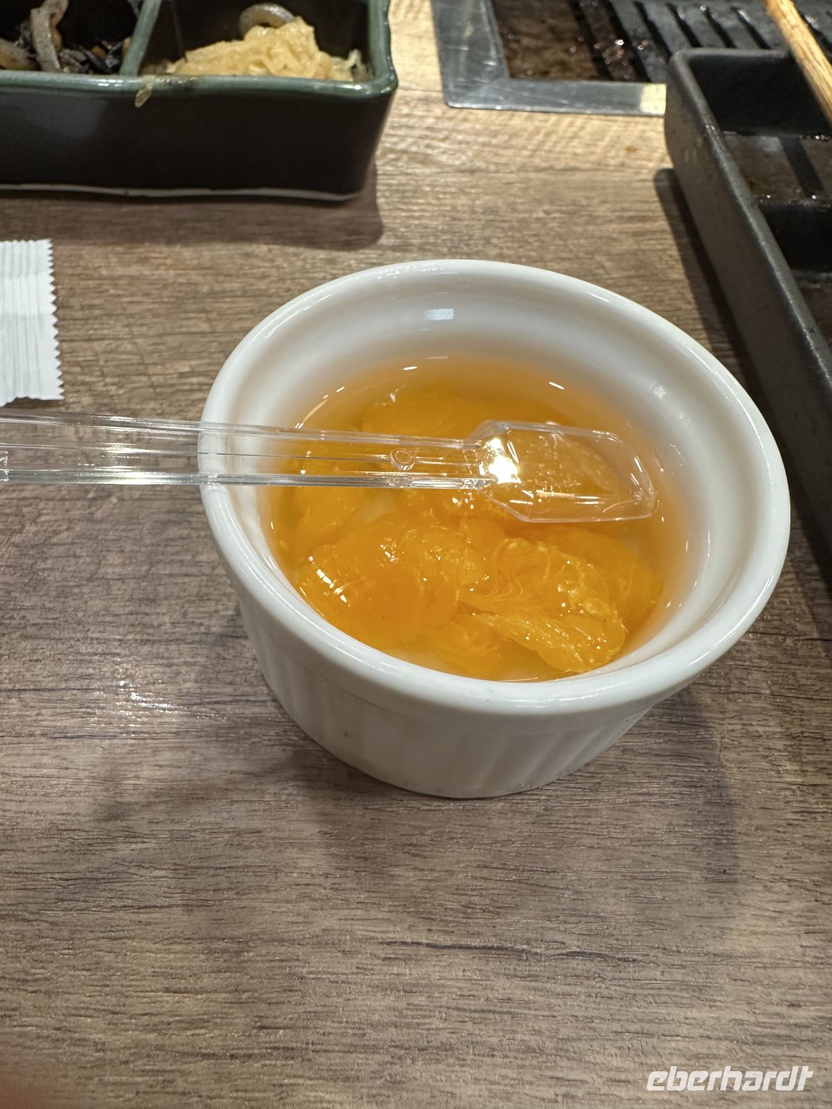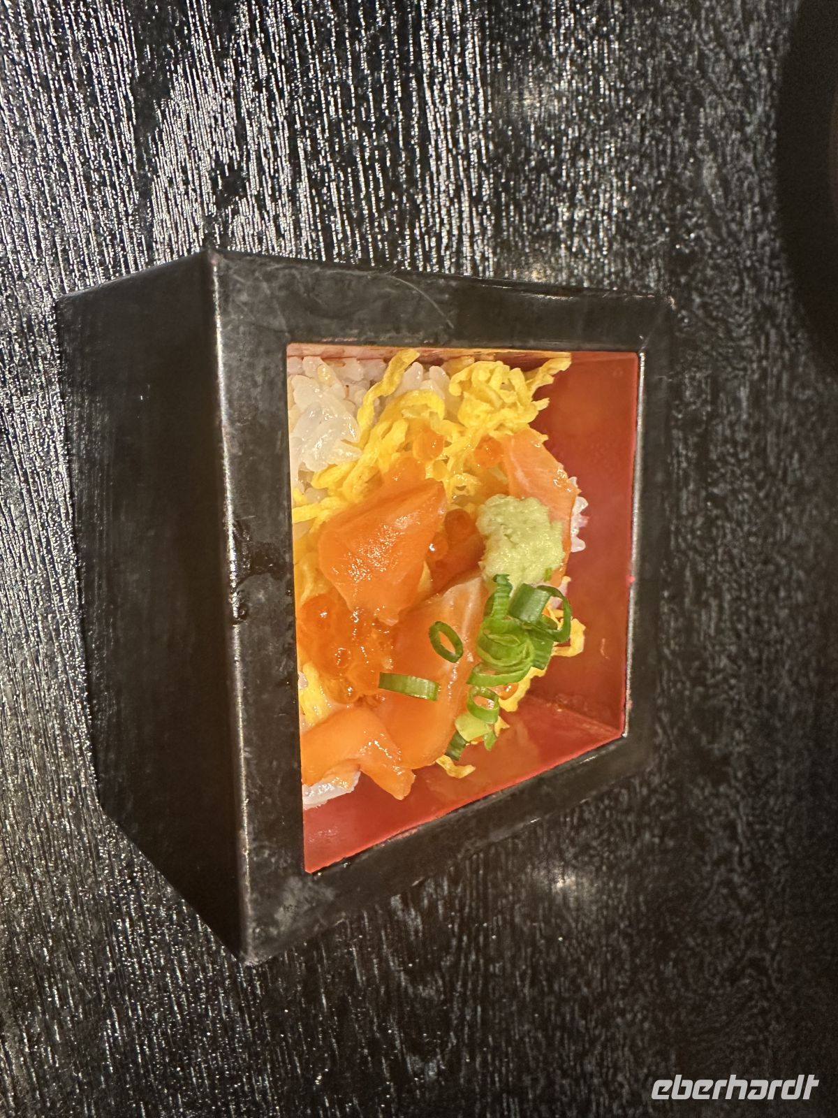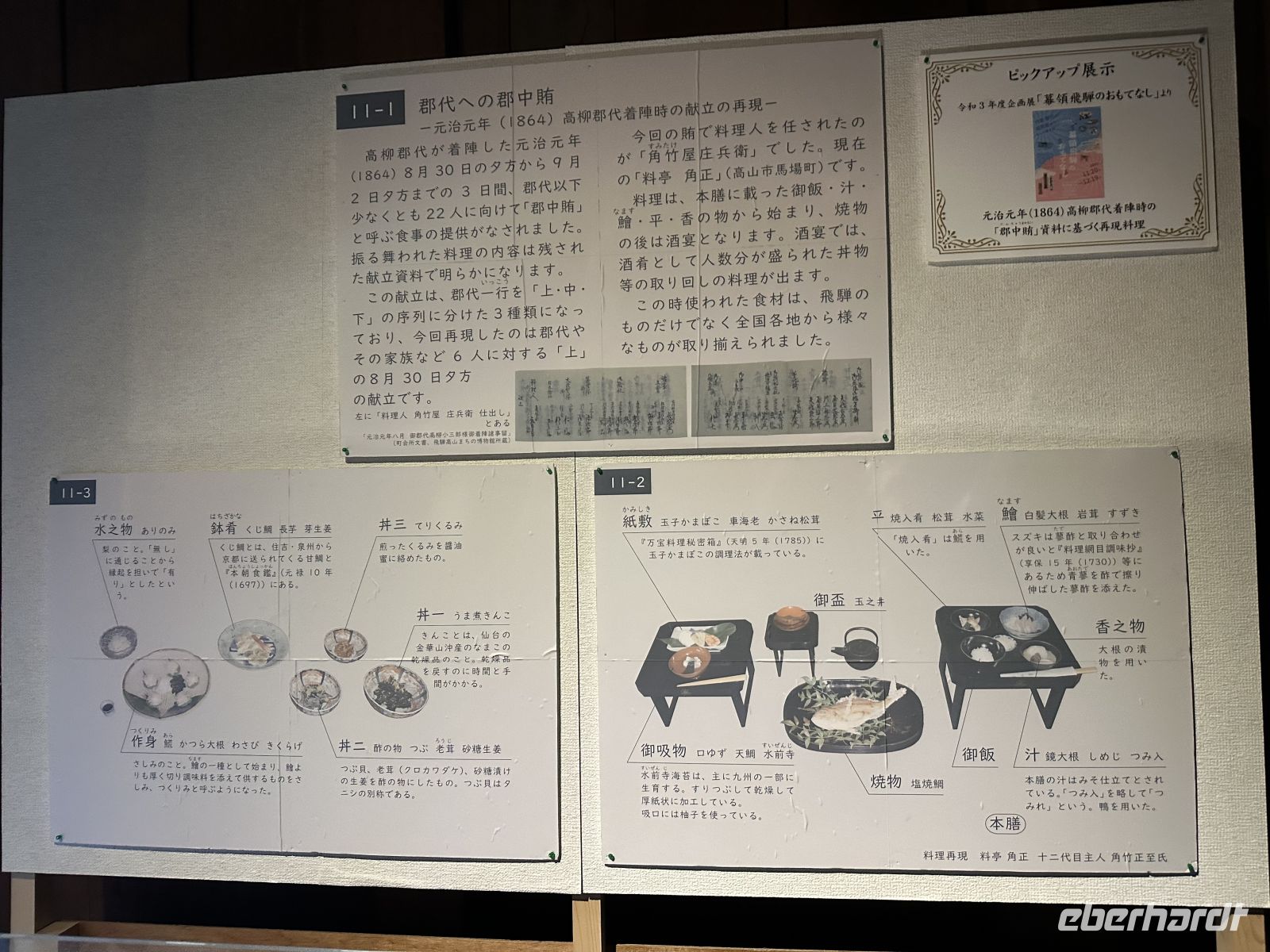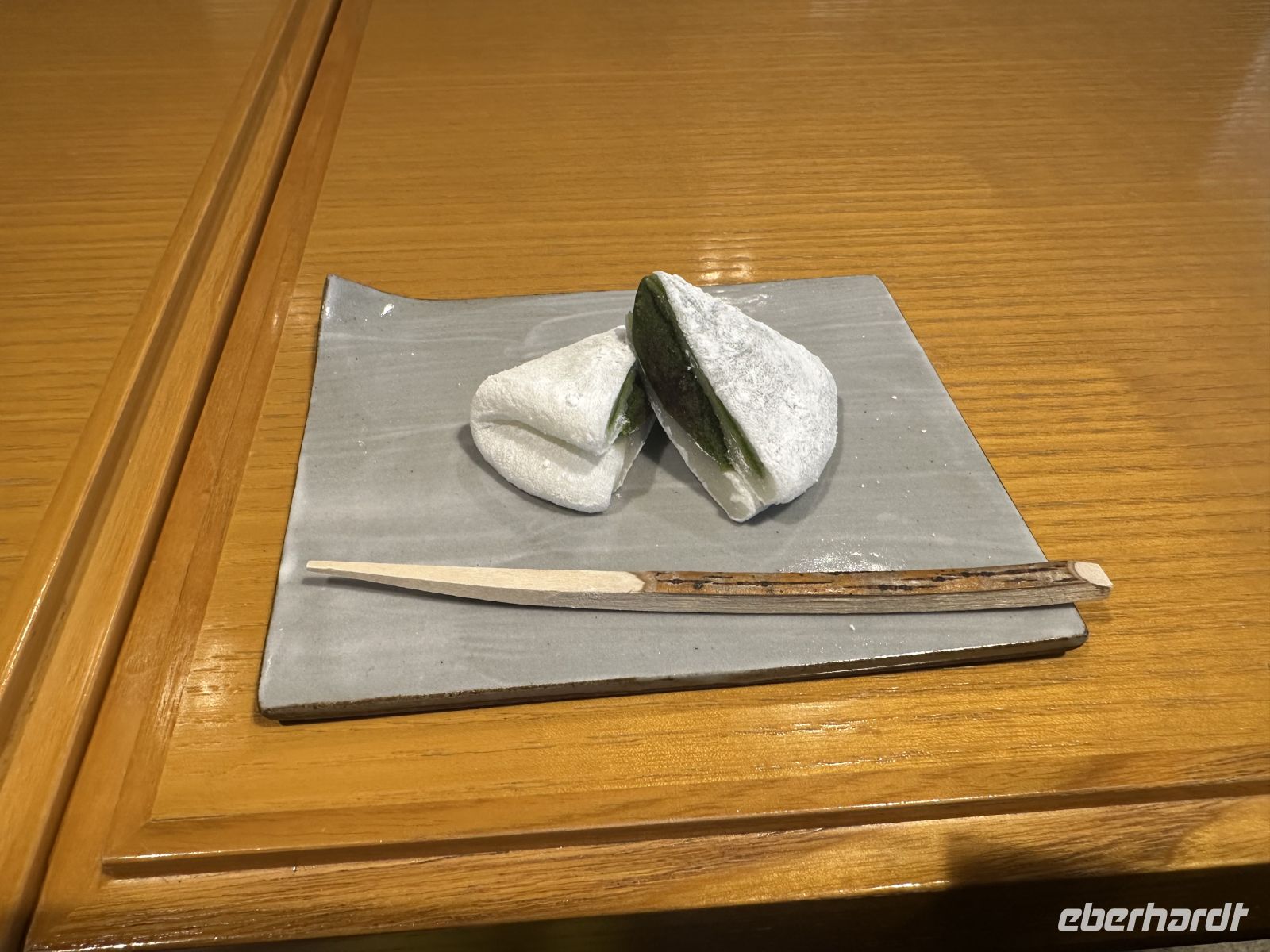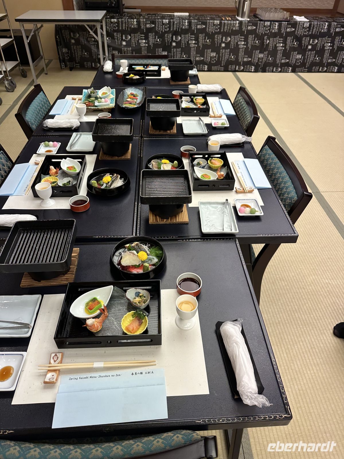 Wir nehmen in unseren leichten Yukatas Platz und lassen uns von der Abfolge vieler kleiner, kunstvoll angerichteter Gänge verzaubern. Jeder Teller und jede Schale ist individuell auf die Speise abgestimmt. Wir beginnen mit einem feinen Pflaumenwein als Aperitif. Die Auswahl an Vorspeisen ist ein Fest für die Augen: Wir probieren Rapsblüten mit Muscheln, ein Gemüse-Mille-feuille und Garnelen im Wasservogel-Stil. Besonders passend zum Frühling sind die dreifarbigen Dango-Klößchen und die Lachsrolle. Beim Sashimi-Gang genießen wir kurz angebratene Makrele, Meerbrasse und Tintenfisch mit Shiso-Blatt. Ein ungewöhnlicher Zwischengang sind die gekühlten Pflaumen-Somen-Nudeln, die sehr erfrischend wirken. Es folgen sanft geschmorte Gerichte wie Hähnchen in einer Shinoda-Rolle mit Daikon-Rettich und Weizengluten in Form von Pflaumenblüten. Das absolute Highlight ist das Hida-Rind, das wir in dünnen Scheiben direkt am Tisch auf einem kleinen Grill selbst zubereiten. Dazu gibt es frittierte Köstlichkeiten wie Kisu-Fisch, Spargel und Fischkuchen mit Aosa-Algen. Abgerundet wird das Menü durch eine klare Suppe mit Jakobsmuschel-Klößchen und aromatischen Bambussprossen-Reis mit eingelegtem Gemüse. Zum Nachtisch gibt es saisonale Früchte mit Schokoladen-Schlagsahne.