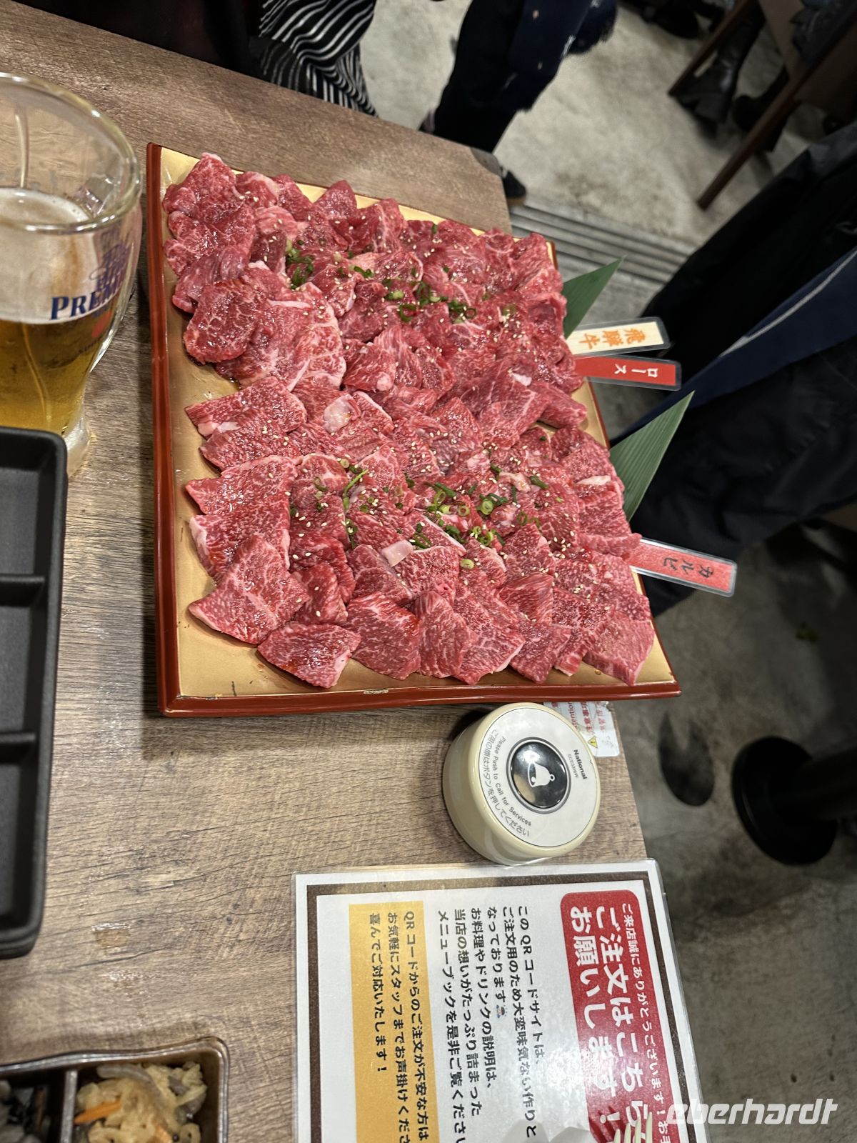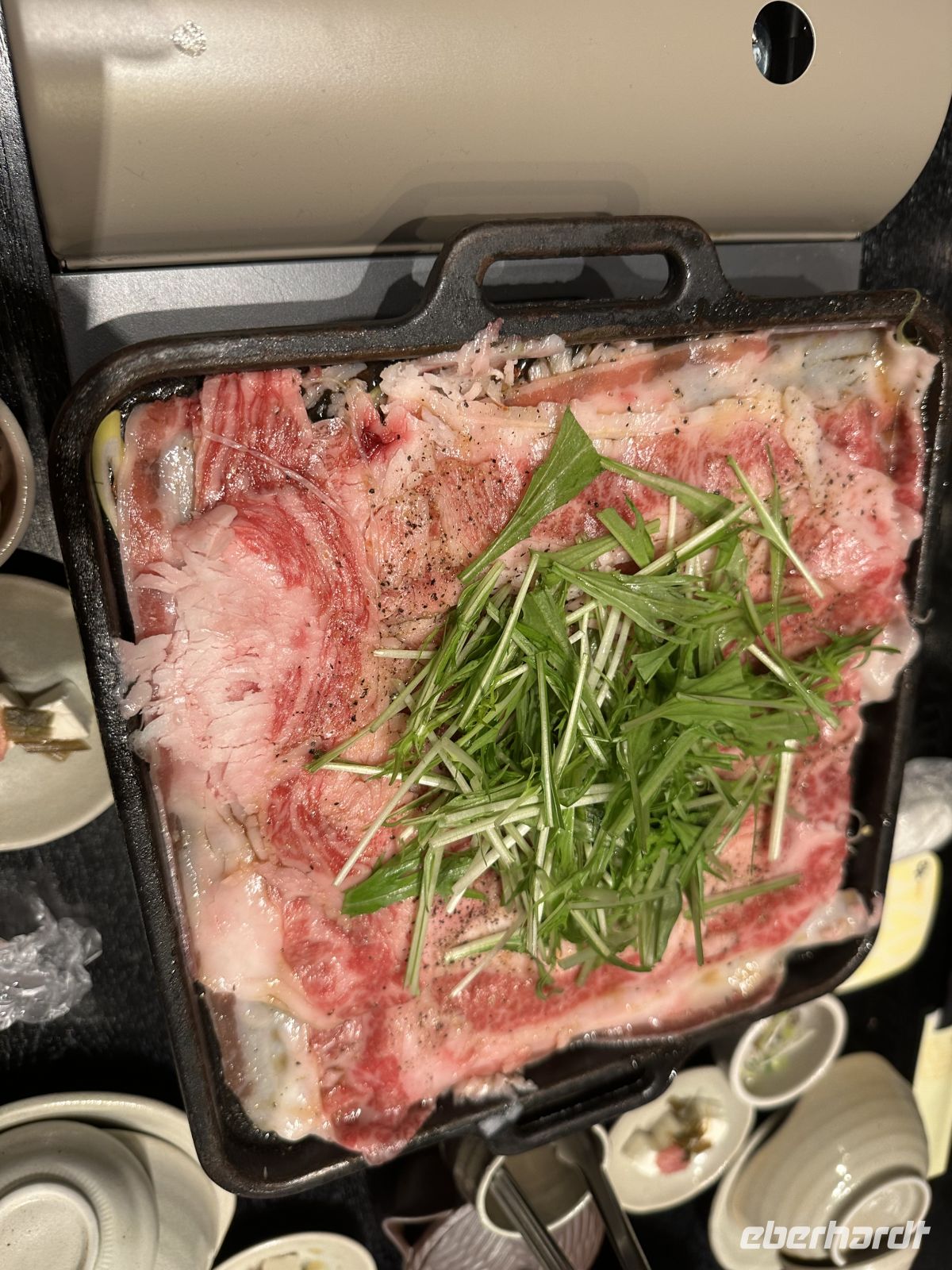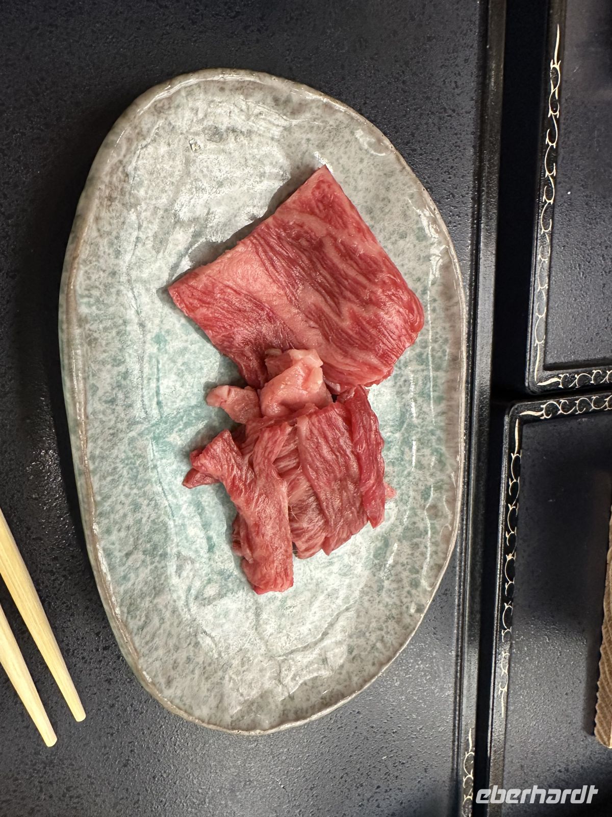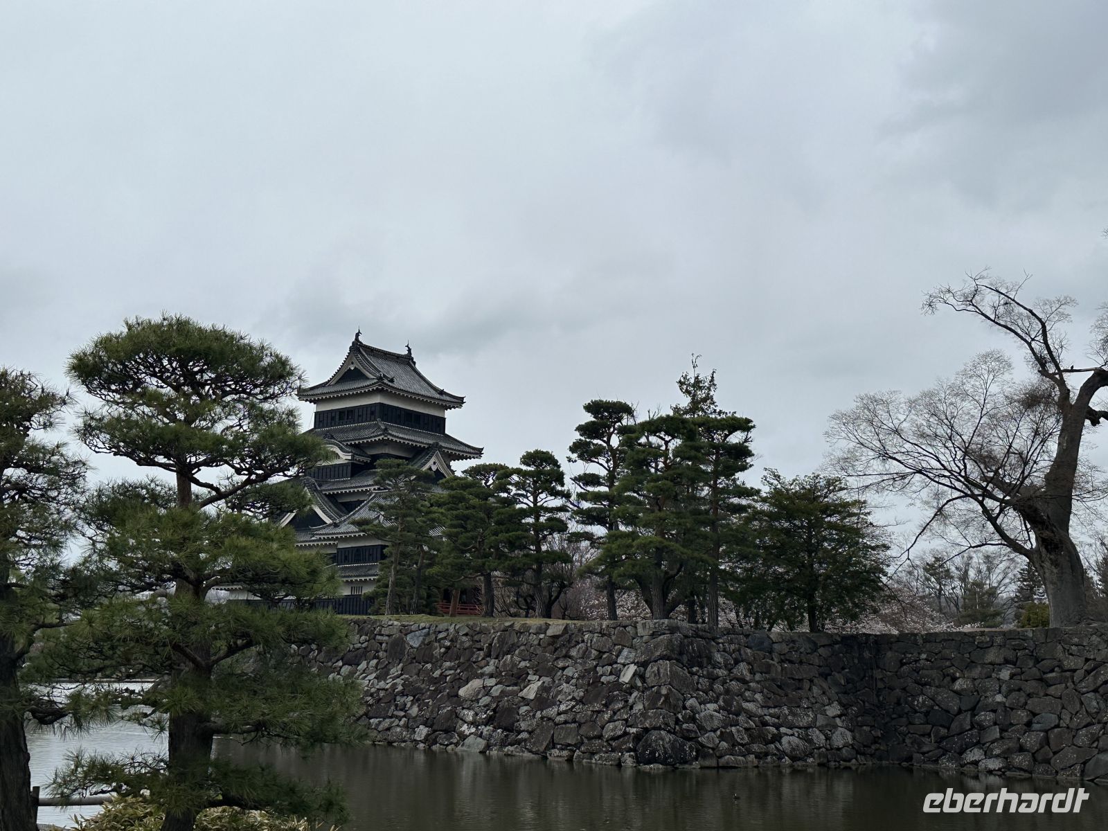 Es ist ein absolut faszinierender Anblick, die Makaken in ihrer natürlichen Umgebung so nah zu erleben. Die Affen sitzen entspannt am und im dampfenden Wasser der heißen Quellen, um sich aufzuwärmen. Es ist unglaublich friedlich, ihnen zuzusehen: Einige schließen sichtlich genießend die Augen, während andere sich gegenseitig hingebungsvoll lausen und das Fell pflegen. Besonders die Jungtiere sorgen für Begeisterung – sie spielen ausgelassen miteinander und wir haben sogar das Glück, einen kleinen Affen zu beobachten, der mutig unter Wasser taucht. Nach dem Vormittag bei den Schneeaffen erreichen wir die Burg Matsumoto. Sie wird wegen ihrer schwarzen Holzfassade auch die Krähenburg genannt und ist eine der wenigen erhaltenen Originalburgen Japans. Da heute viel los ist, reihen wir uns in den stetigen Besucherstrom ein. Das Innere der Burg ist ein echtes Abenteuer: Wir kraxeln regelrecht die extrem steilen und schmalen Holztreppen hinauf, die teilweise eine Steigung von bis zu 61 Grad haben. Es ist eine Herausforderung, sich den Weg durch das historische Gebälk bis in die 5. Etage zu bahnen, während es um uns herum sehr voll ist. Doch die Mühe lohnt sich. Wir bestaunen die massiven Holzpfeiler und die ausgeklügelten Verteidigungsanlagen wie die Schießscharten und die Öffnungen zum Abwerfen von Steinen. Von oben bietet sich uns ein fantastischer Ausblick auf die Stadt und die umliegenden Berge der japanischen Alpen, bevor wir den vorsichtigen Abstieg antreten. Zum Abschluss des Tages kehren wir in ein spezialisiertes Restaurant im Stadtteil Hanaokamachi ein. Das markante Schild mit der Aufschrift „Hida-gyu“ verspricht uns das berühmte Rindfleisch der Region. Das Konzept des Hauses ist das „Itto-gai“ – man verwertet hier das ganze Tier, um eine Vielfalt an Schnitten anzubieten. Immer vier Gäste teilen sich einen Grill am Platz und ein riesengroßes Tablett mit viel Fleisch. Während wir das Fleisch selbst garen, werden uns zahlreiche Beilagen gereicht. Es gibt eine große Schale mit frischem, knackigem Salat und Mais sowie verschiedene Schälchen mit typisch japanischen Vorspeisen und Pickles. Zum Würzen stehen Wasabi, Knoblauchpaste und frische Zitronenscheiben bereit. Den Abschluss bildet ein leichtes Dessert aus saftigen Mandarinen.