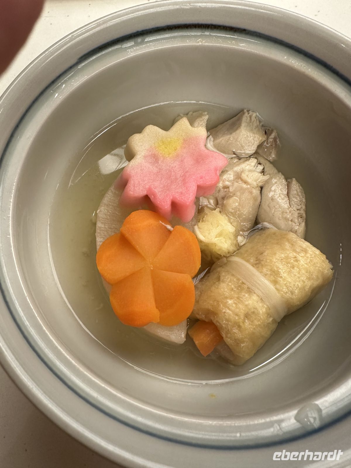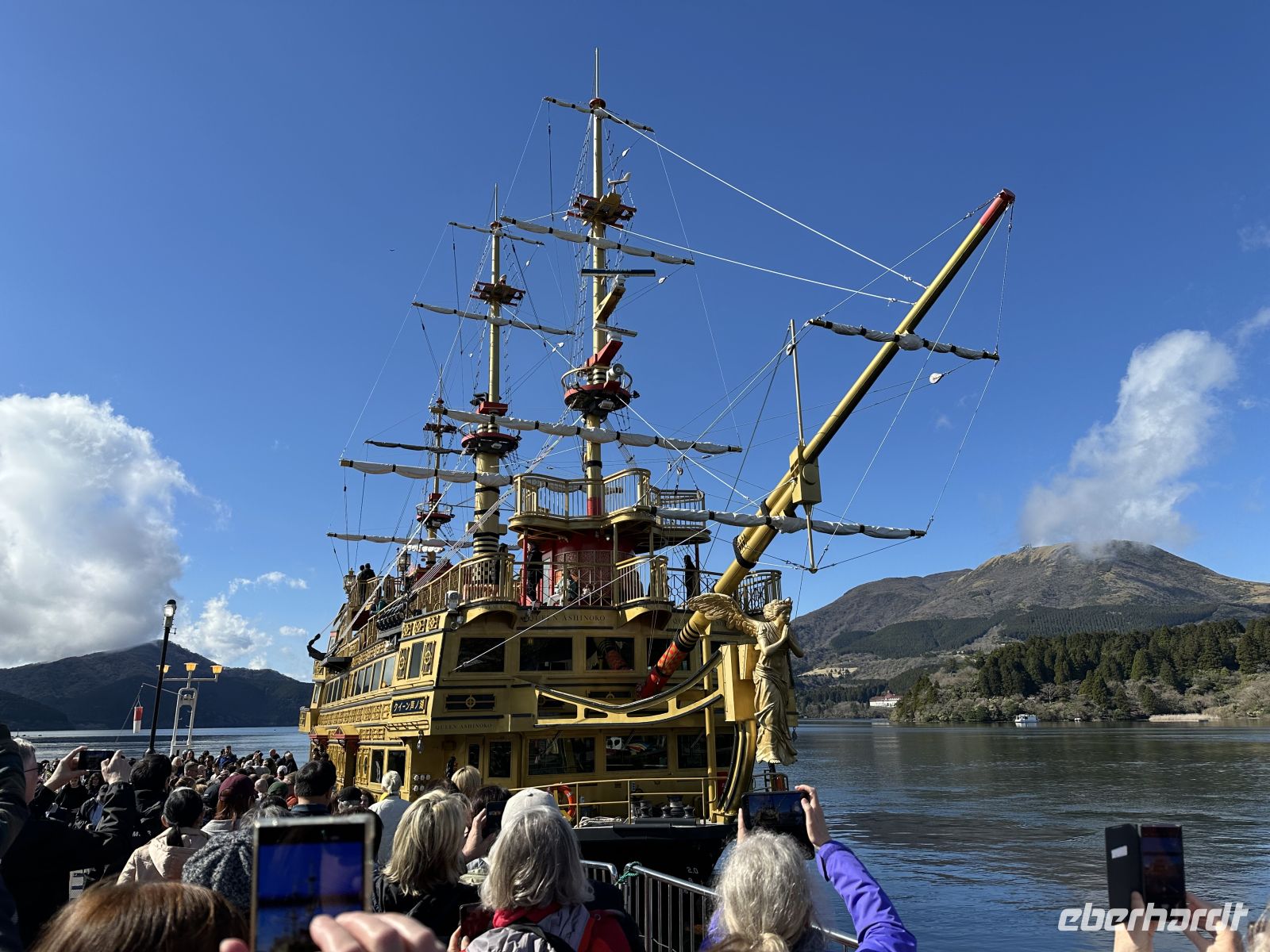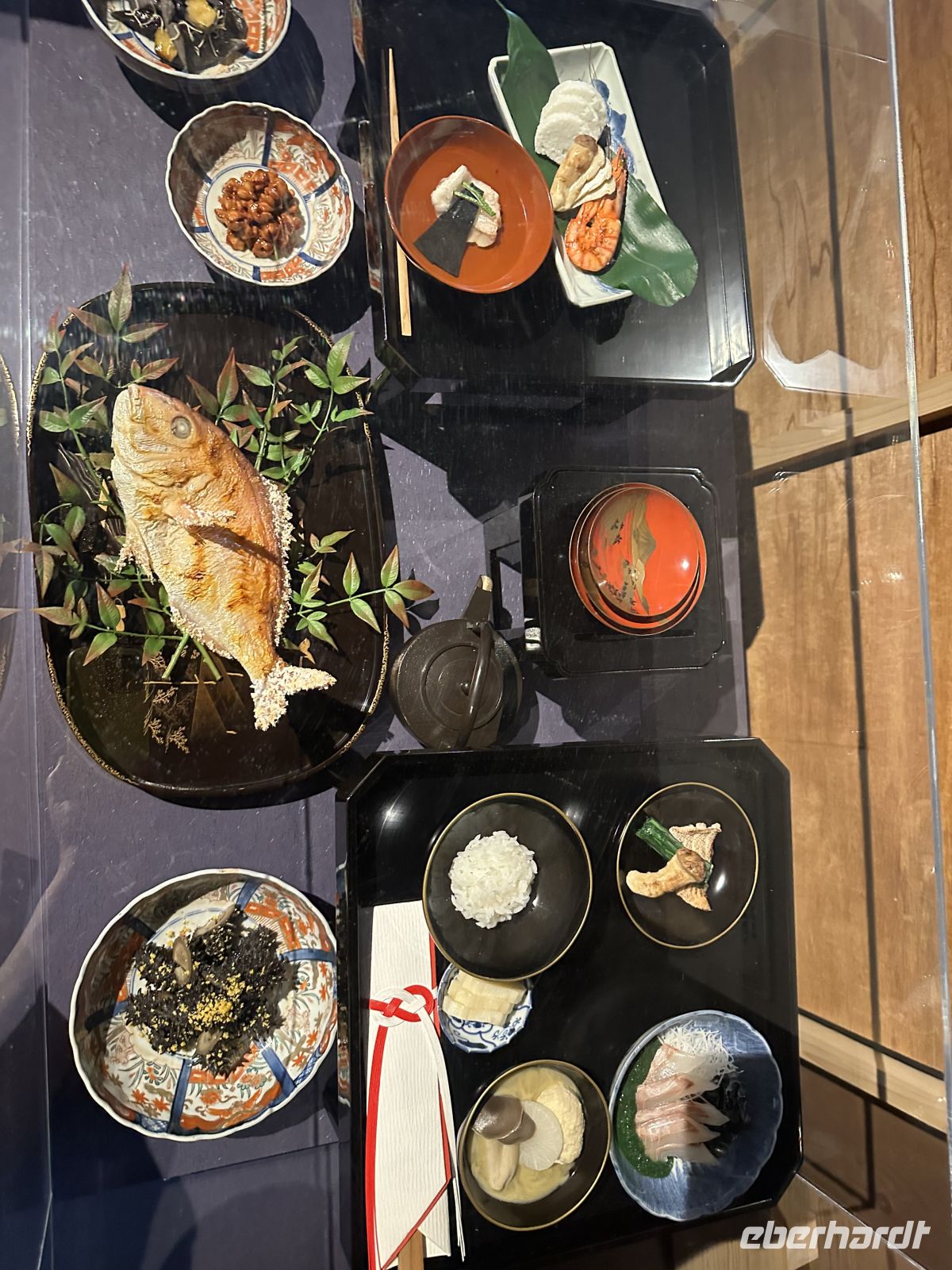 Nach dem beeindruckenden Frühstück mit den Pancakes und dem Fischbuffet verlassen wir Tokio und machen uns auf den Weg Richtung Süden. Unser erster Halt ist Kamakura. Am Eingang zum heiligen Bezirk empfängt uns ein beeindruckendes Ninotorii. Wir spazieren durch eine wunderschöne Kirschblütenallee, in der die Bäume in voller Pracht stehen. Der Regen begleitet uns auch heute, was die Farben der rosa Blüten und des grünen Mooses noch intensiver leuchten lässt. Wir besuchen den Hase-dera Tempel, der für seine weitläufigen Gärten bekannt ist. Ein besonders berührender Ort ist der dortige Kinderfriedhof mit den vielen kleinen Jizo-Statuen, die zum Schutz der Seelen aufgestellt wurden. In der Daikoku-do Halle bewundern wir die Schnitzereien und Statuen, bevor wir zum großen sitzenden Buddha, dem Daibutsu, weiterfahren. Trotz des Regens ist der Anblick der riesigen Bronzestatue unter den blühenden Kirschbäumen ein unvergessliches Motiv. Nach dem Besuch des Hase-dera Tempels erreichen wir den Kotoku-in Tempel, in dessen Zentrum der Daibutsu steht, der Große Buddha von Kamakura. Es handelt sich um eine gewaltige Bronzestatue des Amida Buddha, die bereits im 13. Jahrhundert gegossen wurde. Mit einer Höhe von über elf Metern thront er majestätisch unter freiem Himmel. Der Anblick ist heute besonders spektakulär, da der sitzende Buddha von voll blühenden Kirschbäumen eingerahmt wird. Die zarten rosa Blüten bilden einen wunderschönen Kontrast zur dunklen, grünlichen Patina der Bronze. Trotz des anhaltenden Regens strahlt die Statue eine unglaubliche Ruhe und Gelassenheit aus. Wir erfahren, dass der Buddha früher in einer riesigen Halle stand, die jedoch vor Jahrhunderten durch einen Tsunami zerstört wurde, weshalb er heute unter freiem Himmel besichtigt werden kann. In den Gassen von Kamakura machen wir eine kuriose Entdeckung: Eine Sherlock Holmes Figur steht dort neben einer klassischen roten Telefonzelle und einem originalen London Taxi. Direkt daneben finden wir eine kleine Manufaktur. Wir schauen zu, wie dort frische Matcha Kekse mit schwarzer Sesampaste gebacken werden. Sie sind noch warm und schmecken einfach köstlich. Danach führt uns die Reise weiter in den Hakone Nationalpark. Wir gehen an Bord eines prachtvoll verzierten Piratenboots und überqueren den Lake Ashinoko. Während der Fahrt haben wir Glück: Trotz der Wolken erhaschen wir einen Blick auf den majestätischen Fuji-san. Vom Wasser aus sehen wir auch das berühmte rote Torii, das direkt im See steht und ein Wahrzeichen der Region ist. Am Abend erreichen wir unser neues Quartier, das Onyado Megumi. Nach diesem langen Tag im Regen freuen wir uns darauf, die traditionelle Gastfreundschaft und das heiße Wasser des Onsens zu genießen. Bevor wir uns im Onsen aufwärmen können, erwartet uns ein kulinarischer Höhepunkt: das Kaiseki-Menü. Diese traditionelle Form der japanischen gehobenen Küche ist weit mehr als nur eine Mahlzeit; es ist eine Kunstform, bei der die Saisonalität und die regionale Herkunft der Zutaten im Mittelpunkt stehen.